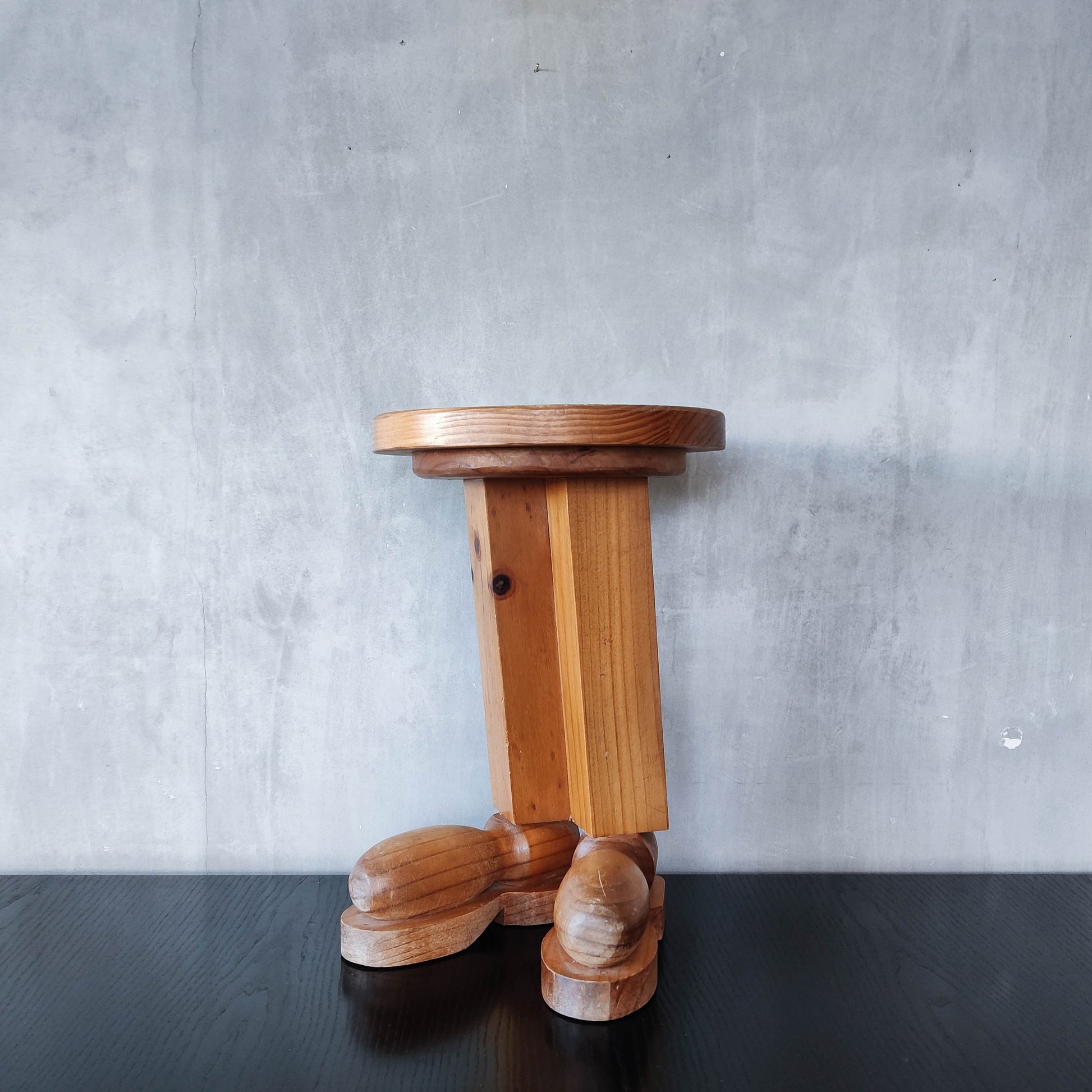 Whimsical postmodern 1980s varnished pine stool (or could be used as a small table or plinth) in the form of stylised legs and feet/boots. Lovely form and colour. Please see photos and condition description.