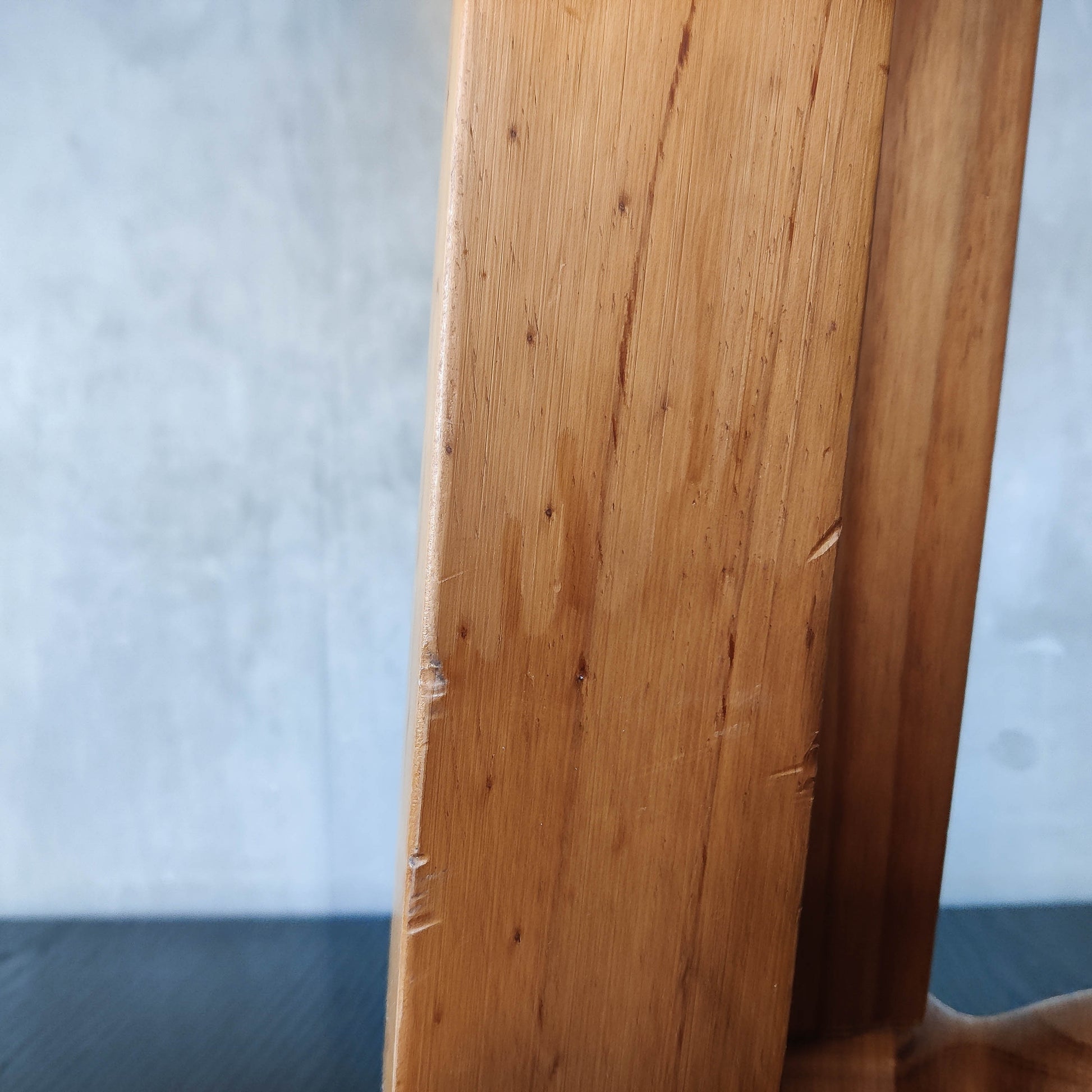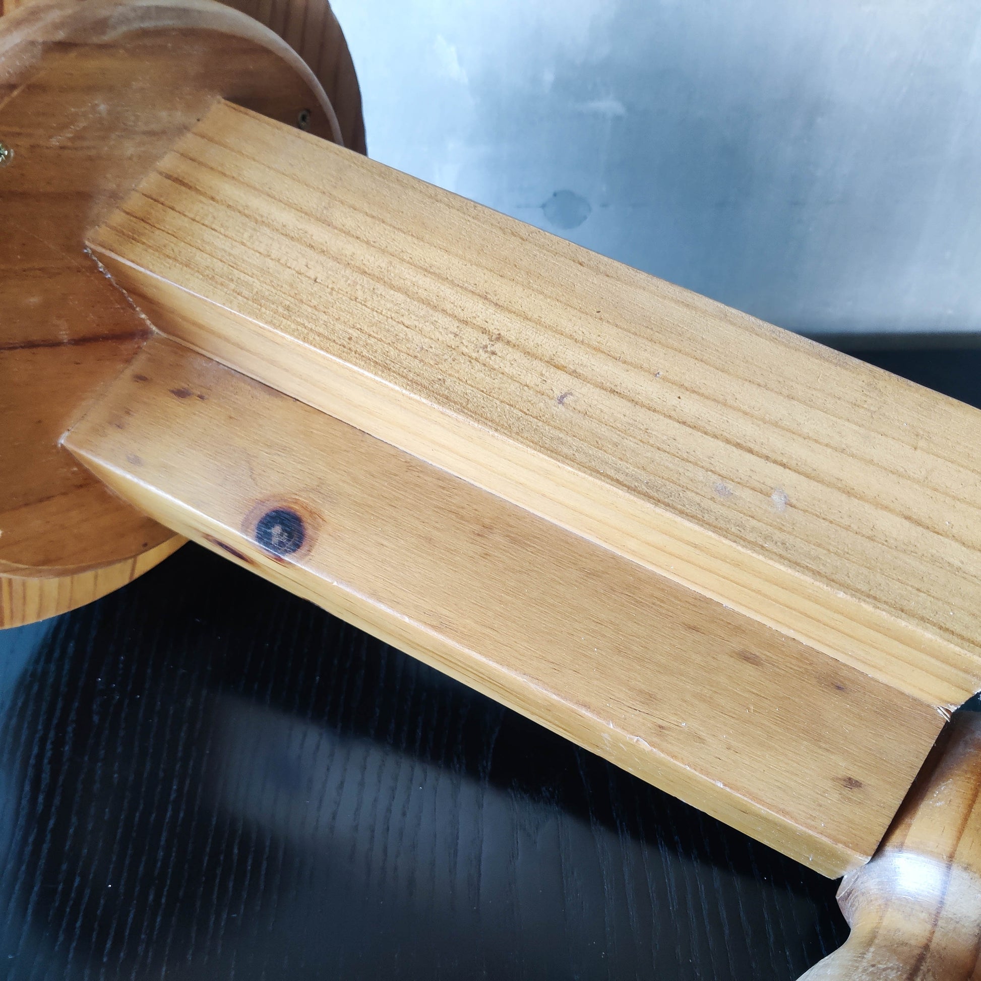 Condition: Made from knotty pine with obvious knots (one large example on side of stool top); generally a little worn but good and robust; some scuffs, scrapes and scratches; some dulled and patchy varnish; some light marks.