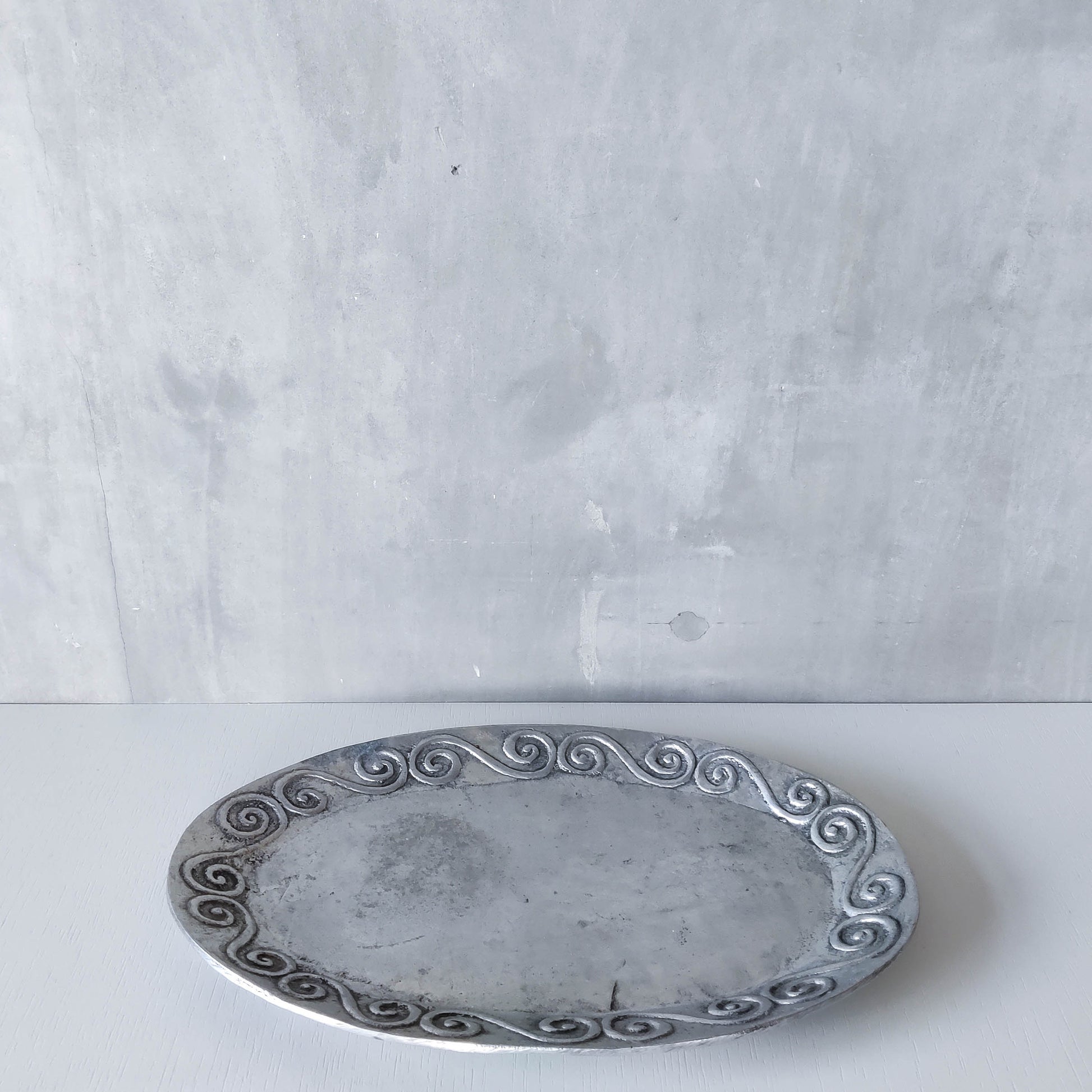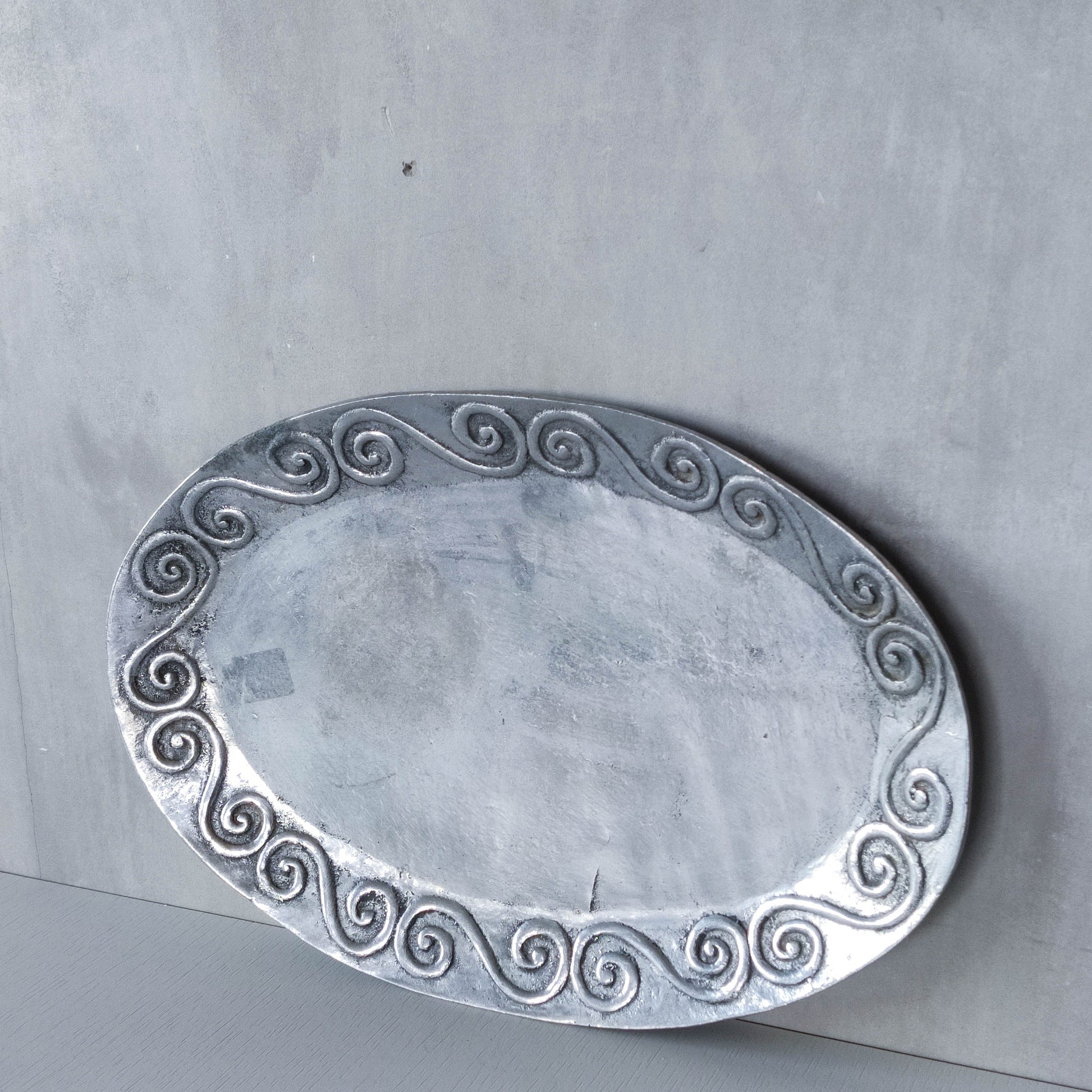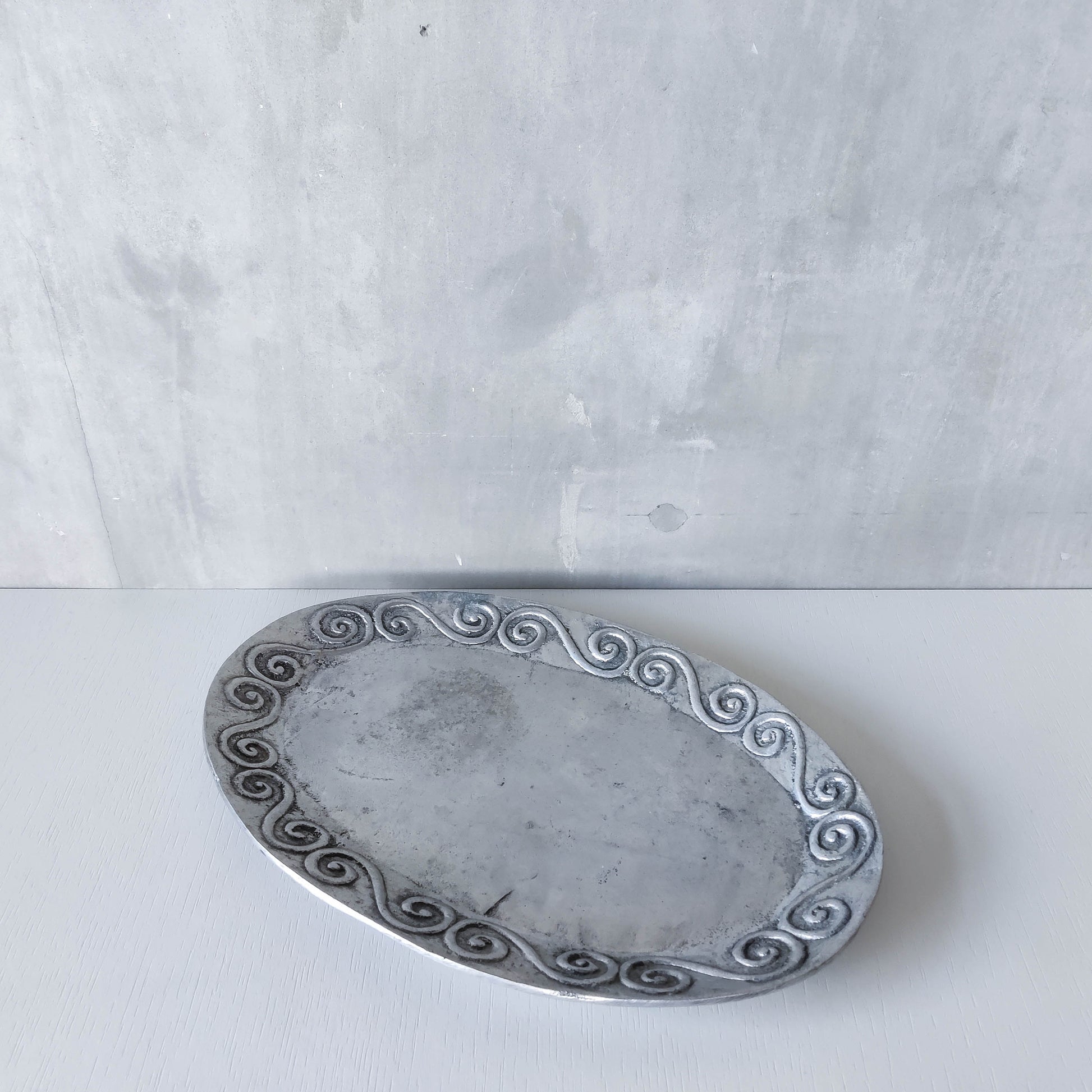 An oval chunky hand cast 1990s aluminium large platter with charming embossed scroll motifs. Please see photos and condition description.