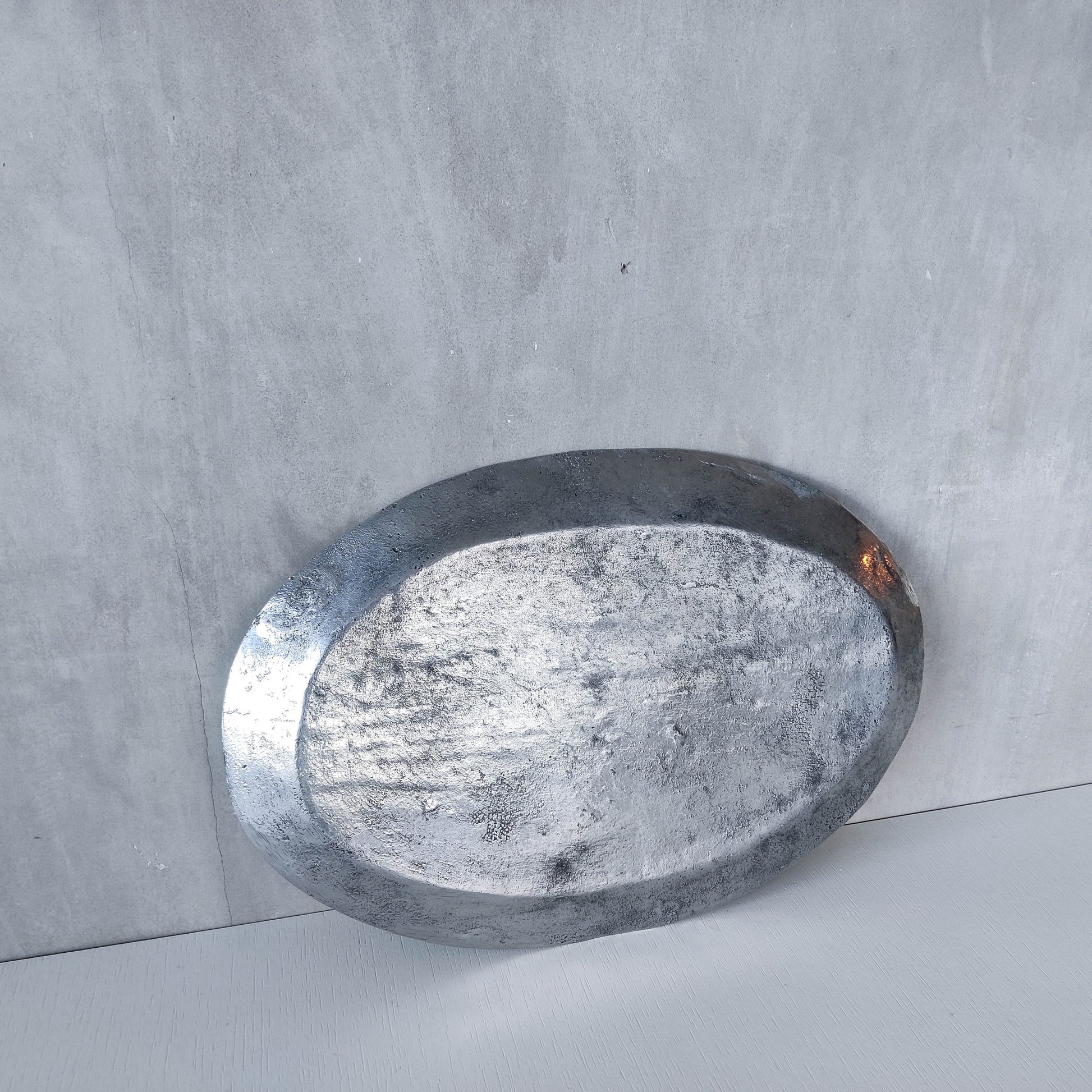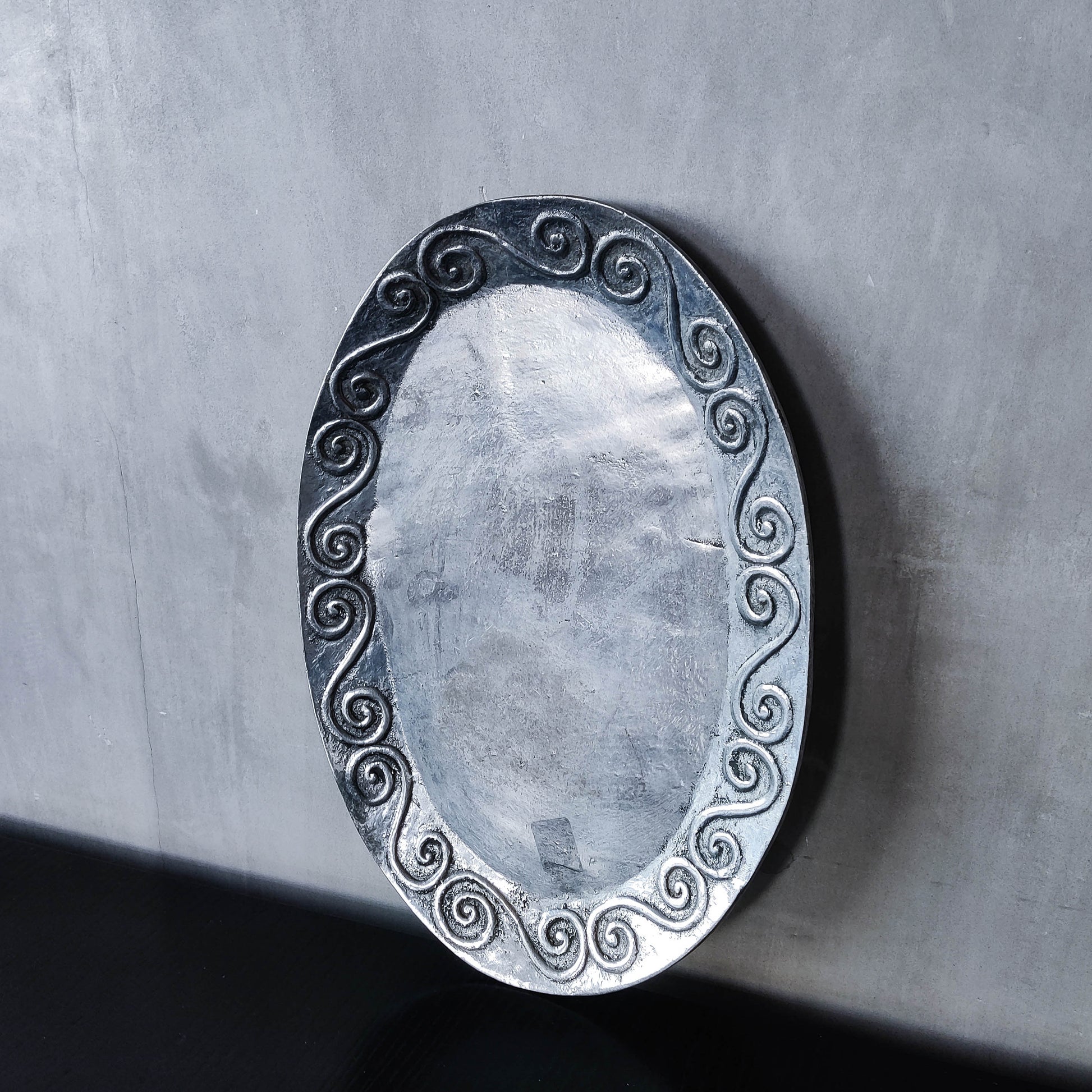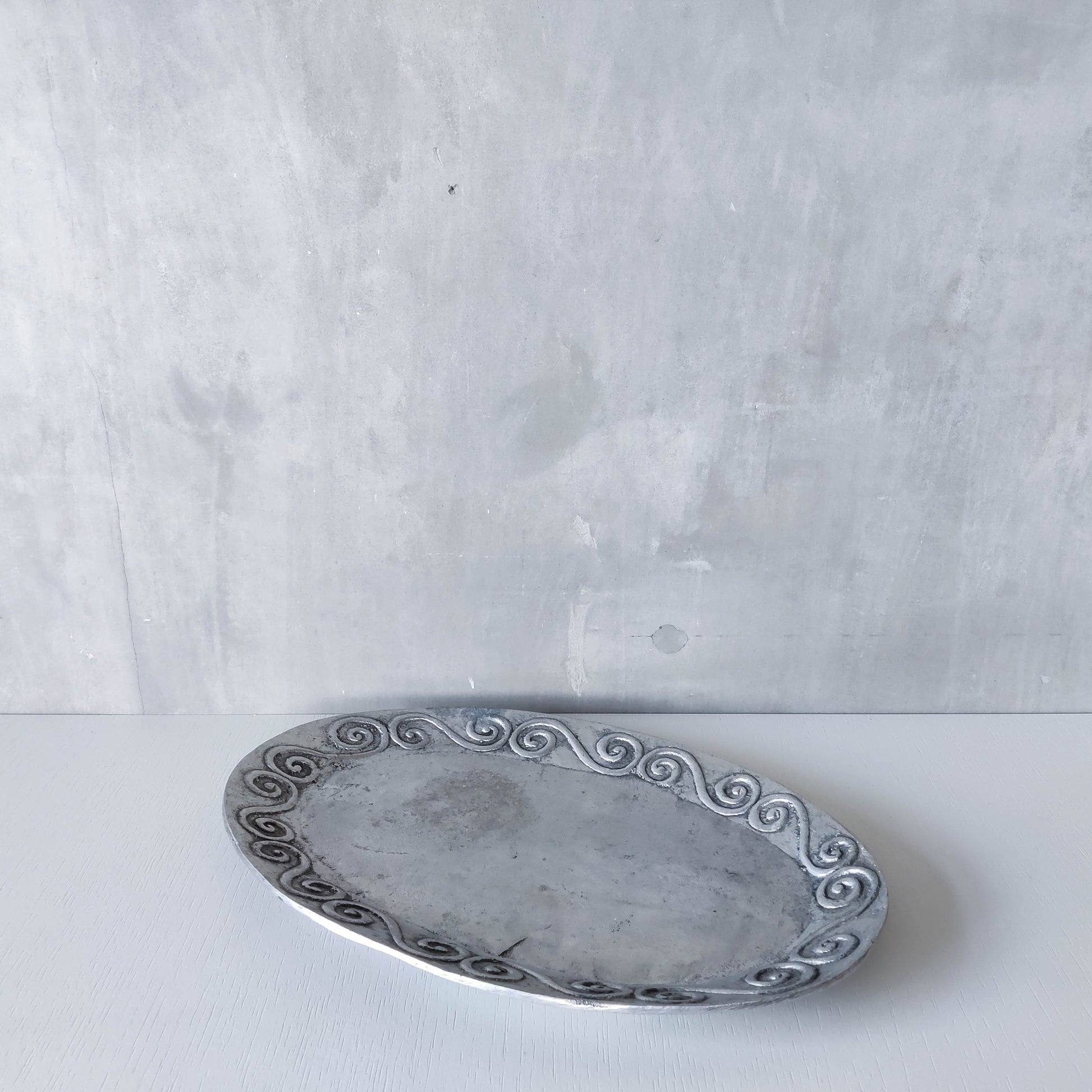 An oval chunky hand cast 1990s aluminium large platter with charming embossed scroll motifs. Please see photos and condition description.