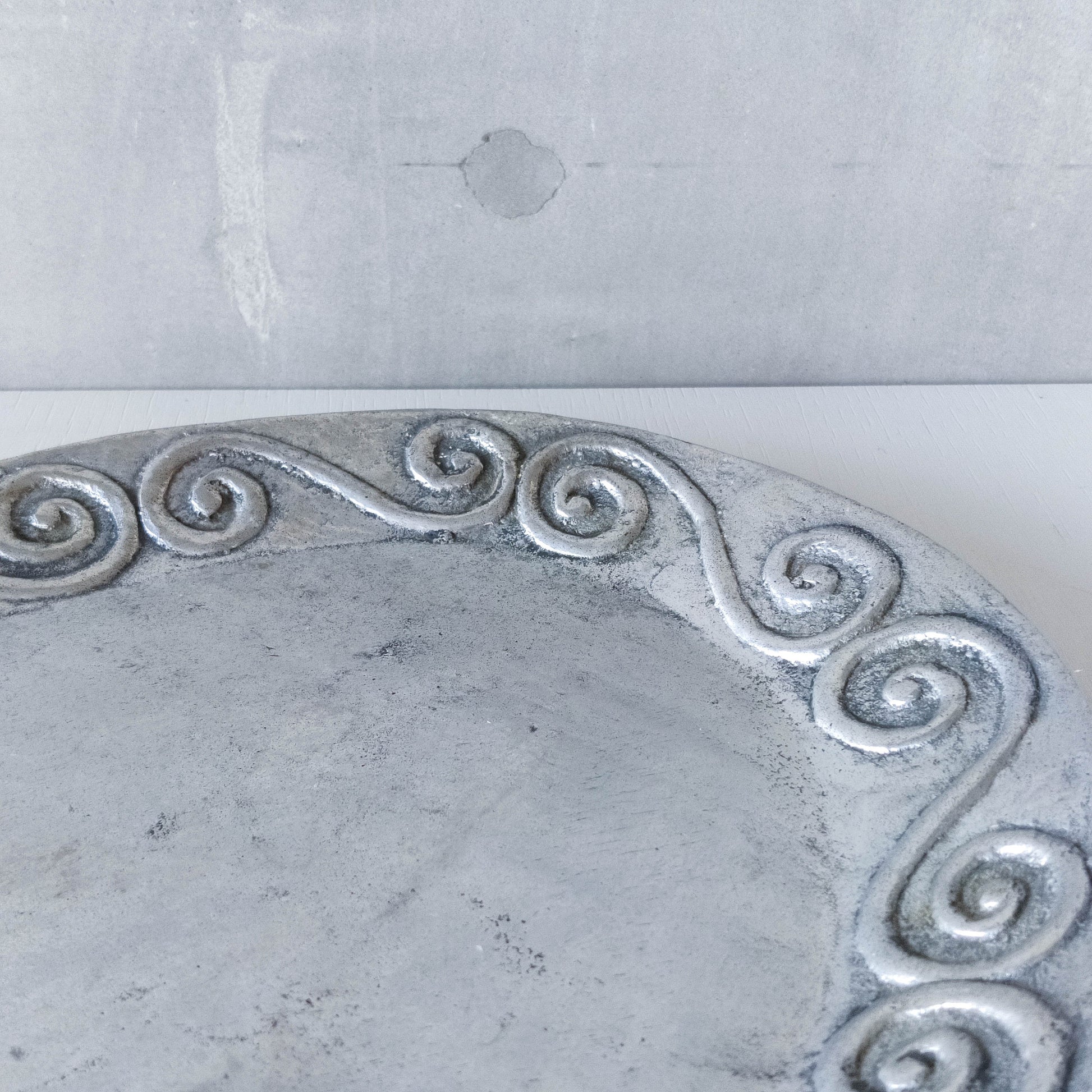 1990s hand cast aluminium silver metal scroll spiral platter centrepiece
