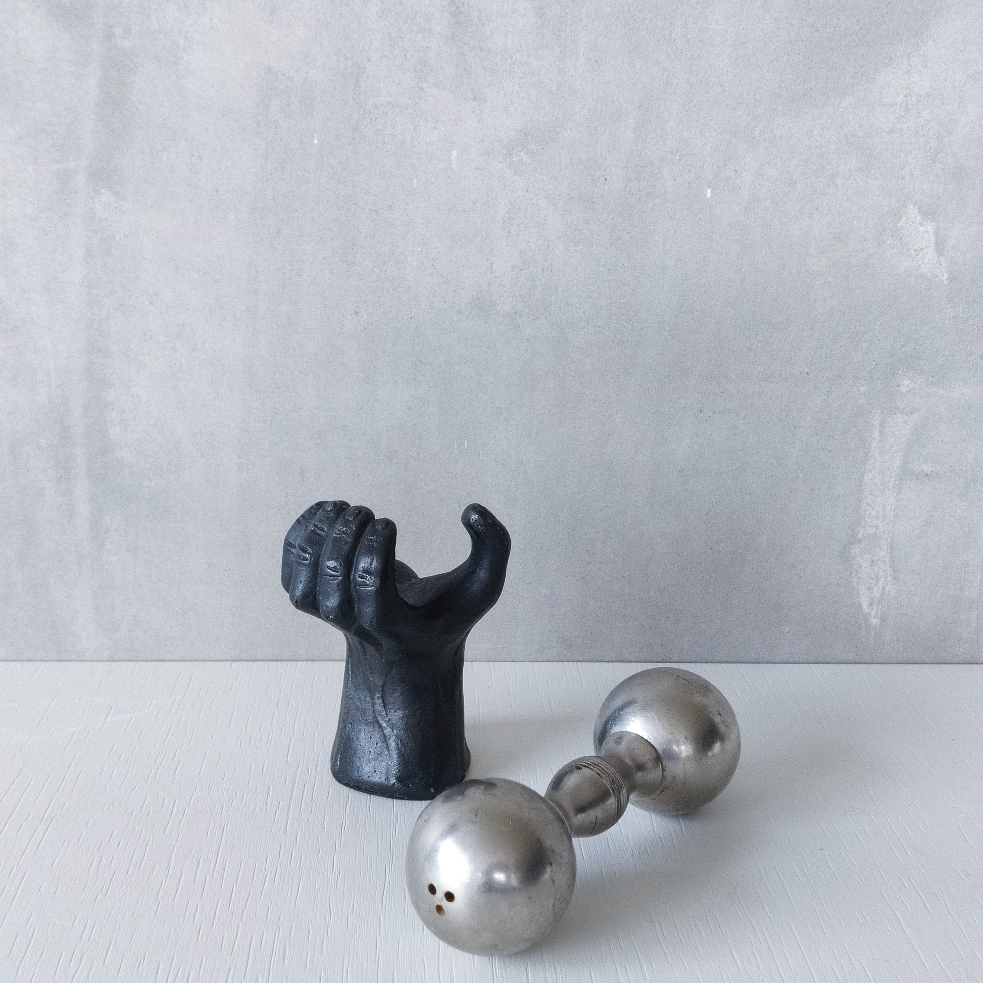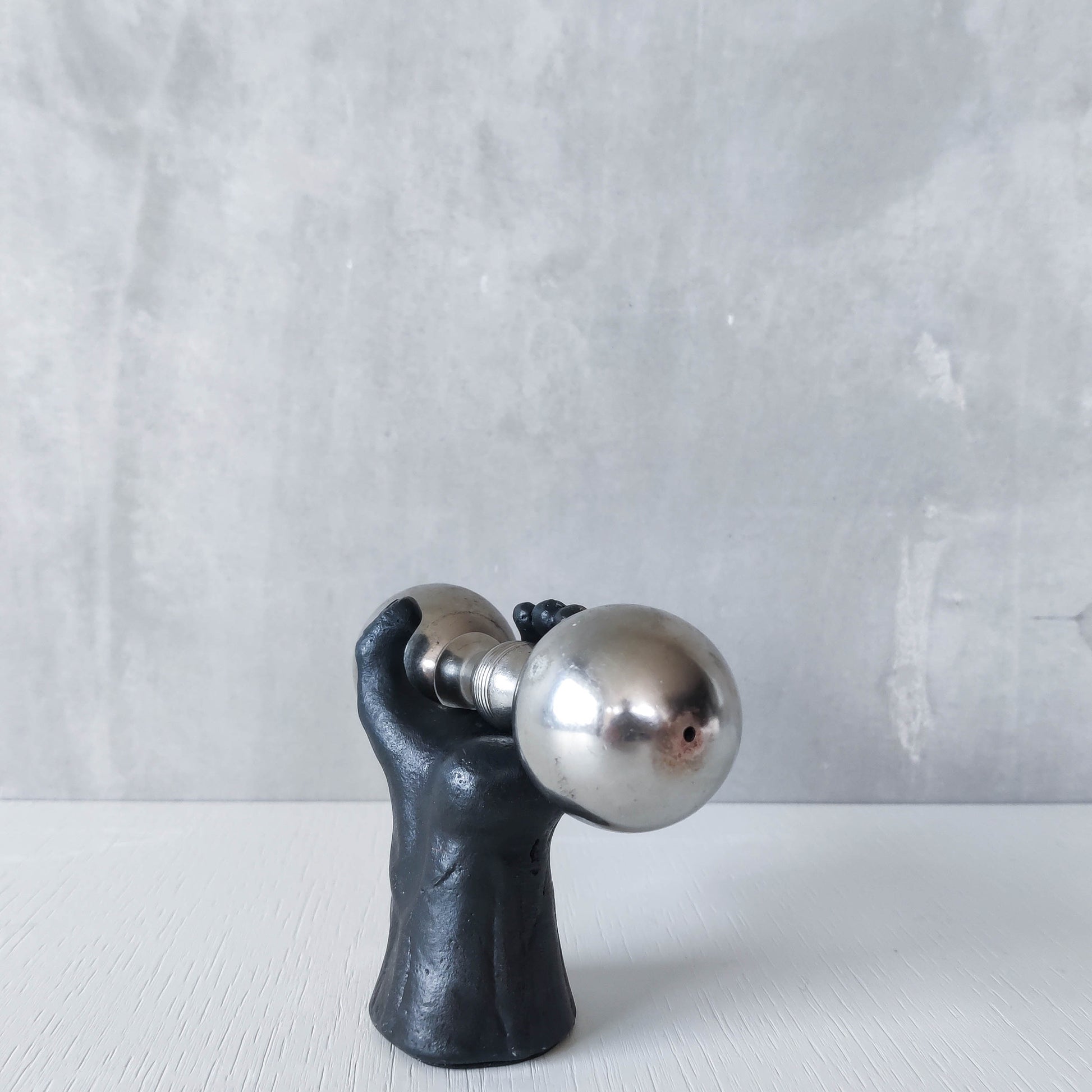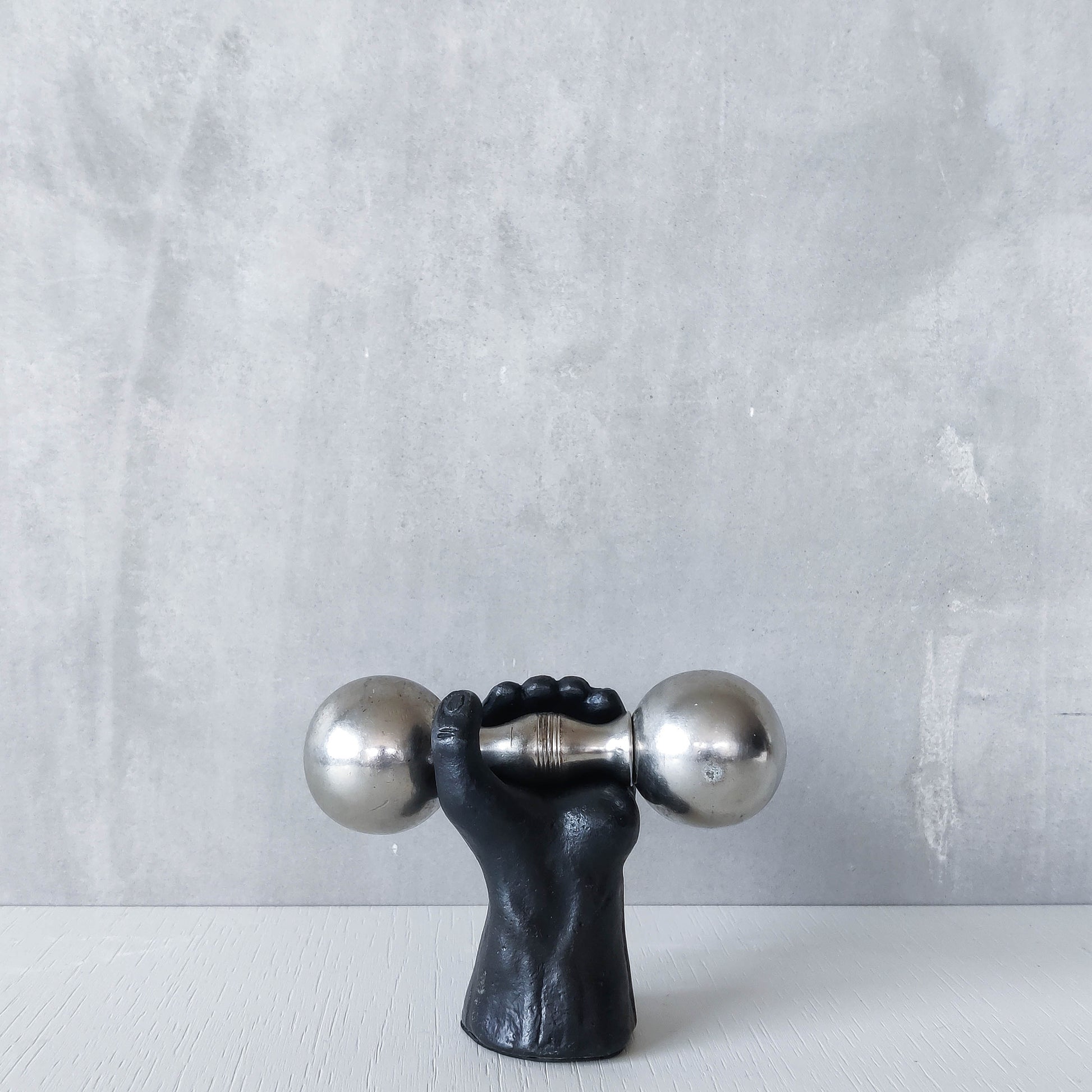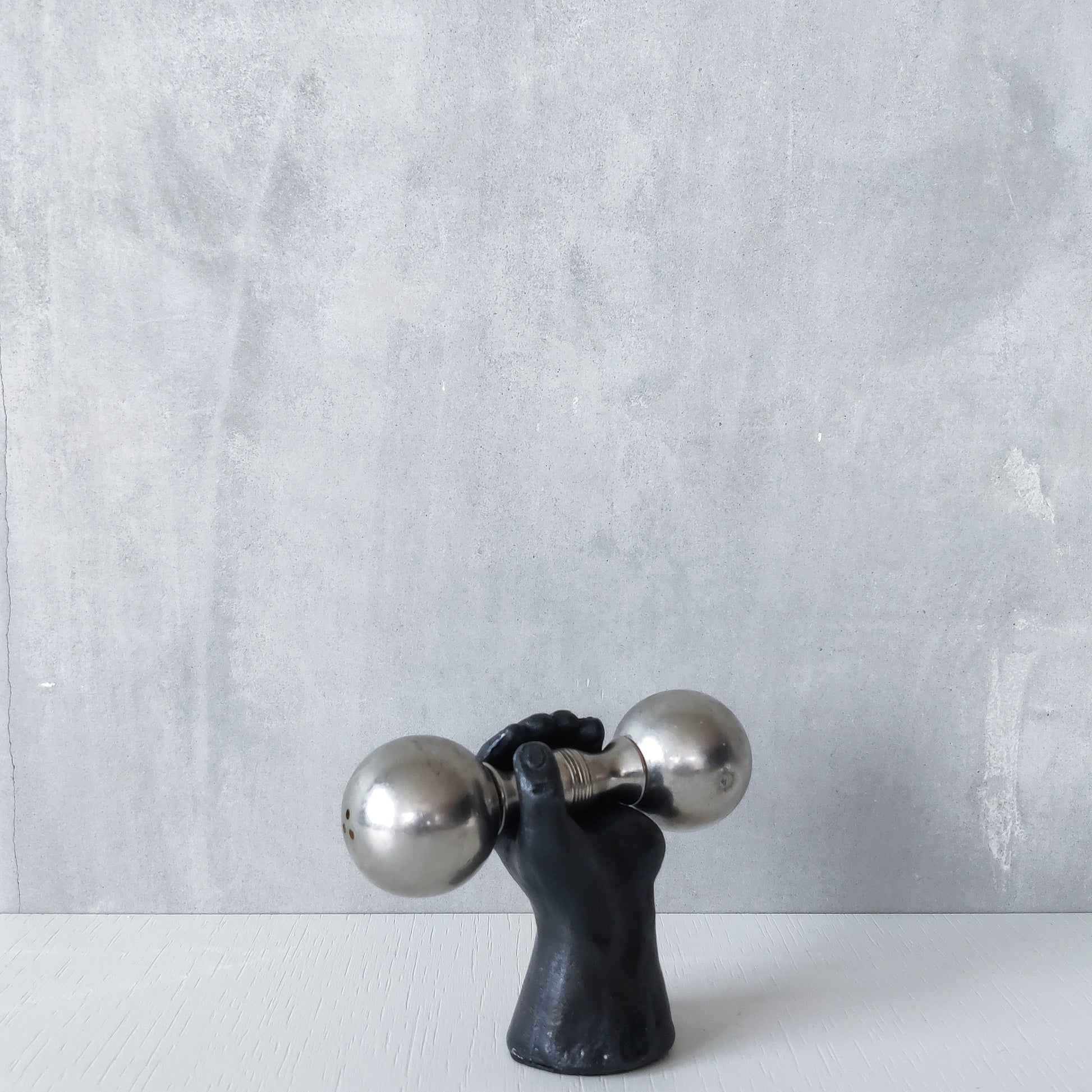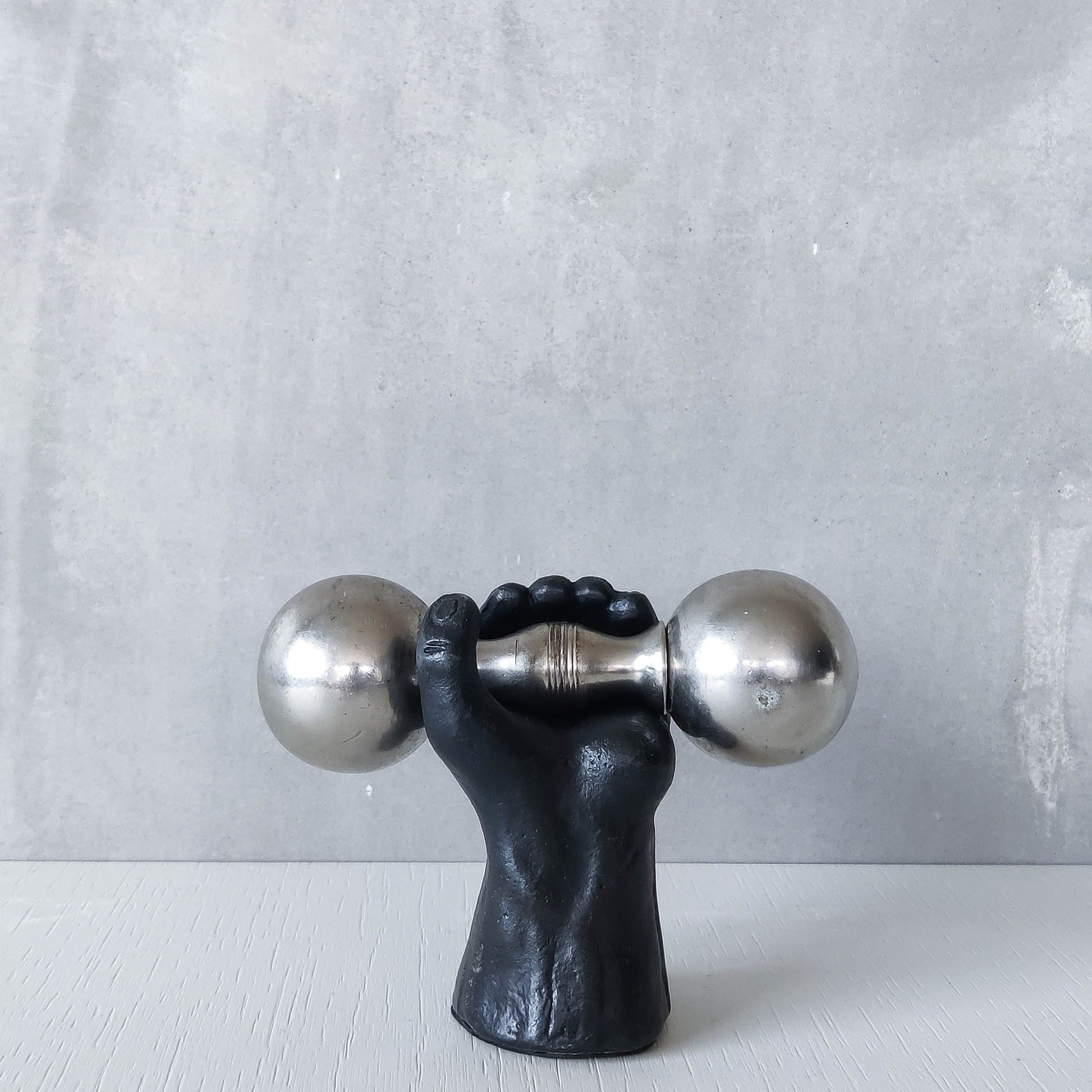 Condition: Some light wear to nickel barbell around salt and pepper holes, revealing a slightly different tone of metal, some small dents, scratches and small patches of tarnish on the barbell piece generally. The heavy cast oxidised metal hand piece is very good, with some tiny spots of wear to the patina and the signed base is a little worn. Generally in good useable condition. Please see photos.
