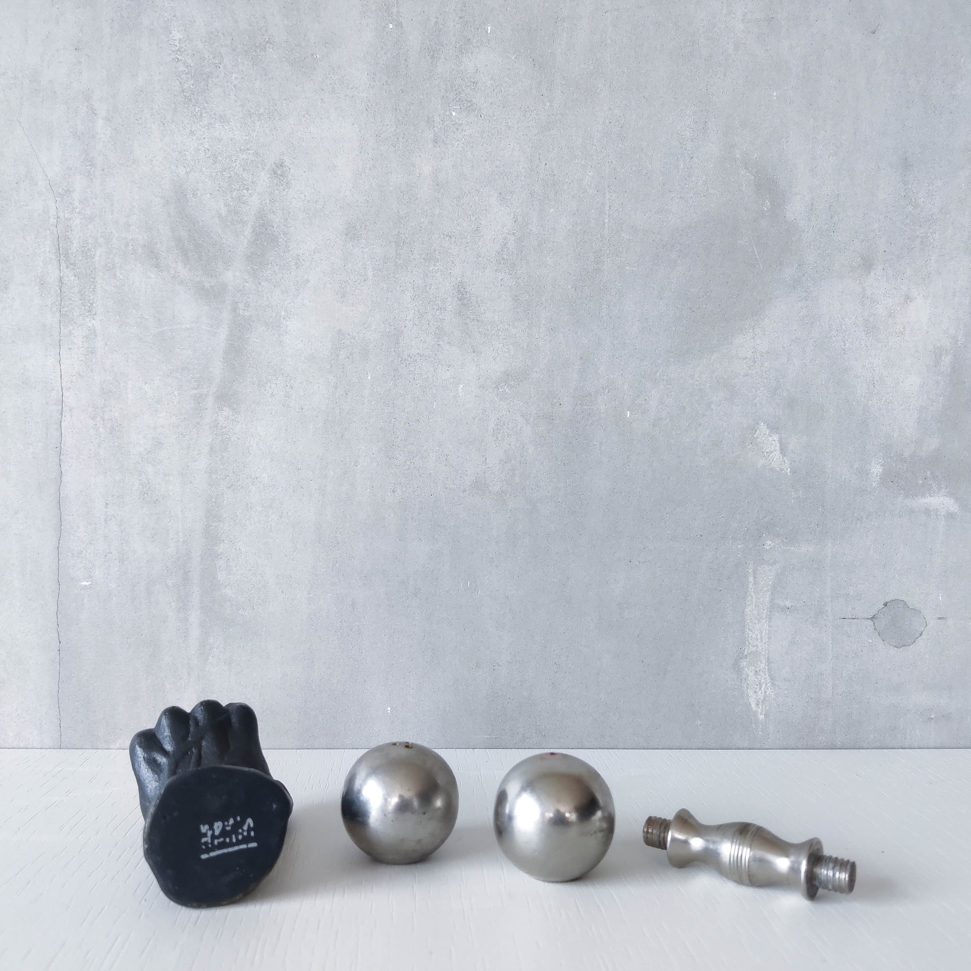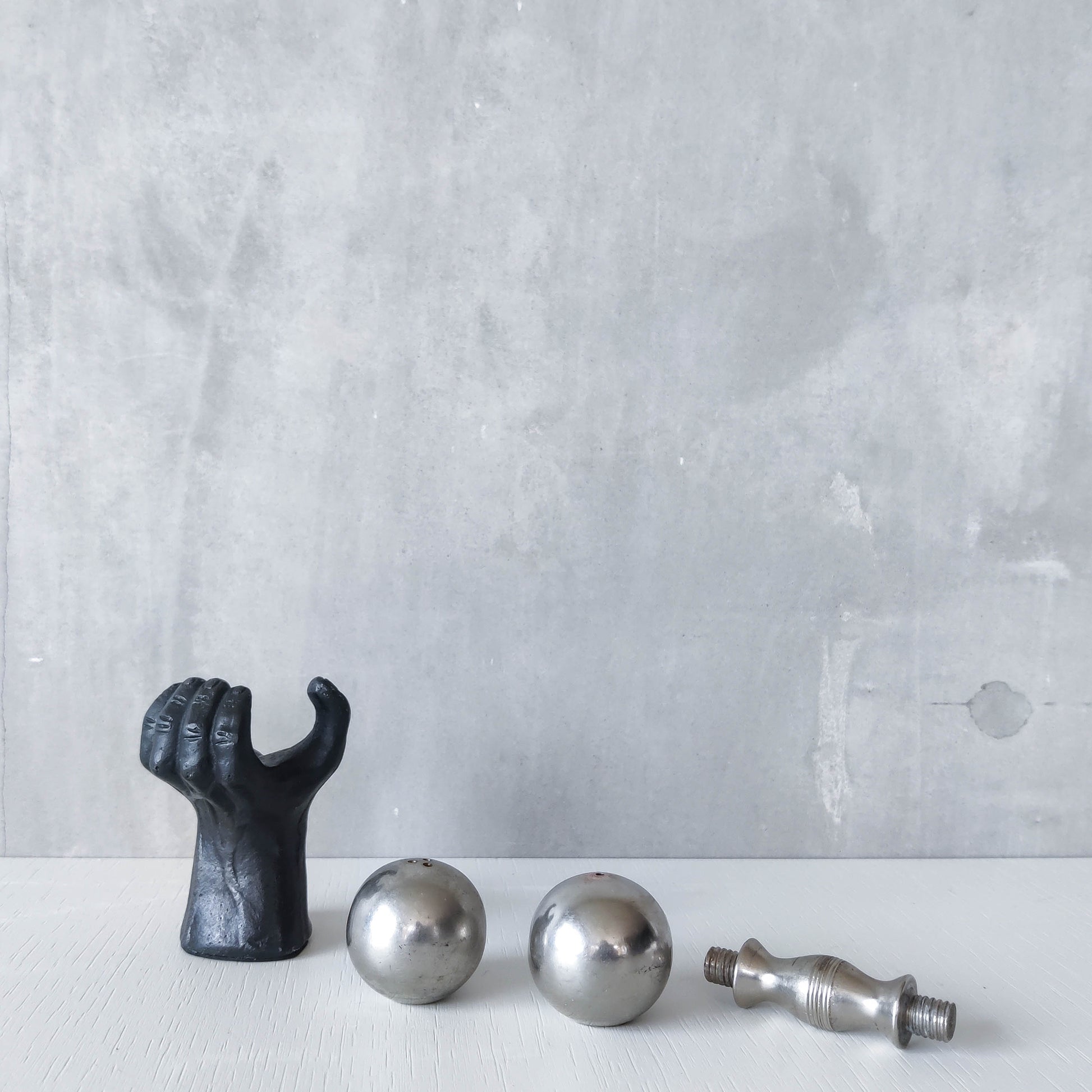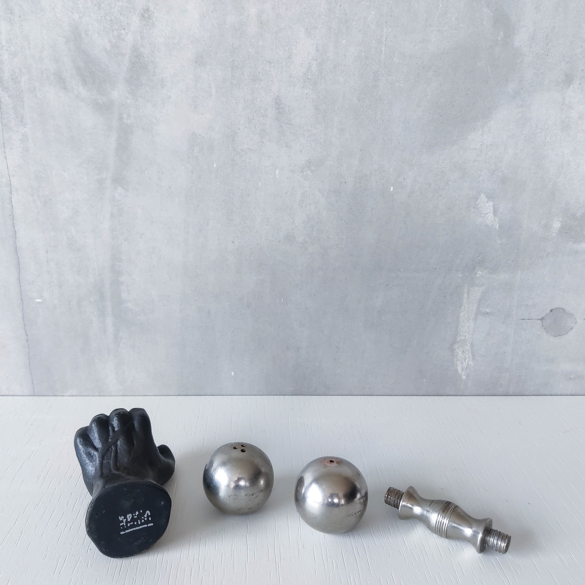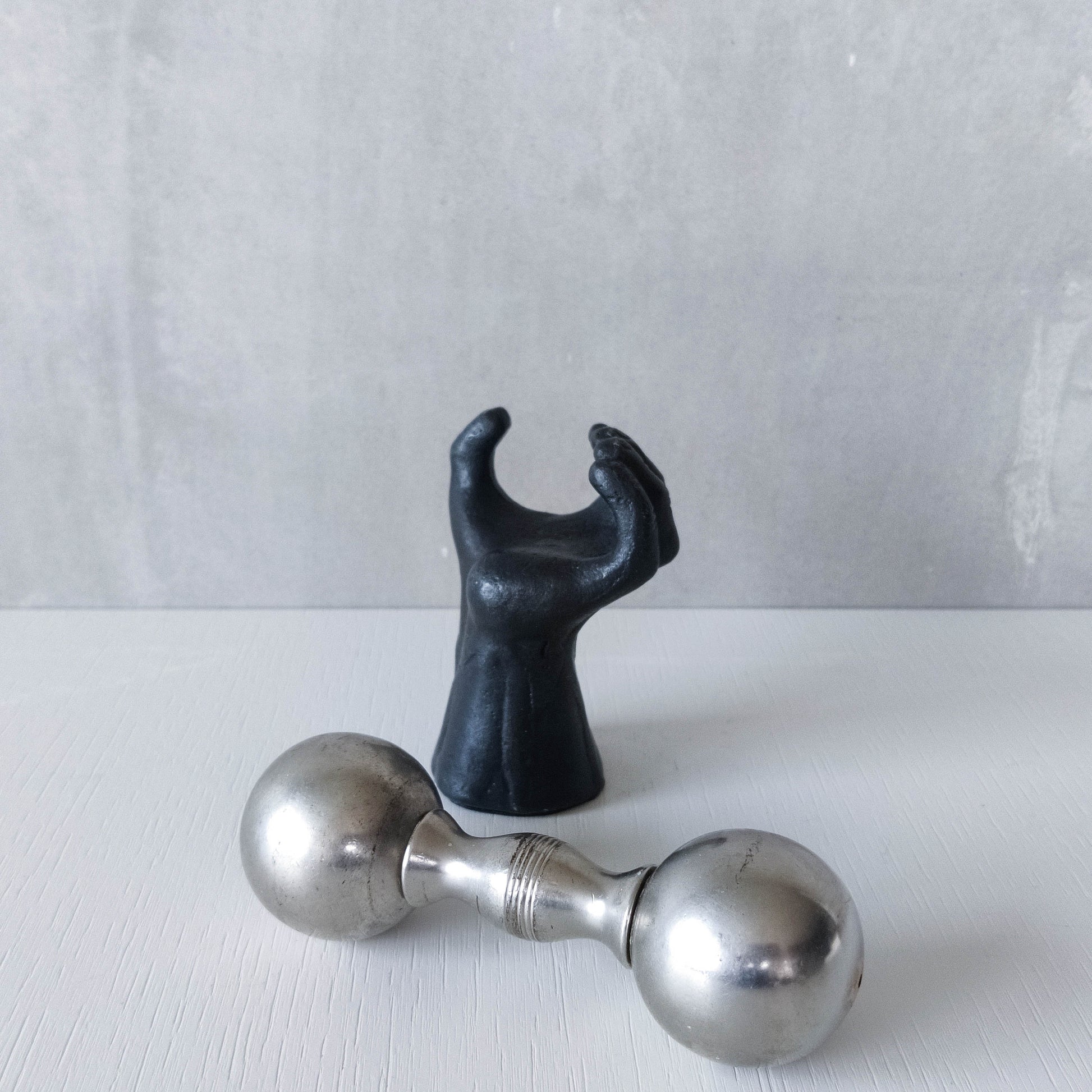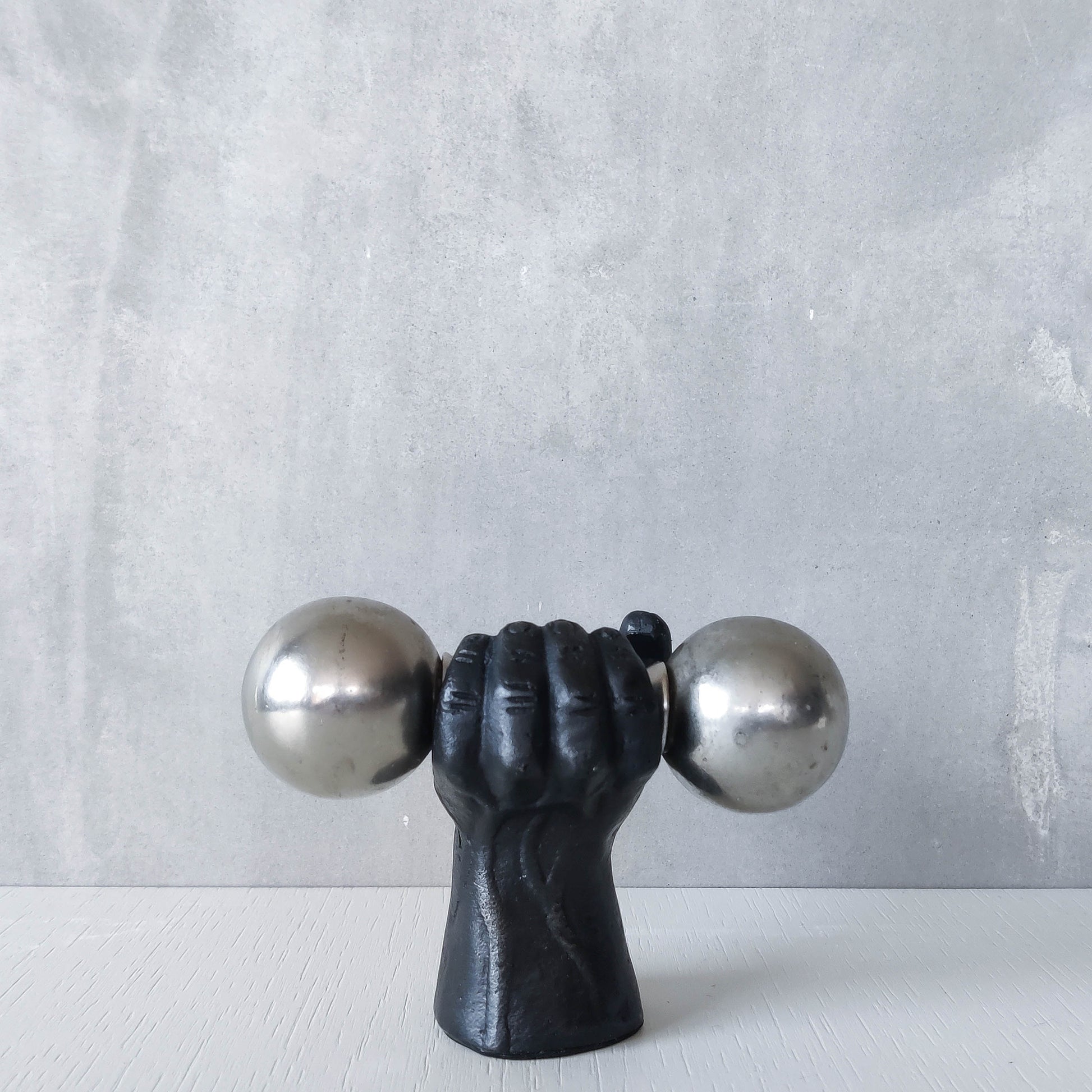 Condition: Some light wear to nickel barbell around salt and pepper holes, revealing a slightly different tone of metal, some small dents, scratches and small patches of tarnish on the barbell piece generally. The heavy cast oxidised metal hand piece is very good, with some tiny spots of wear to the patina and the signed base is a little worn. Generally in good useable condition. Please see photos.