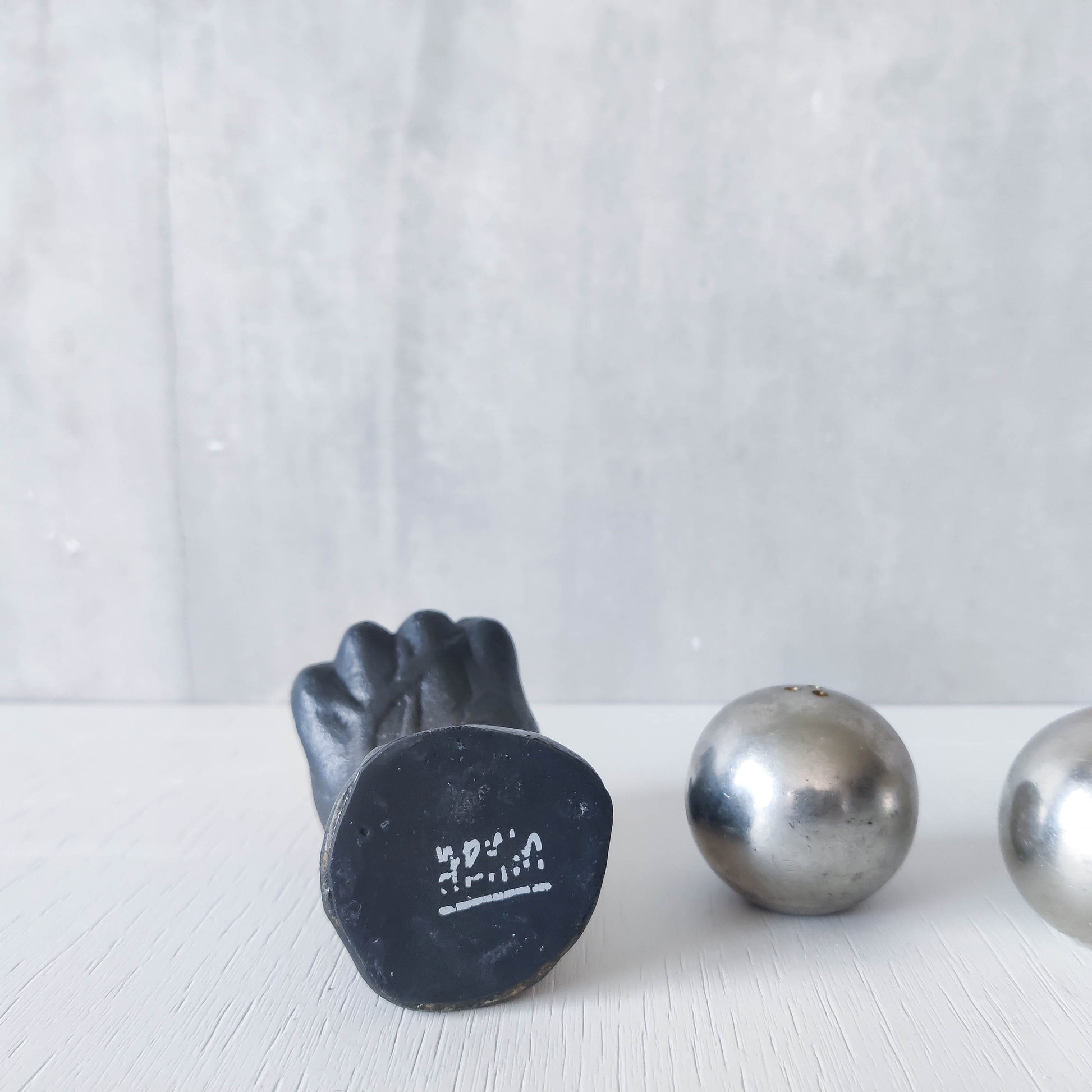 Vintage whimsical pop art Michael Aram salt & pepper shaker metal barbell hand