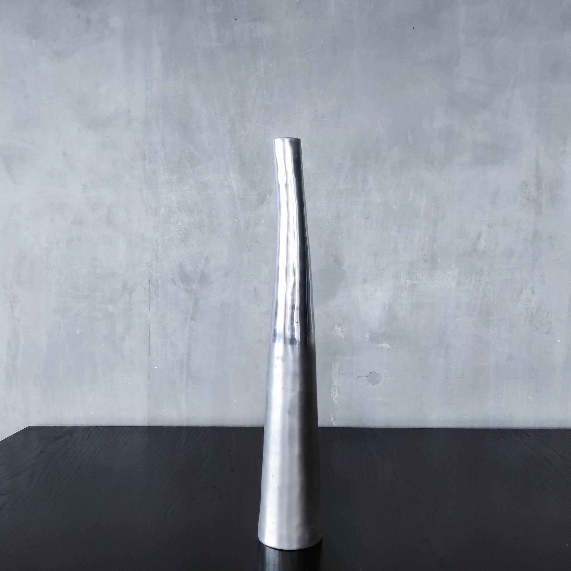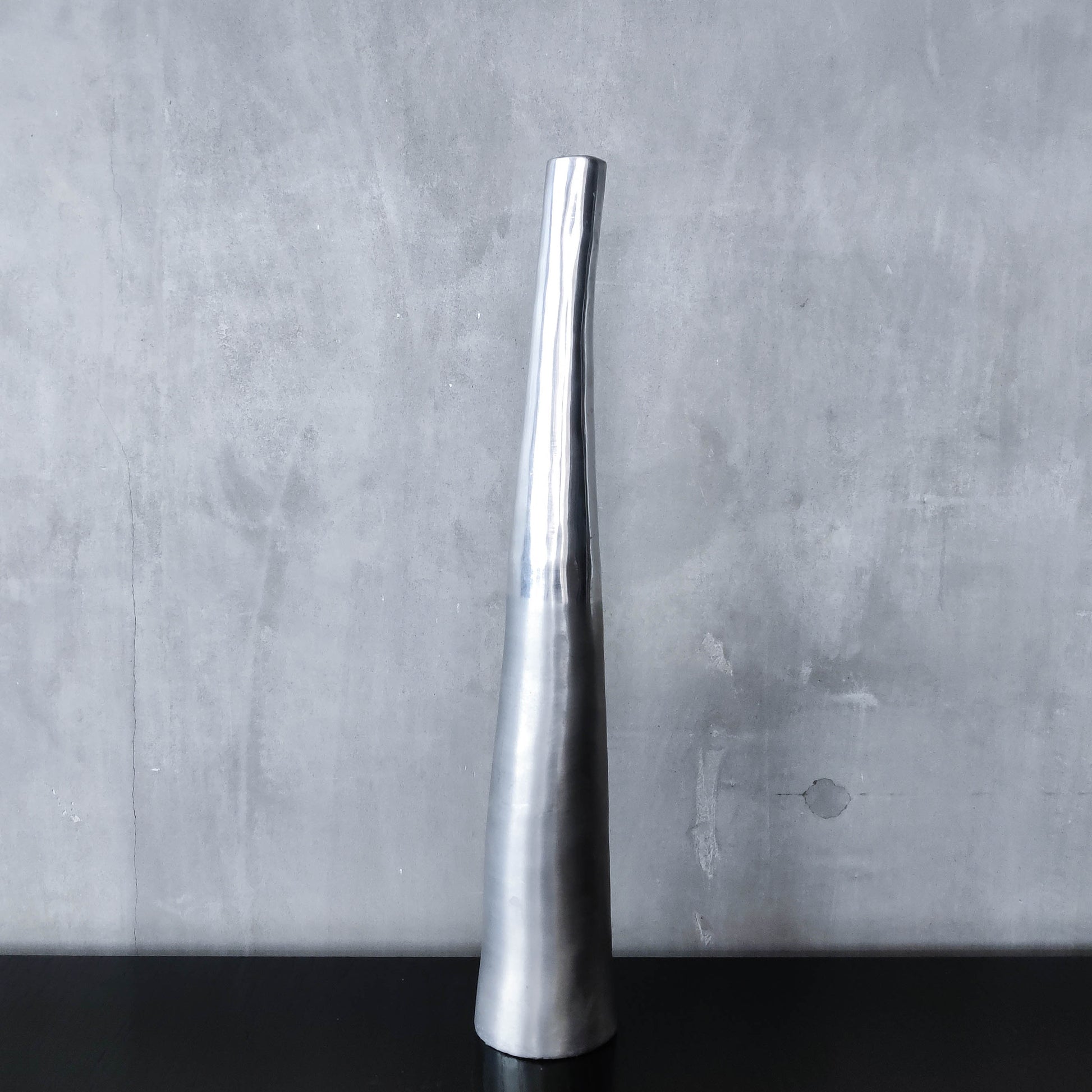 Sculptural hand cast heavy aluminium vase slender and tapered with polished and brushed surface. Please see photos and condition description.