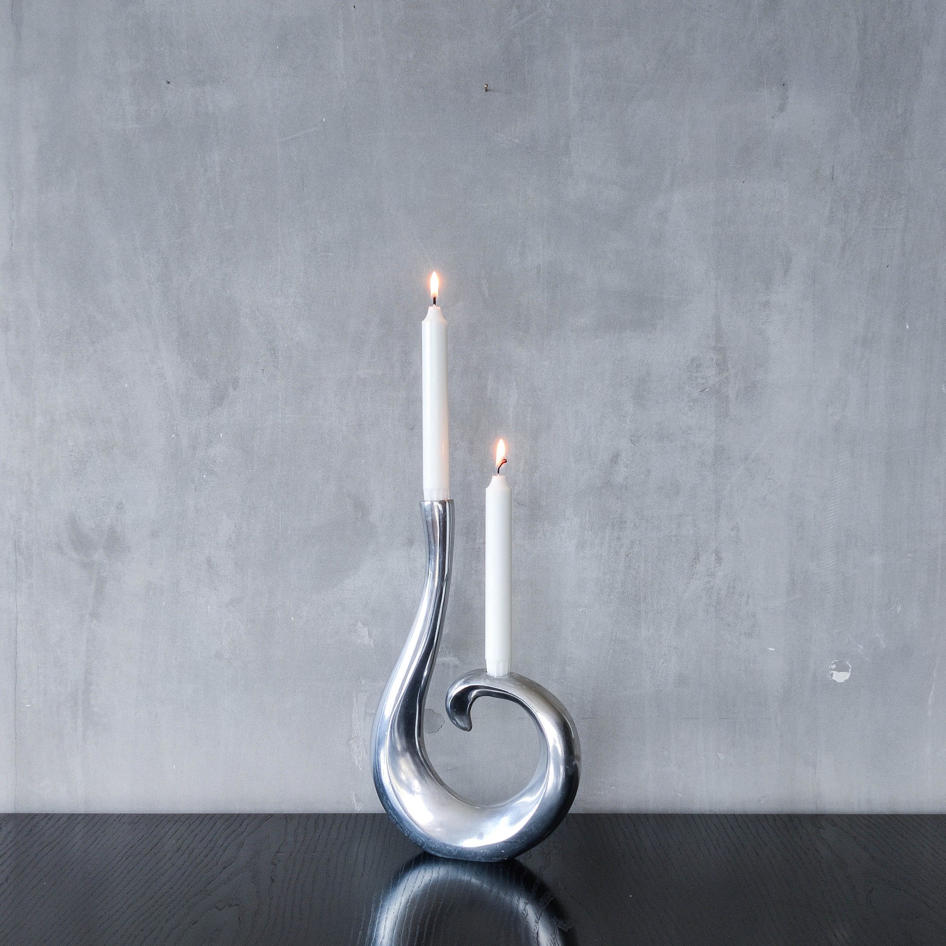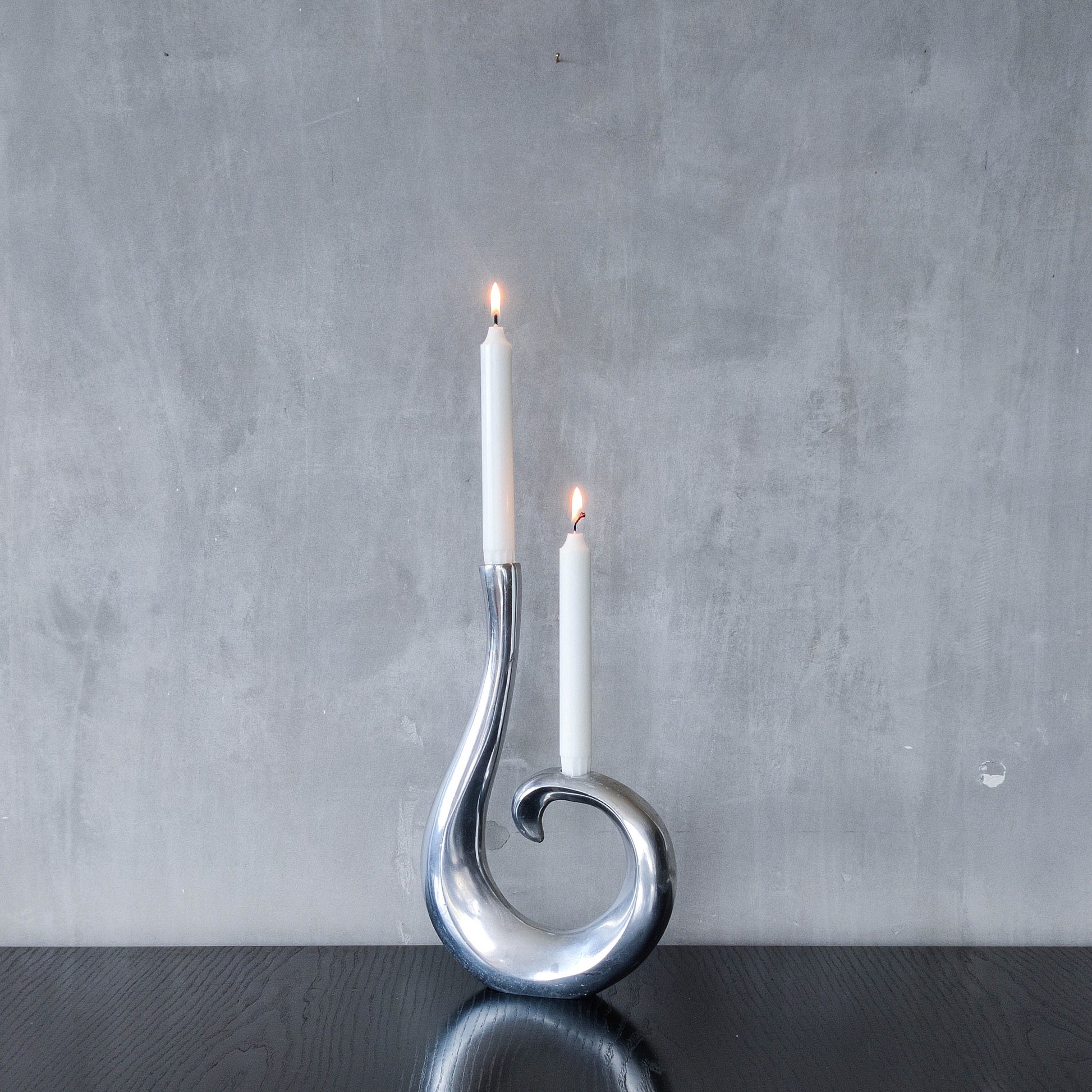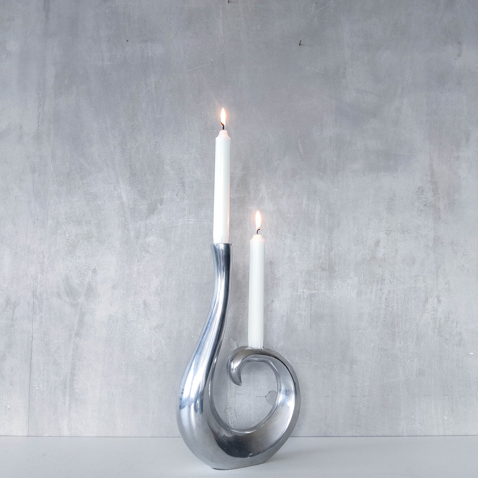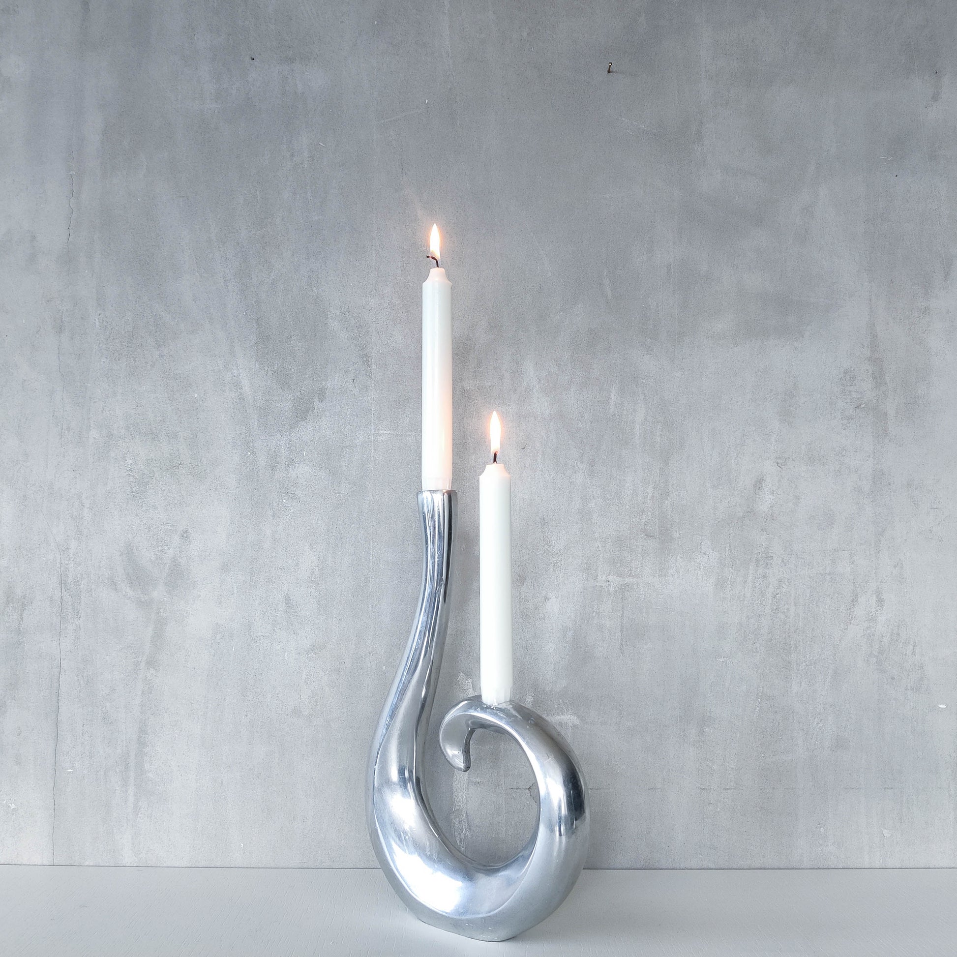 Elegant sculptural cast aluminium (with a chrome look) double candelabra/candle holder for dinner candles. Lovely scale and slightly organic form. Age unknown but I believe circa 1990s. Sorry candles not included. Please see photos and condition description.
