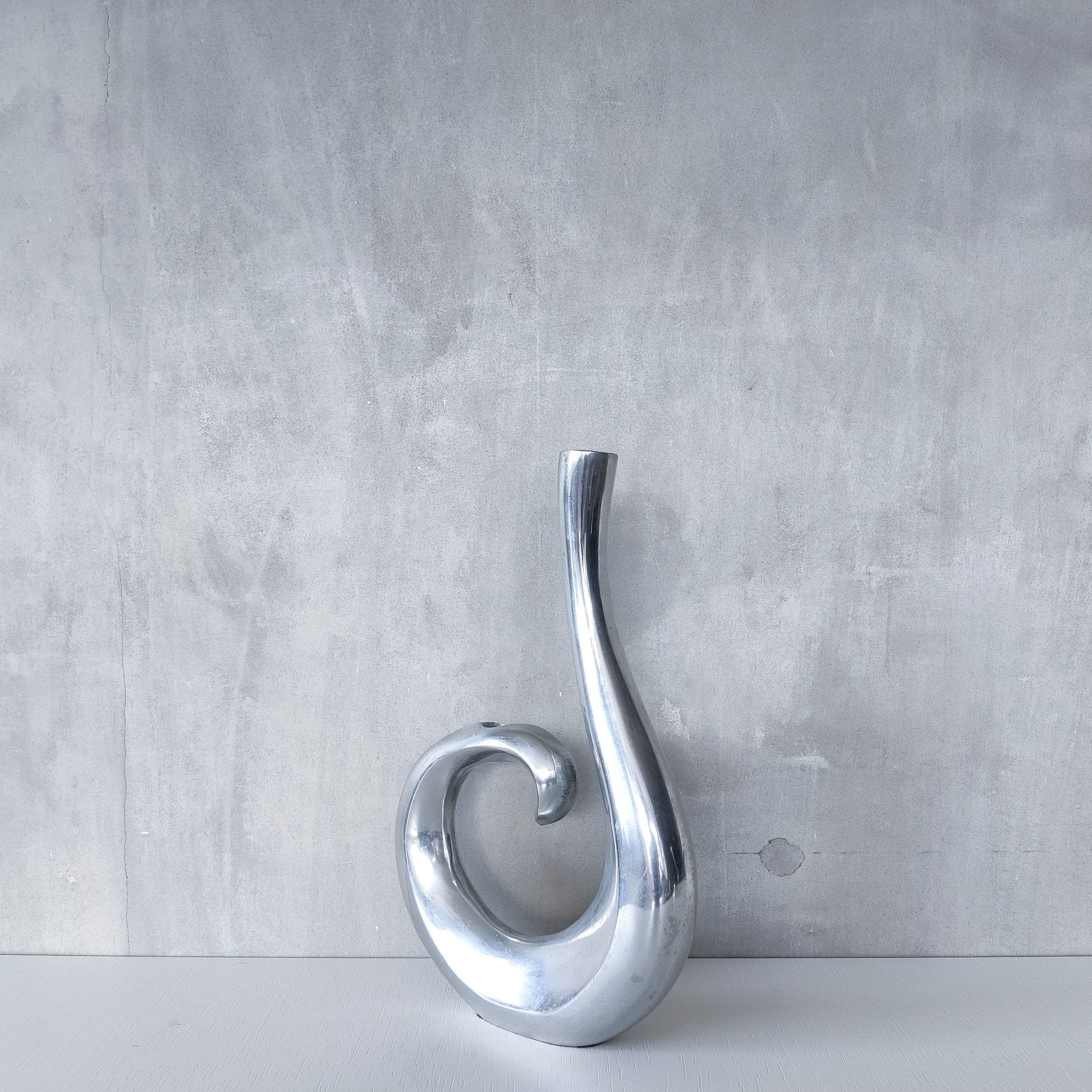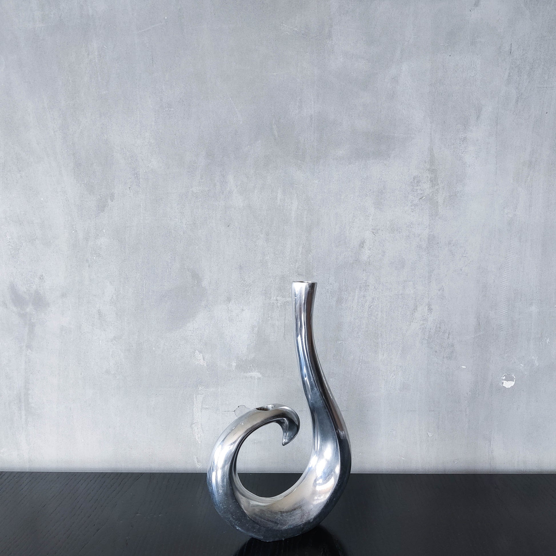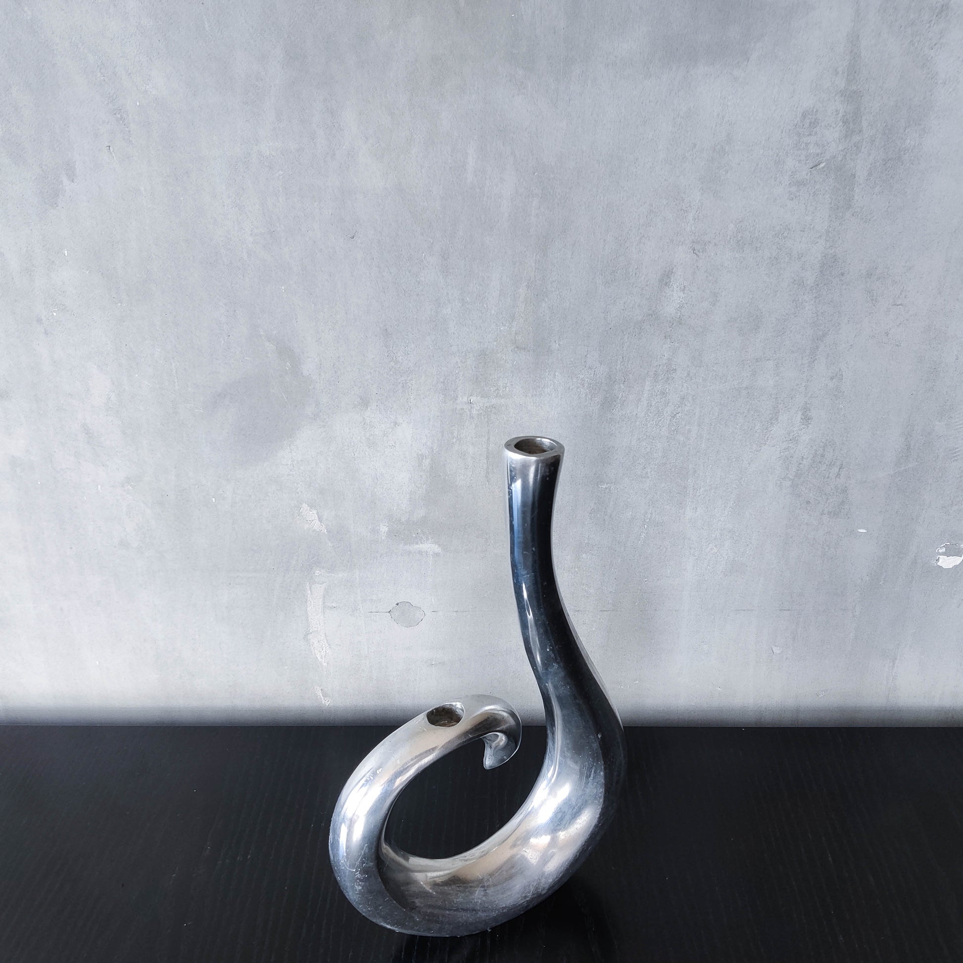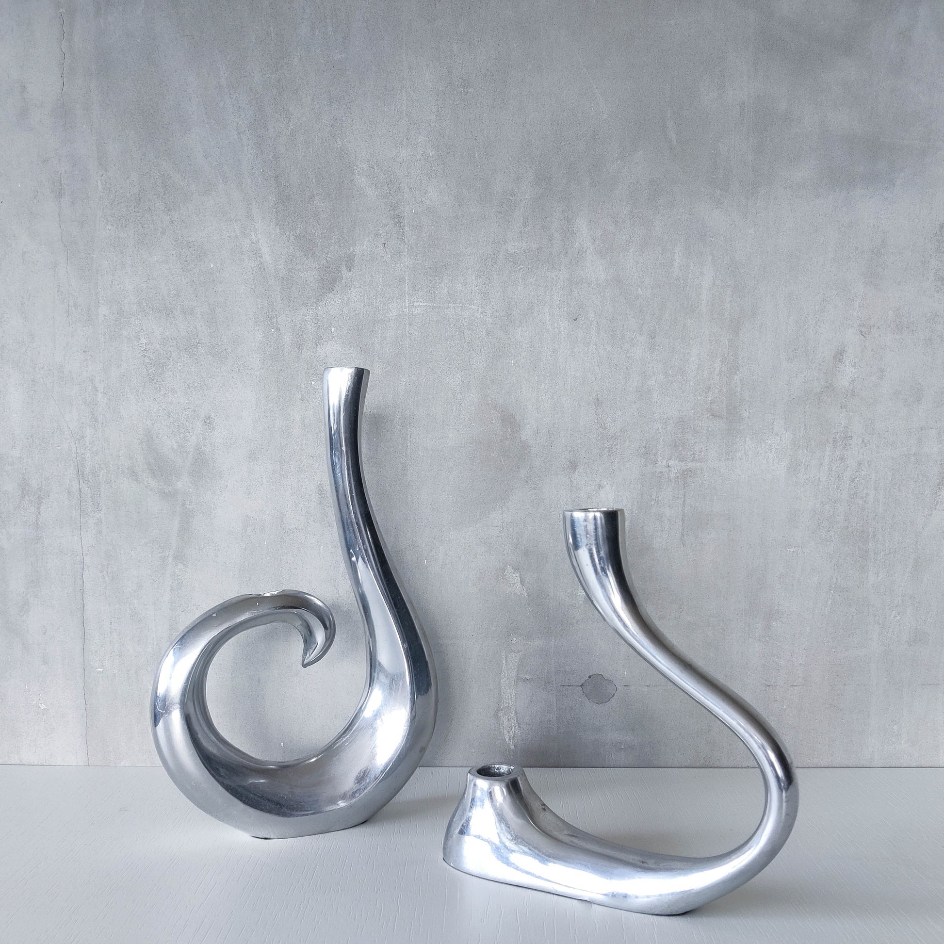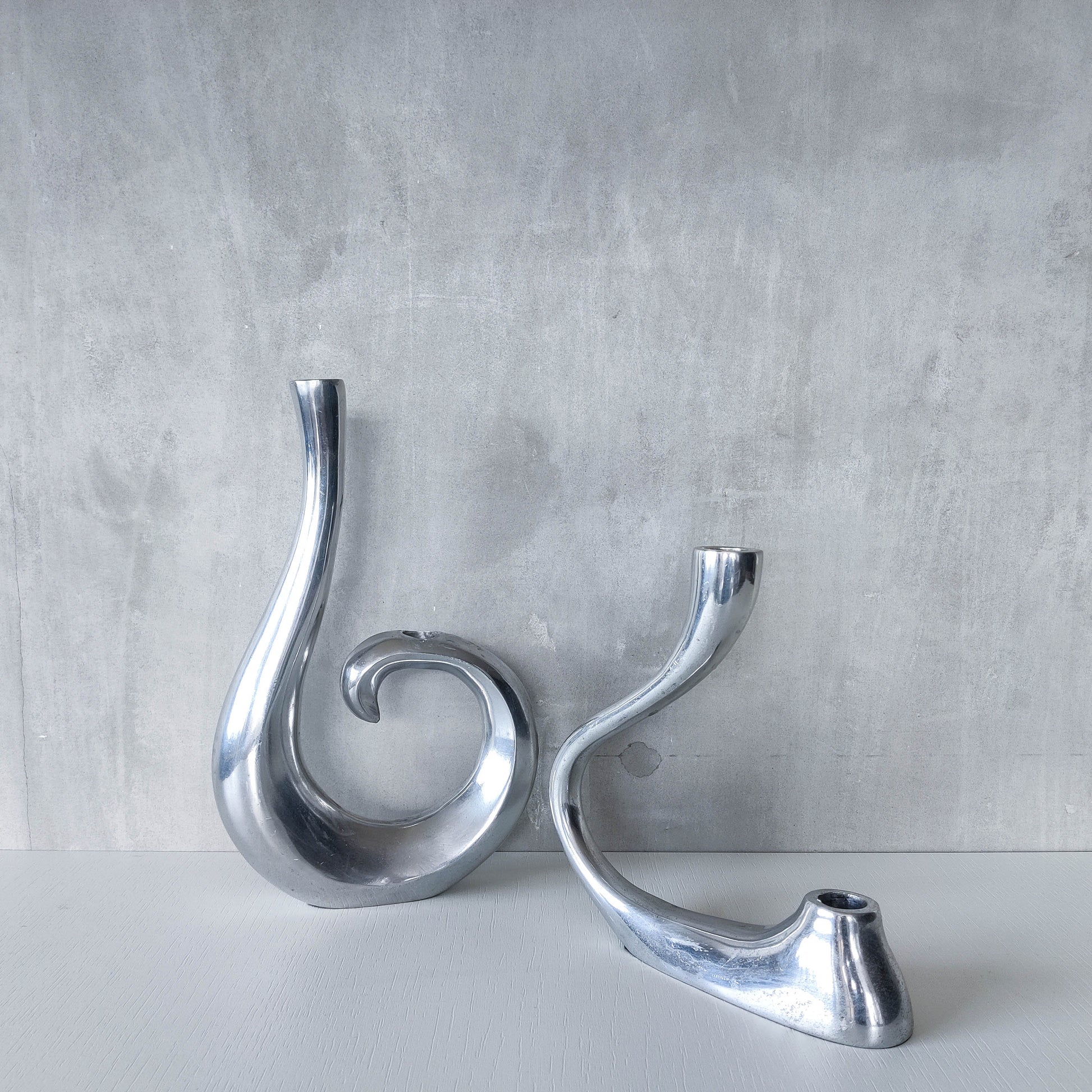 Elegant sculptural cast aluminium (with a chrome look) double candelabra/candle holder for dinner candles. Lovely scale and slightly organic form. Age unknown but I believe circa 1990s. Sorry candles not included. Please see photos and condition description.