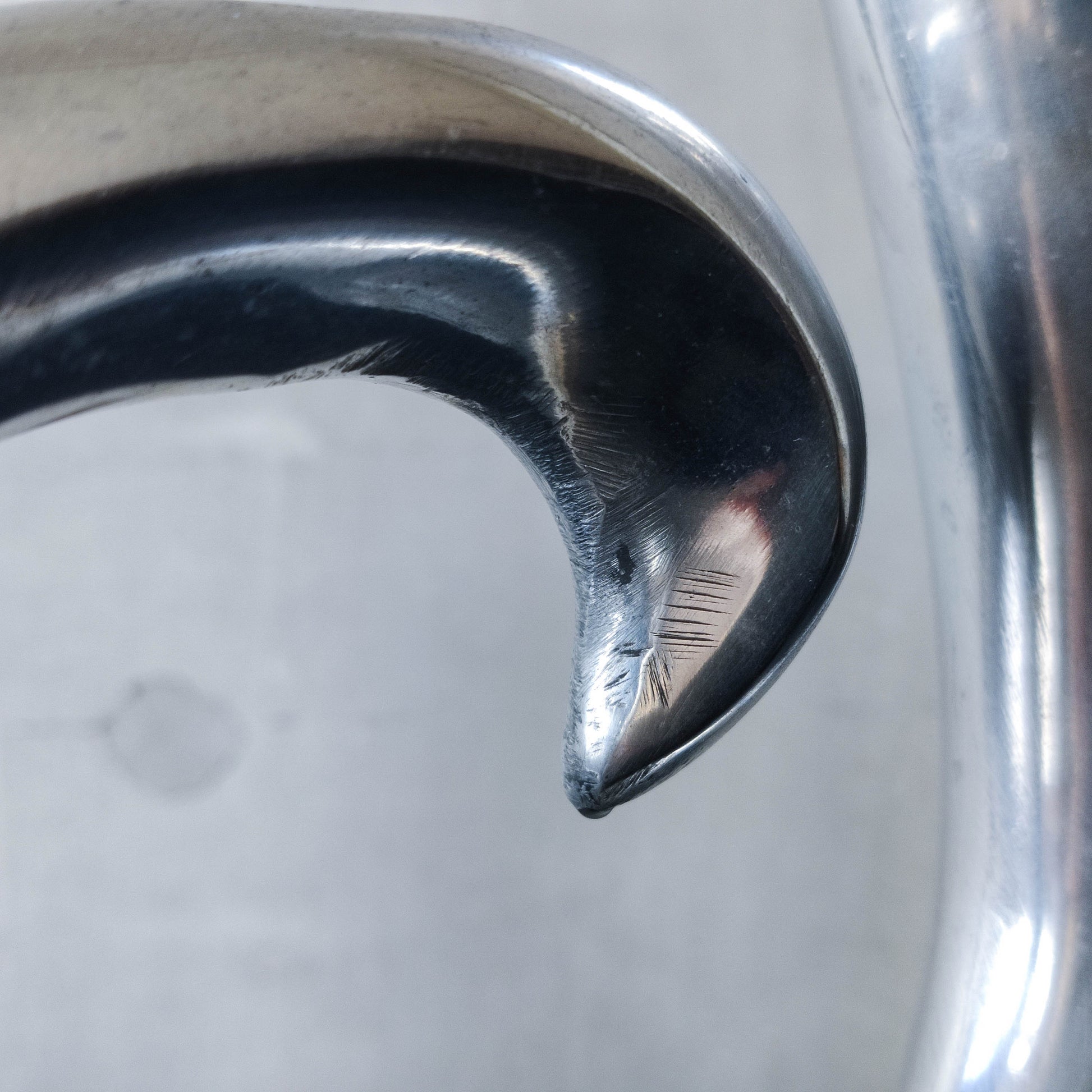 Condition: Some shape and finish irregularities, imperfections and tool marks from the hand casting of this form. Some tarnish, scratches, some dings, small chips and scuffs, unpolished otherwise in good robust vintage condition.