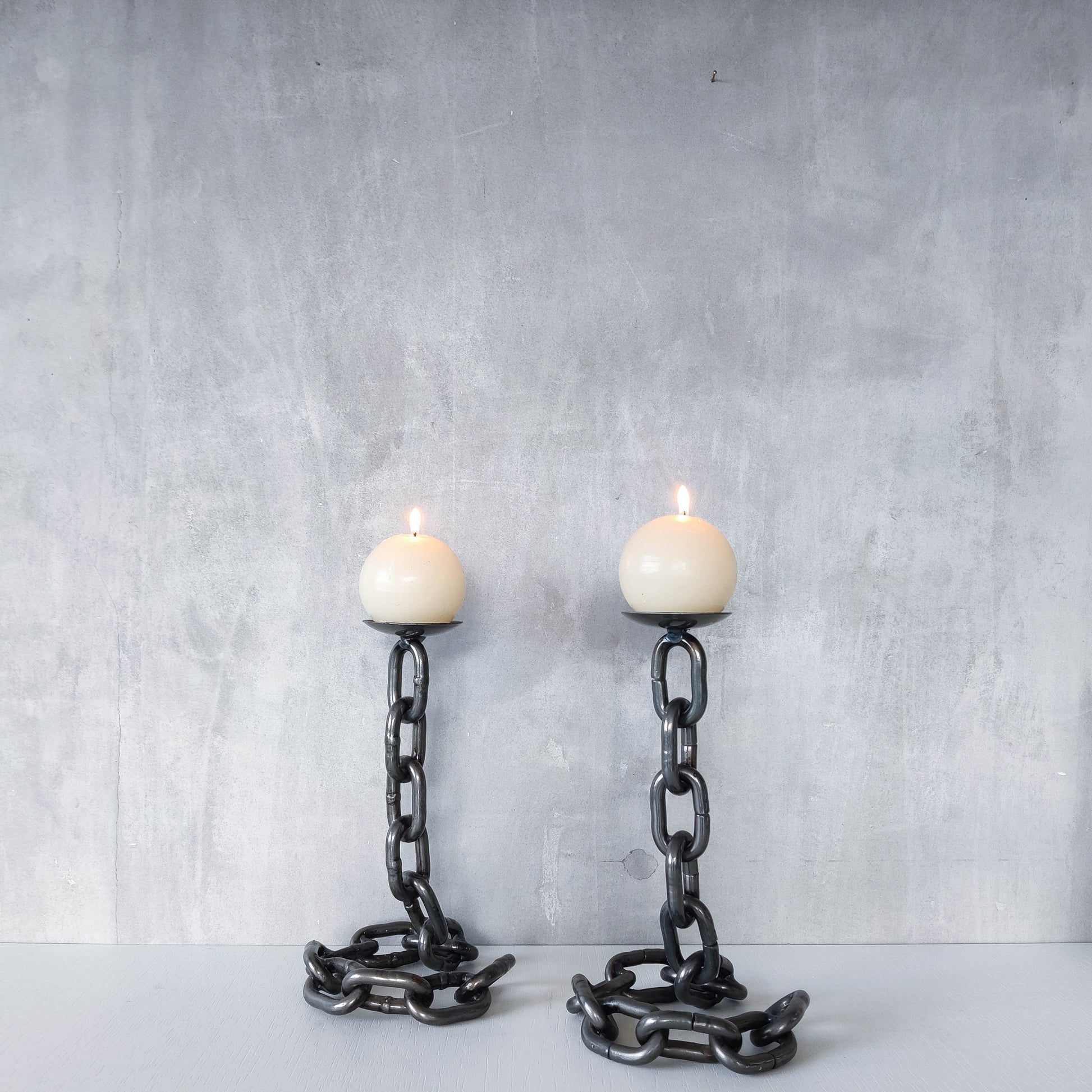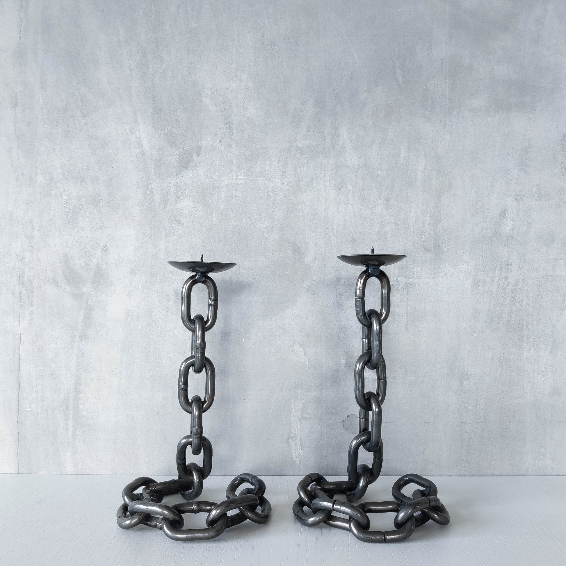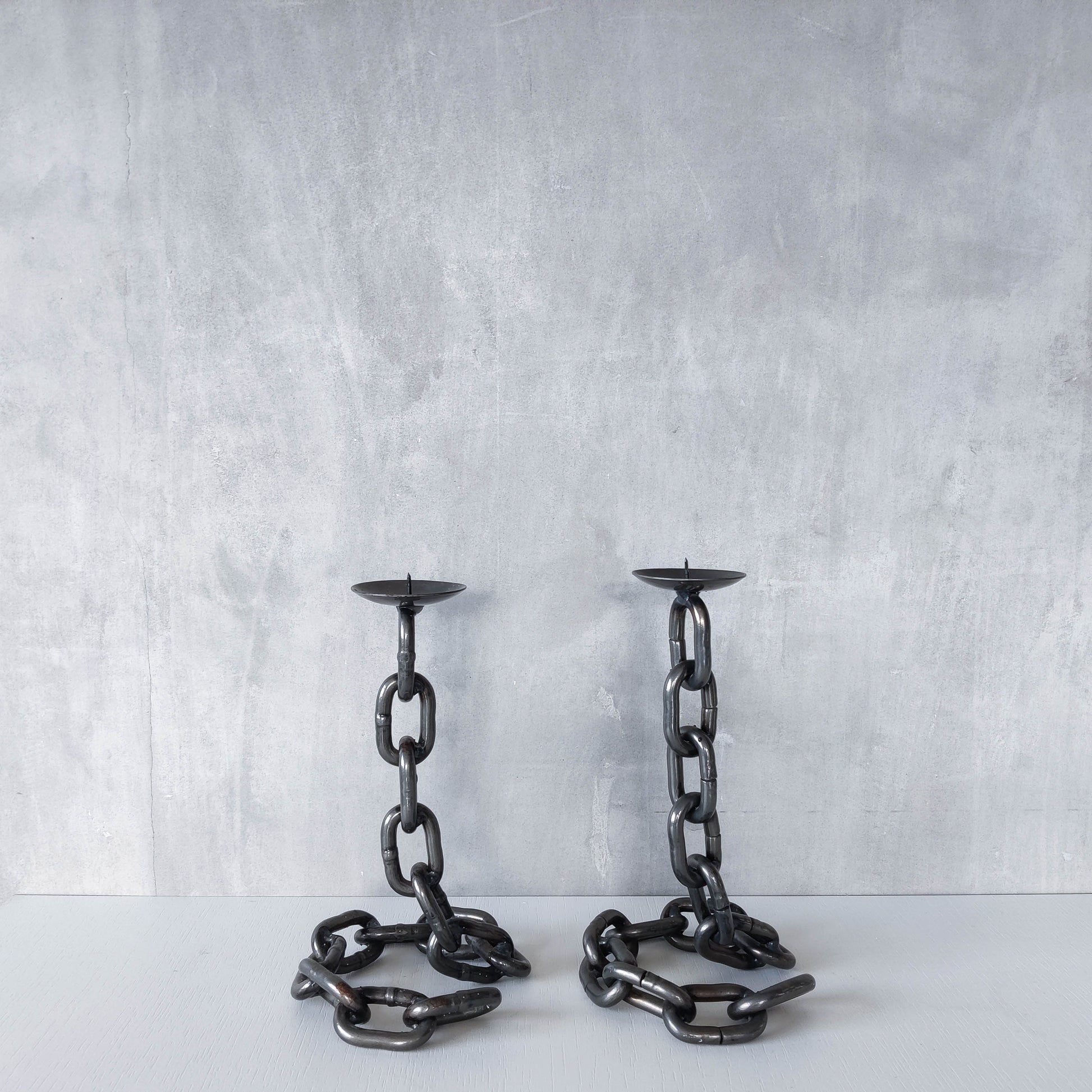 Pair of brutalist heavy hand welded steel chain link sculptural candle holders