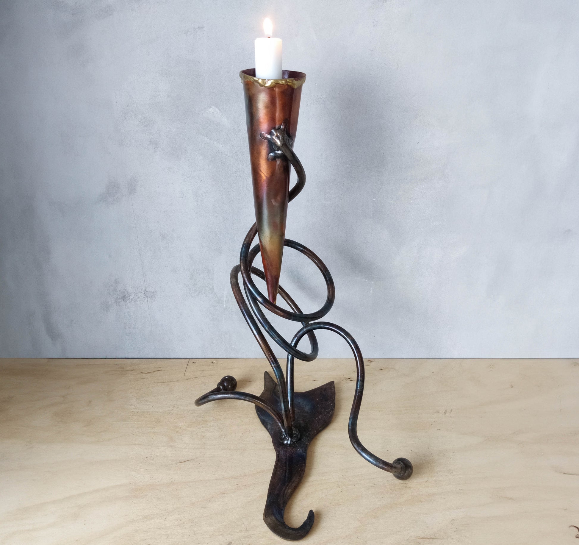 Artisan made welded forged metalwork twisted organic form candlestick sculpture