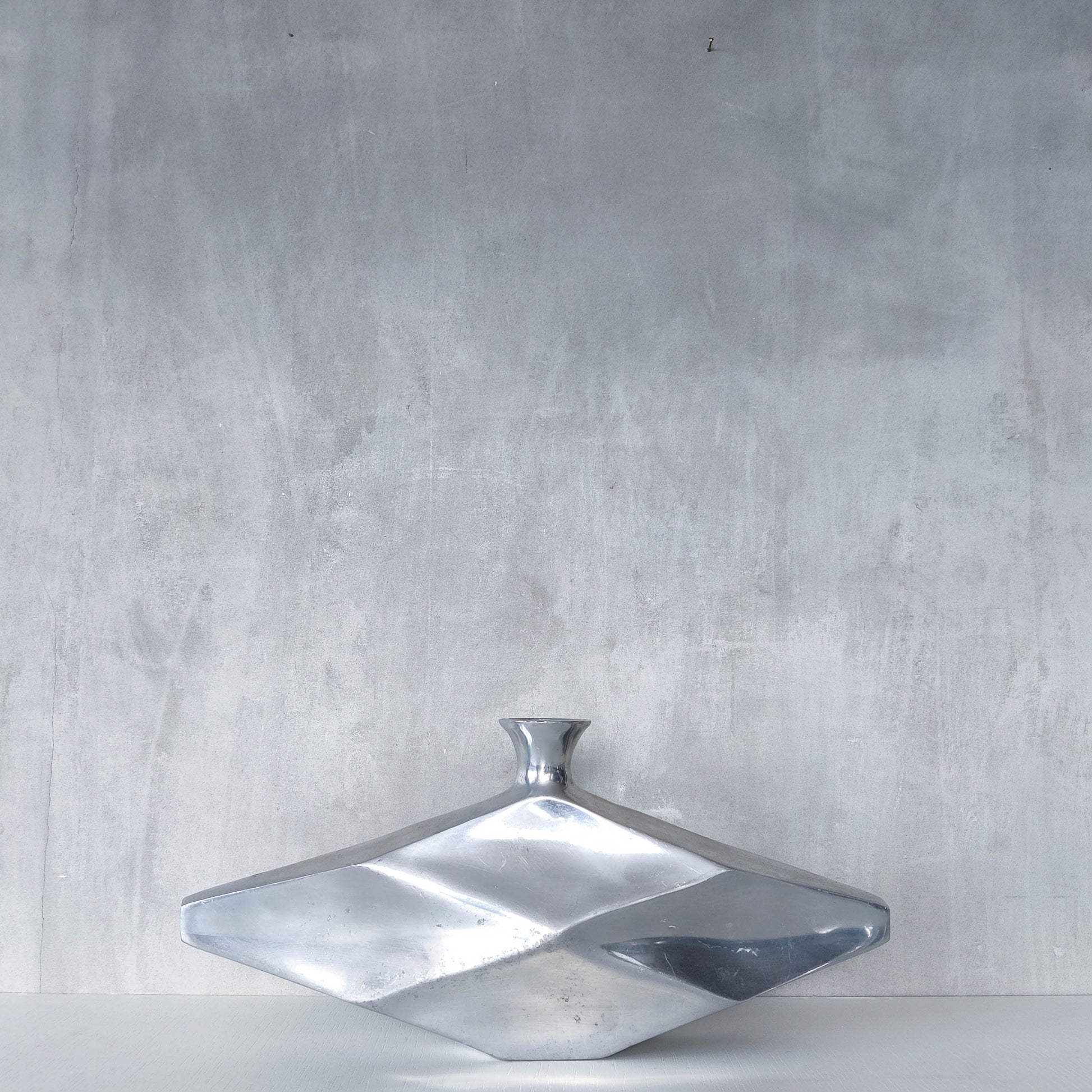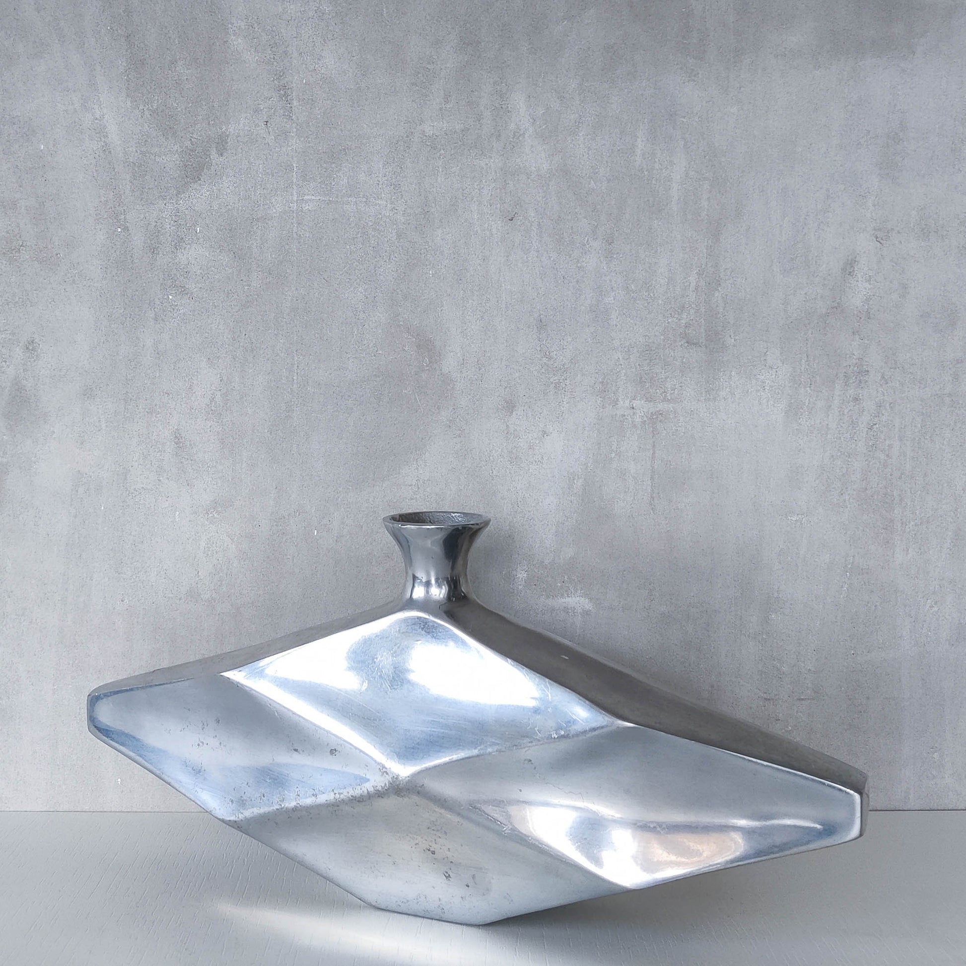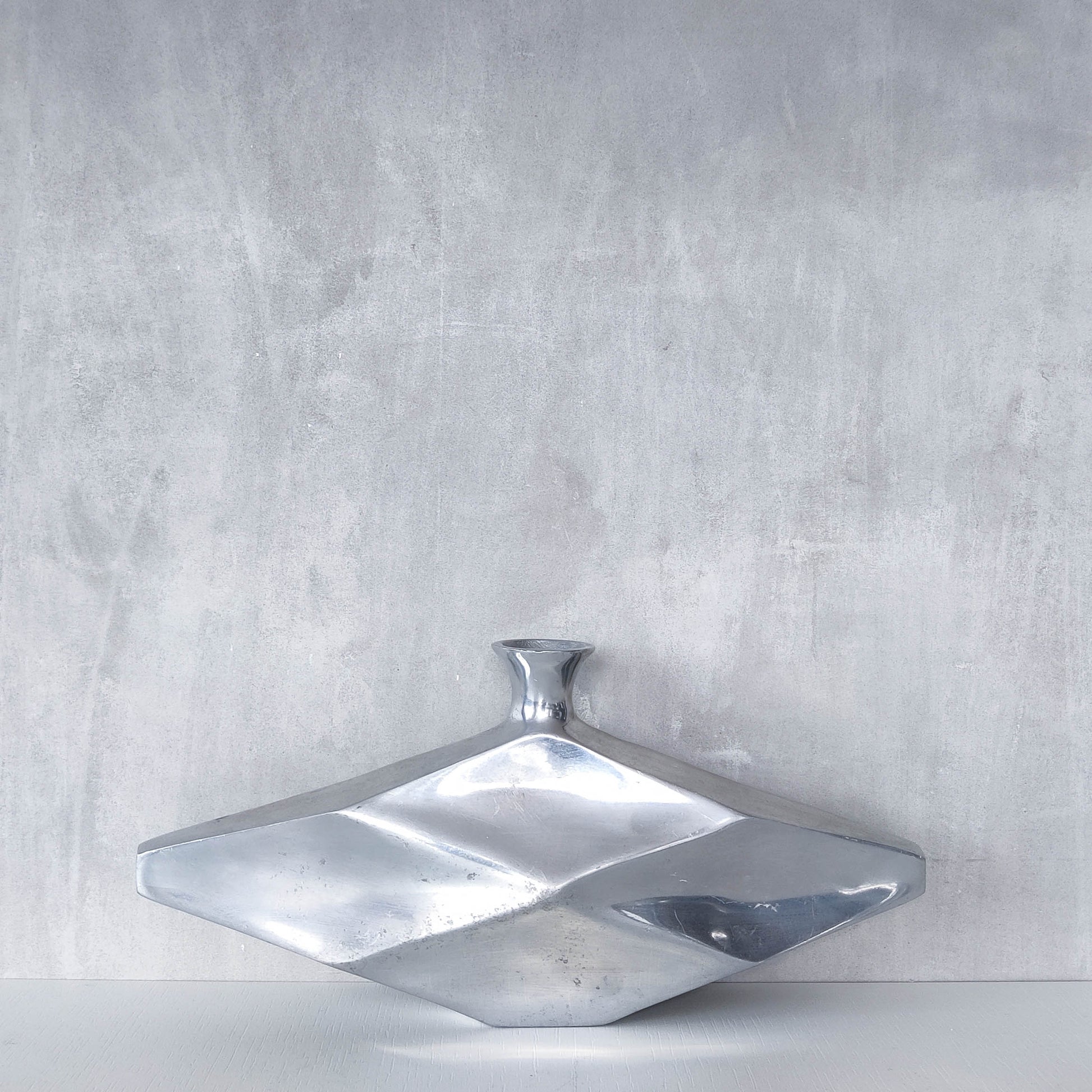 Sculptural large 90s hand cast aluminium modernist flattened vase/bottle form. Great shape with geometric faceted planes and chunky bottle neck. Heavy, thick cast aluminium (weighs approx. 1.2kg). Some age related surface wear, but doesn't detract from the object, only obvious on close inspection! Please see photos and condition description.
