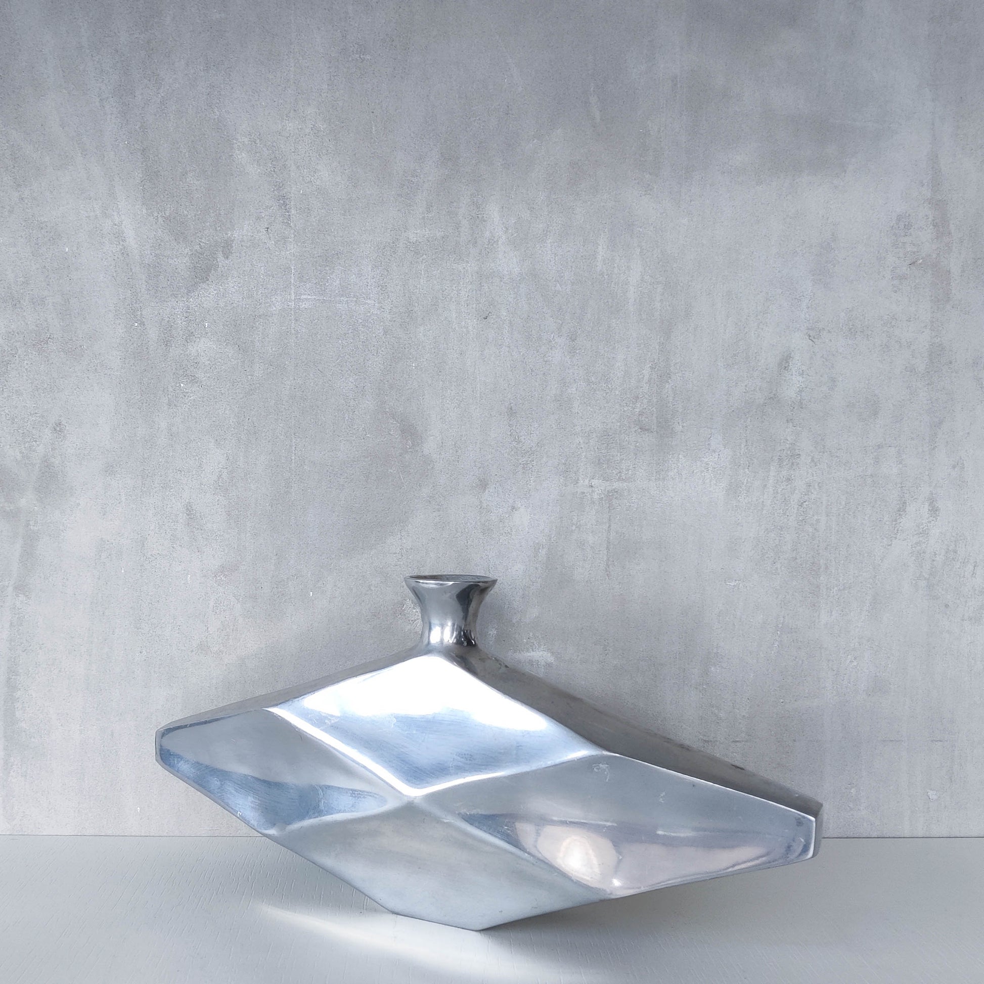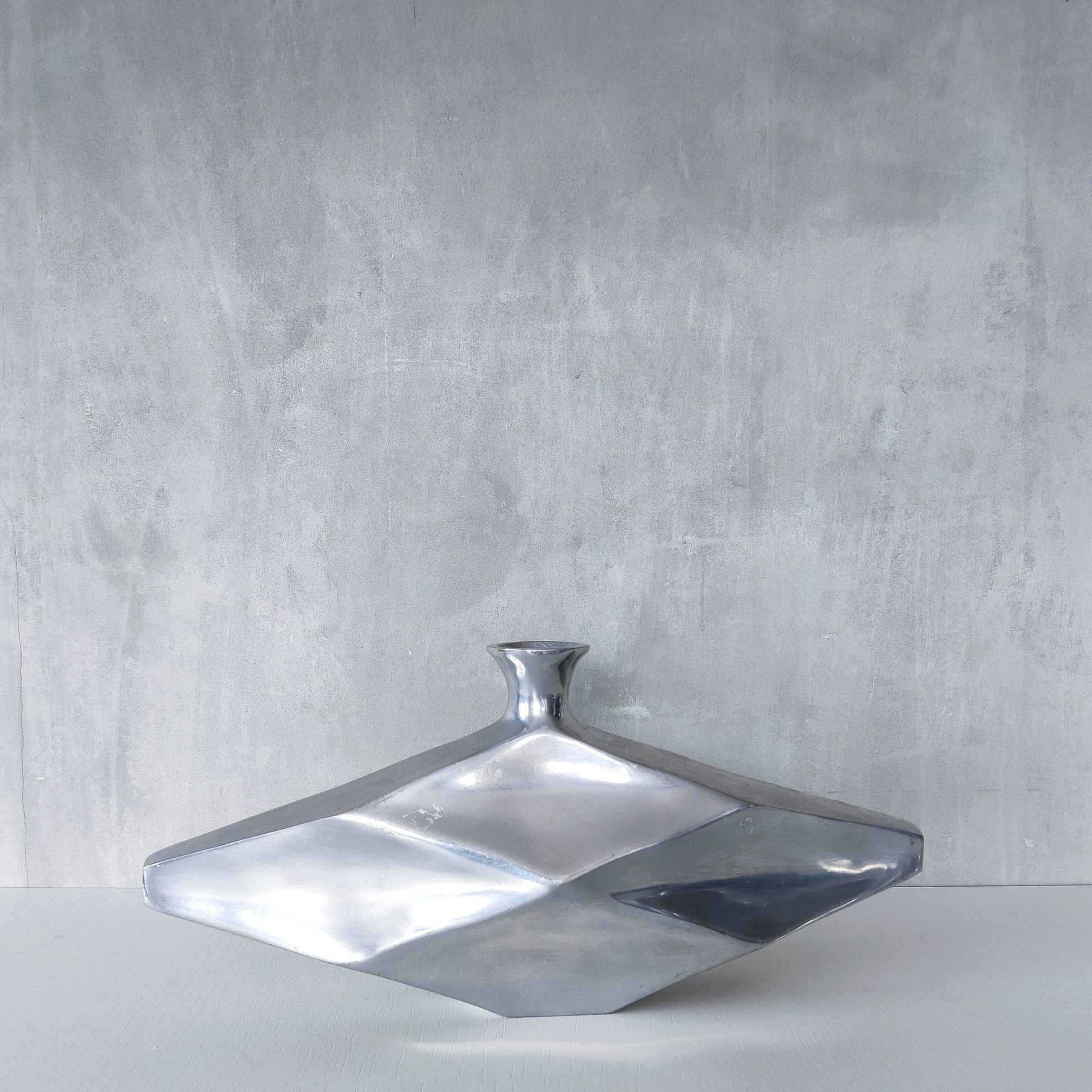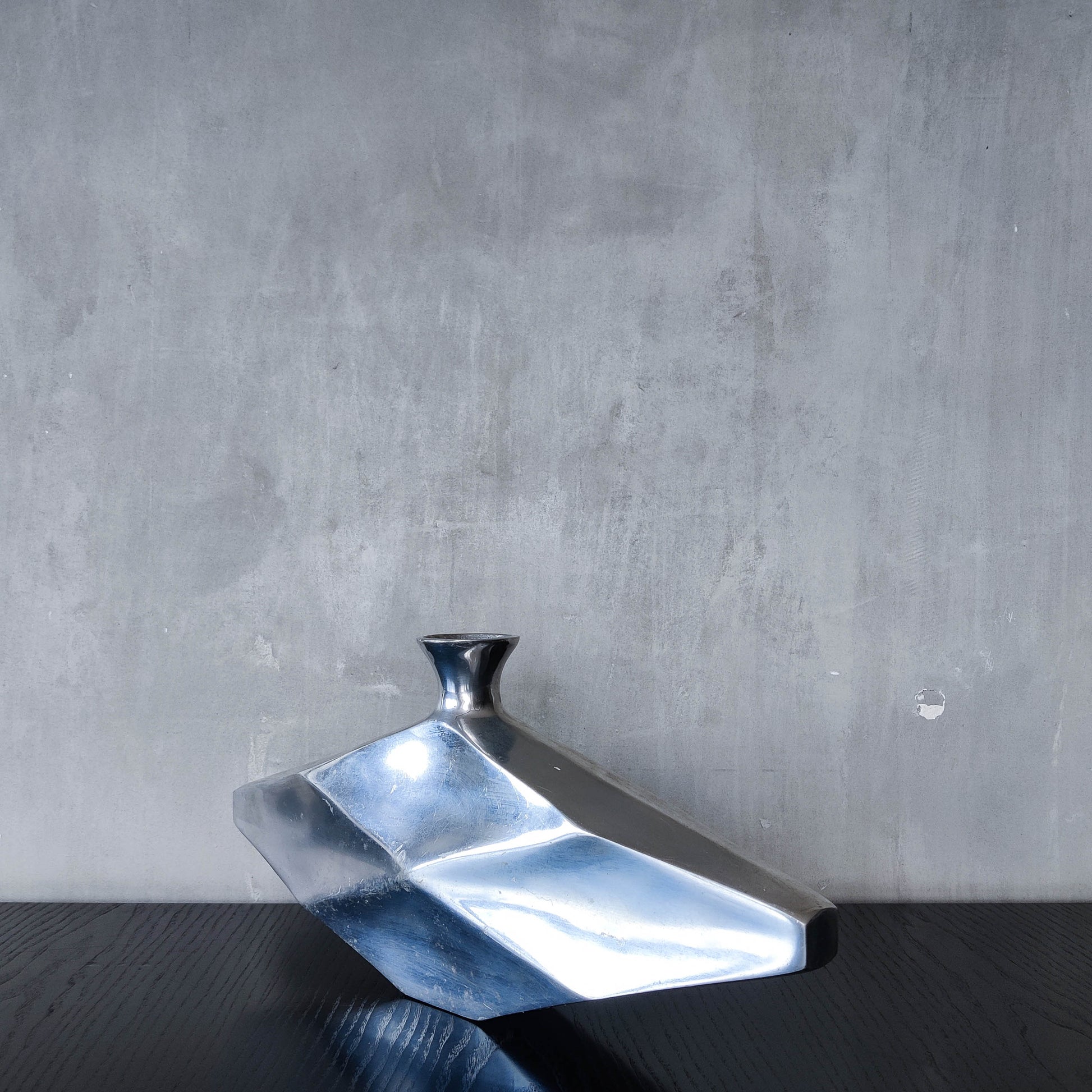 Sculptural large 90s hand cast aluminium modernist flattened vase/bottle form. Great shape with geometric faceted planes and chunky bottle neck. Heavy, thick cast aluminium (weighs approx. 1.2kg). Some age related surface wear, but doesn't detract from the object, only obvious on close inspection! Please see photos and condition description.