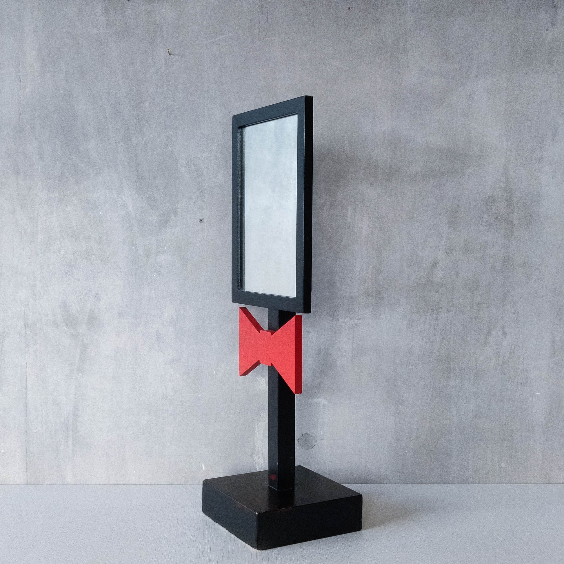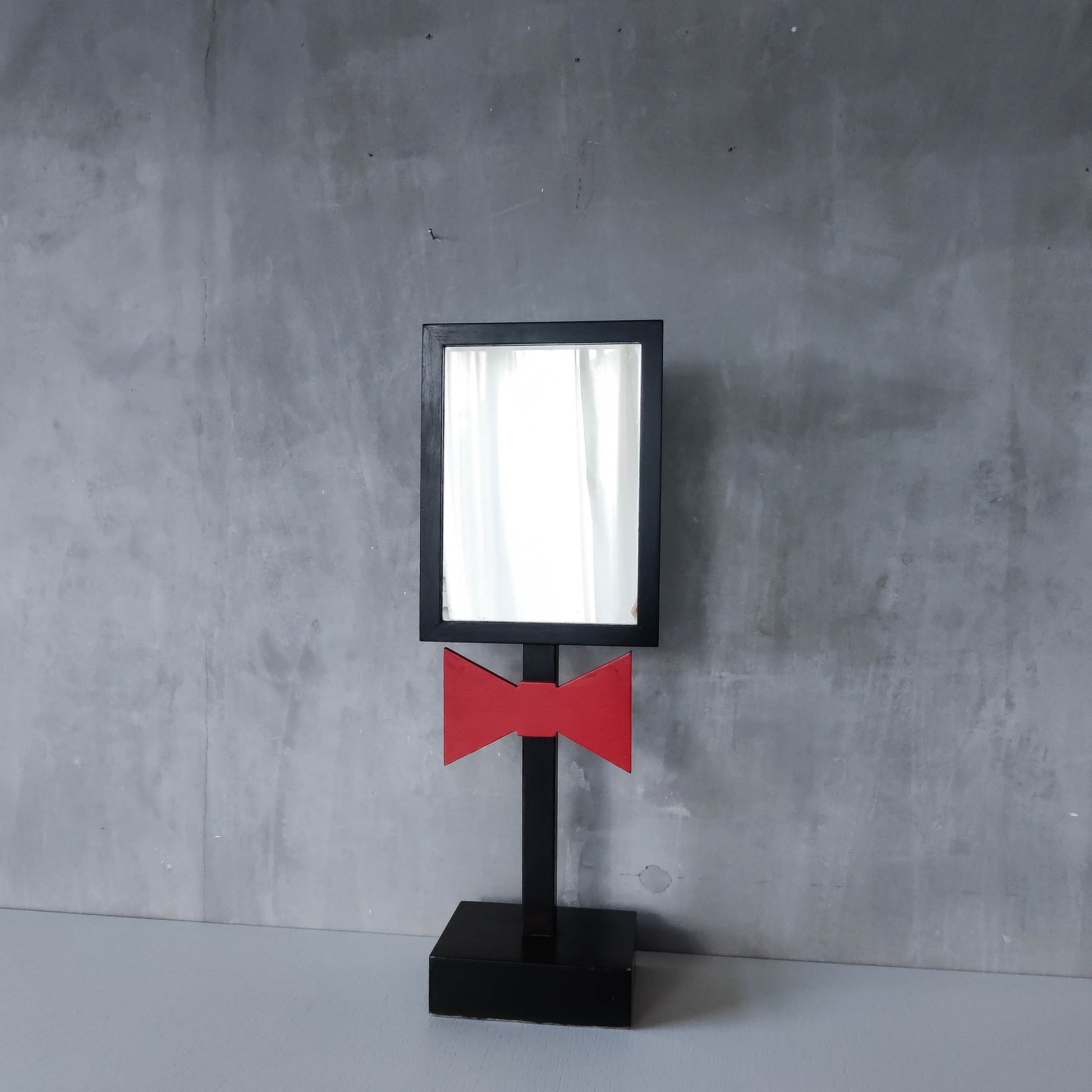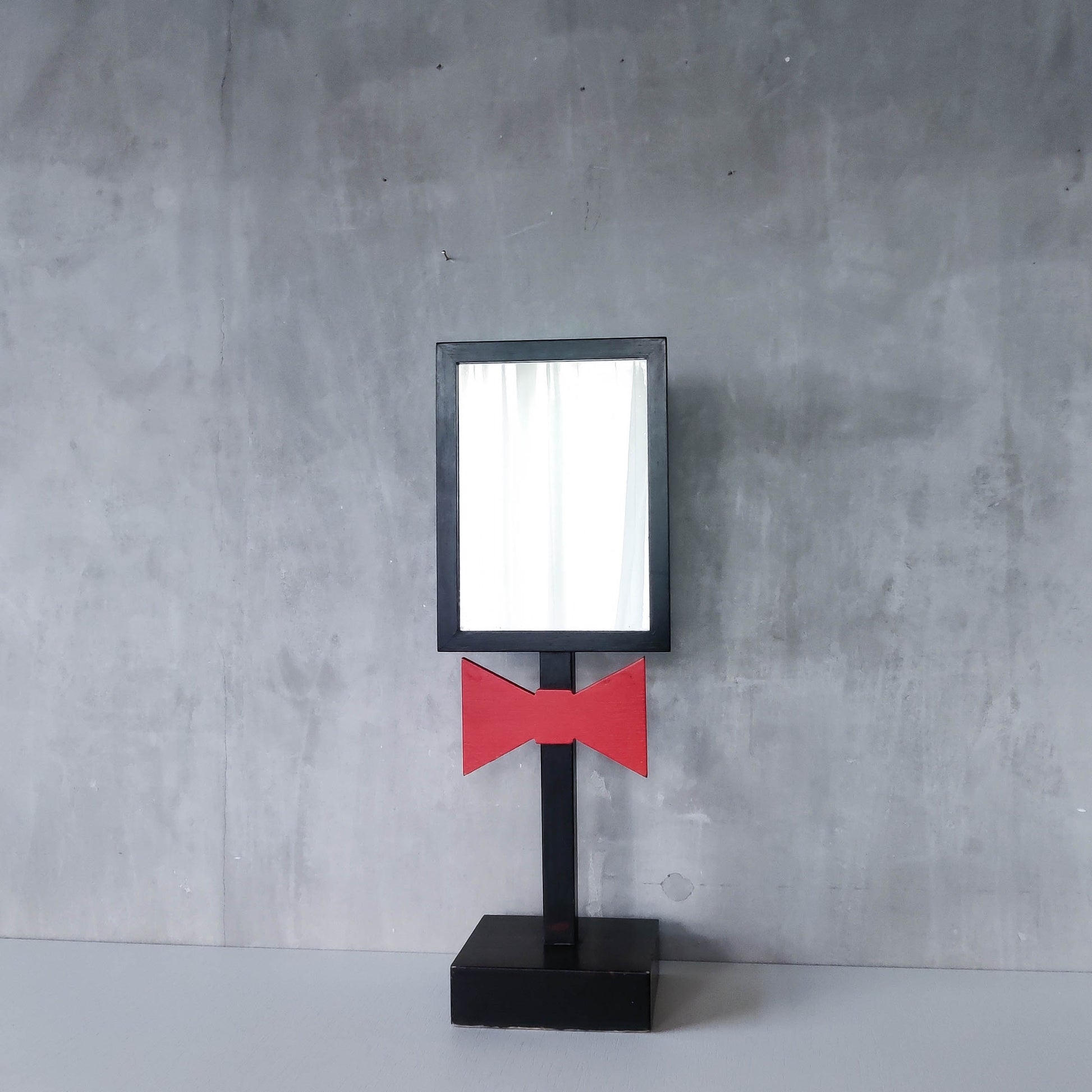 A charming 1980s tabletop mirror, very well and neatly made out of black painted hardwood with red bow tie motif and hardwood plinth base. Please see photos and condition description.