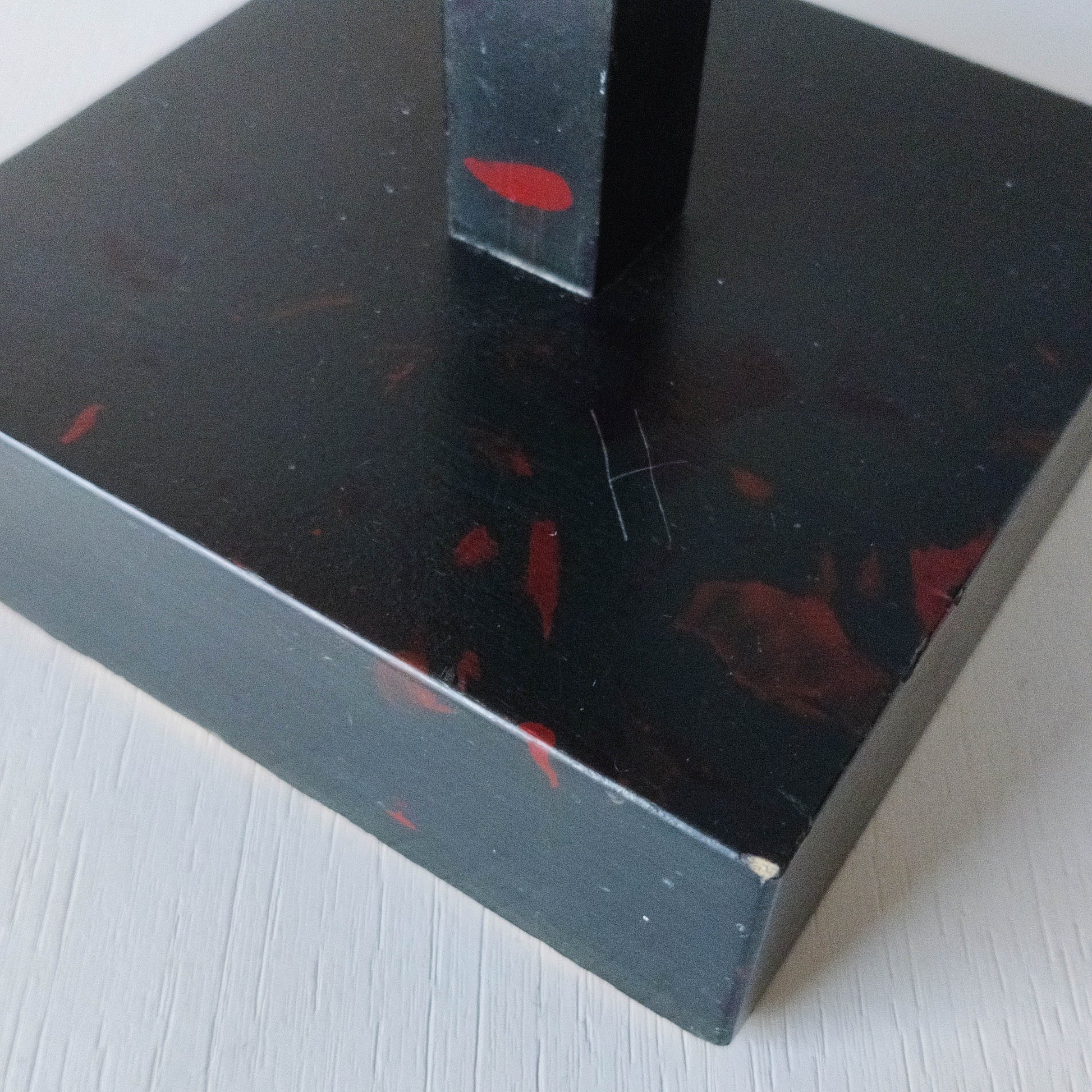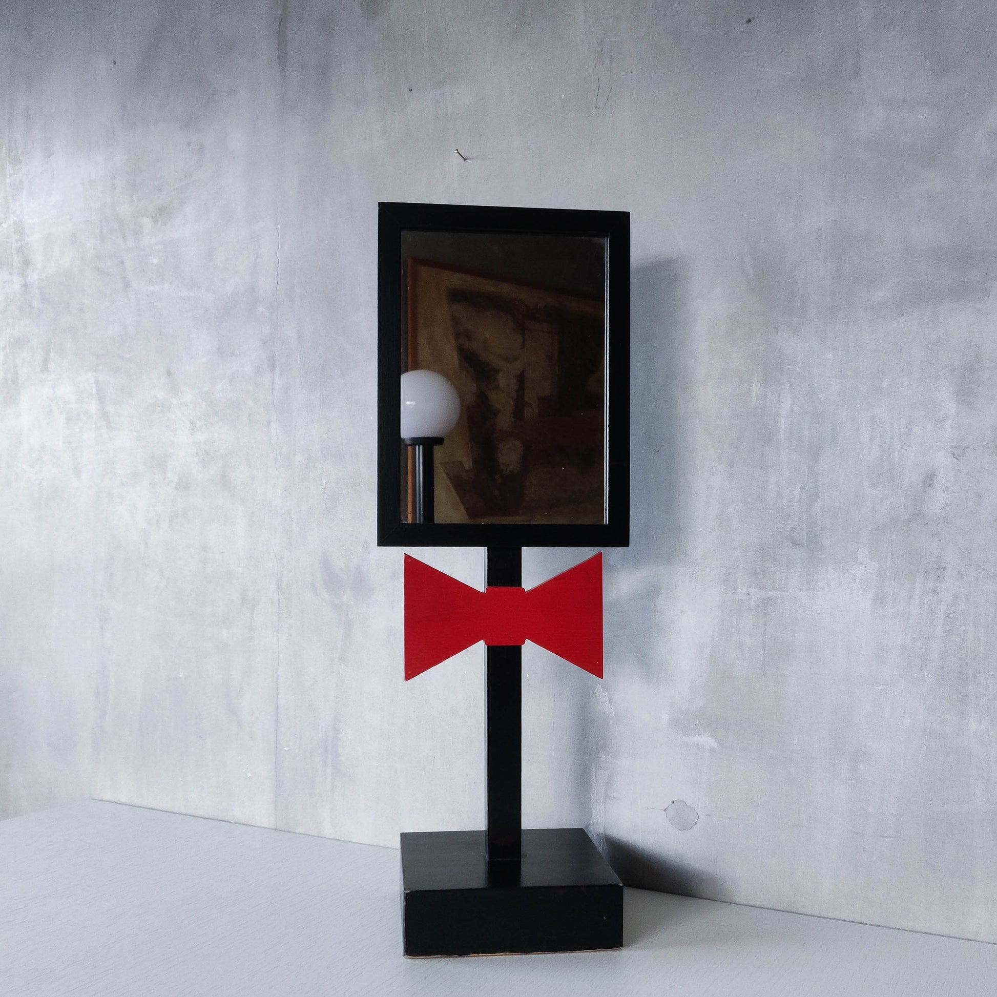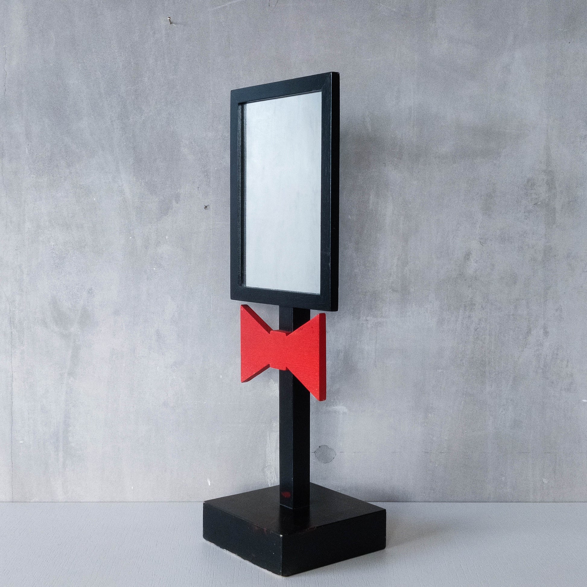 A charming 1980s tabletop mirror, very well and neatly made out of black painted hardwood with red bow tie motif and hardwood plinth base. Please see photos and condition description.