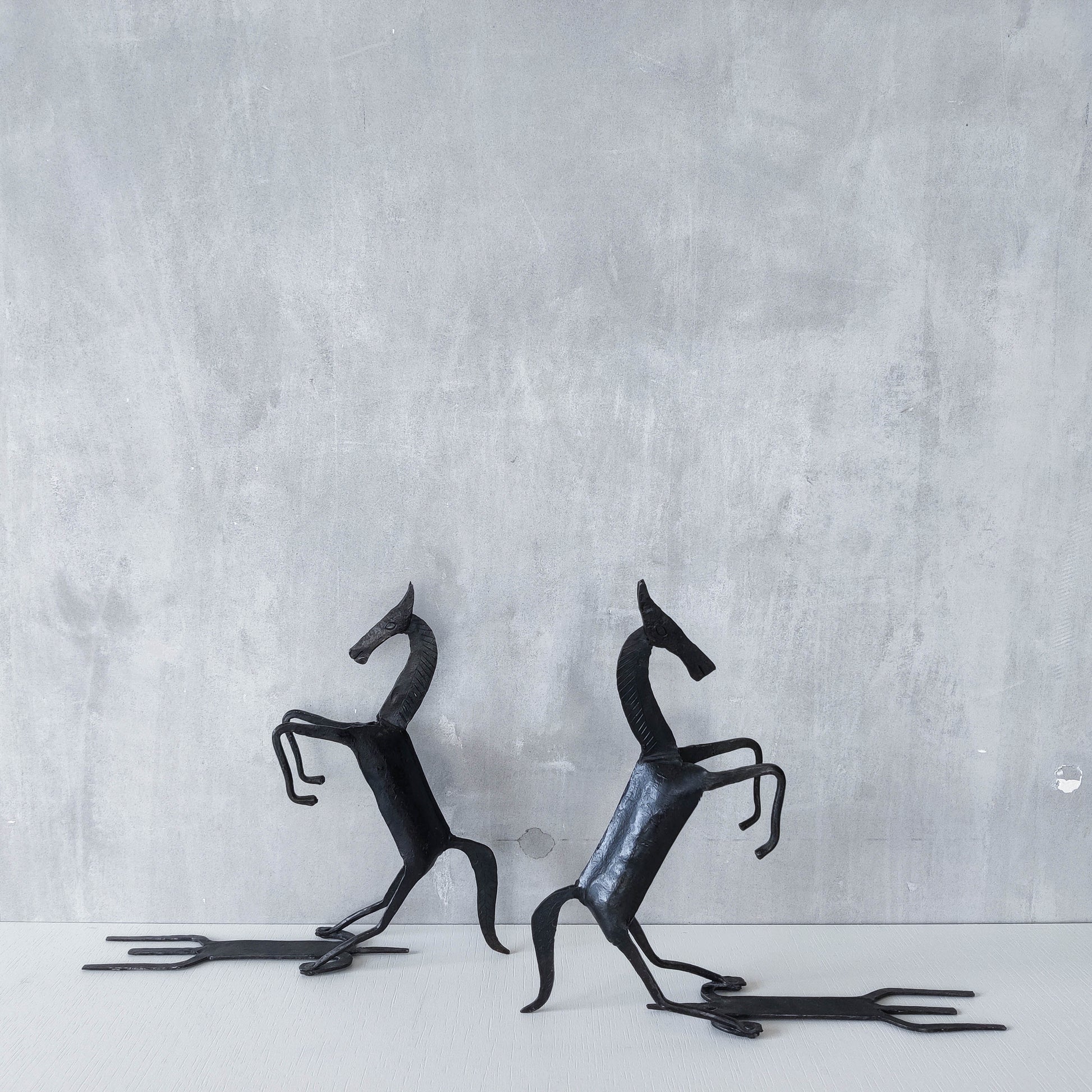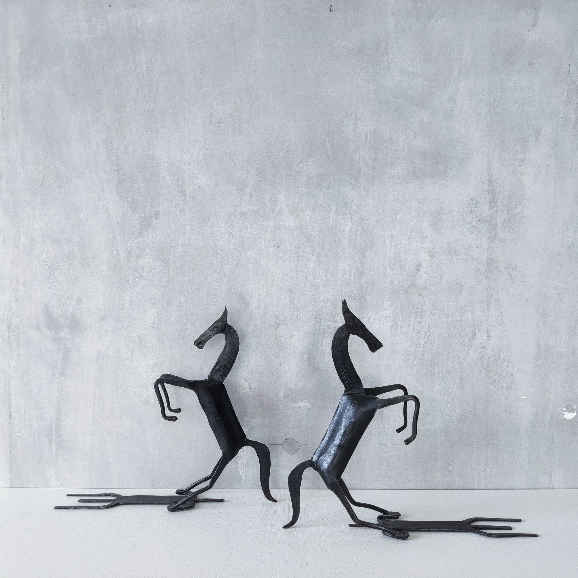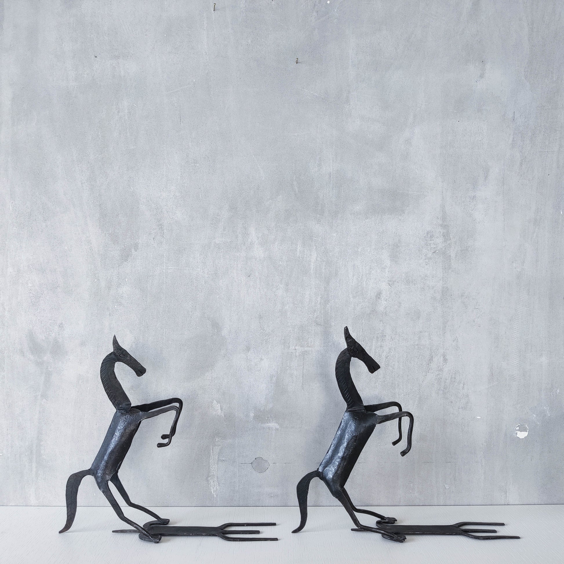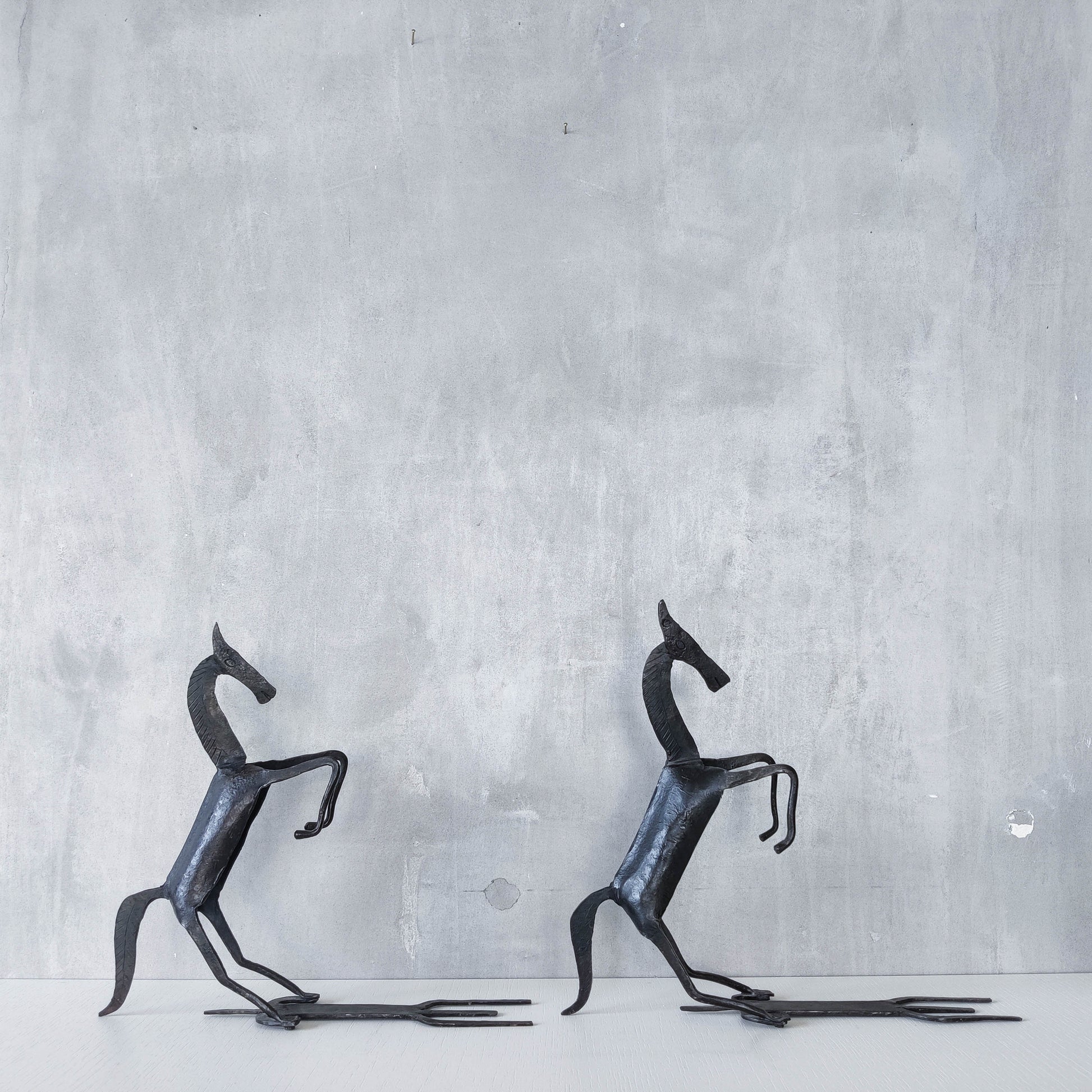 Vintage brutalist pair of hand forged patinated steel horses bookends sculptures