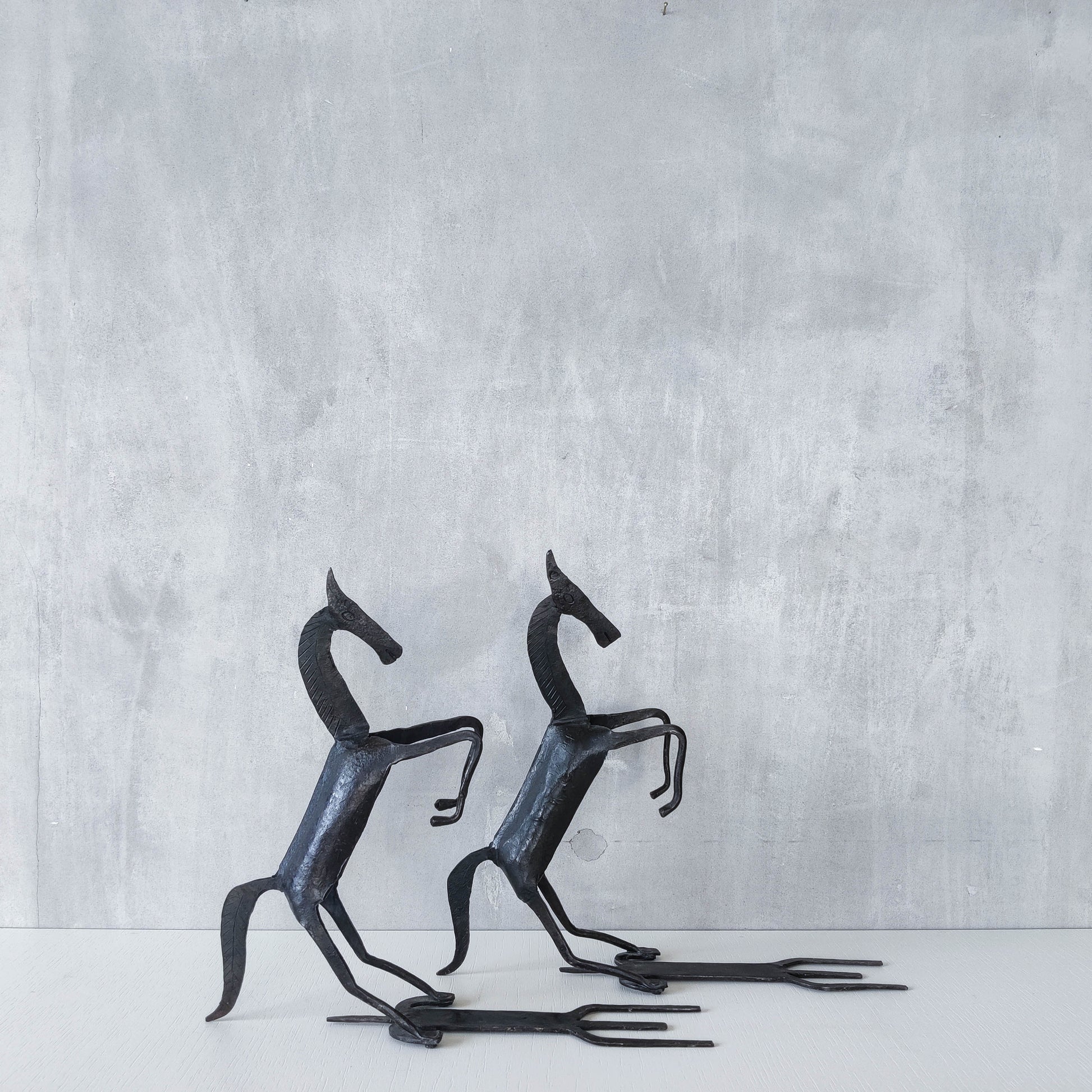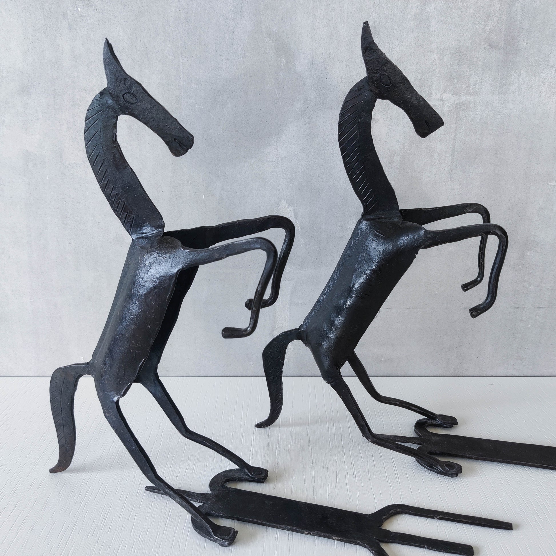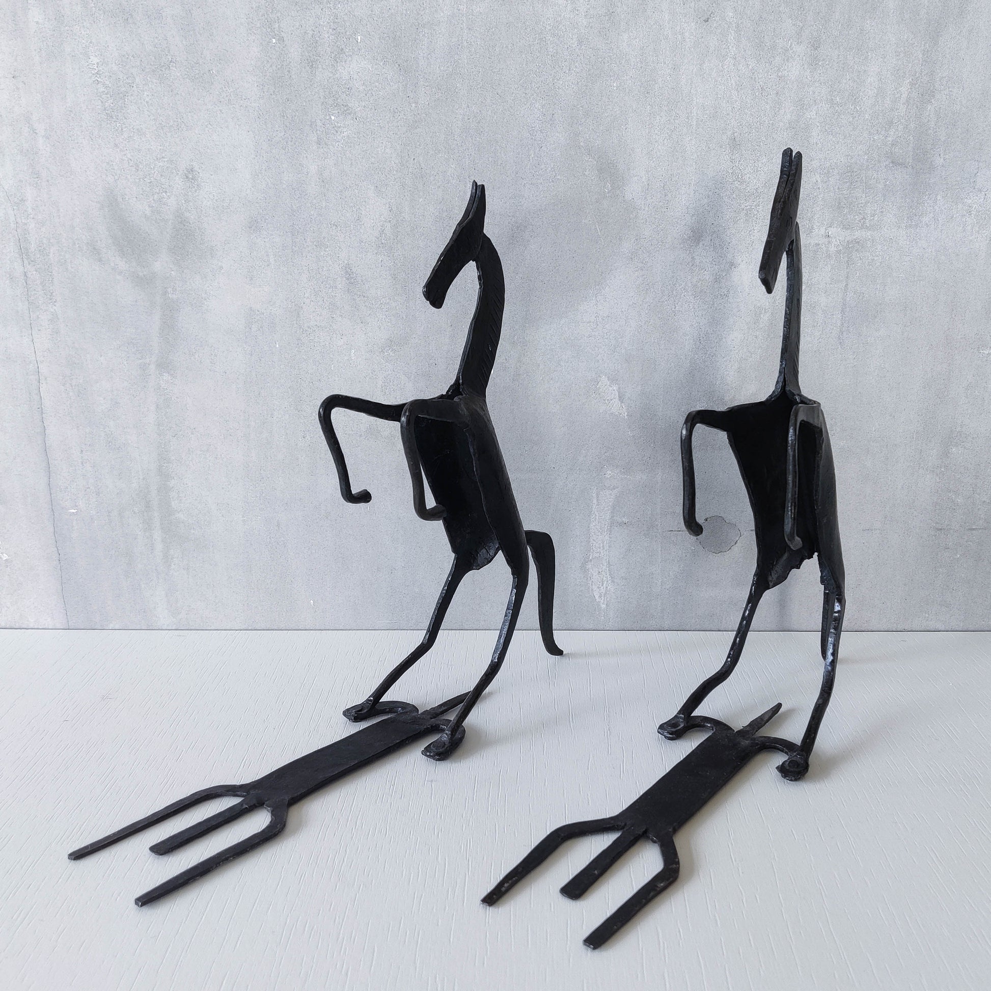 Vintage brutalist pair of hand forged patinated steel horses bookends sculptures