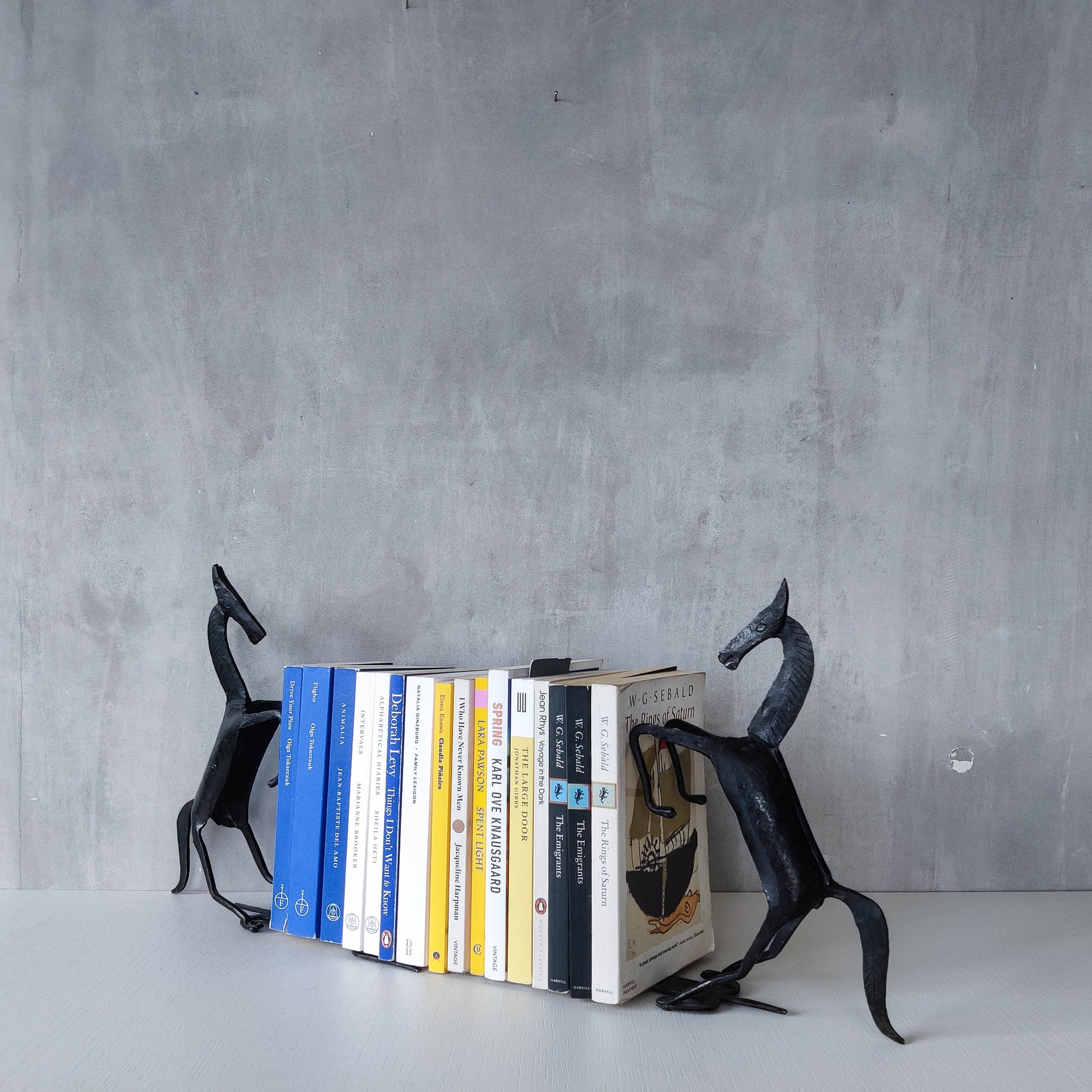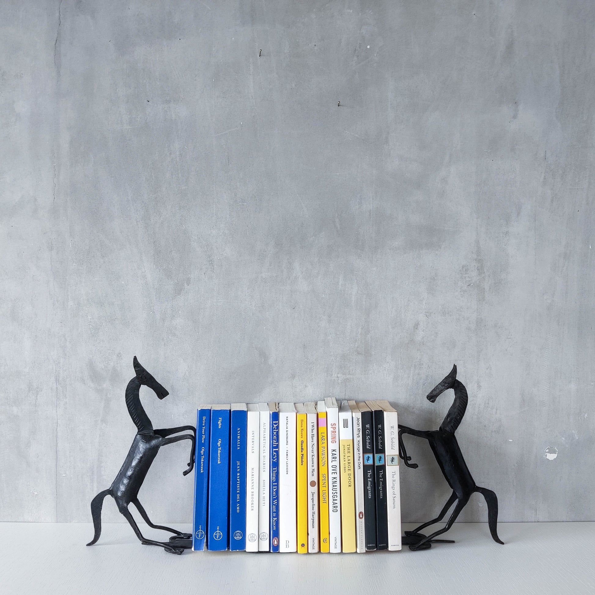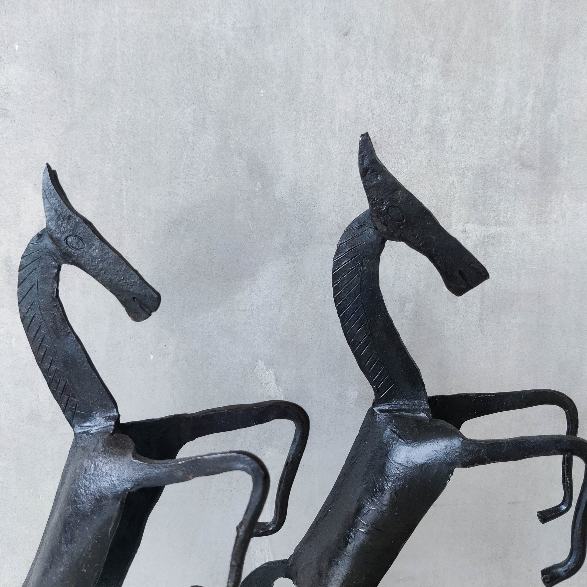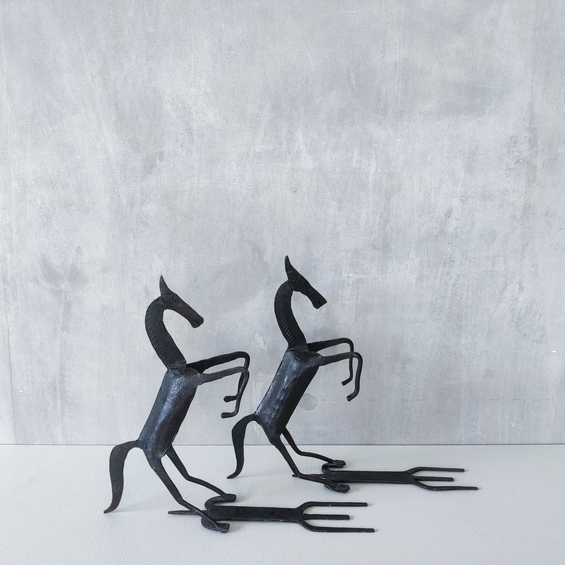 Vintage brutalist pair of hand forged patinated steel horses bookends sculptures