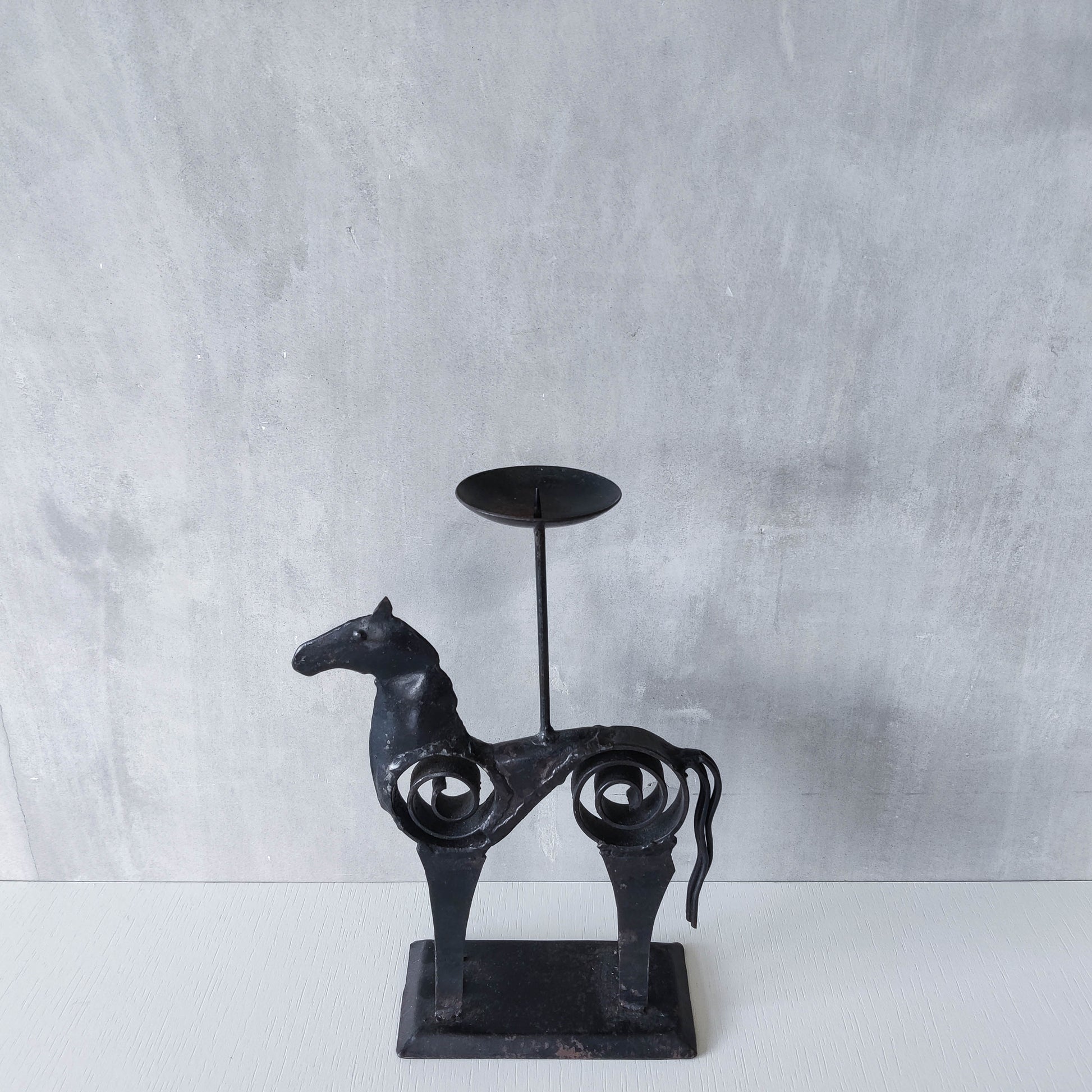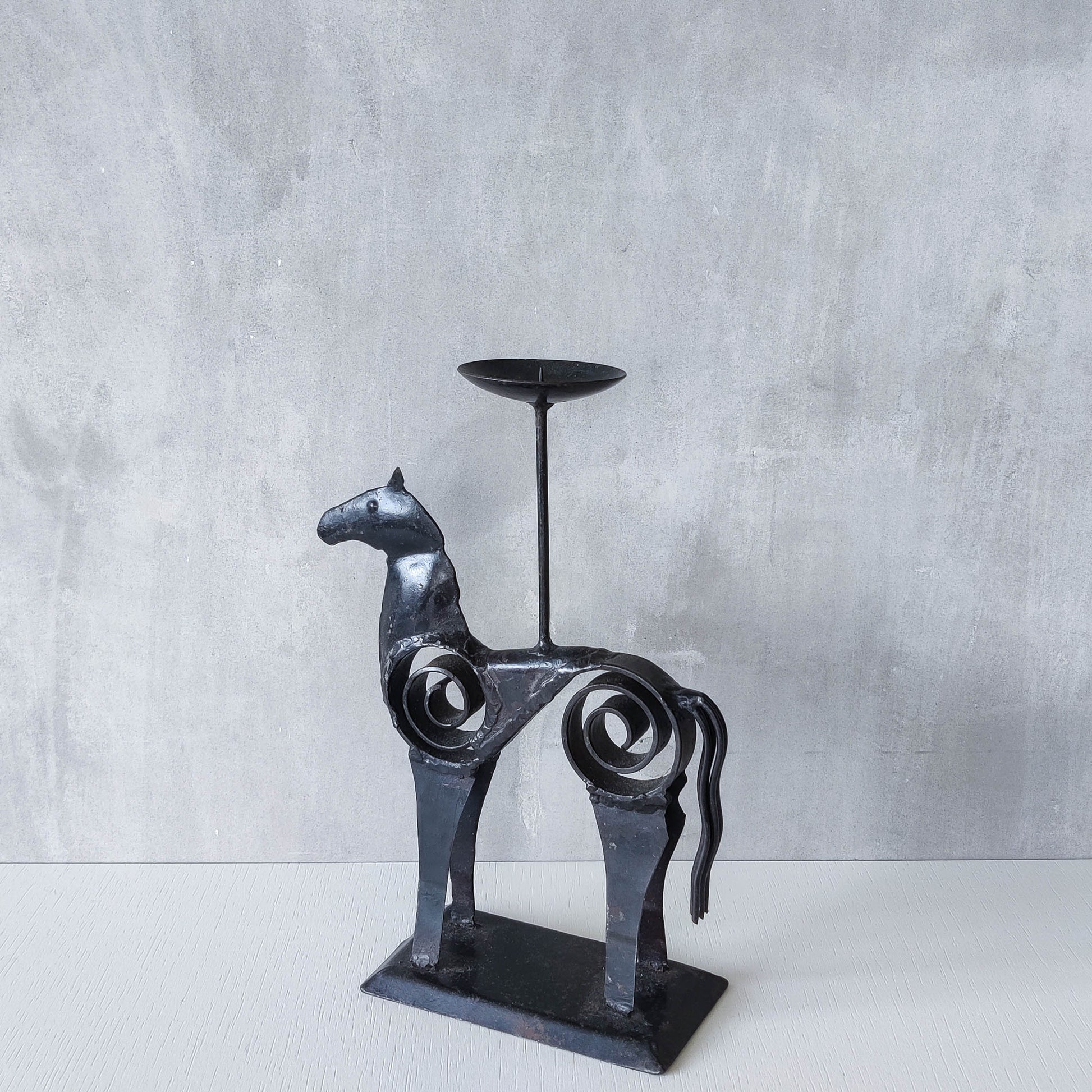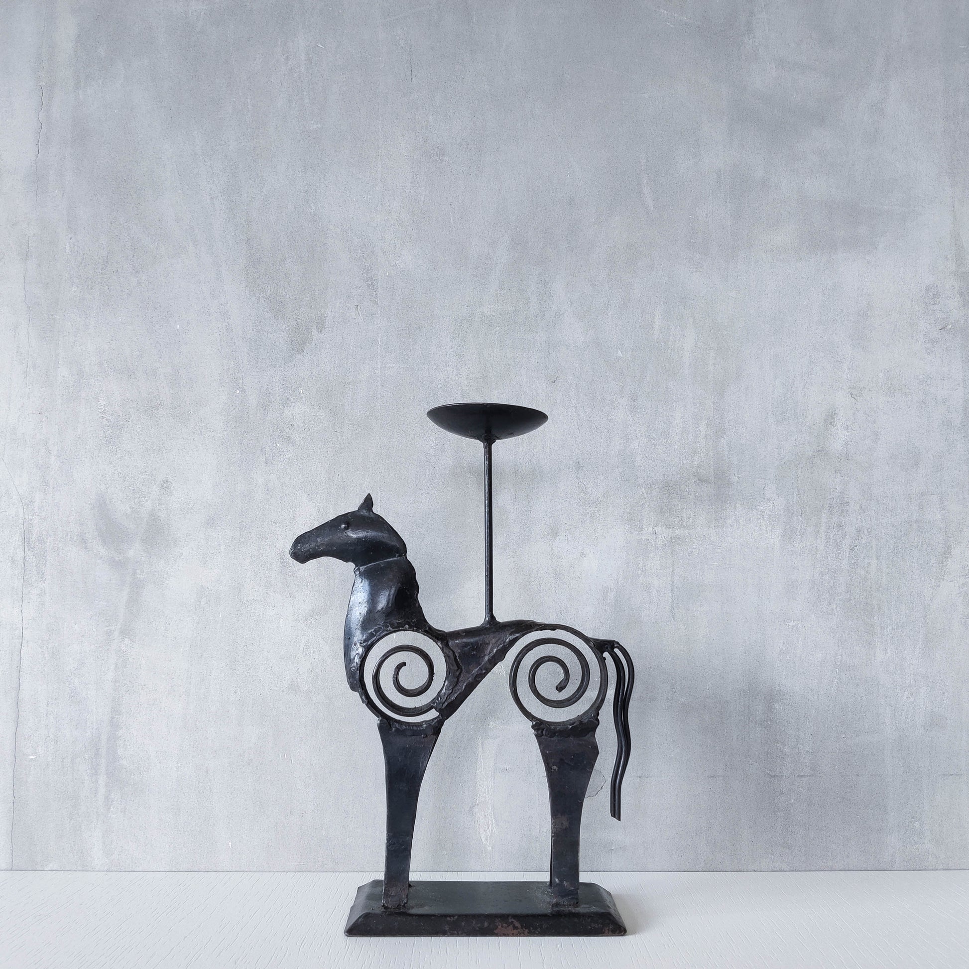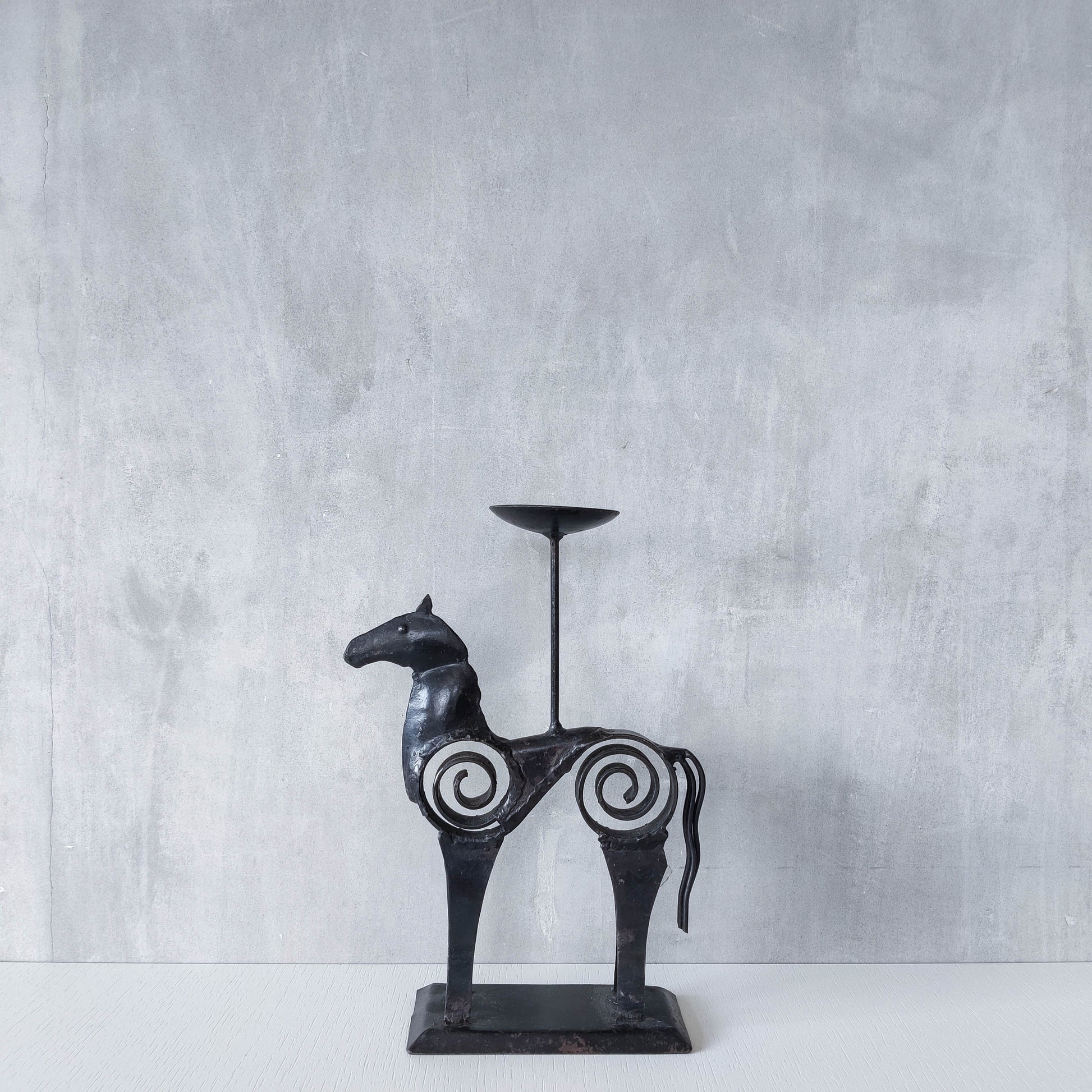 Charming brutalist style large sculptural candle holder depicting a stylised horse with spiral details on a plinth base. Made from welded, folded and forged steel with a dark brown patina. Pricket top. Some wonderful handmade irregularities and some crude welding, naive and raw. Sorry candle not included. Age and history unknown, assumed vintage. Please see photos and condition description.