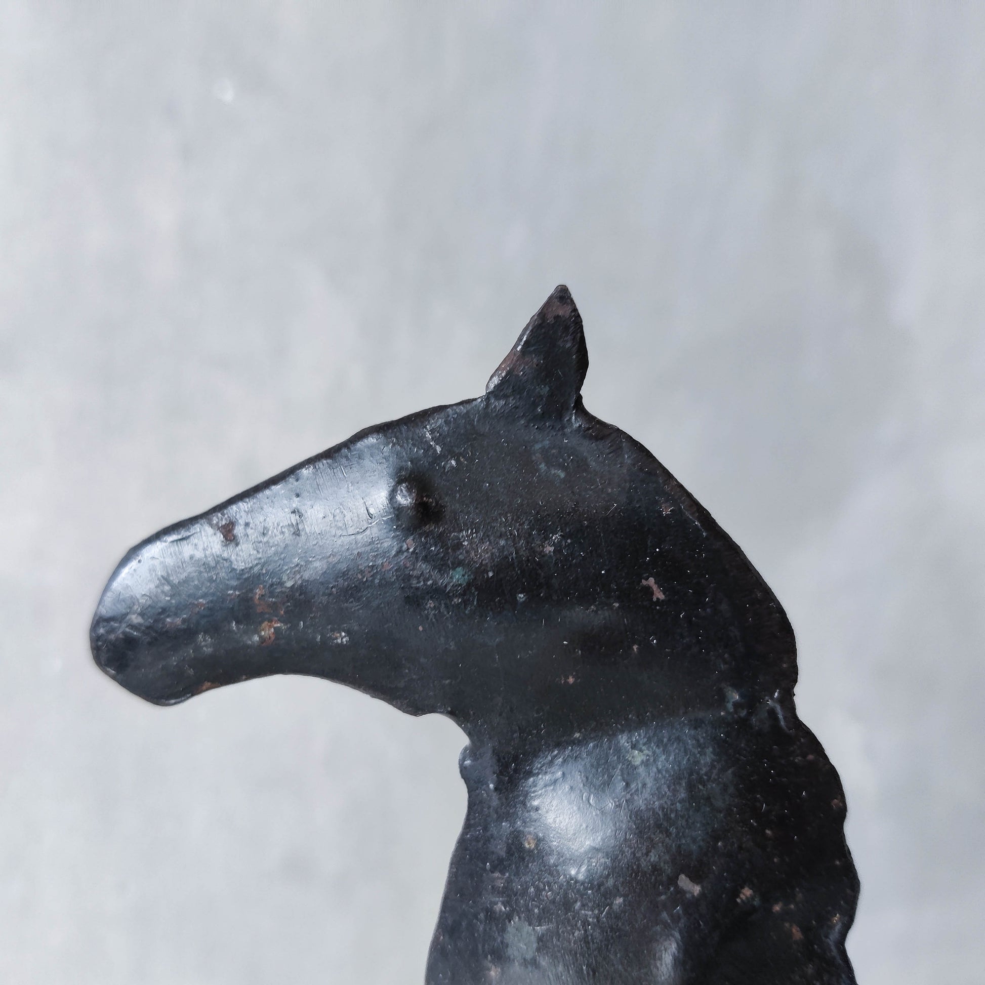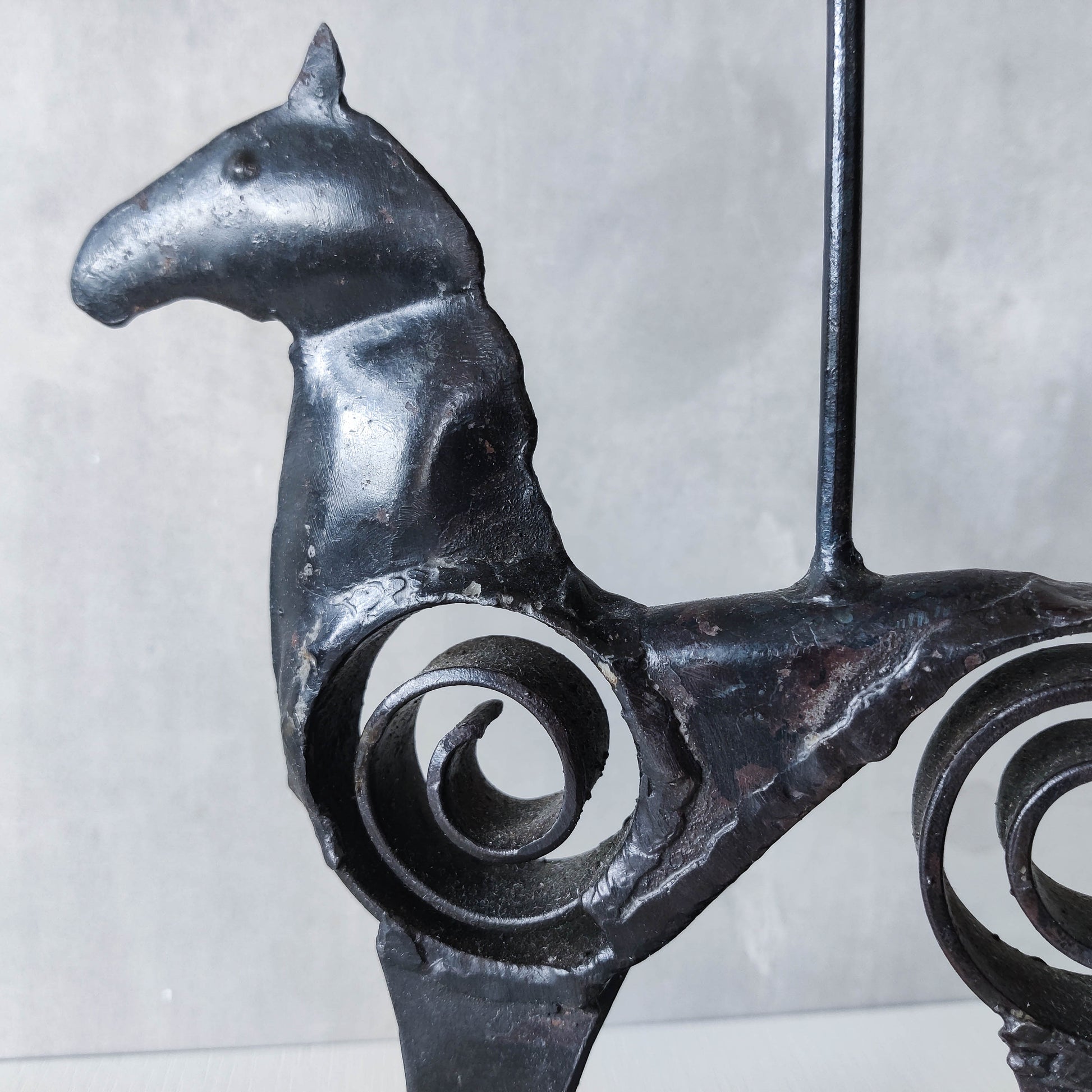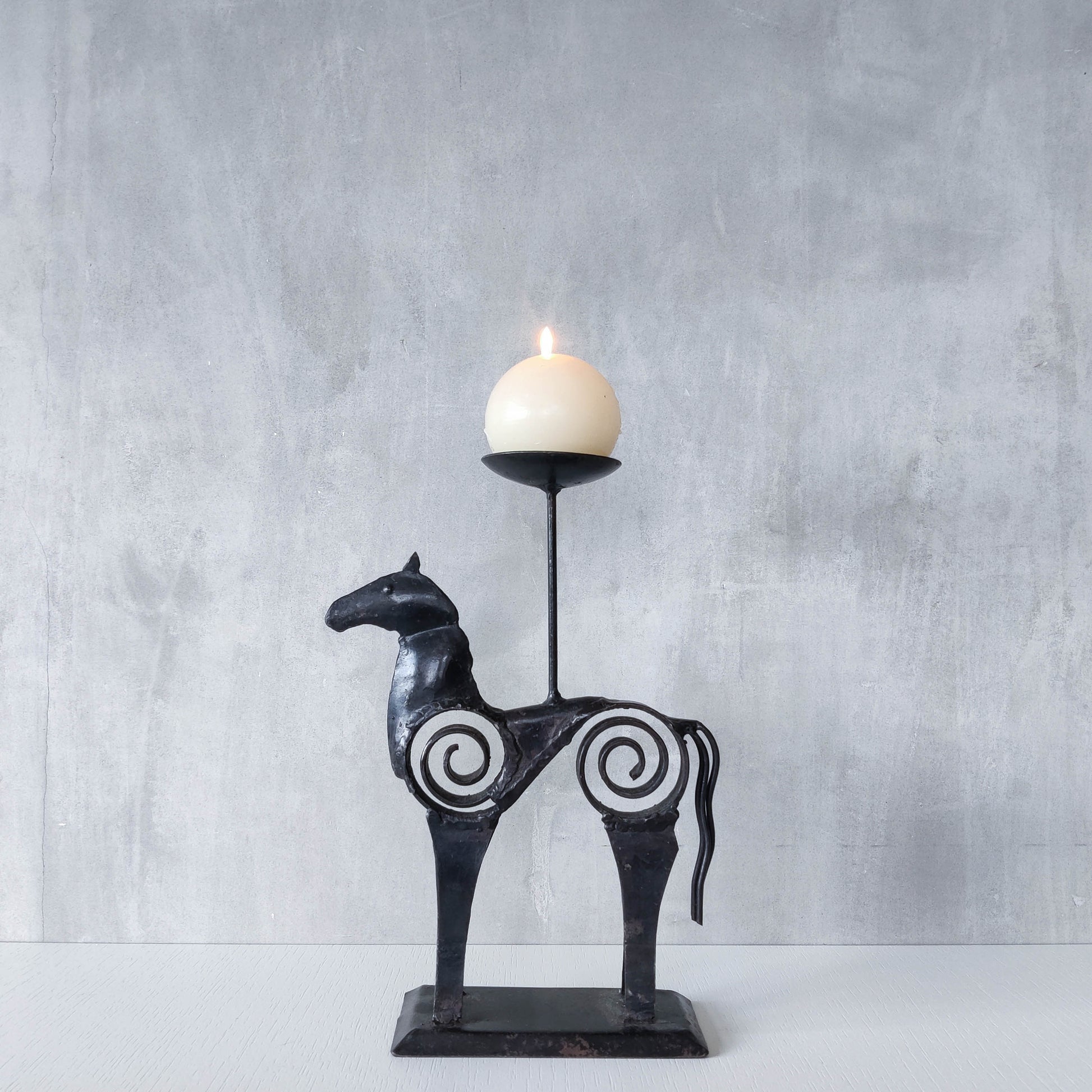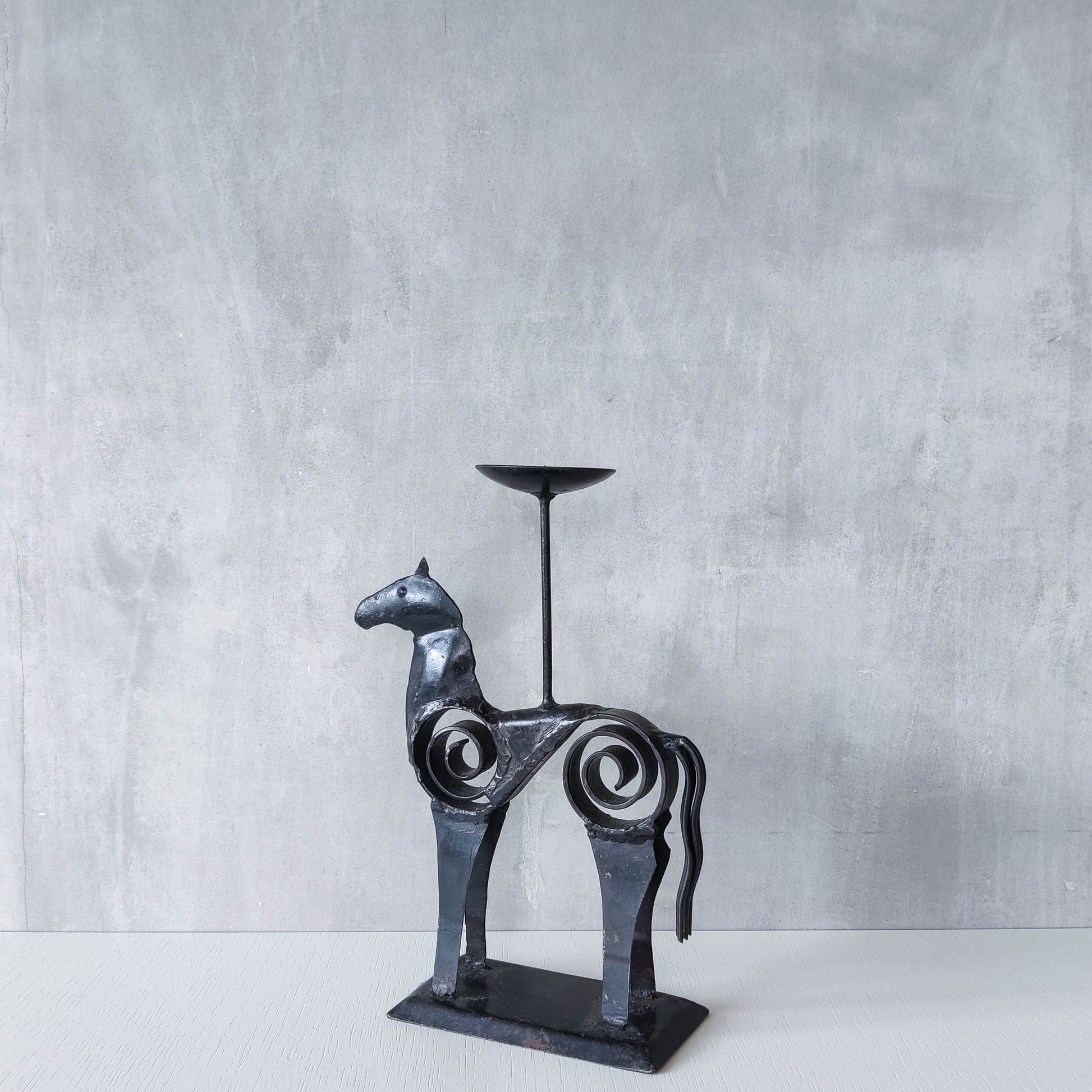 Charming brutalist style large sculptural candle holder depicting a stylised horse with spiral details on a plinth base. Made from welded, folded and forged steel with a dark brown patina. Pricket top. Some wonderful handmade irregularities and some crude welding, naive and raw. Sorry candle not included. Age and history unknown, assumed vintage. Please see photos and condition description.
