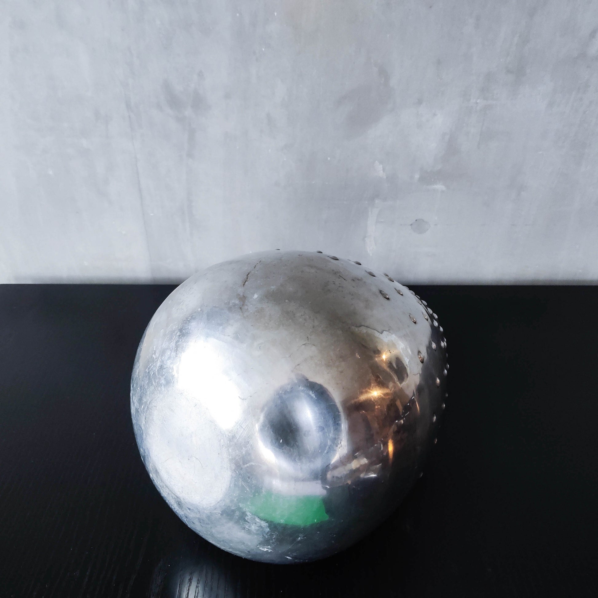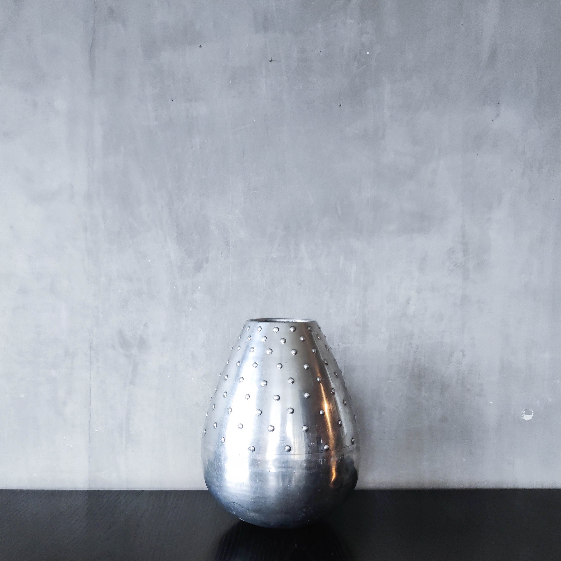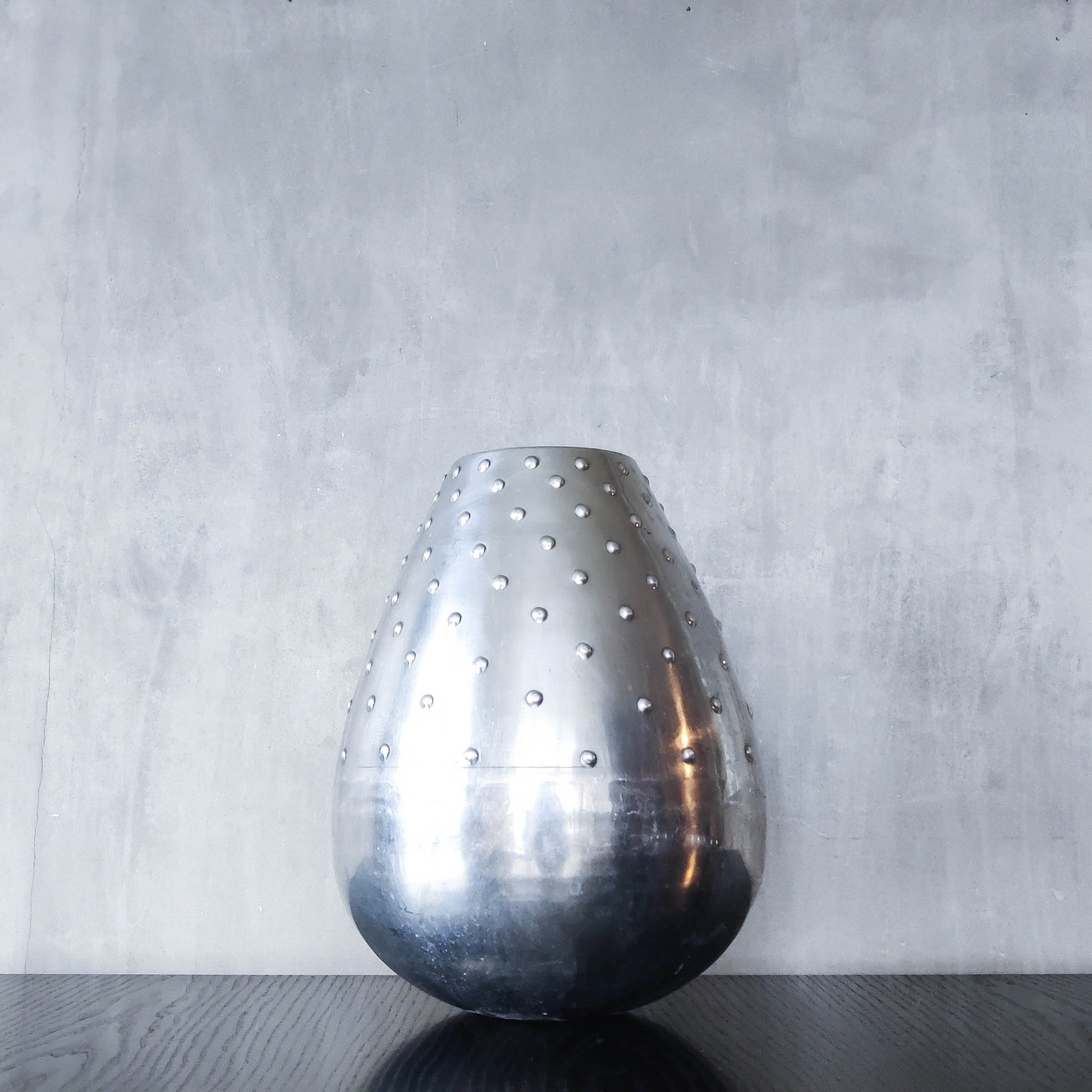 Large studded silver metal (I'm not sure if this is steel or aluminium) sculptural vase in the style of Leon Fontier (1990s). Egg shaped with folded lip. Please see photos and condition description.