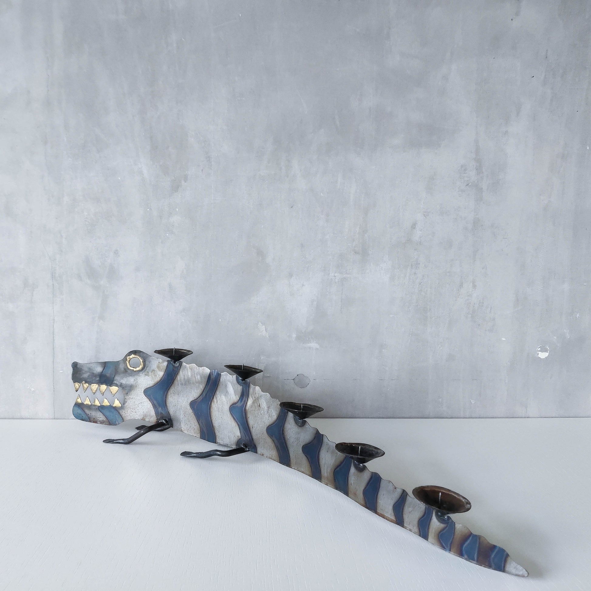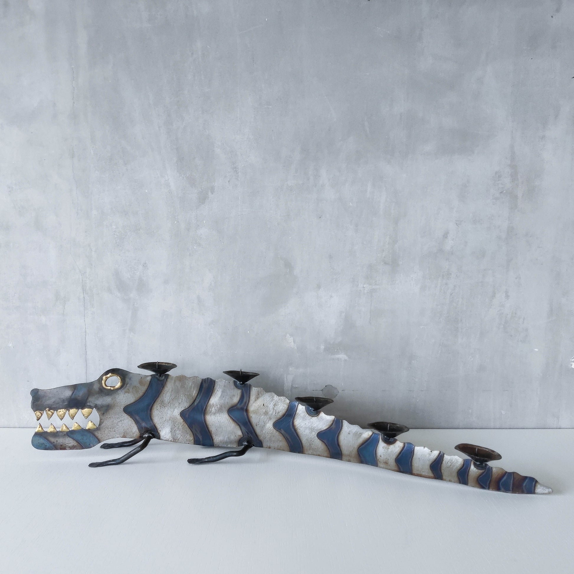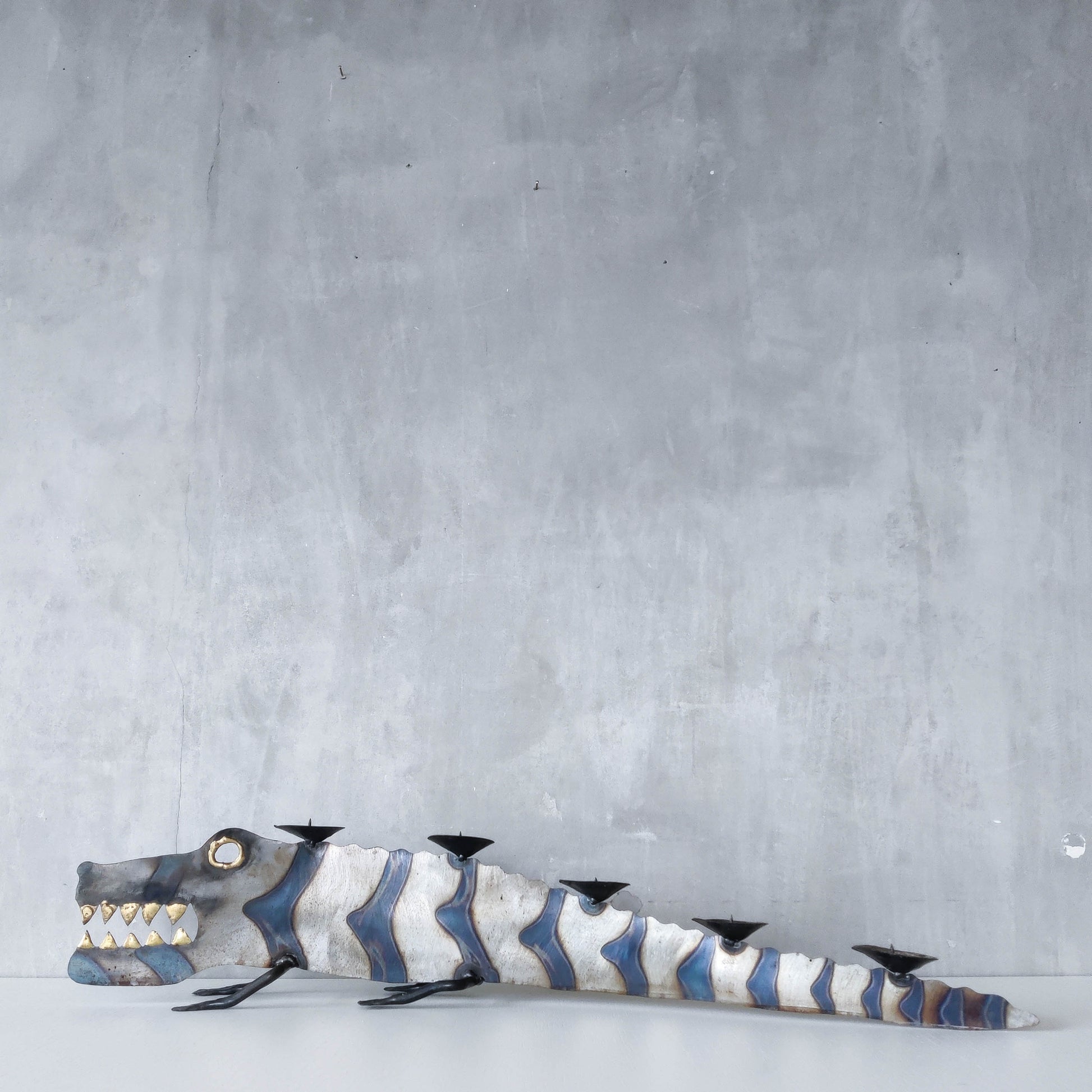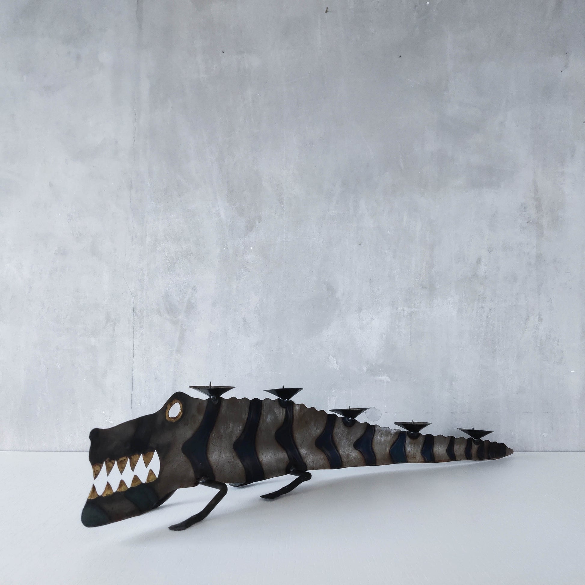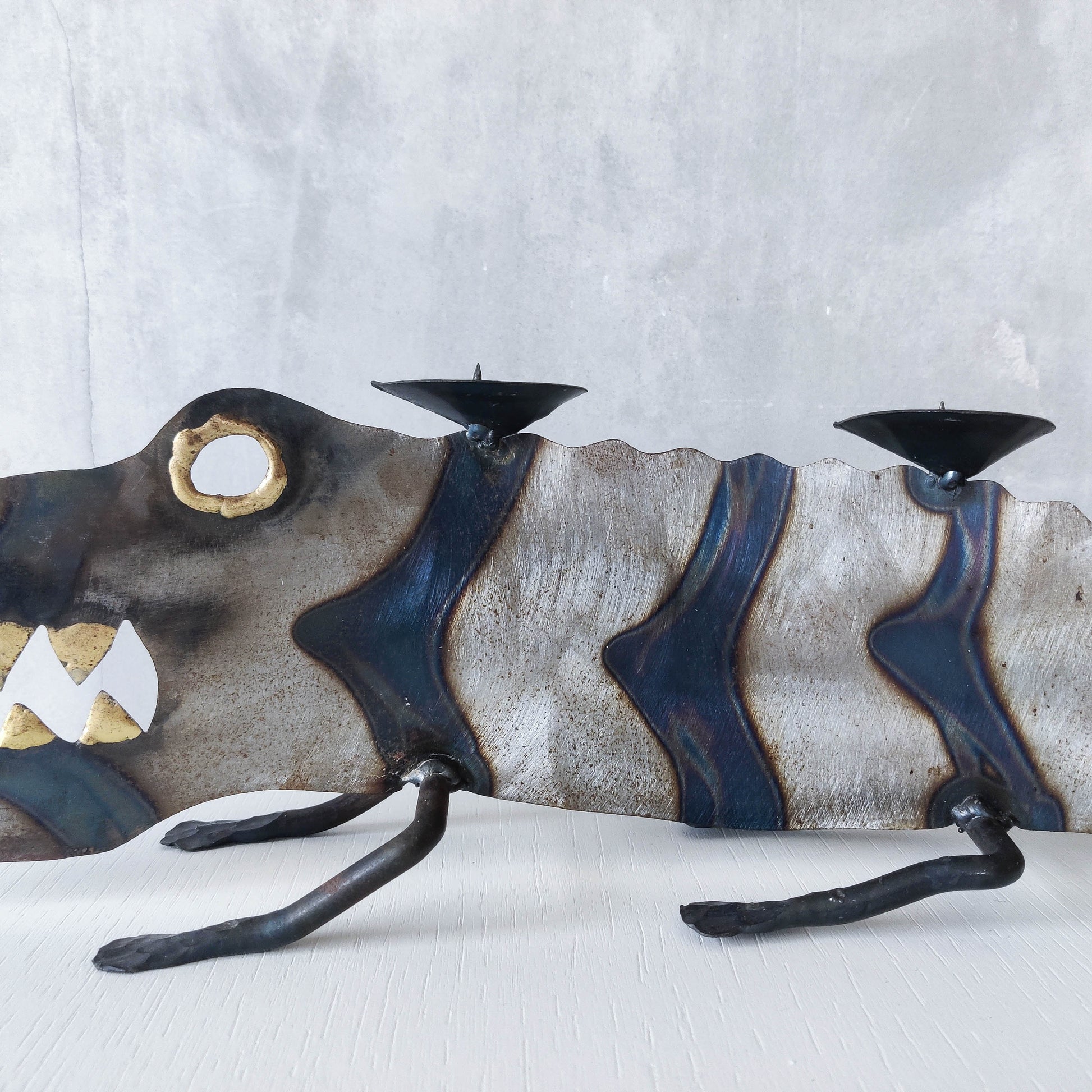 Charming sculptural large steel sculptural crocodile candelabra. Torch cut steel with scorched decorative stripe marks, welded pricket top candle holders, hammered wrought iron feet, gold coloured solder detailing (teeth, eye, edge of candle holders). Unsigned. Sorry candles not included. Please see photos and condition description.