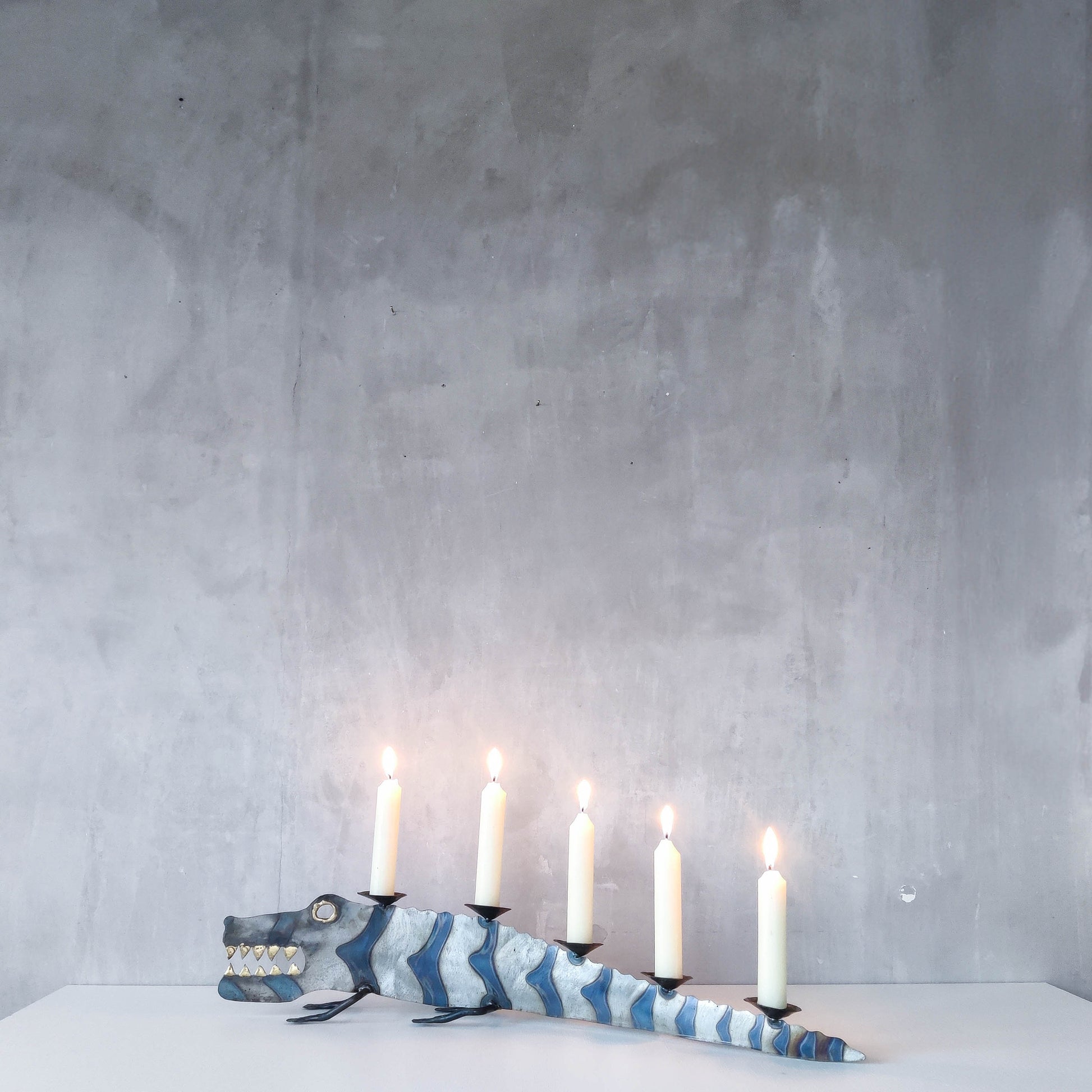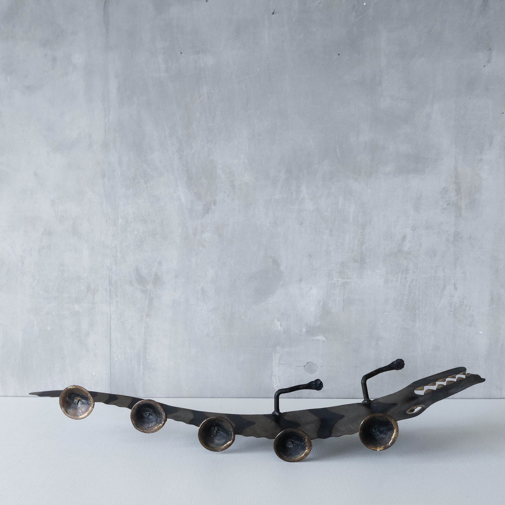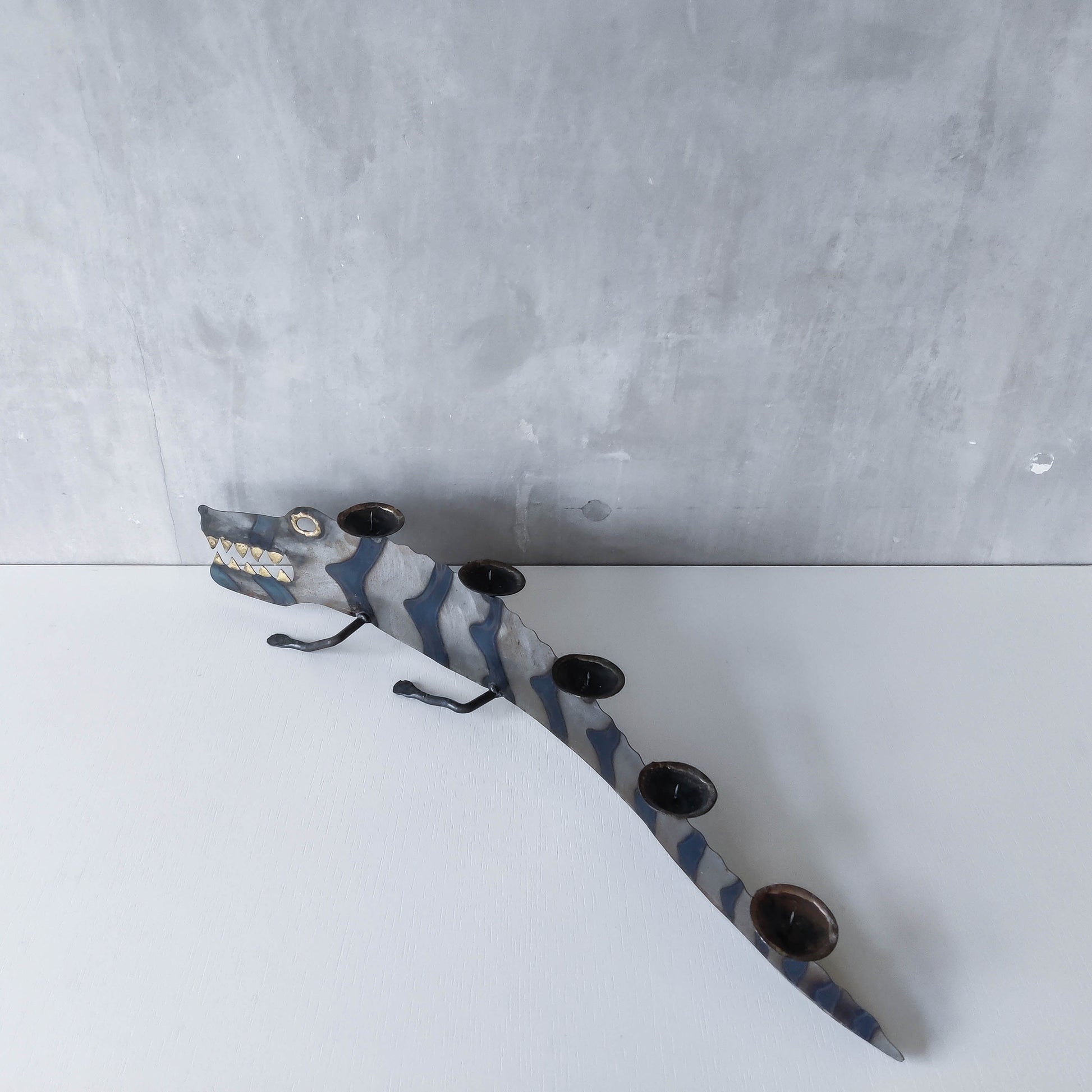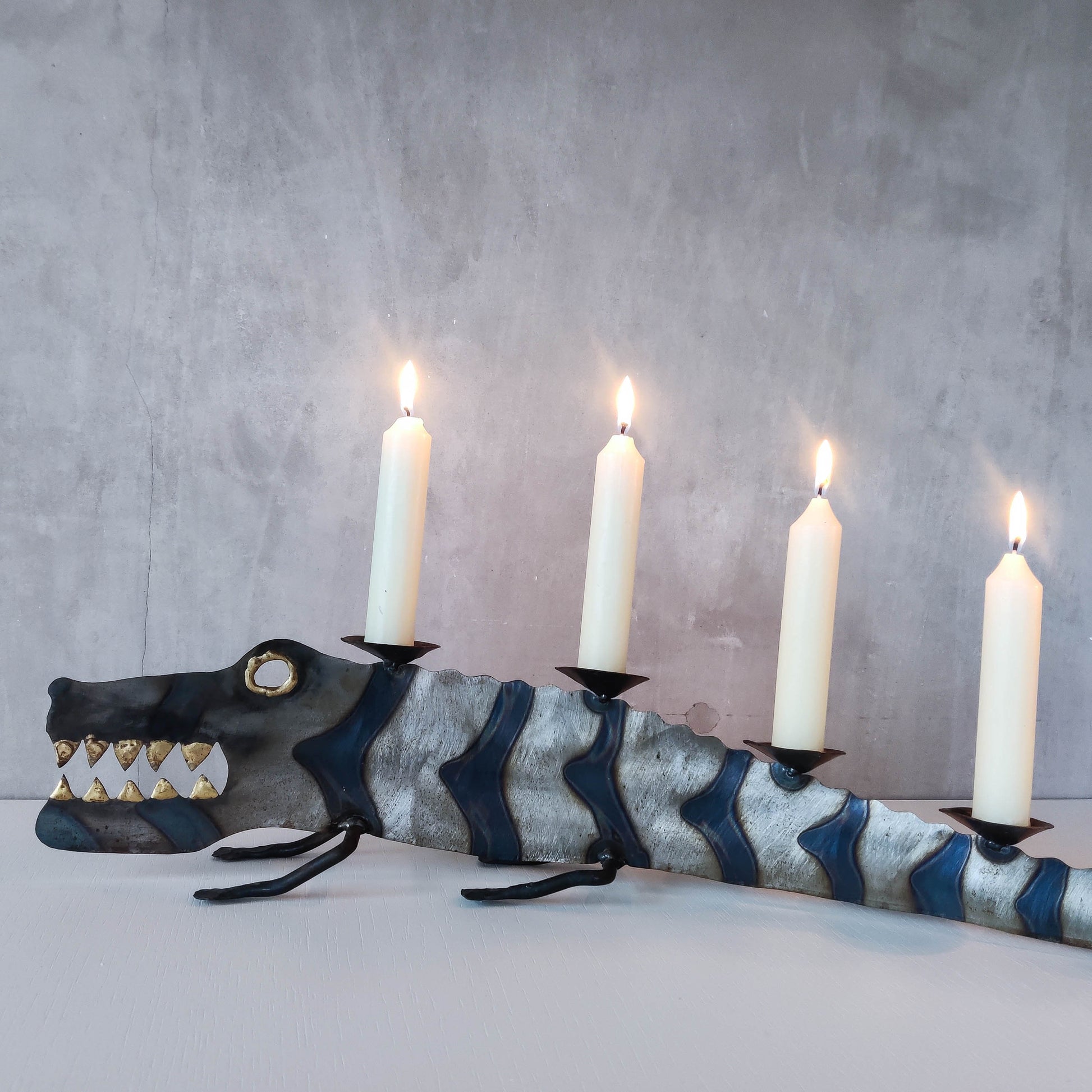 Charming sculptural large steel sculptural crocodile candelabra. Torch cut steel with scorched decorative stripe marks, welded pricket top candle holders, hammered wrought iron feet, gold coloured solder detailing (teeth, eye, edge of candle holders). Unsigned. Sorry candles not included. Please see photos and condition description.