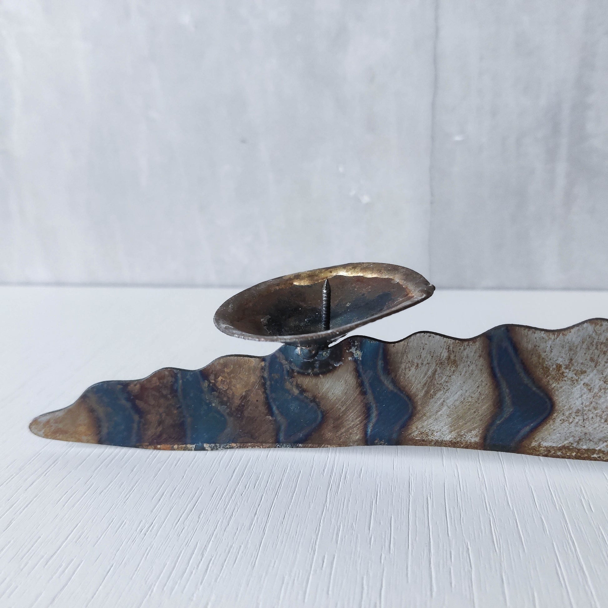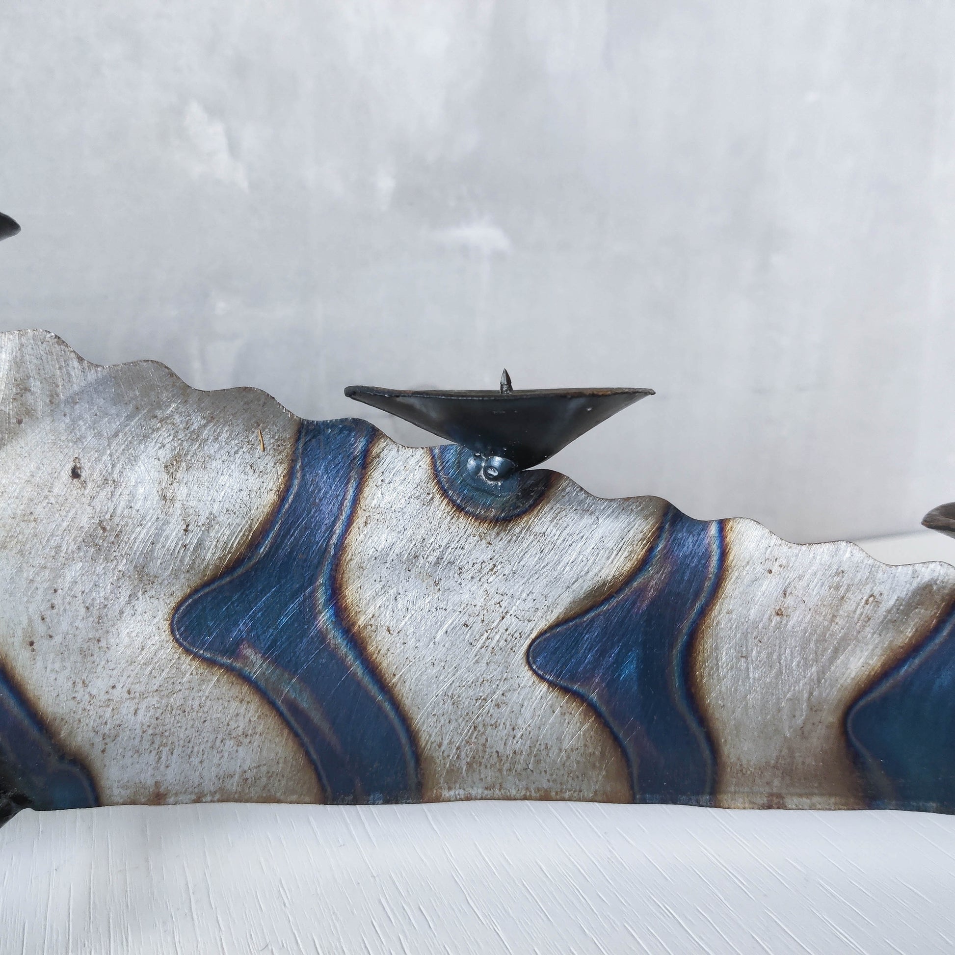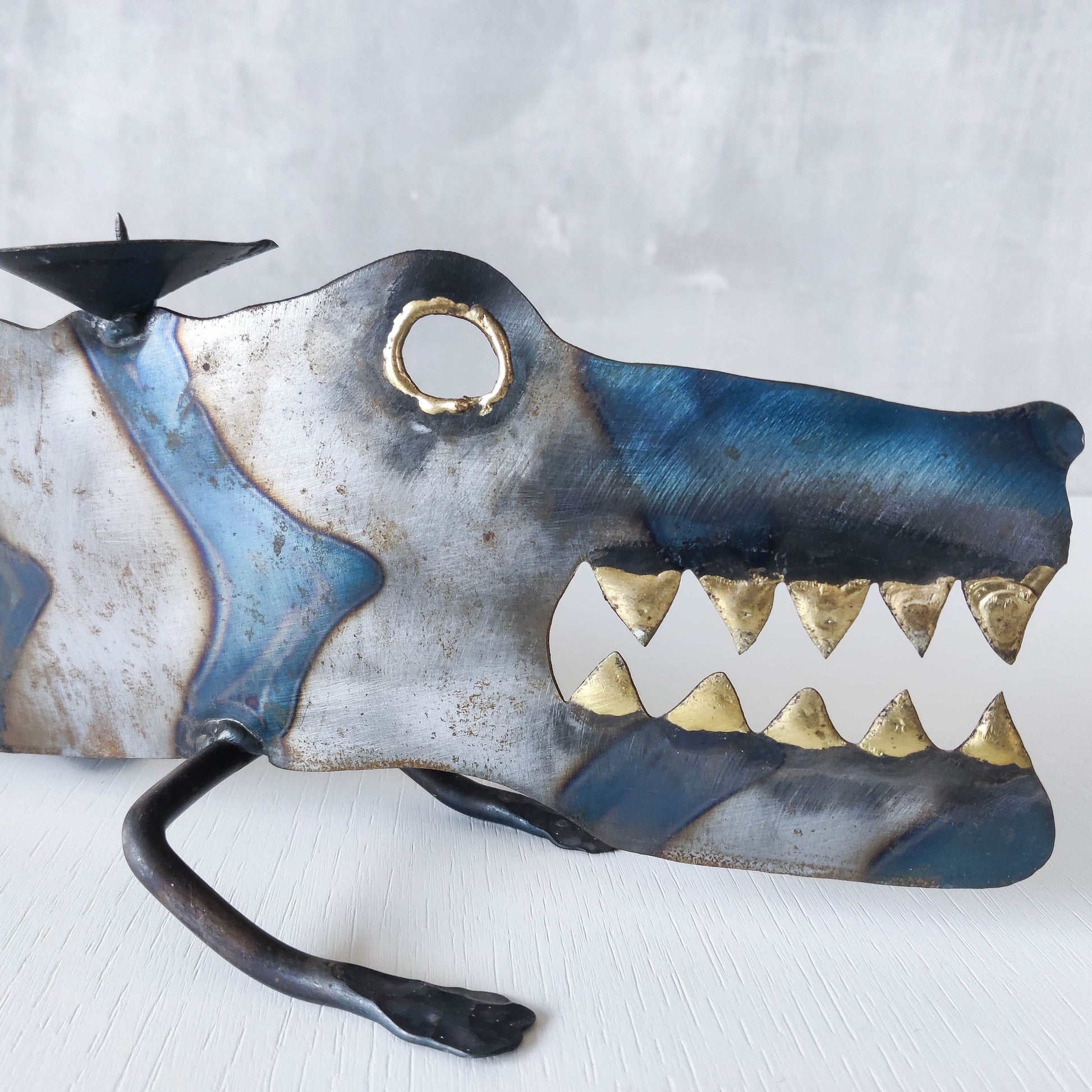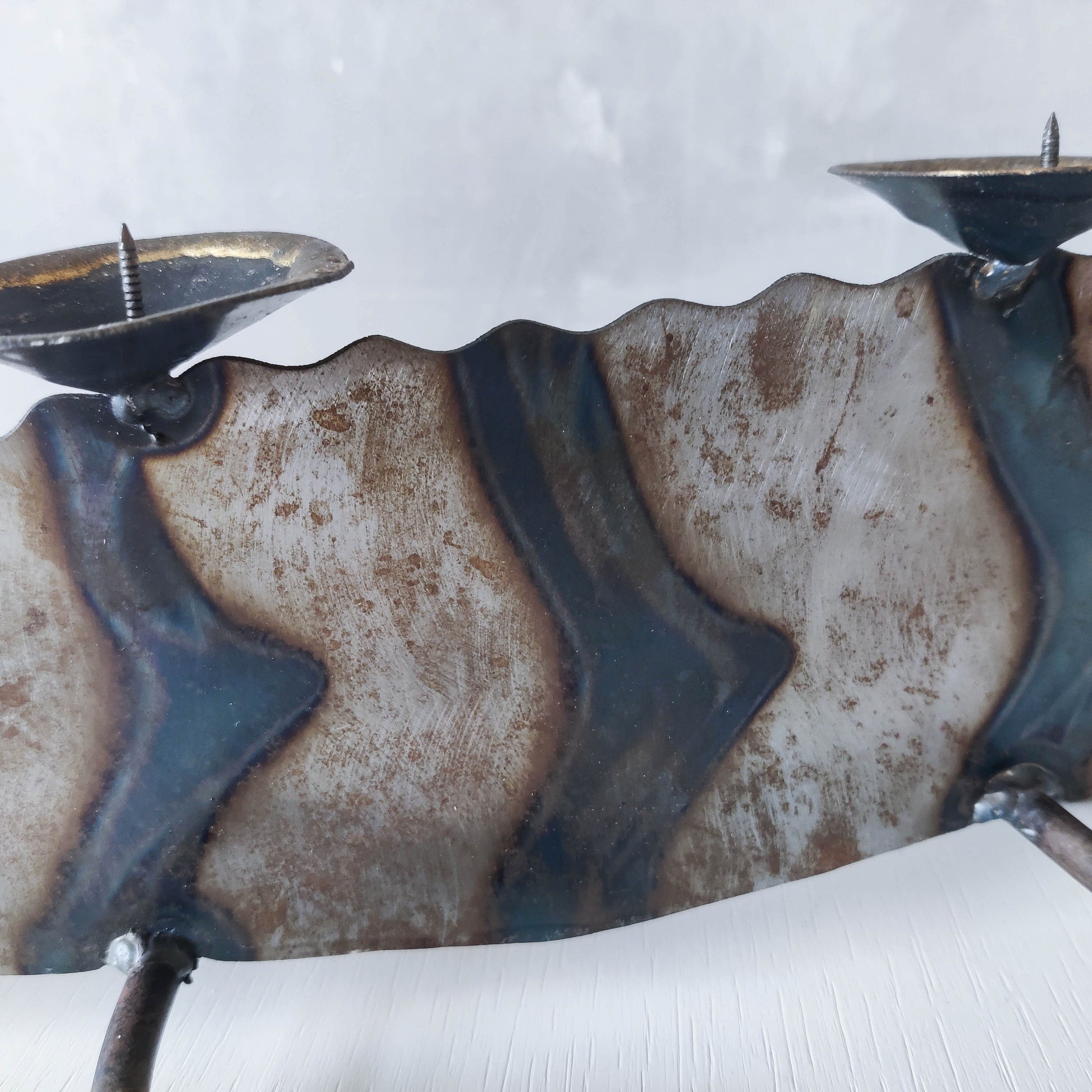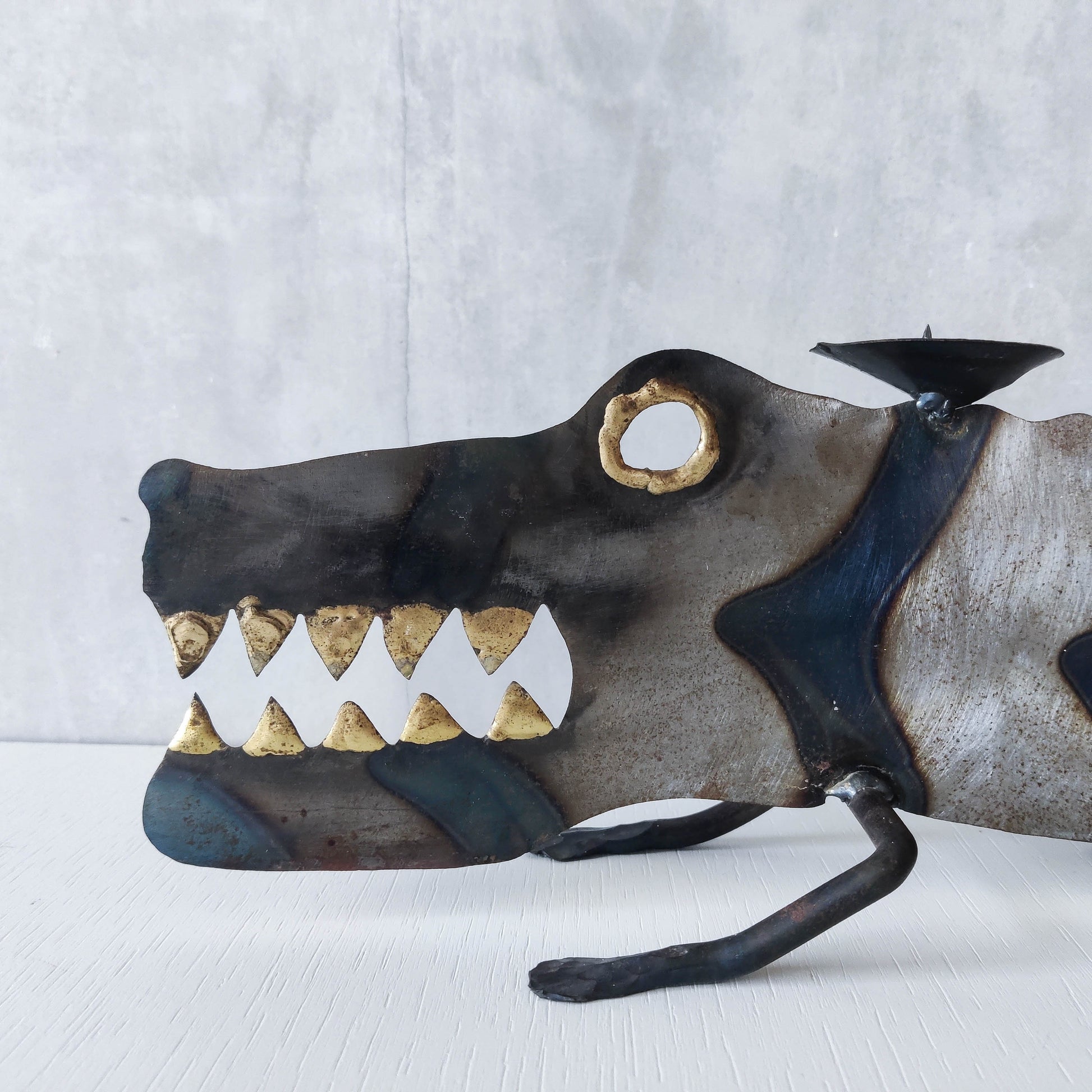 Charming sculptural large steel sculptural crocodile candelabra. Torch cut steel with scorched decorative stripe marks, welded pricket top candle holders, hammered wrought iron feet, gold coloured solder detailing (teeth, eye, edge of candle holders). Unsigned. Sorry candles not included. Please see photos and condition description.