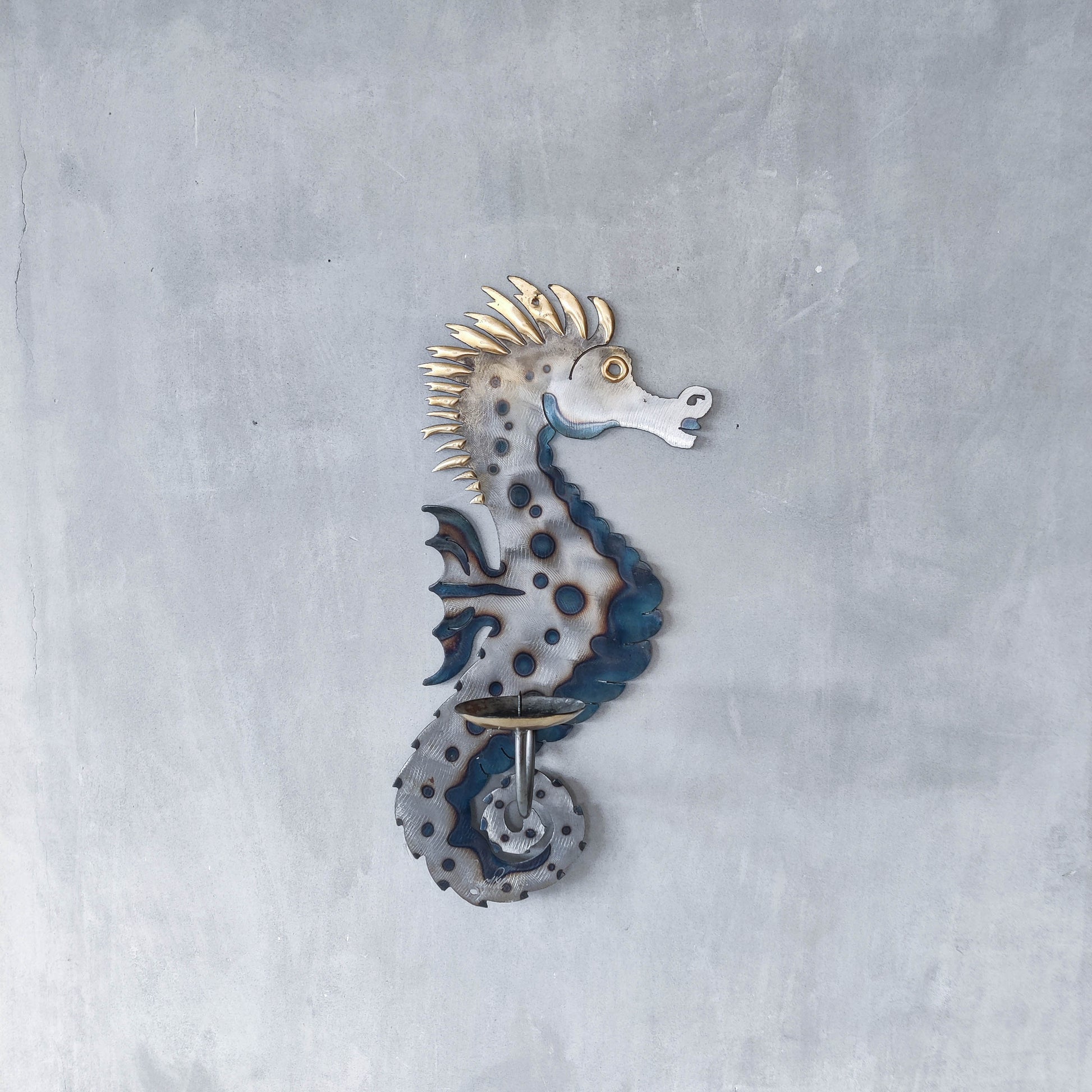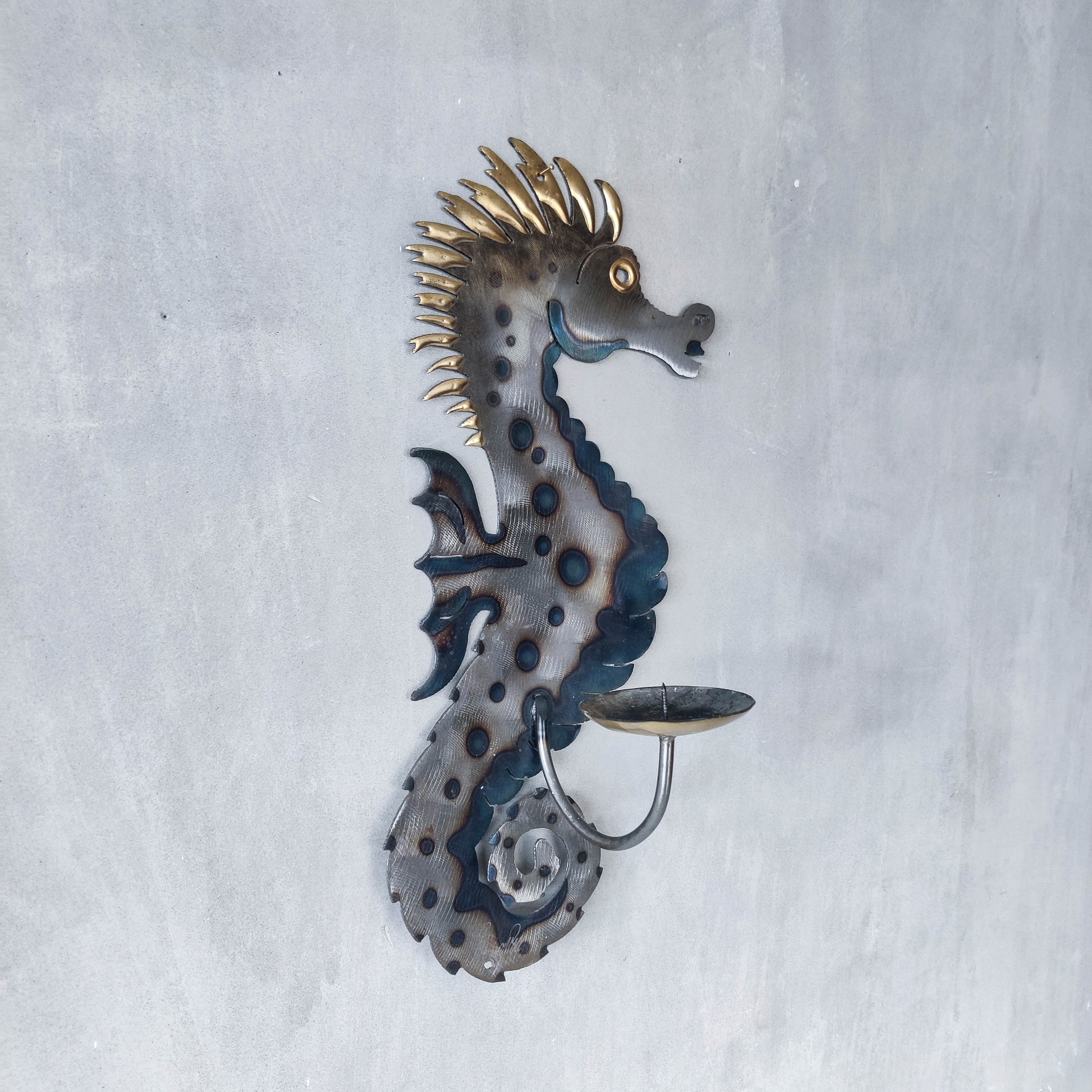 Metalwork torched steel large seahorse sculptural wall sconce candle holder