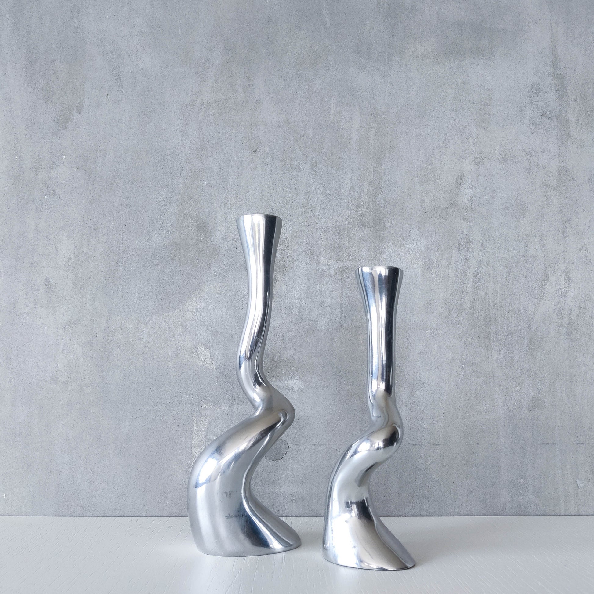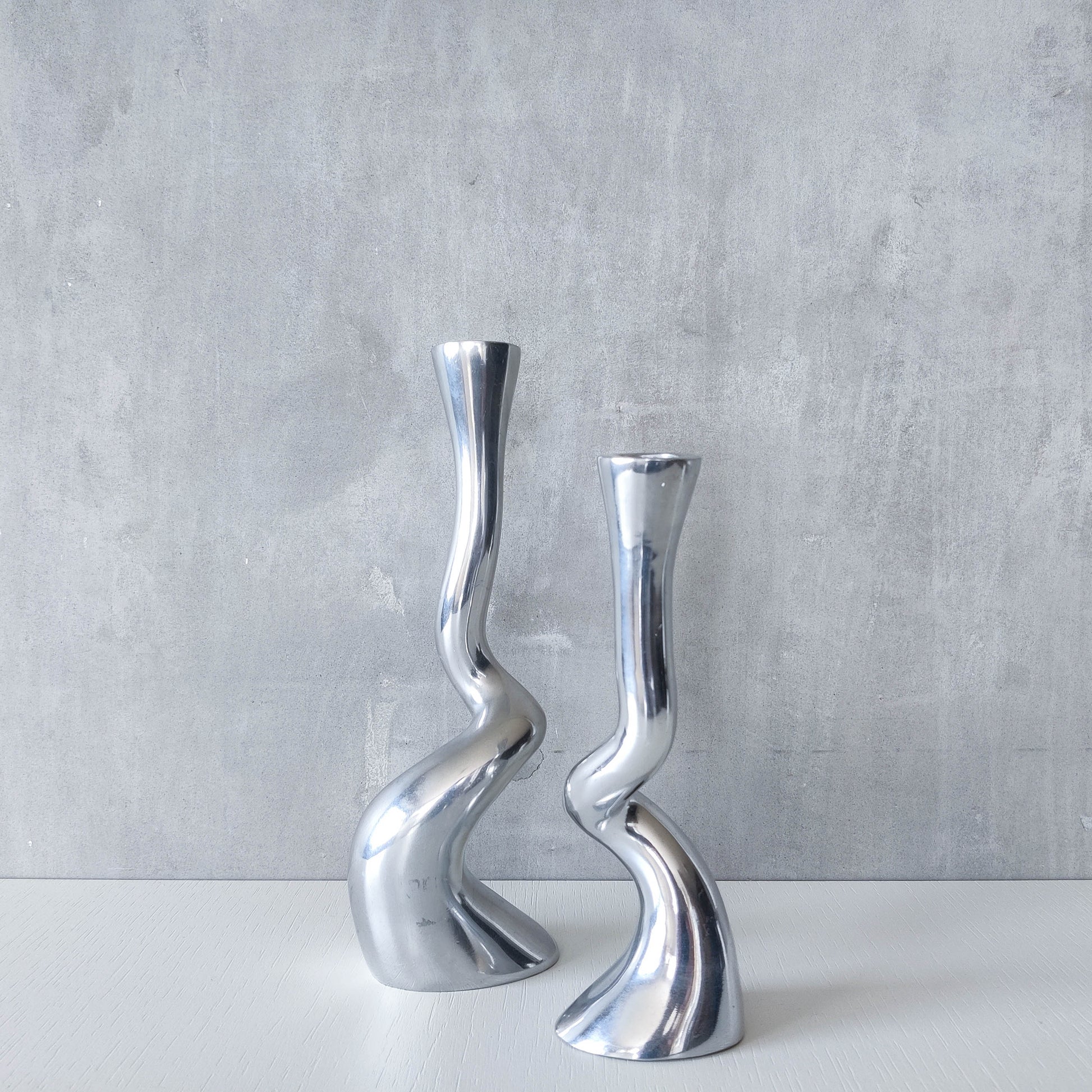 Pair of cast organic twisted sculptural form aluminium candle holders. Suitable for dinner candles (sorry candles not included). Lovely form and scale. I believe these could be designed by Spanish designers/artists Art3 and circa 1980s but they are not stamped or directly attributed, perhaps in the style of? Age and history unknown. Please see photos and condition description.