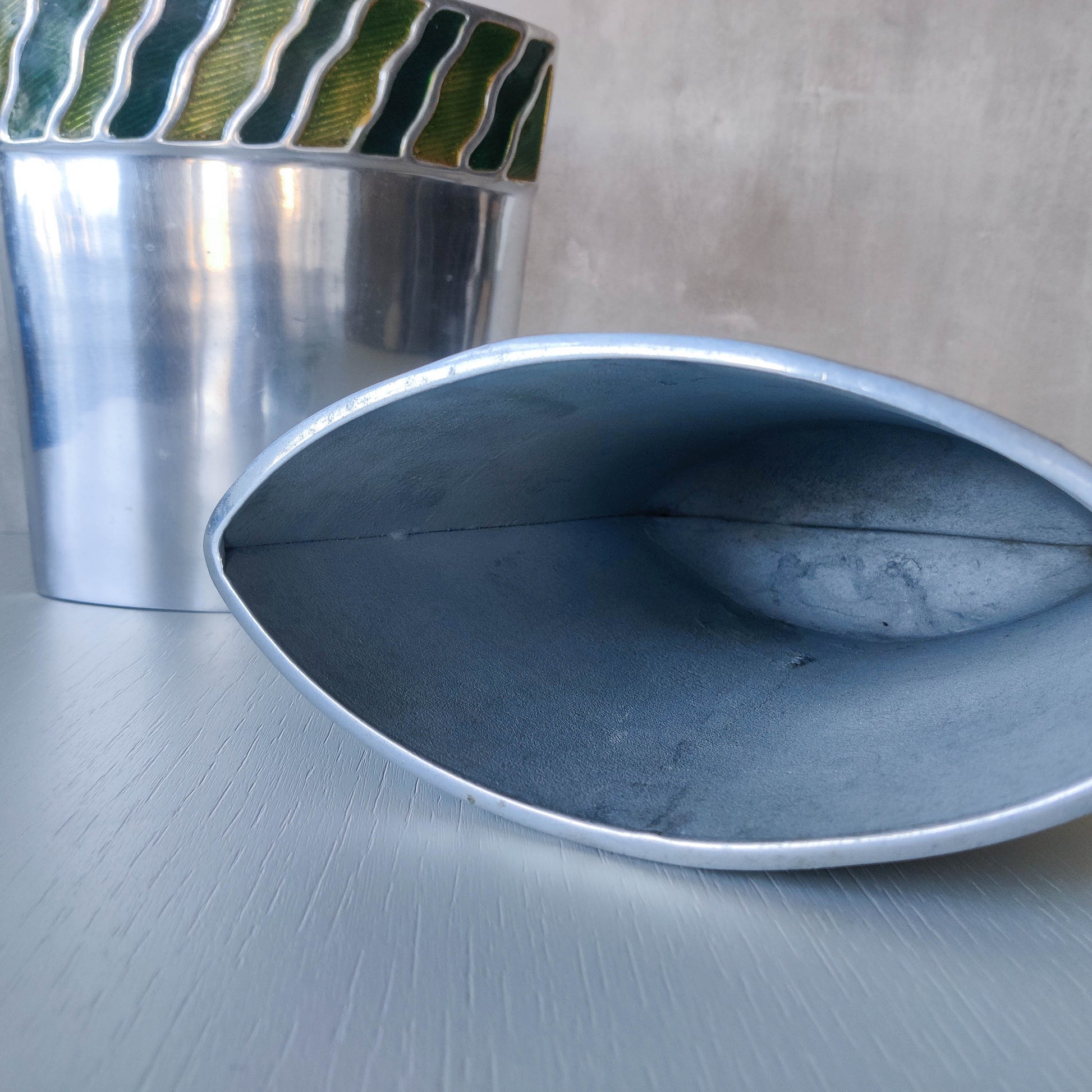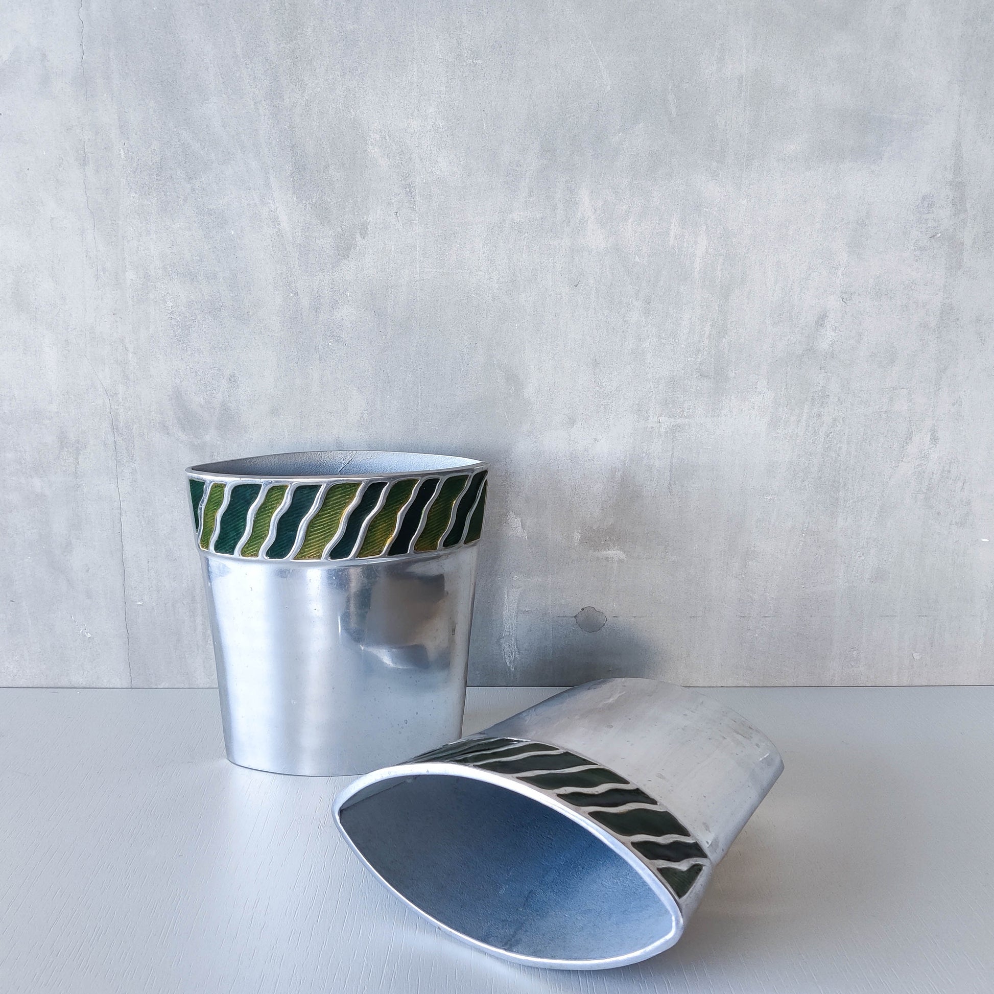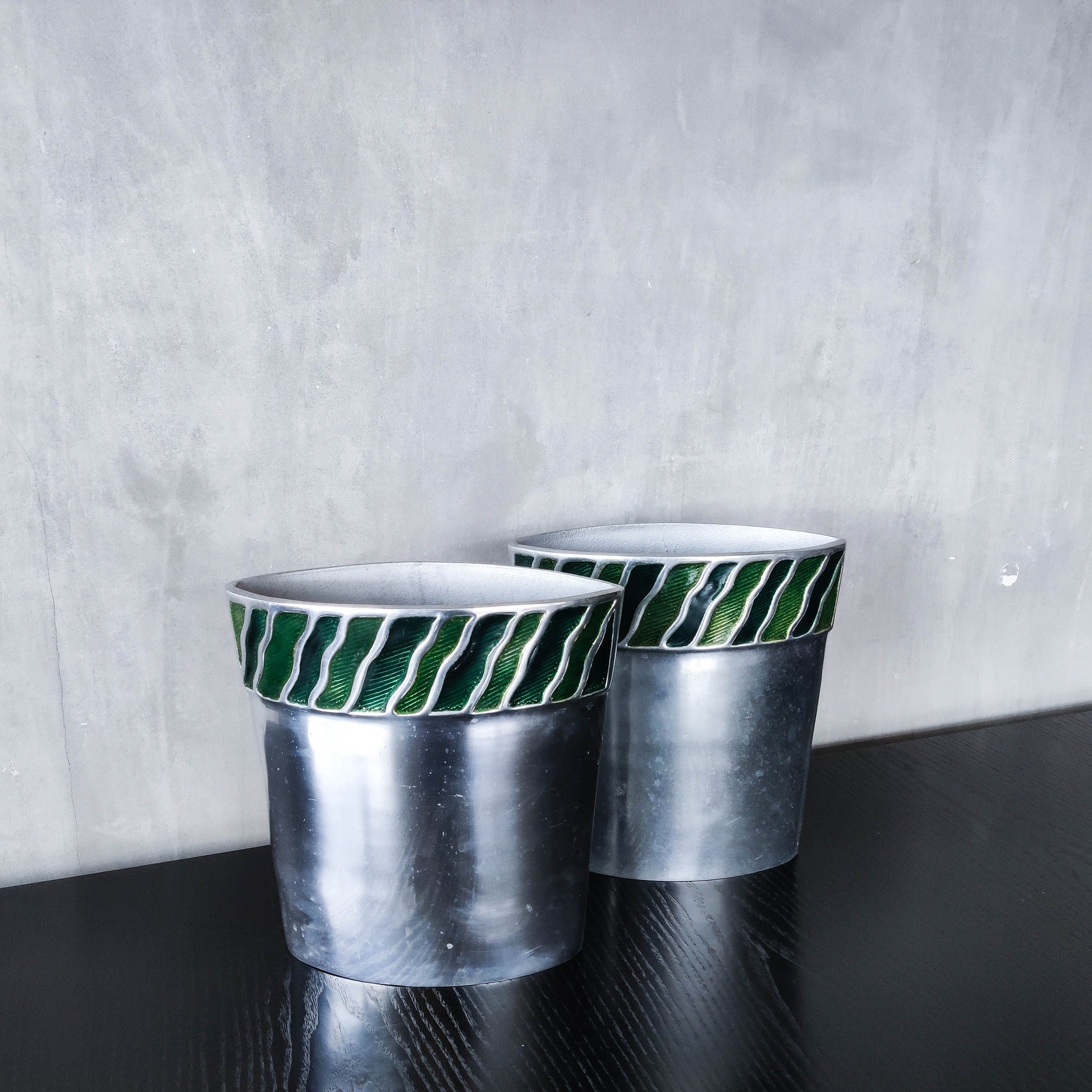 Pair of vintage 00s cast aluminium sculptural vases with green enamel wave inlay