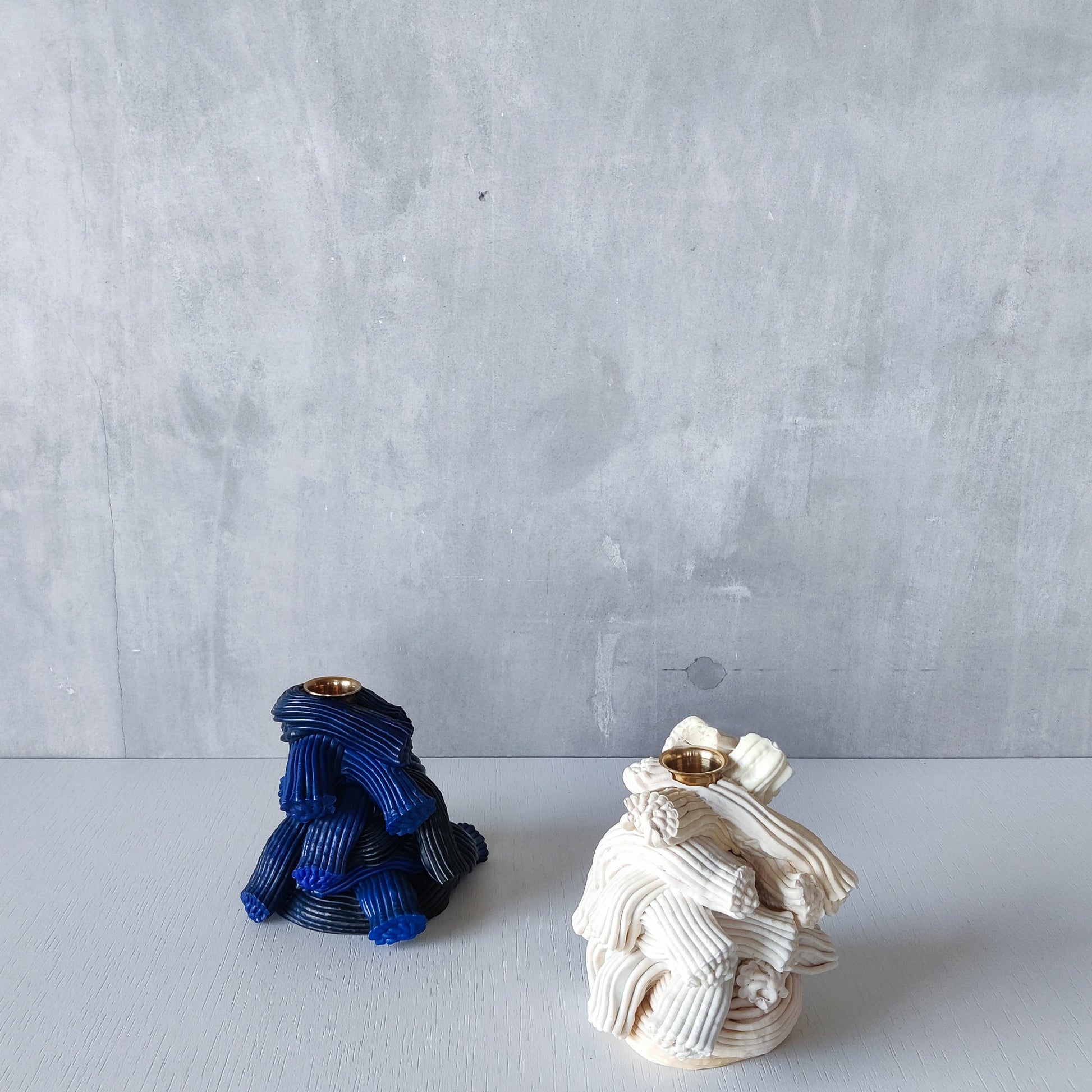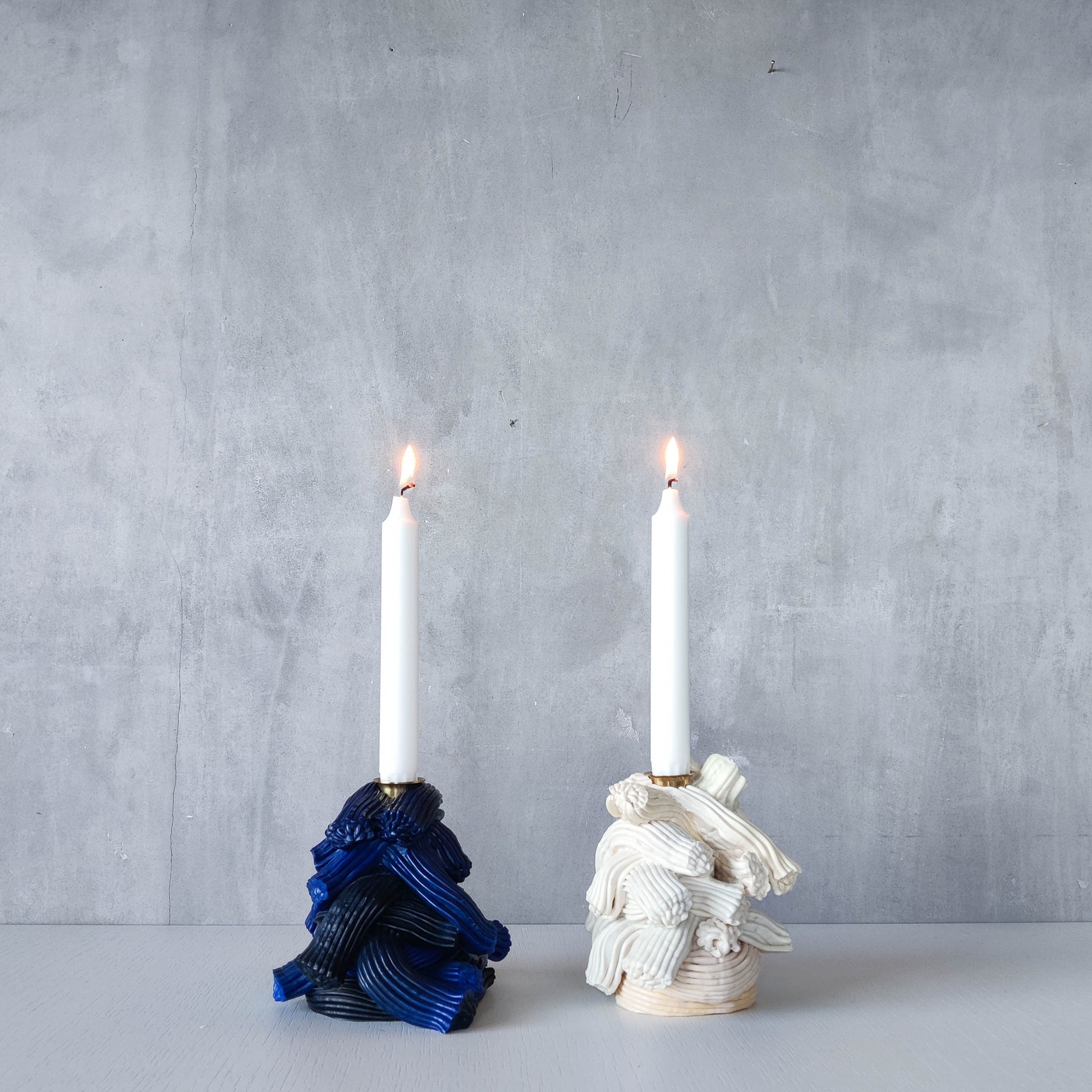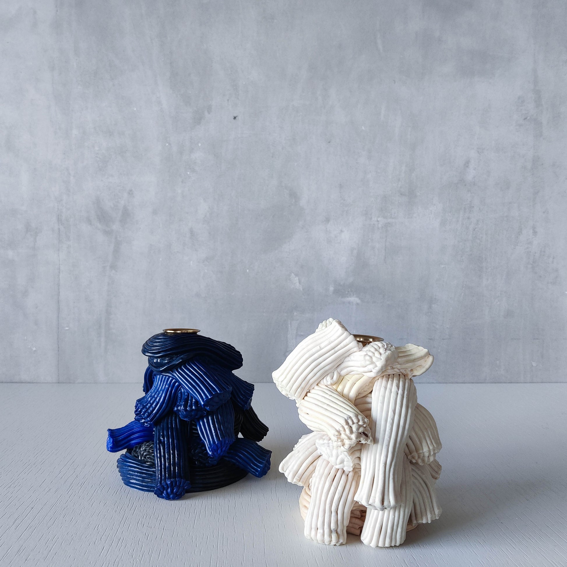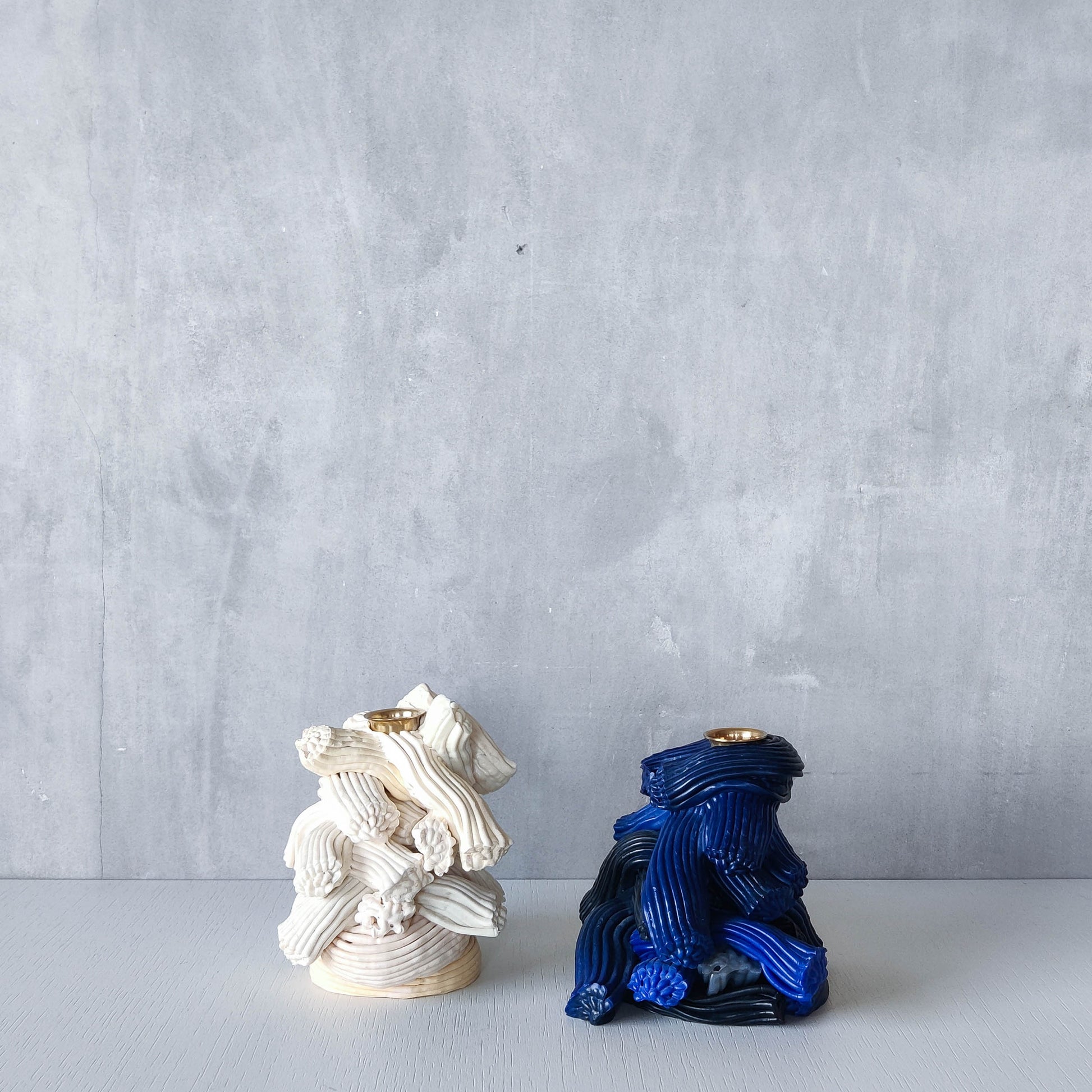 A pair of sculptural 'Plastic Baroque' candle holders by artist designer James Shaw. Made from waste recycled plastic, pigmented and extruded using a handheld plastic gun invented by the artist. Each entirely unique in design and form, these two examples are in subtle shades of varied off white and in ultramarine blues. Brass cup insert to fit a standard dinner candle (not included). The blue candle is name stamped to base.