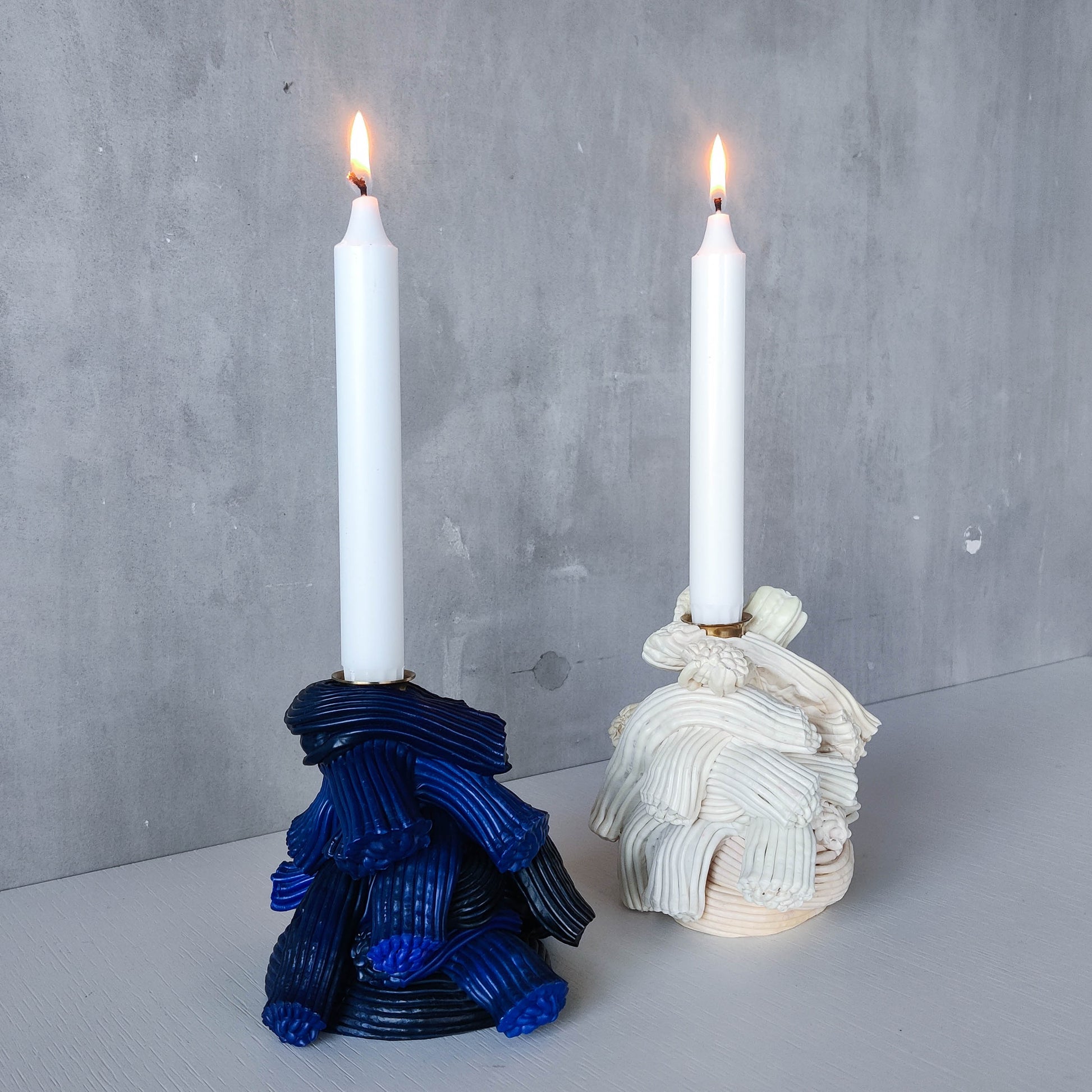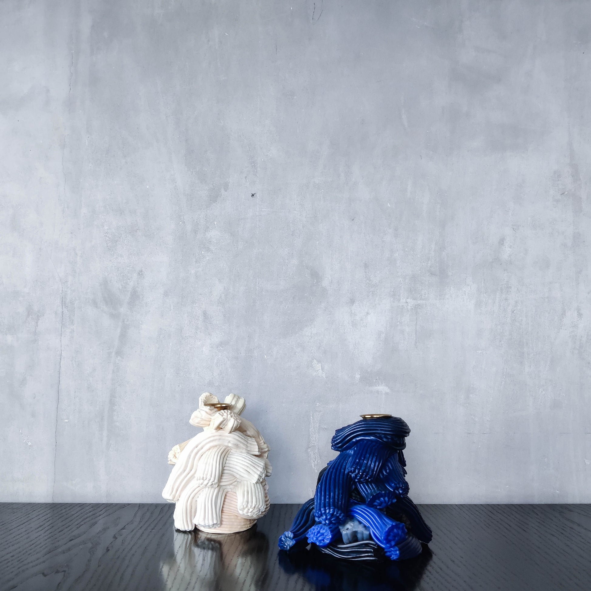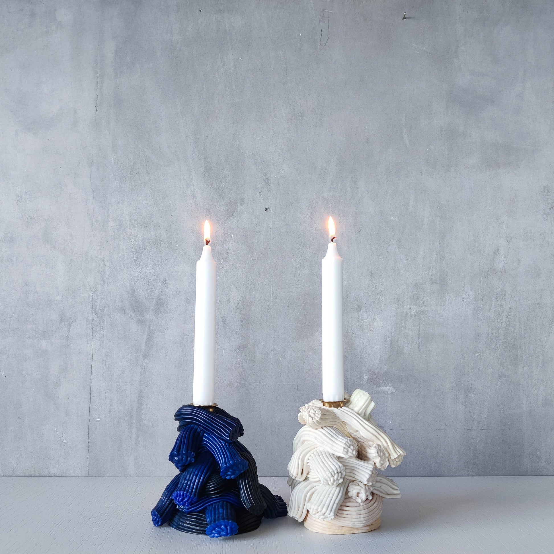 A pair of sculptural 'Plastic Baroque' candle holders by artist designer James Shaw. Made from waste recycled plastic, pigmented and extruded using a handheld plastic gun invented by the artist. Each entirely unique in design and form, these two examples are in subtle shades of varied off white and in ultramarine blues. Brass cup insert to fit a standard dinner candle (not included). The blue candle is name stamped to base.