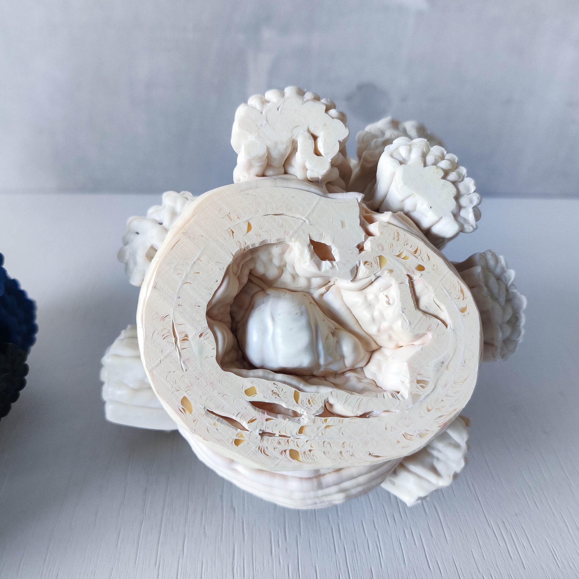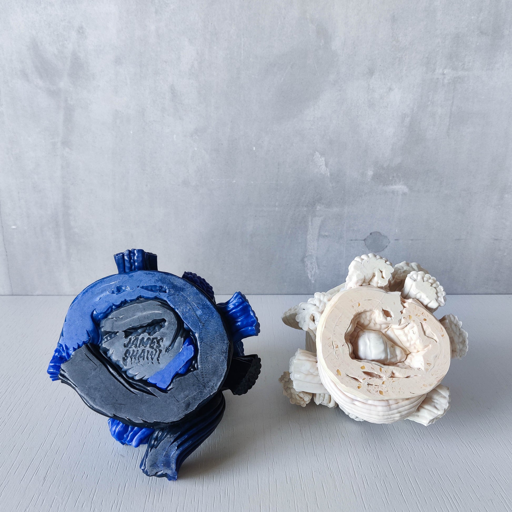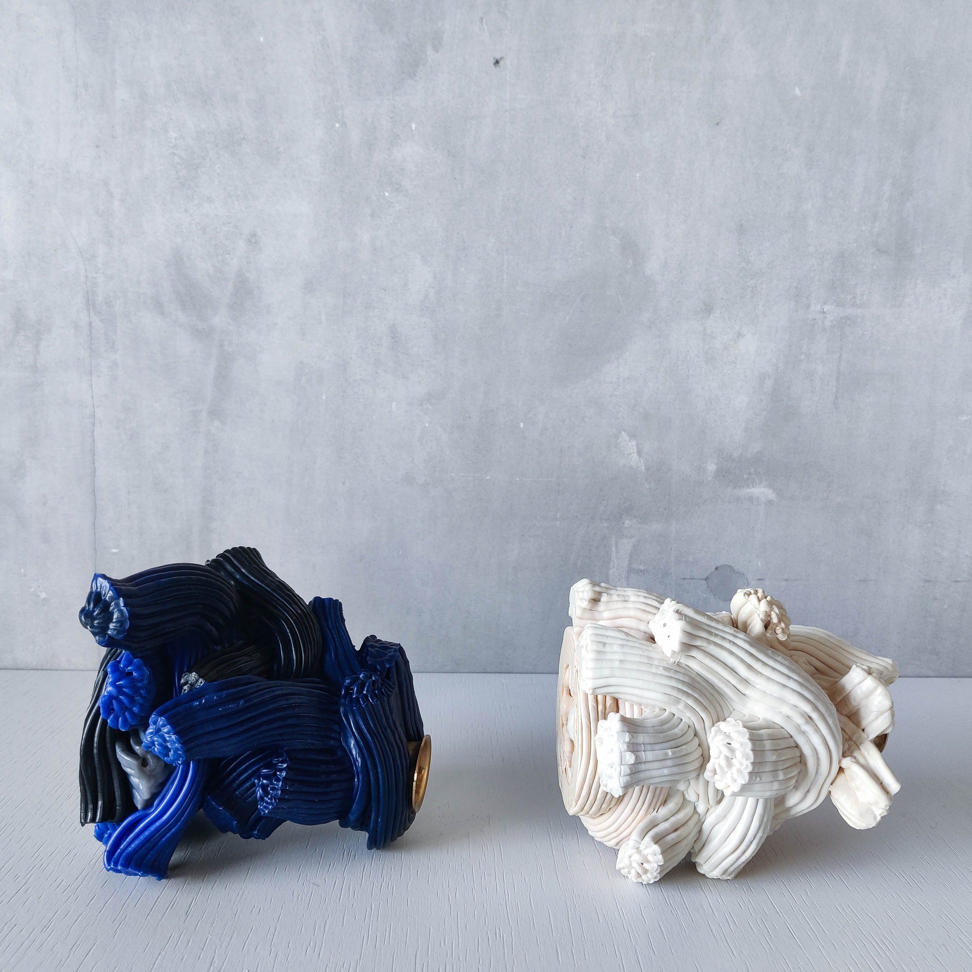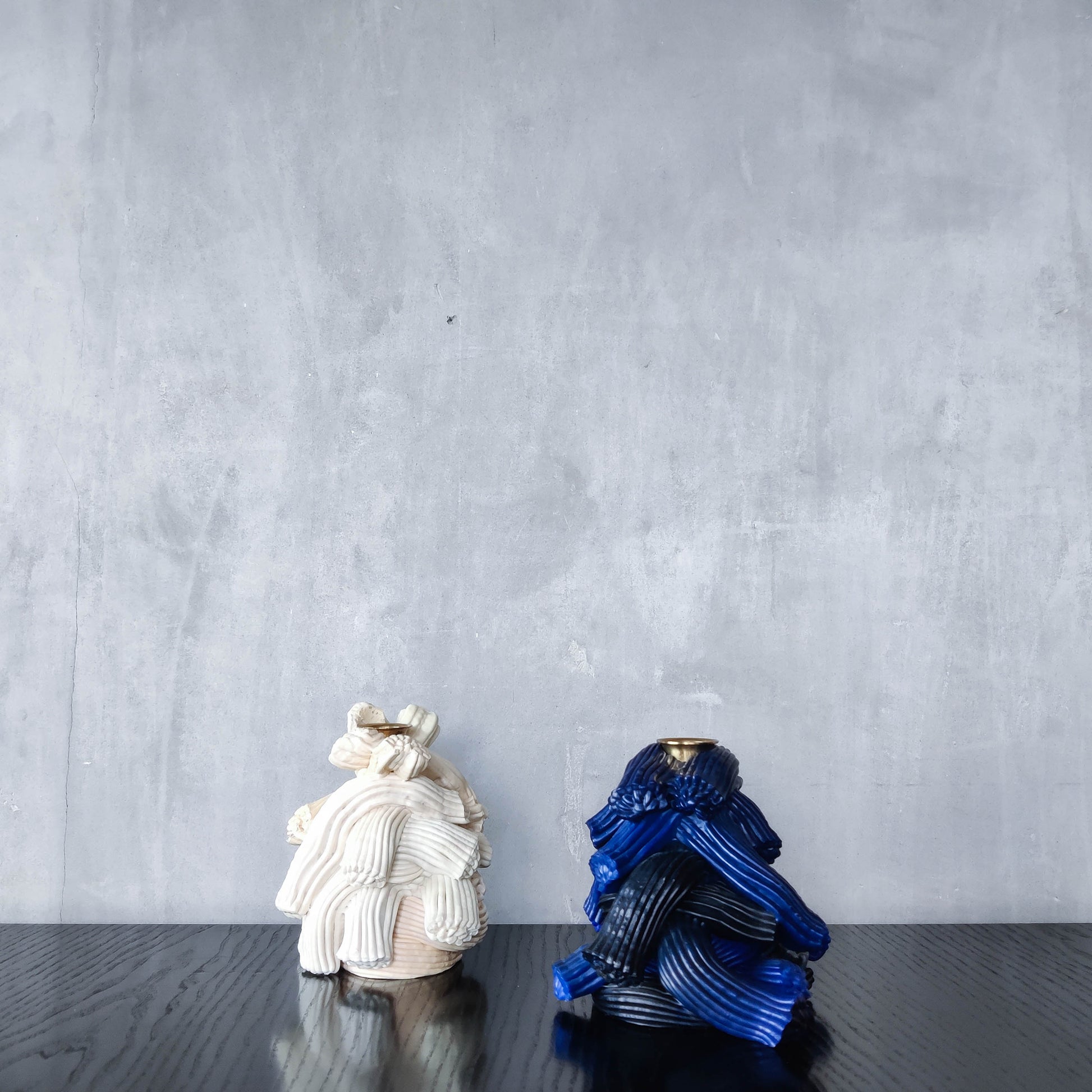 A pair of sculptural 'Plastic Baroque' candle holders by artist designer James Shaw. Made from waste recycled plastic, pigmented and extruded using a handheld plastic gun invented by the artist. Each entirely unique in design and form, these two examples are in subtle shades of varied off white and in ultramarine blues. Brass cup insert to fit a standard dinner candle (not included). The blue candle is name stamped to base.