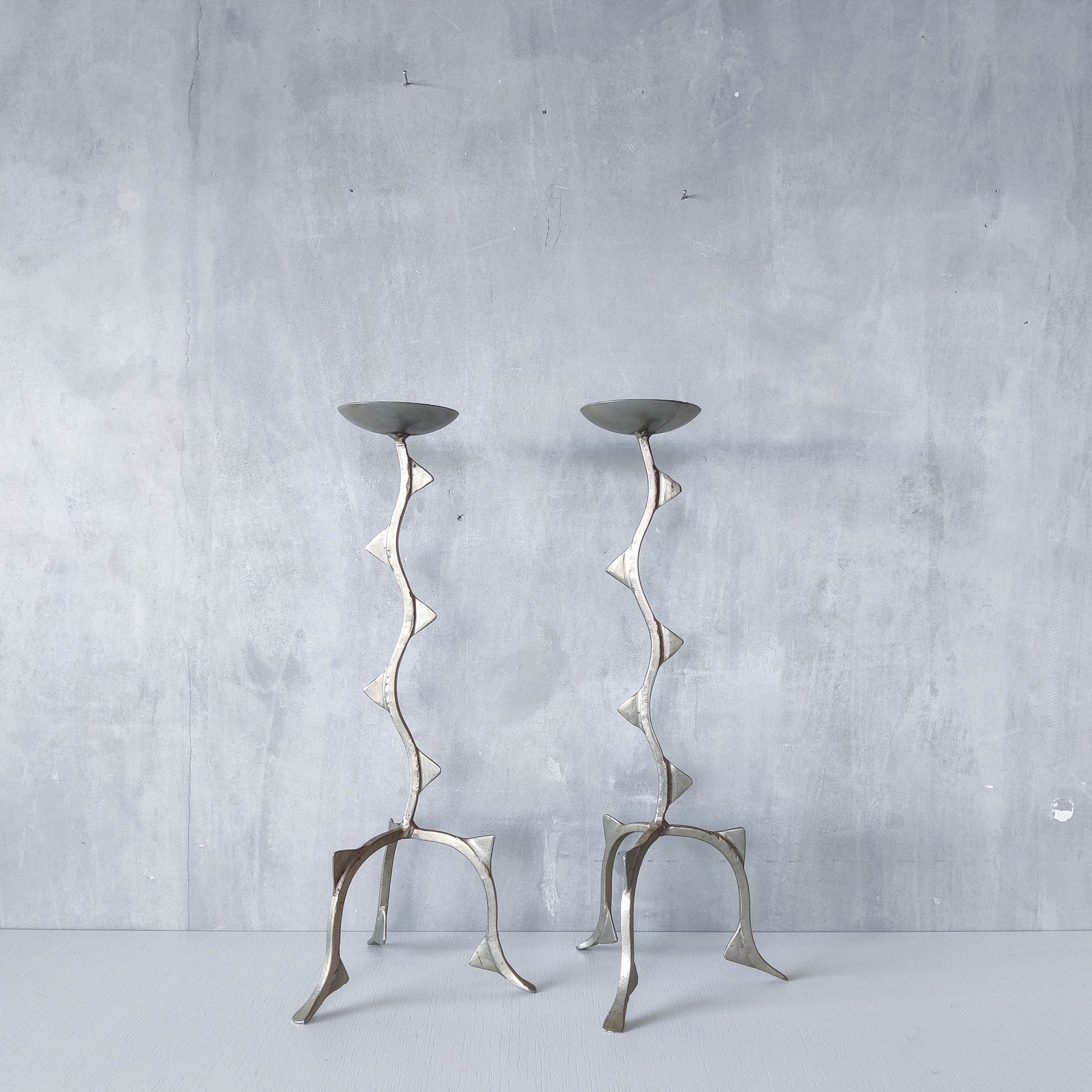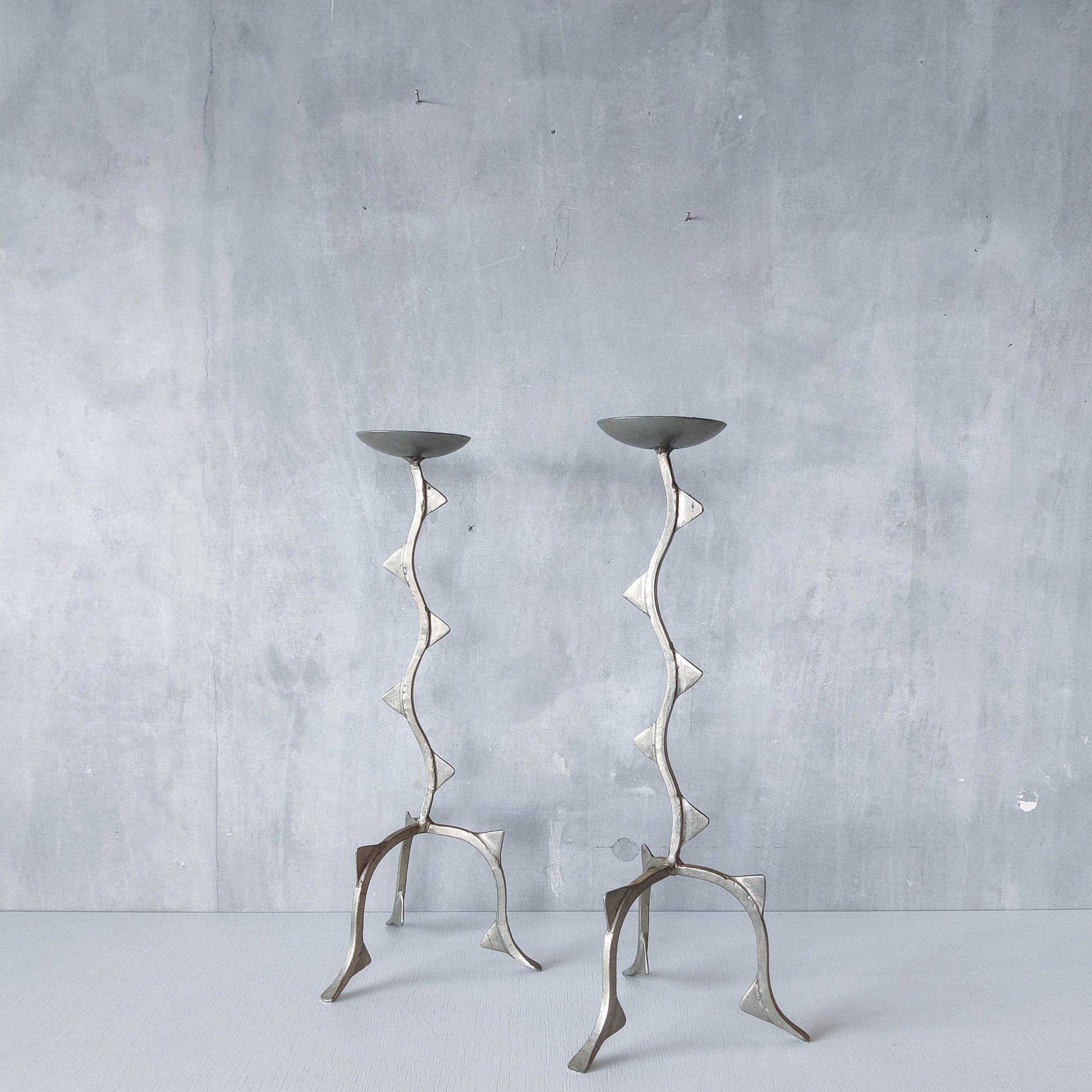 Pair of tall vintage sculptural wavy zigzag footed aluminium candle holders
