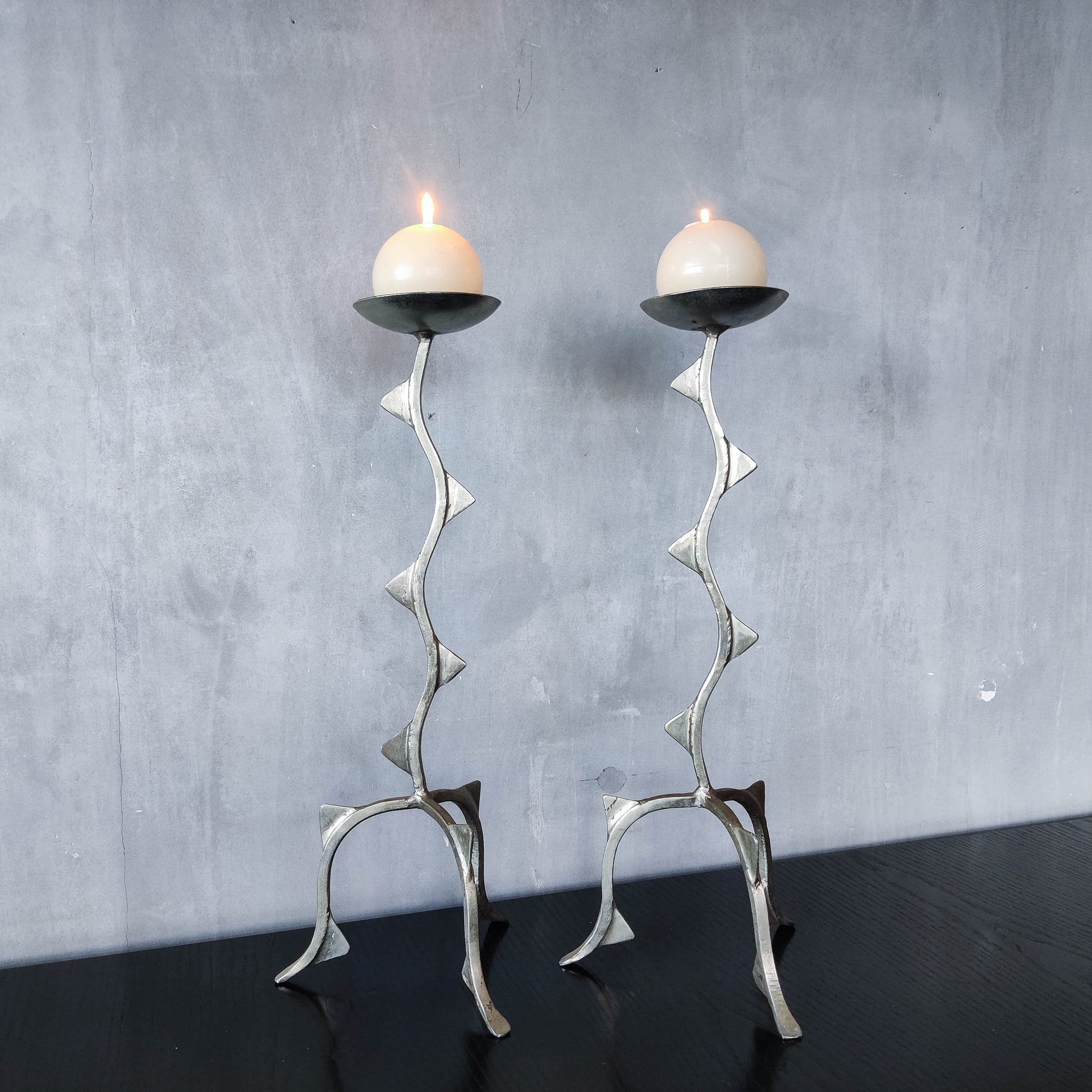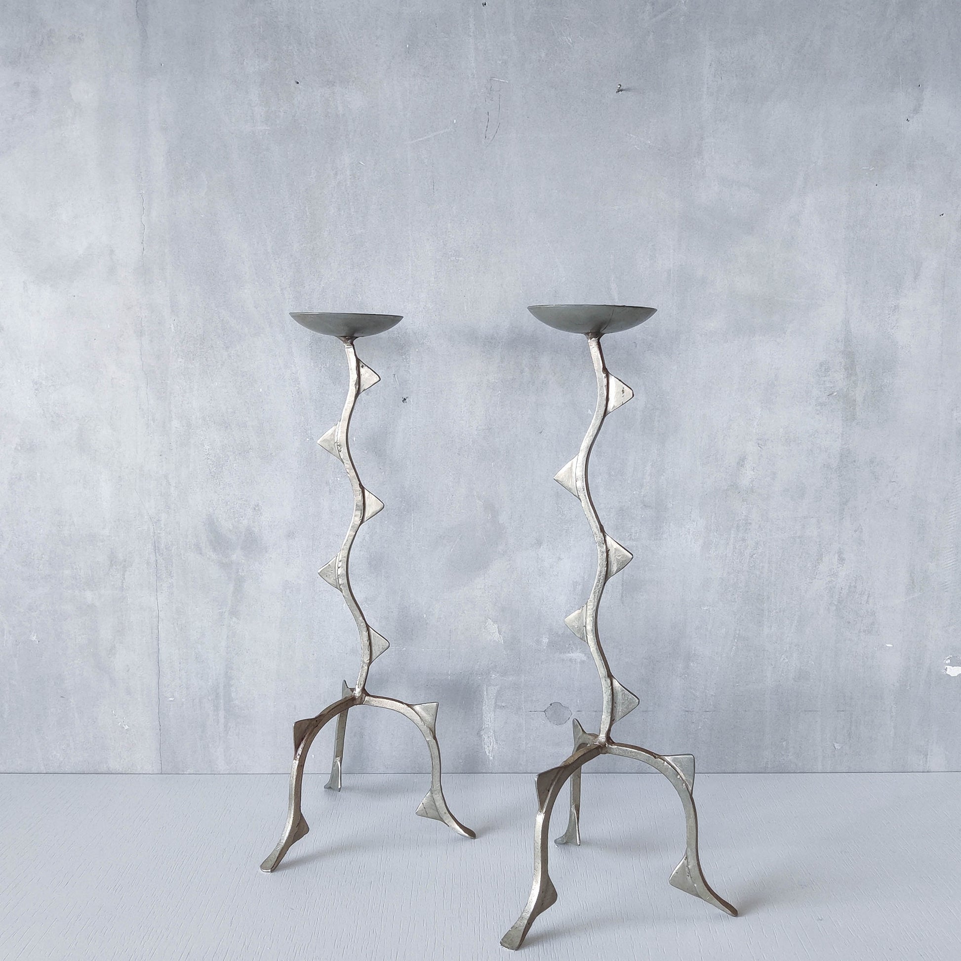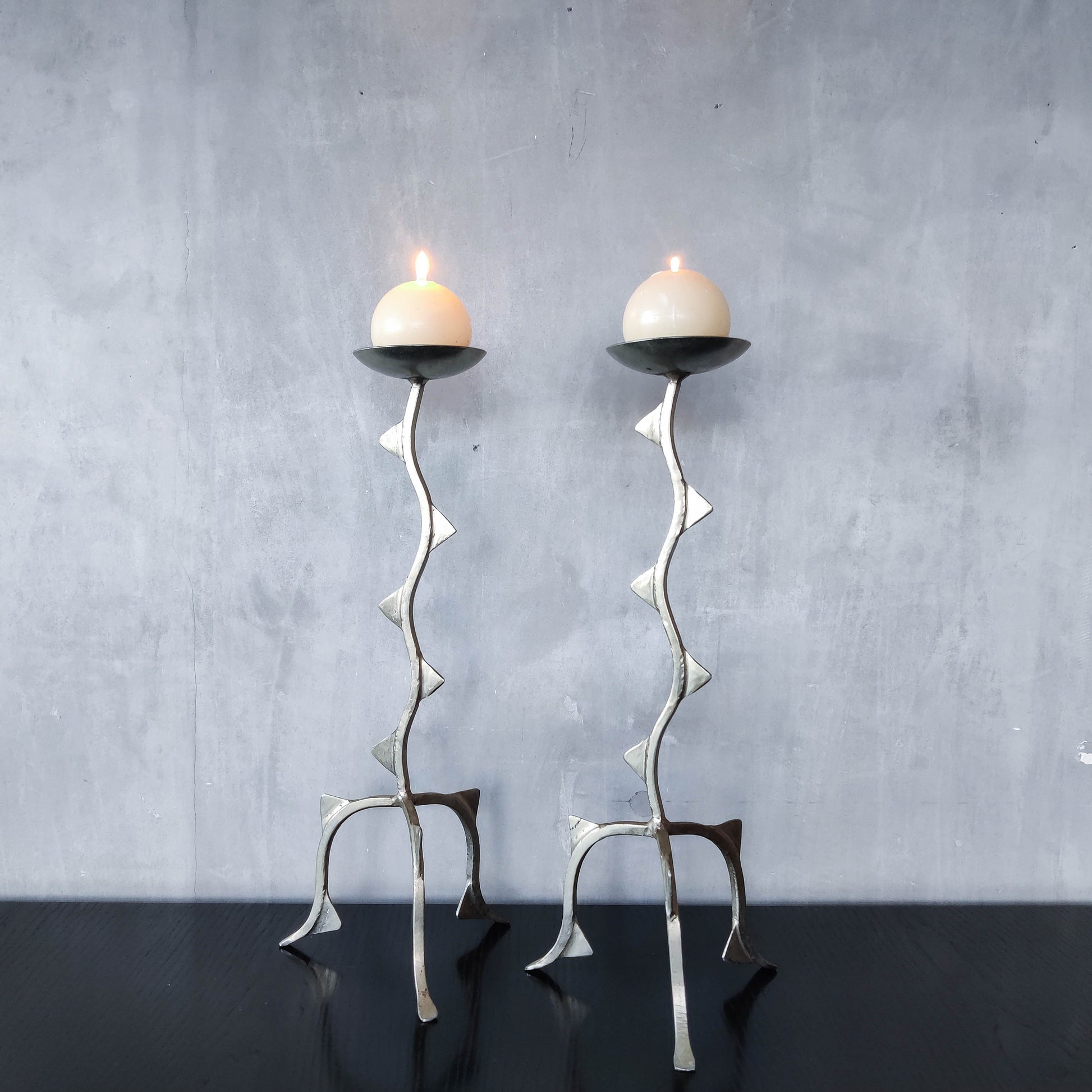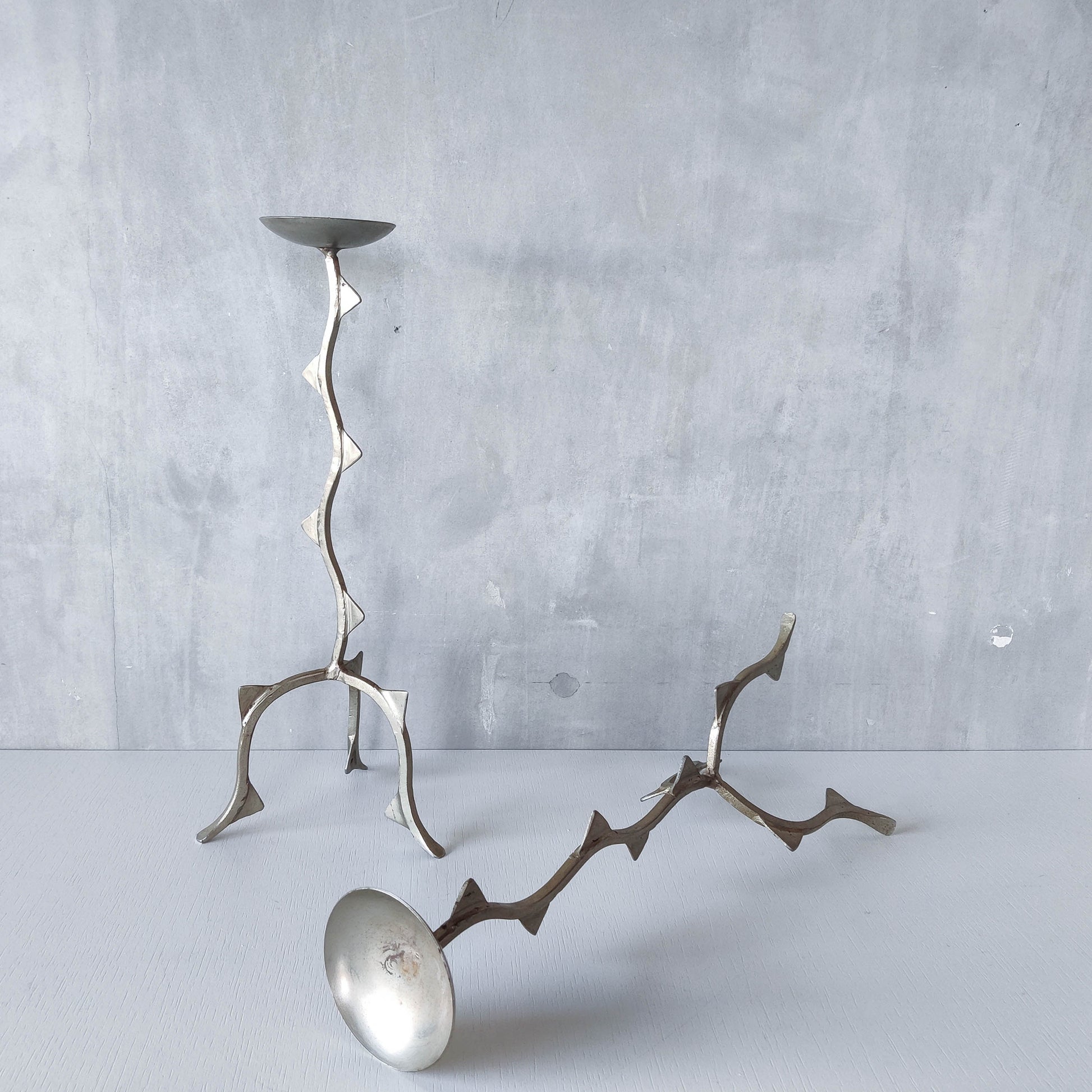 A pair of sculptural cast aluminium (perhaps cast and welded) 1990s tall candle holders. Whimsical wave form with three feet and zigzag fins. Candles not included. Please see photos and condition description.