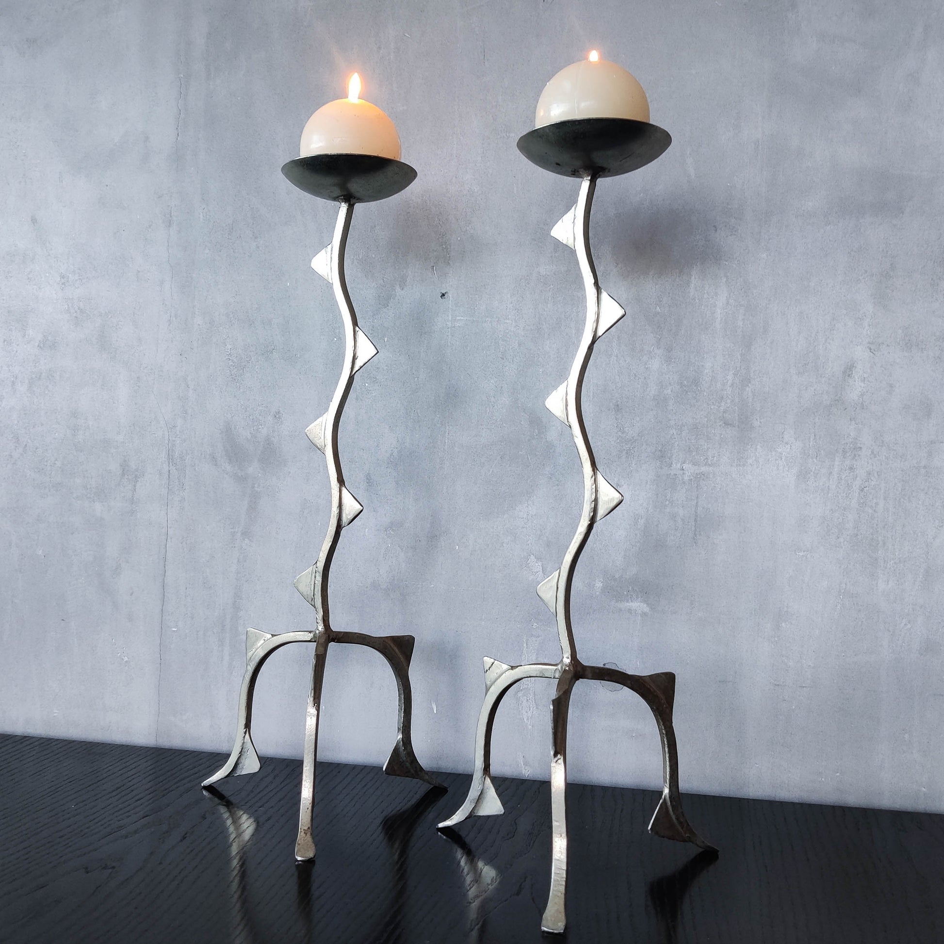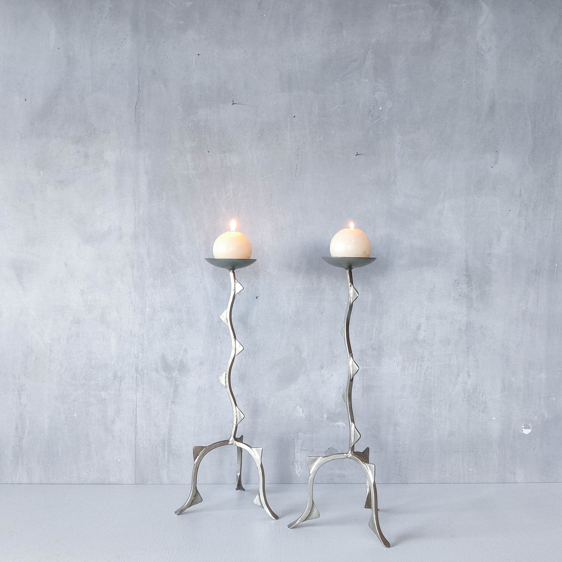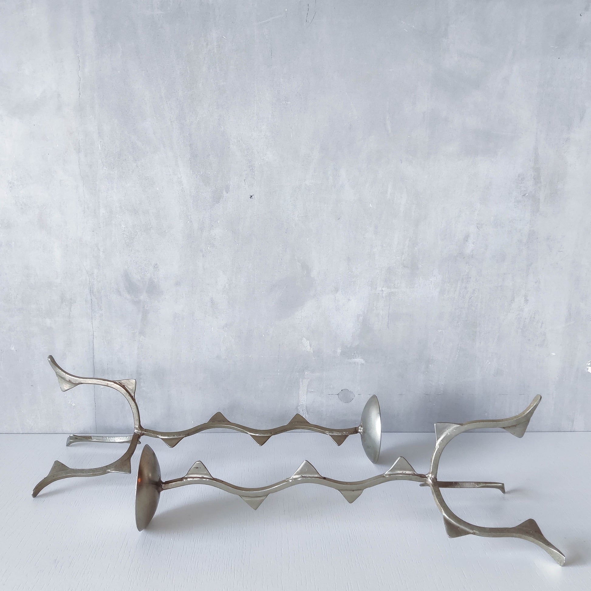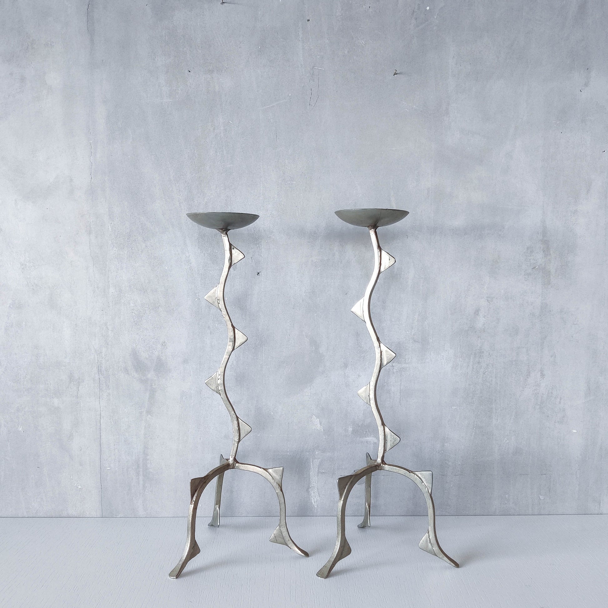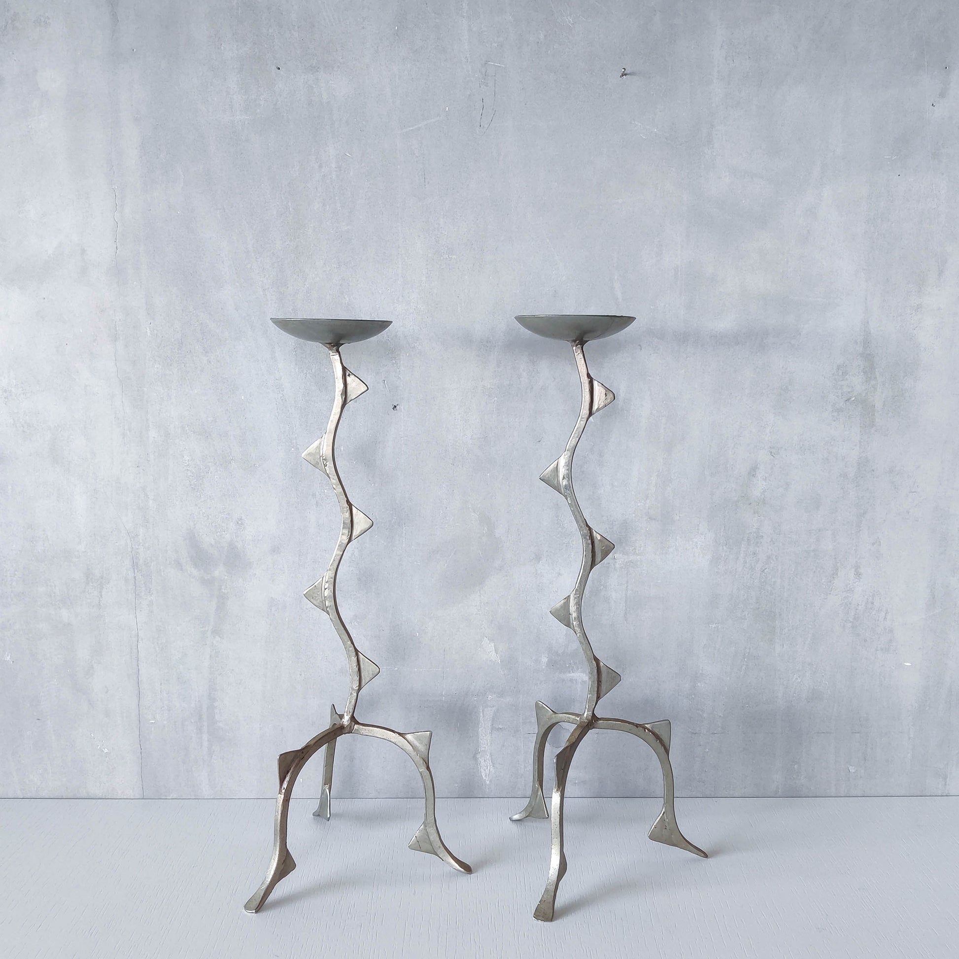 A pair of sculptural cast aluminium (perhaps cast and welded) 1990s tall candle holders. Whimsical wave form with three feet and zigzag fins. Candles not included. Please see photos and condition description.