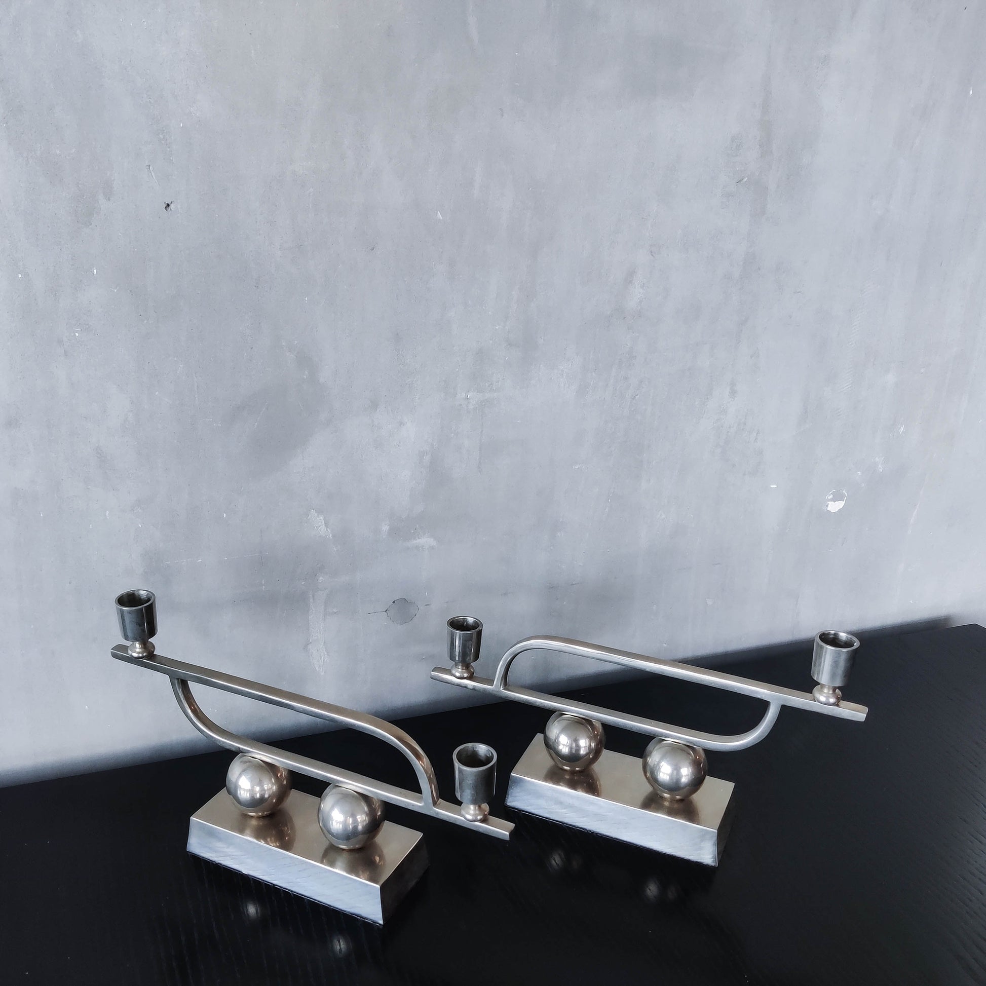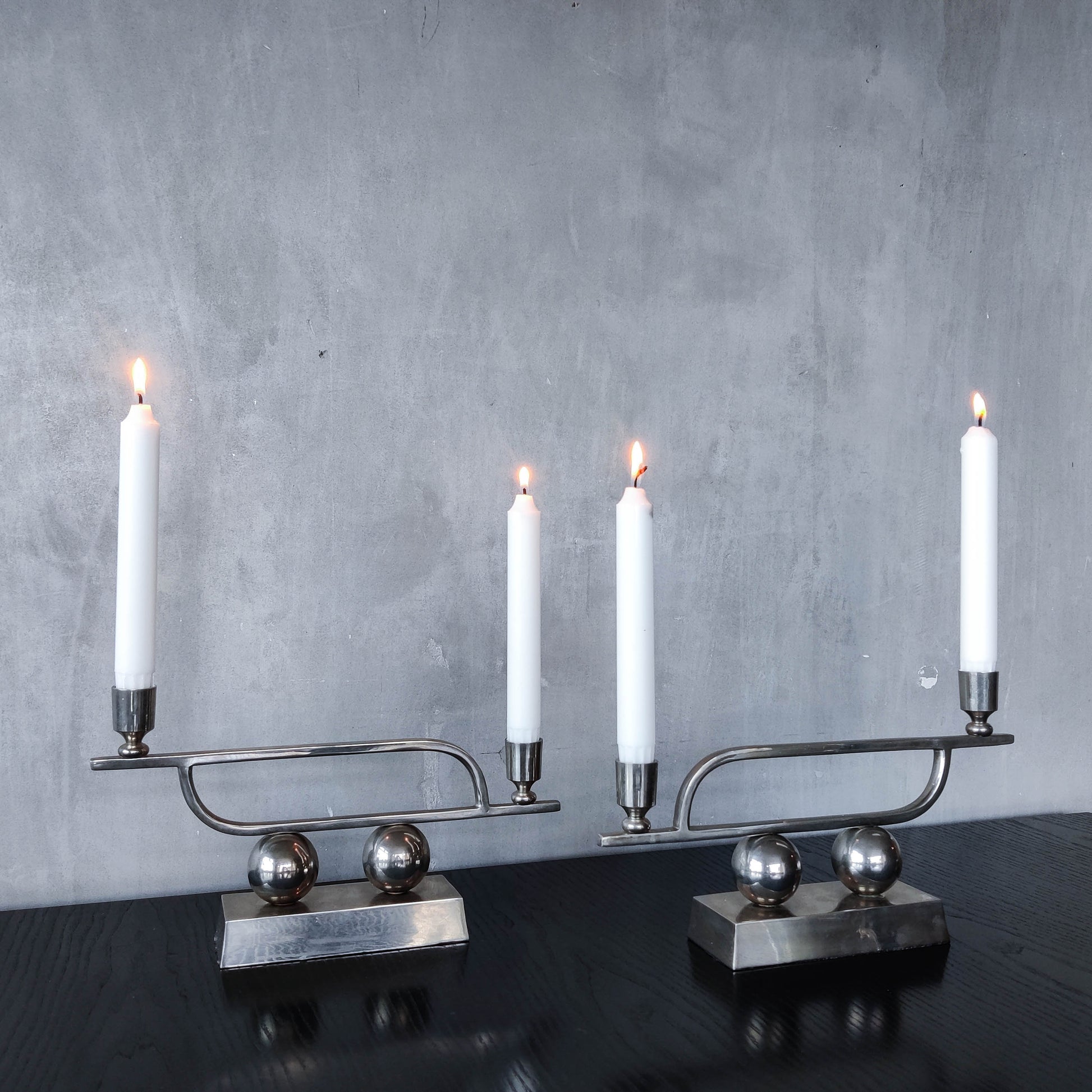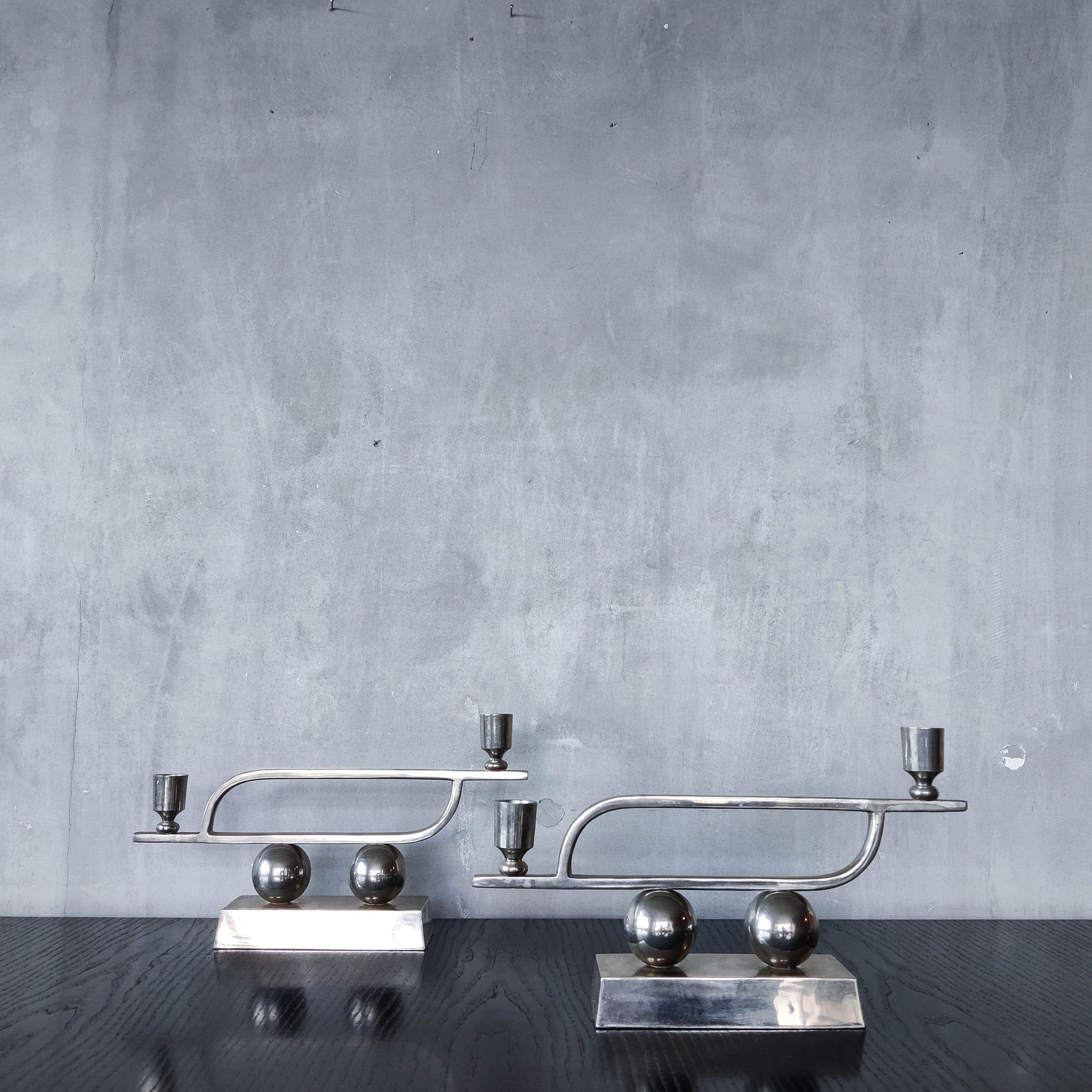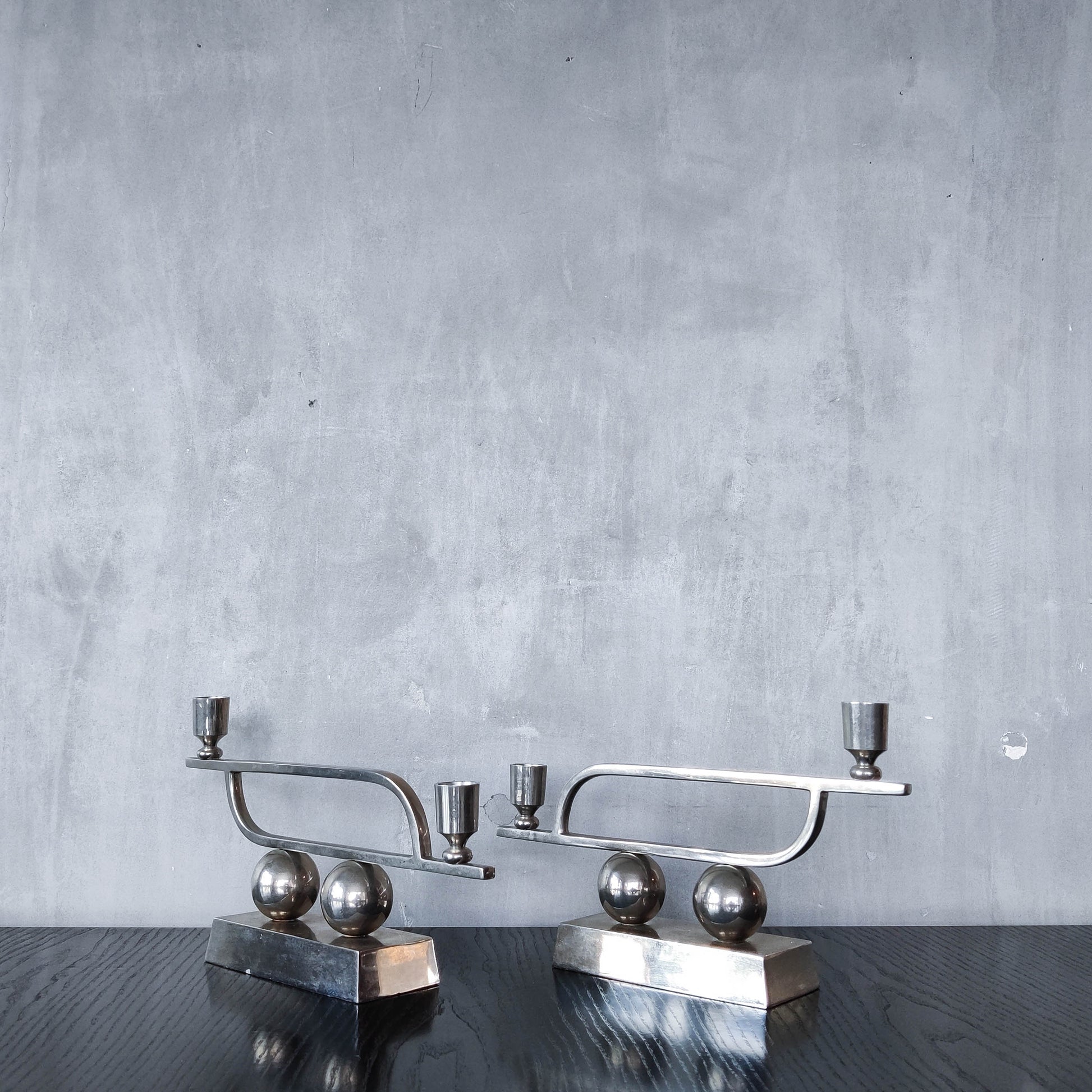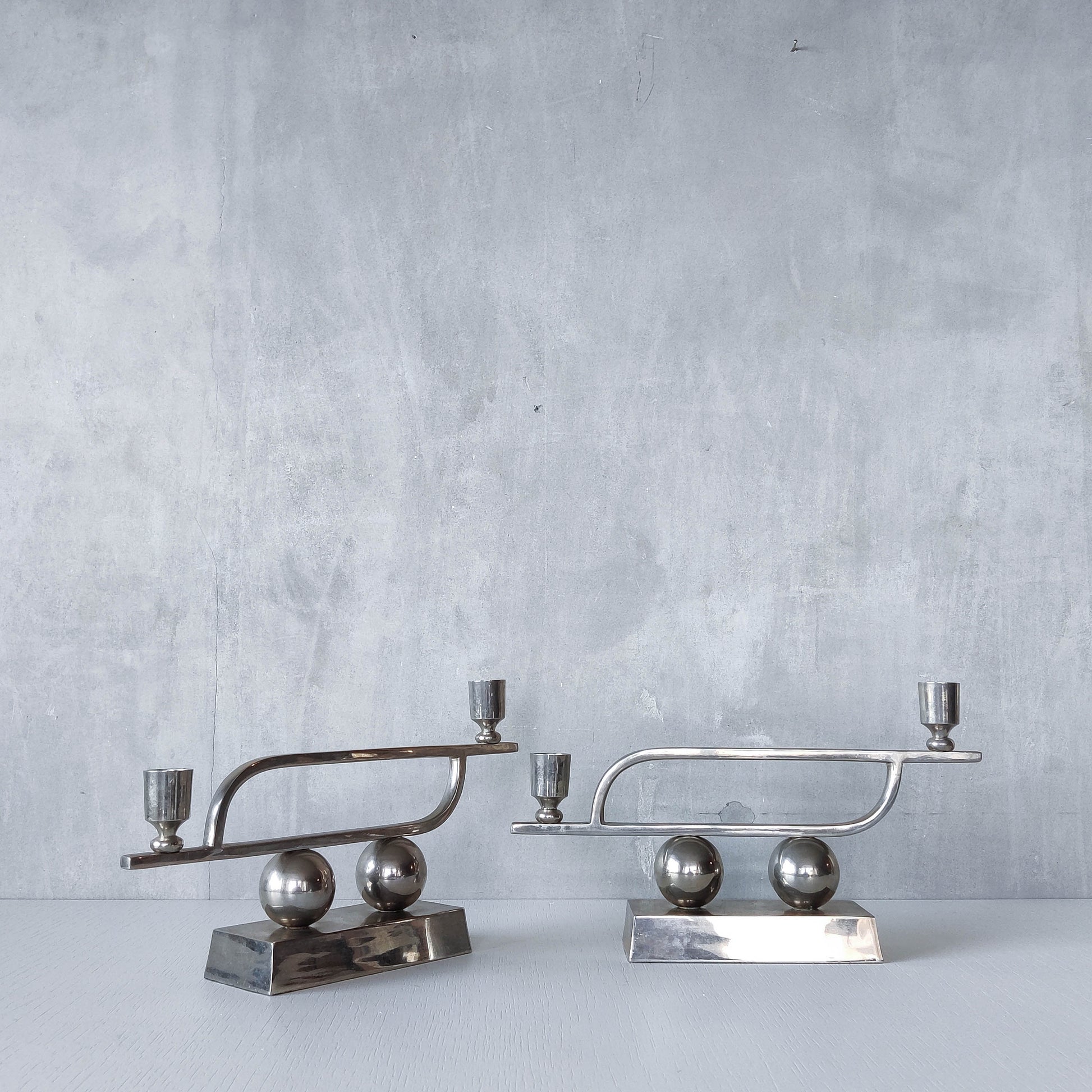 Pair of vintage Art Deco style (but appear to be a late 20th century homage) chrome/silver metal candelabras with sculptural ball detail and geometric plinth bases. Great shape. Please see photos and condition description.