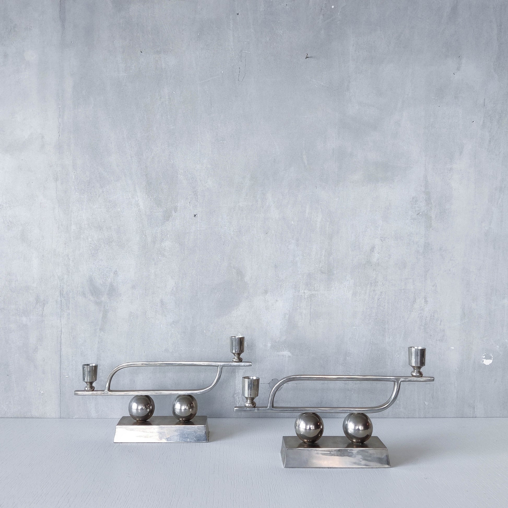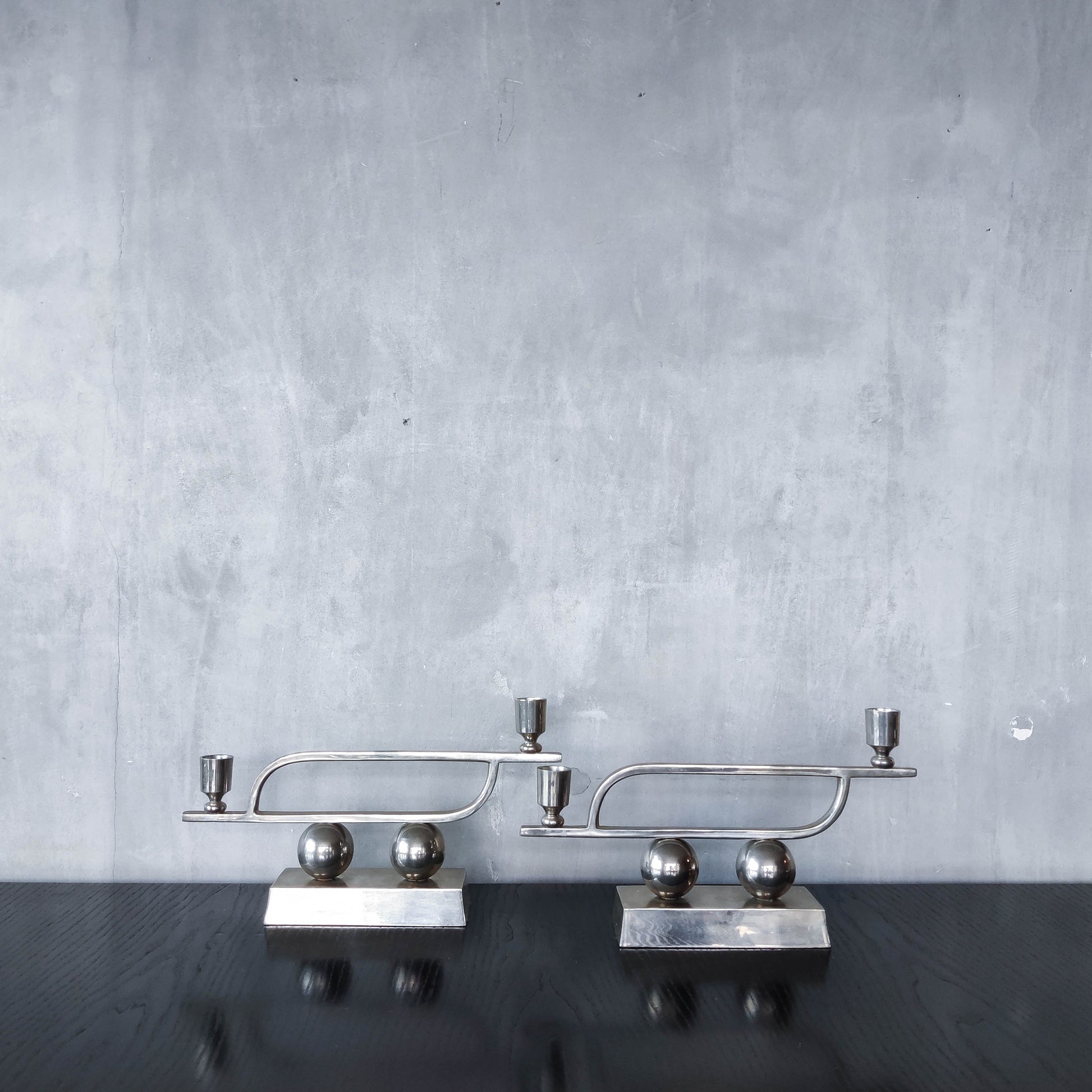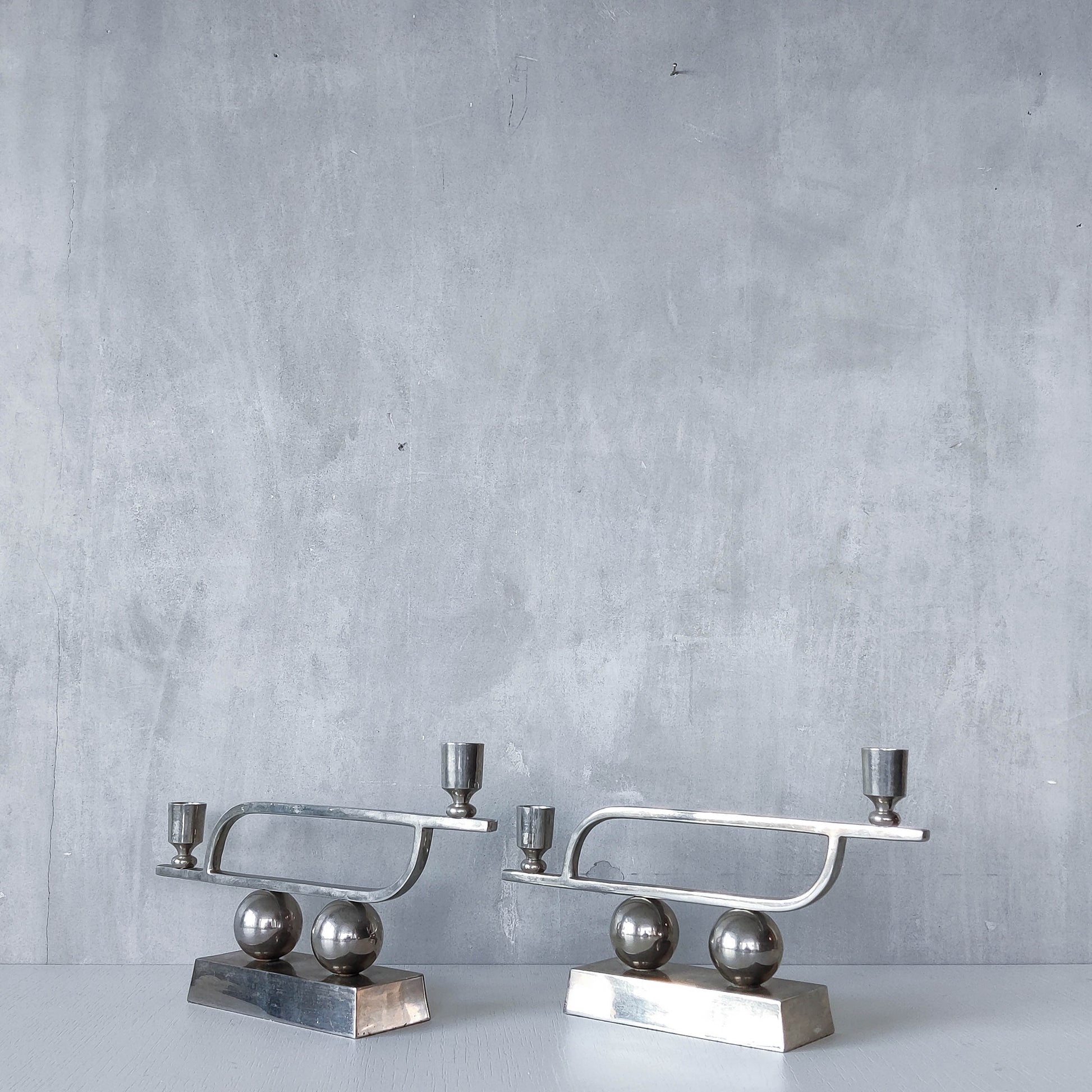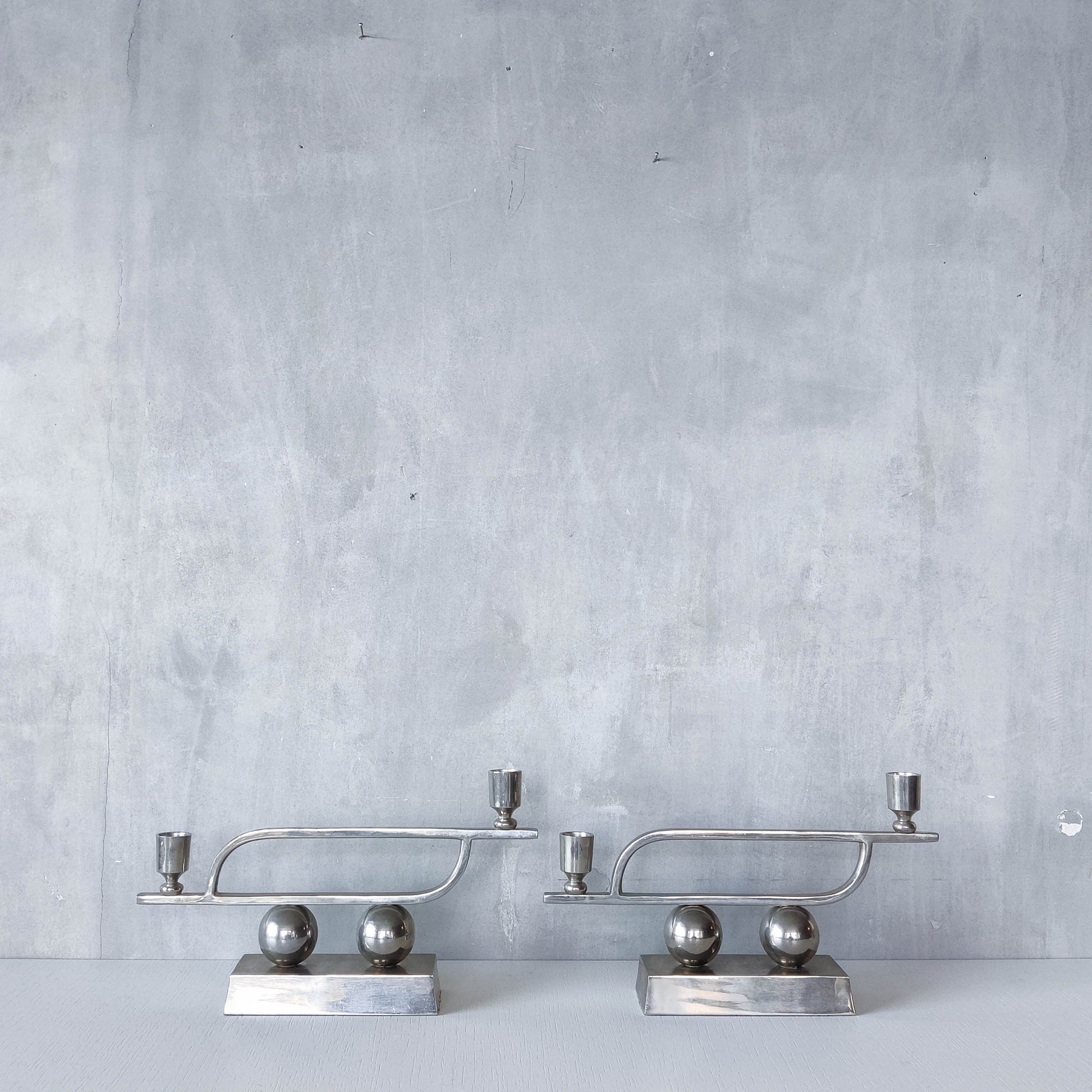 Pair of vintage Art Deco style (but appear to be a late 20th century homage) chrome/silver metal candelabras with sculptural ball detail and geometric plinth bases. Great shape. Please see photos and condition description.