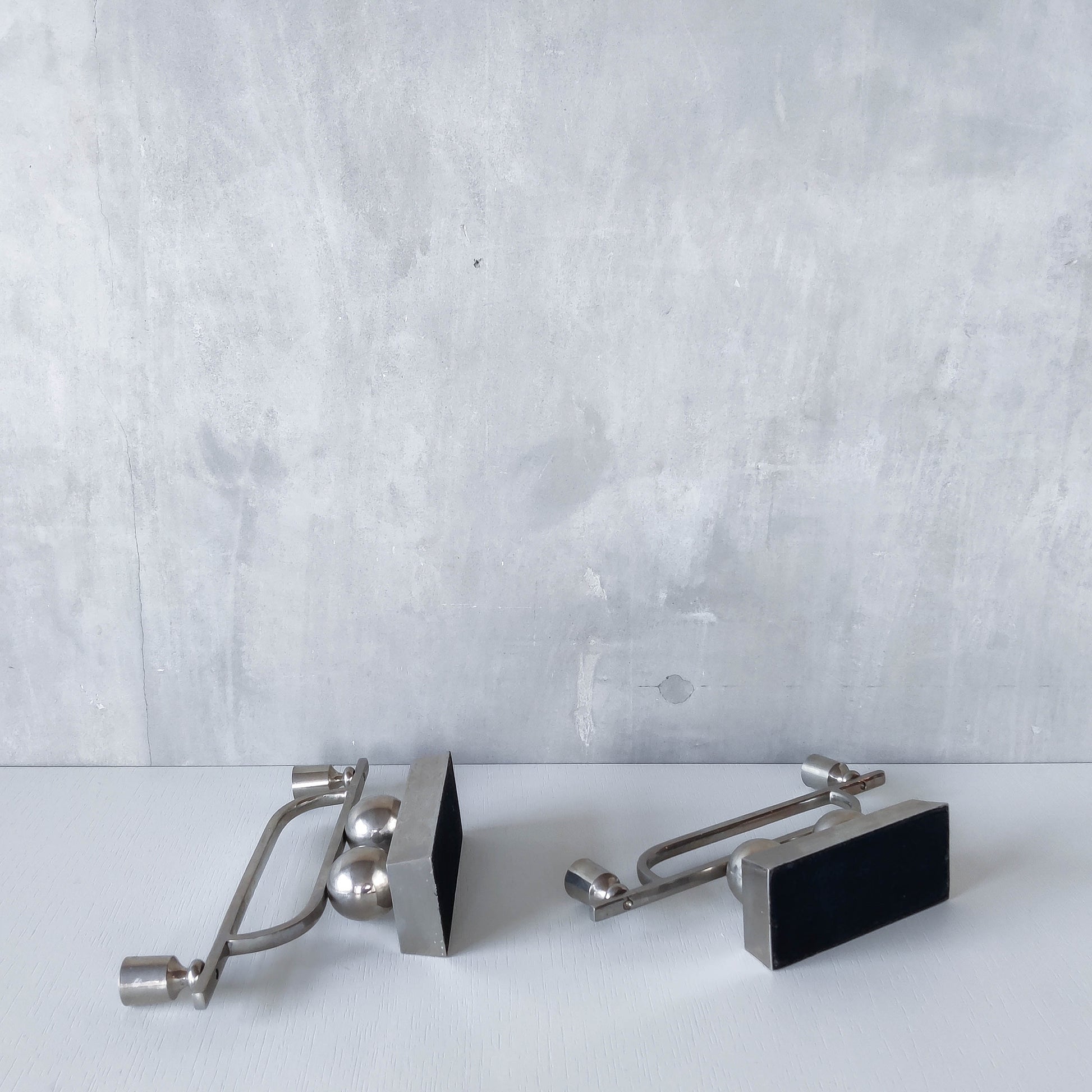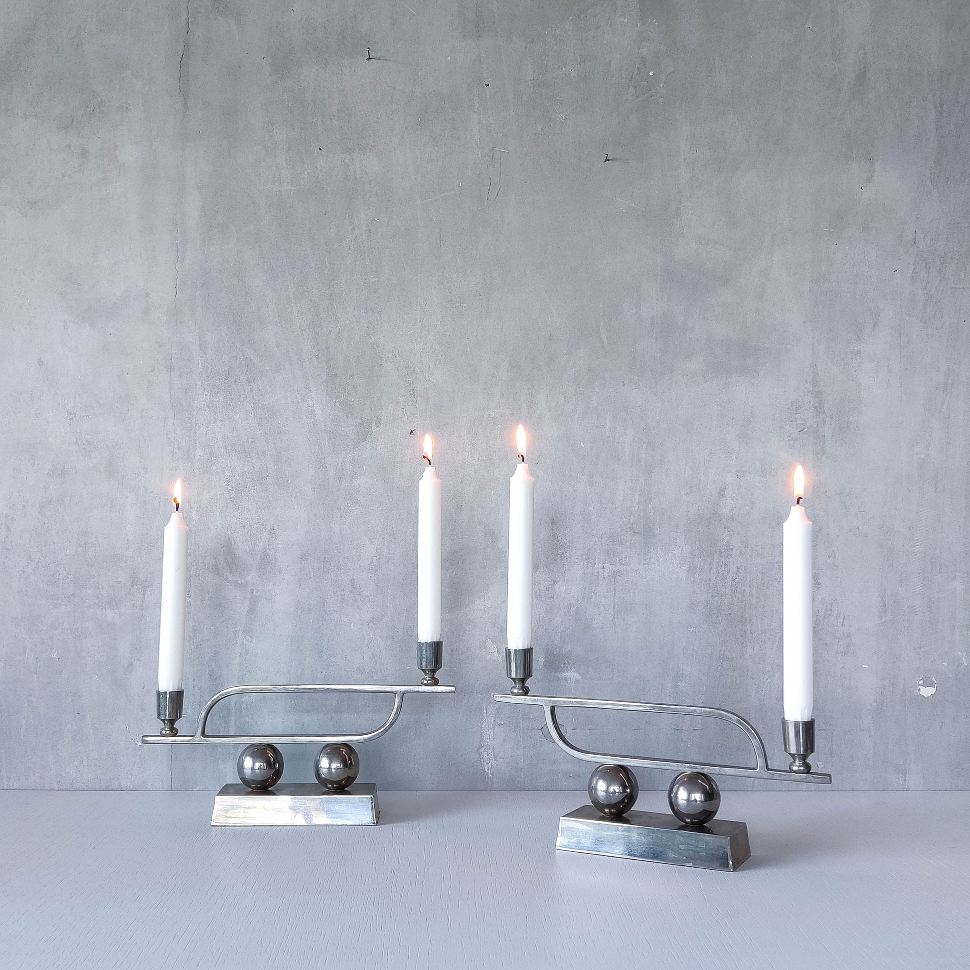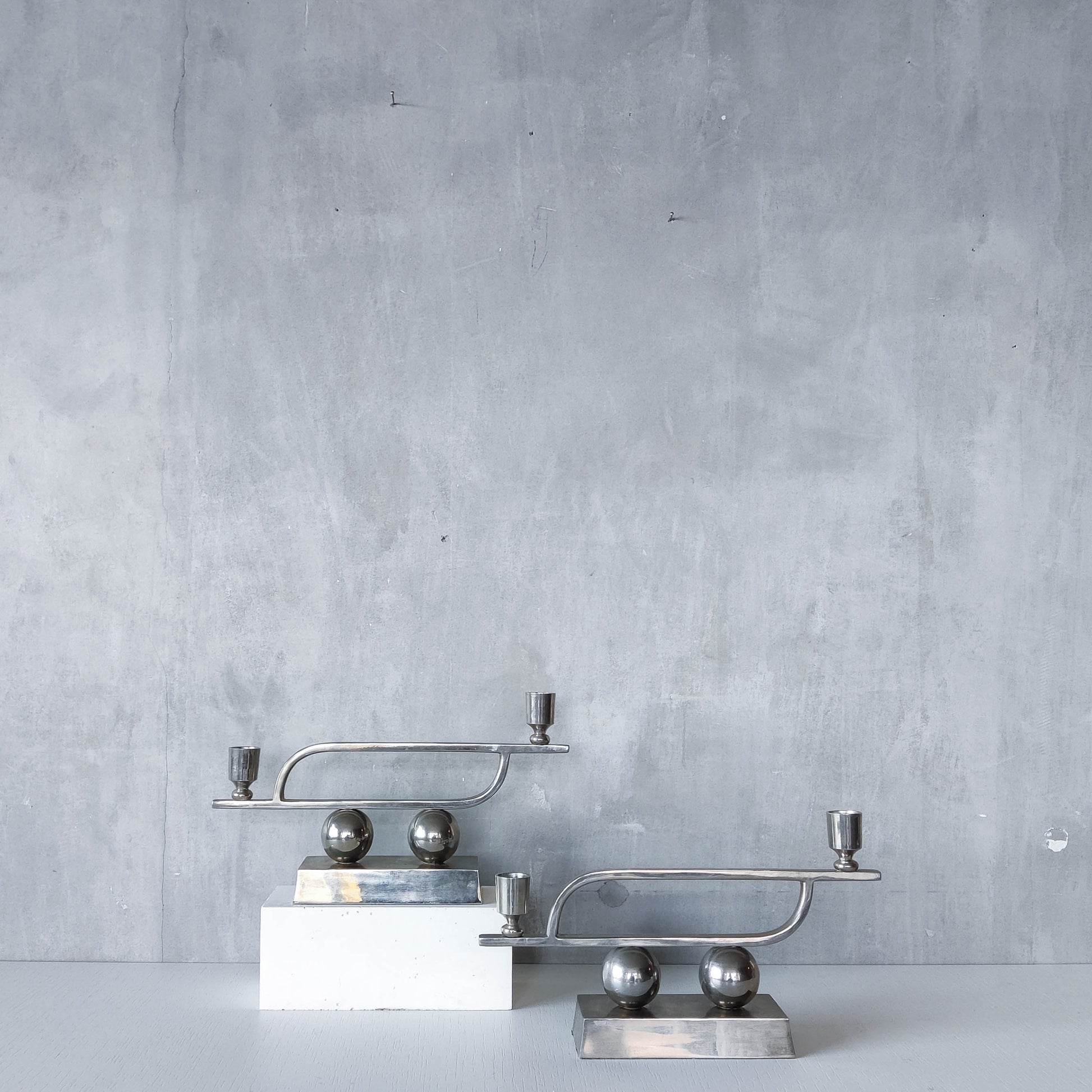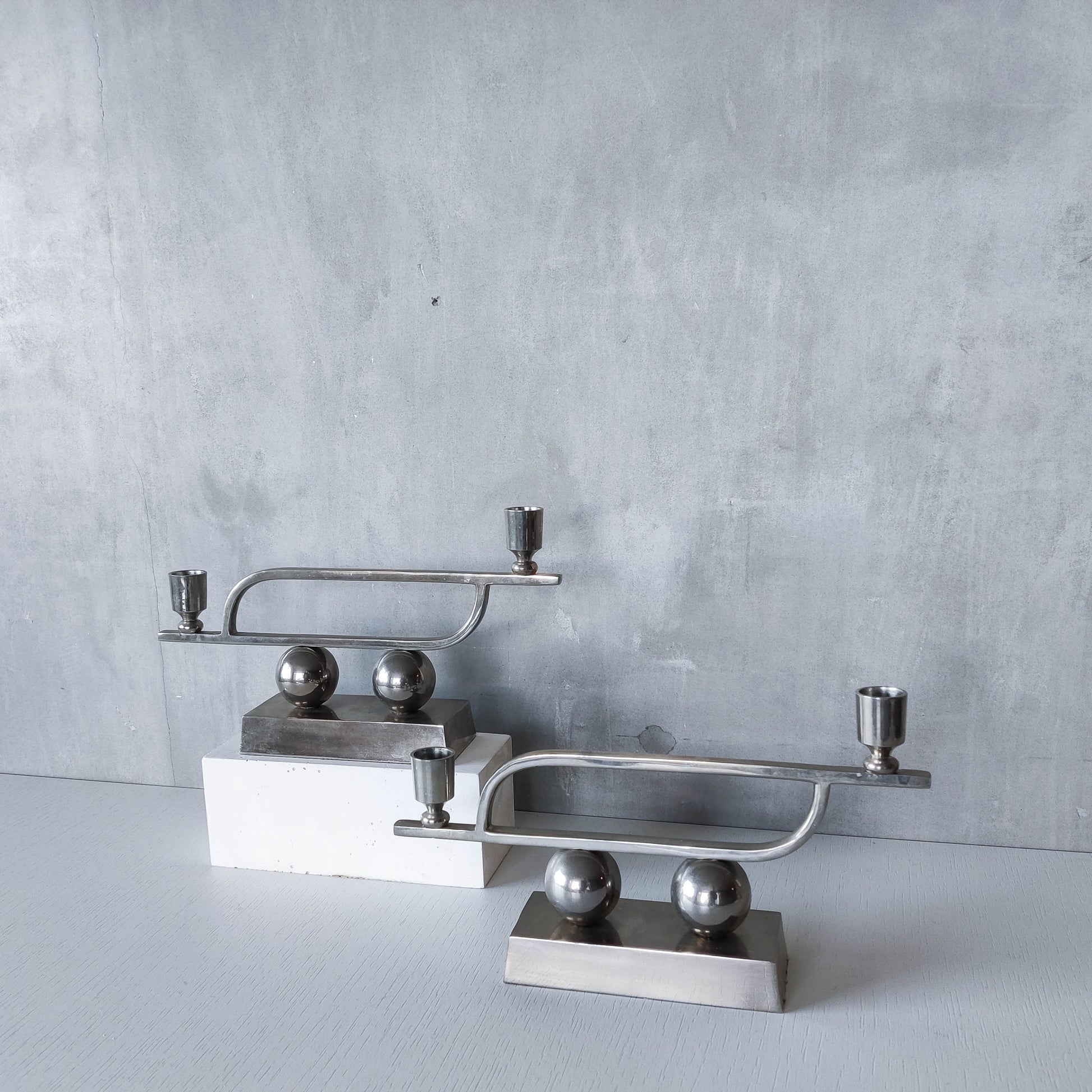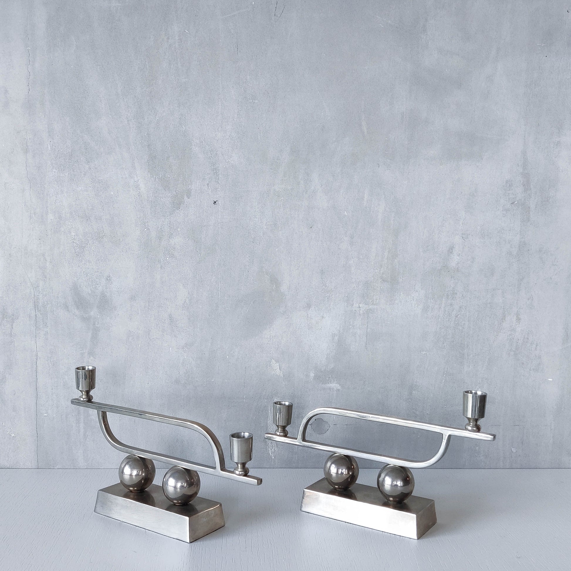Pair of vintage Art Deco style (but appear to be a late 20th century homage) chrome/silver metal candelabras with sculptural ball detail and geometric plinth bases. Great shape. Please see photos and condition description.