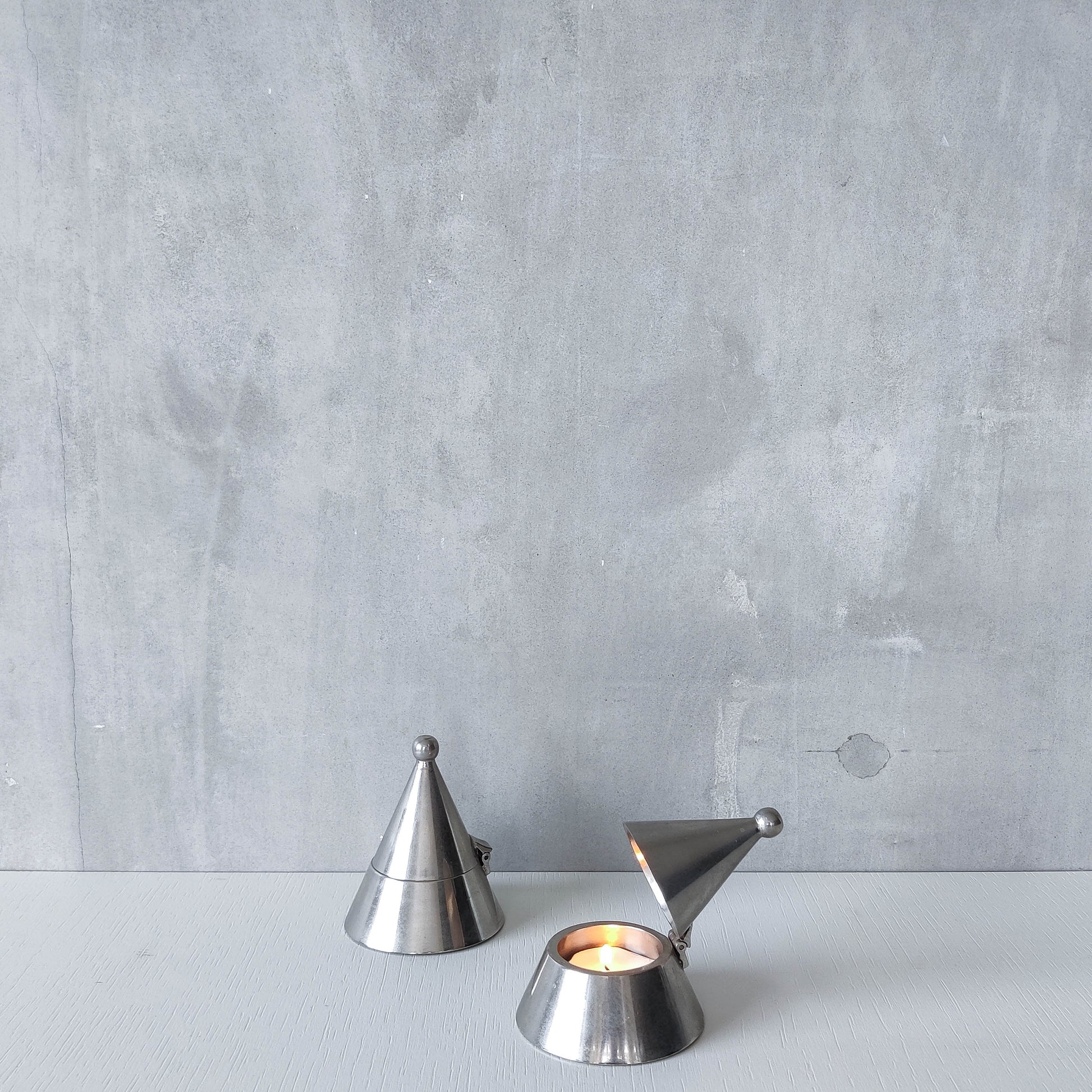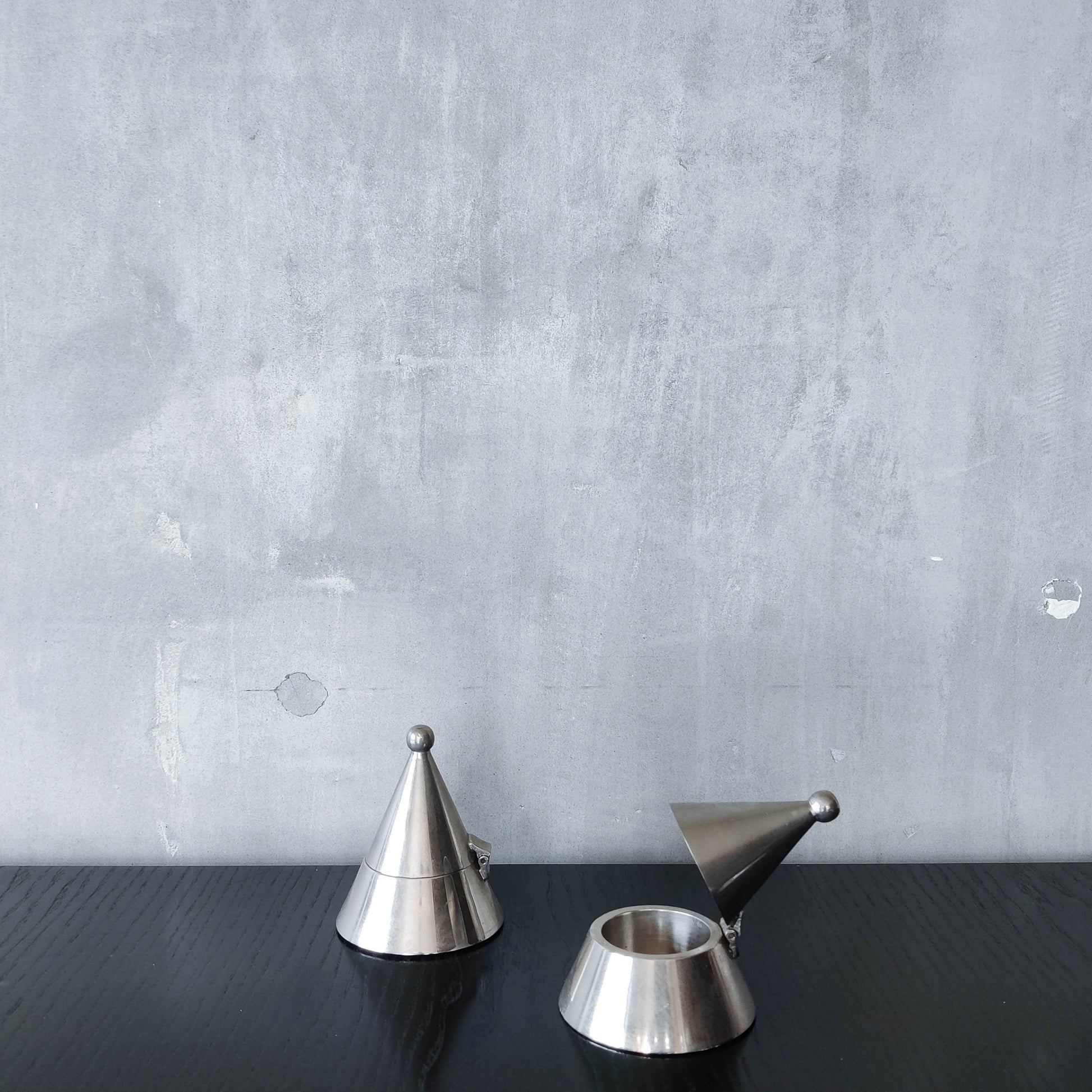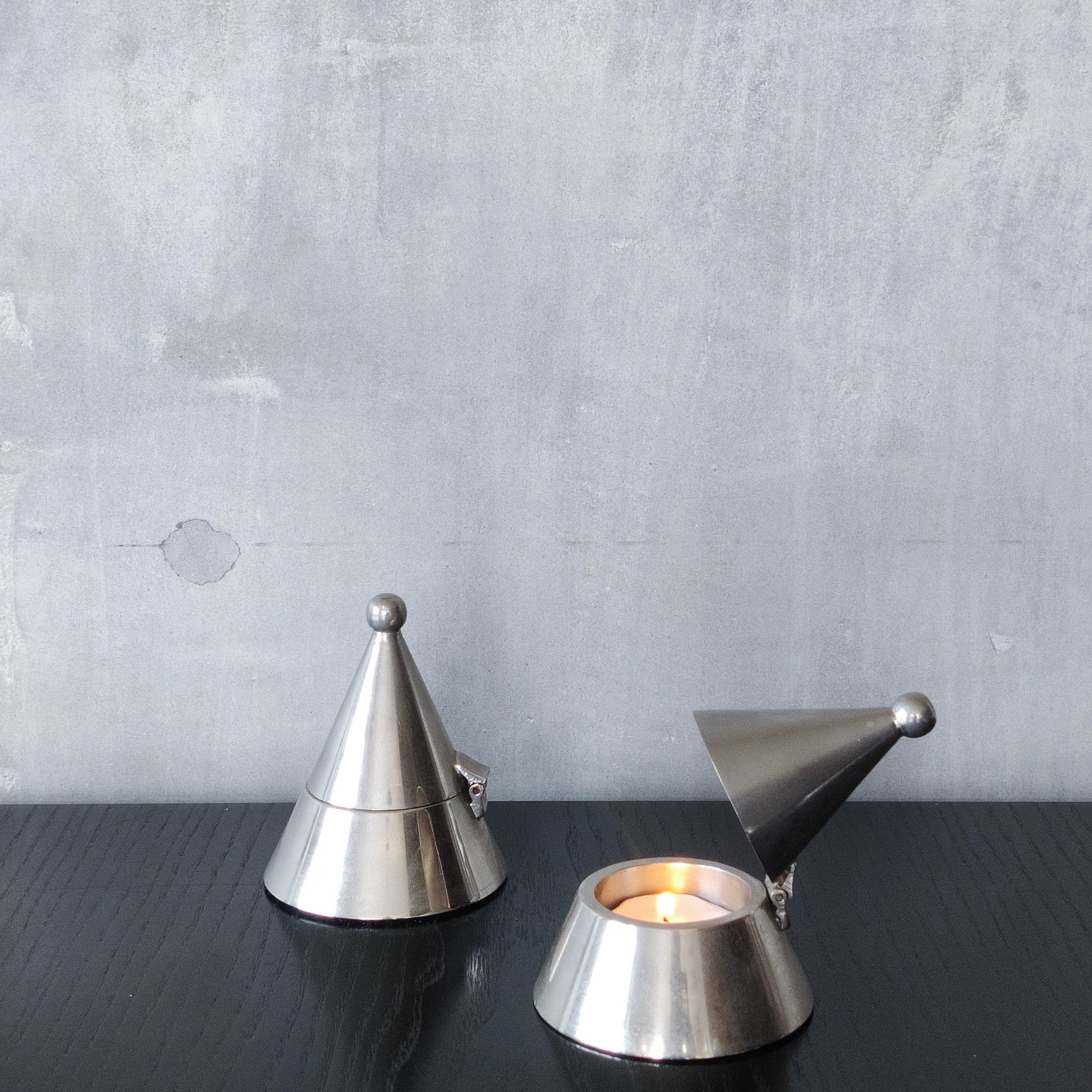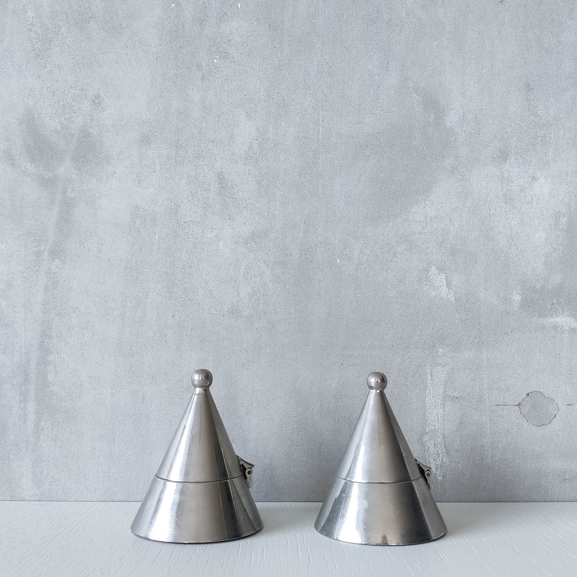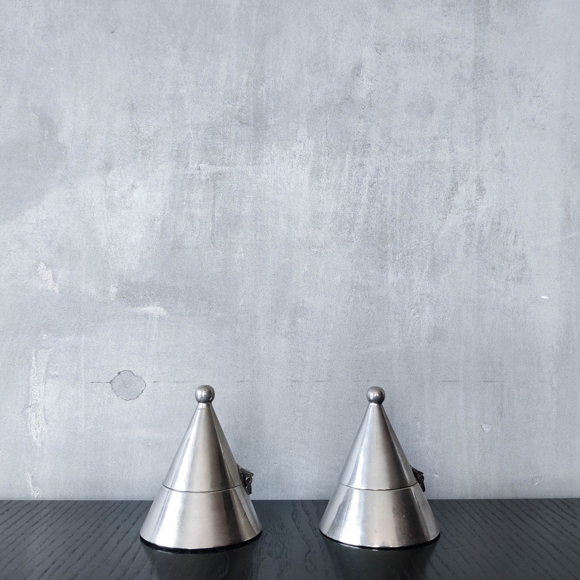 Pair of vintage conical silver chrome tea light holders Aldo Rossi Alessi modernist
