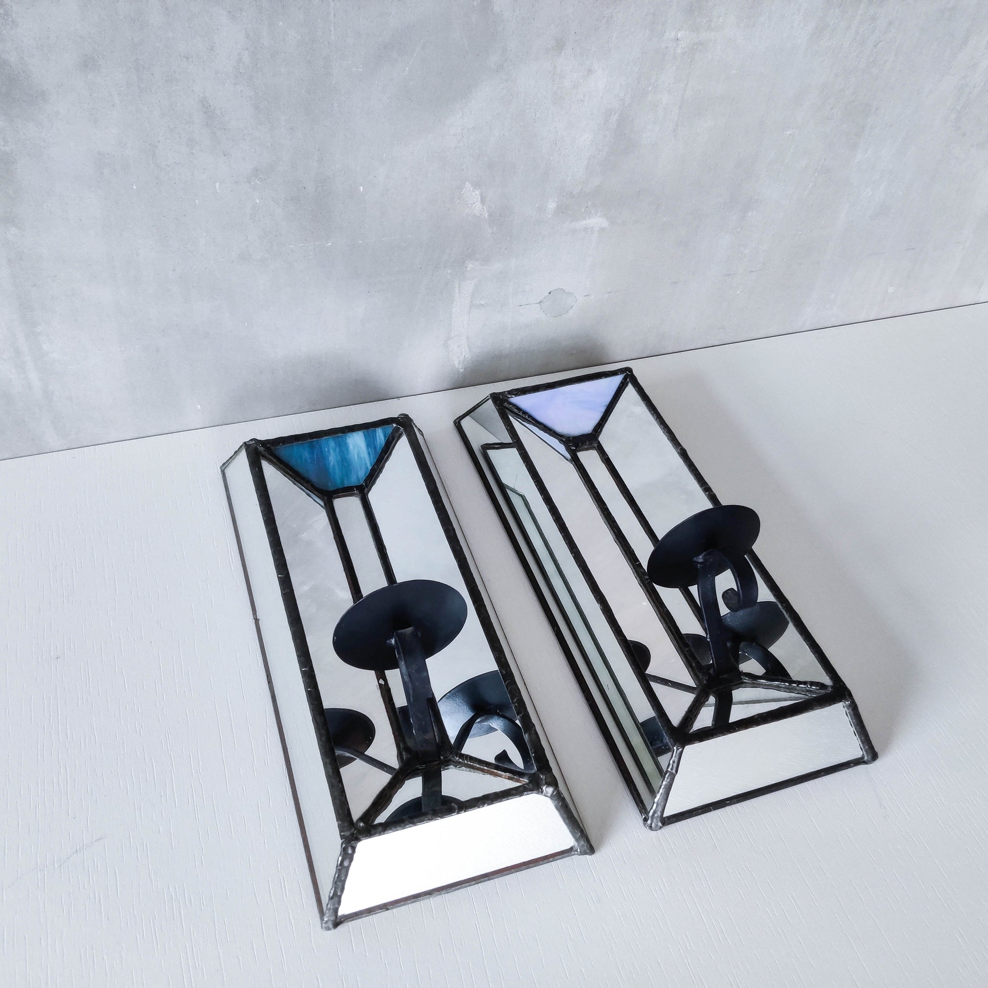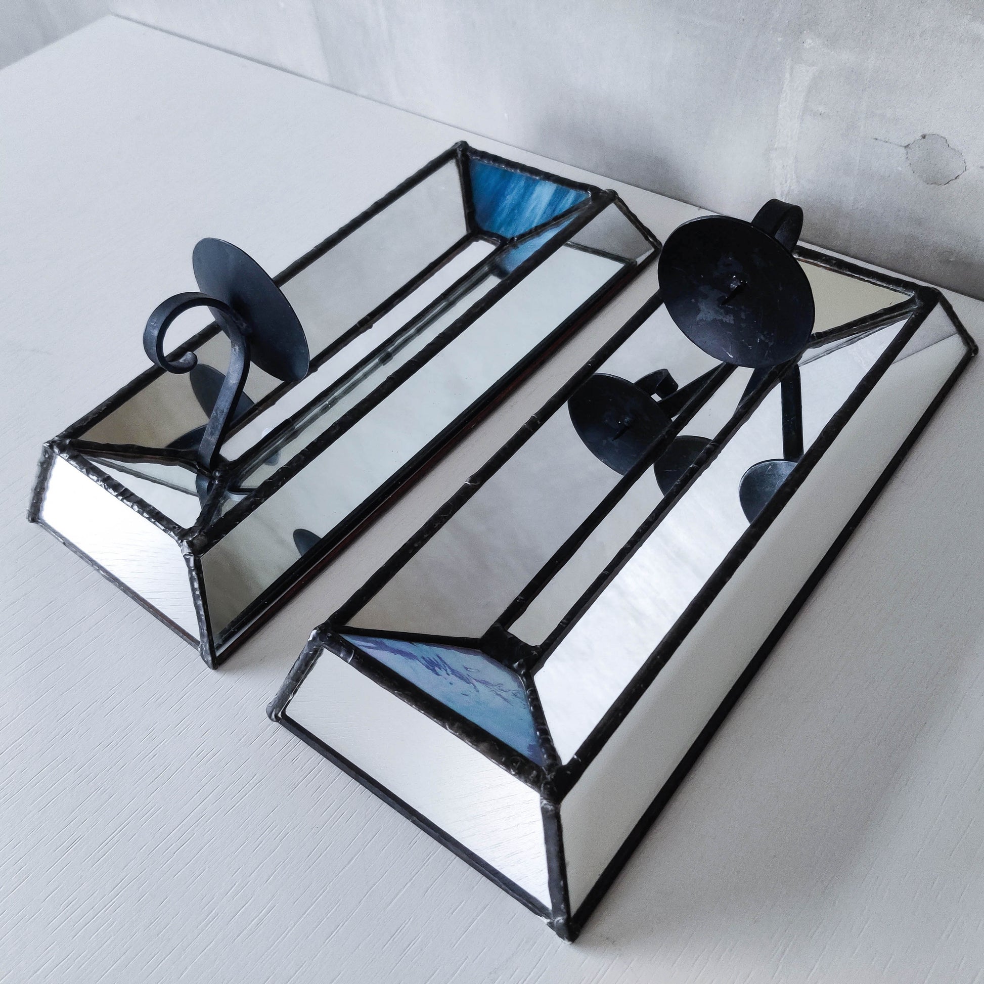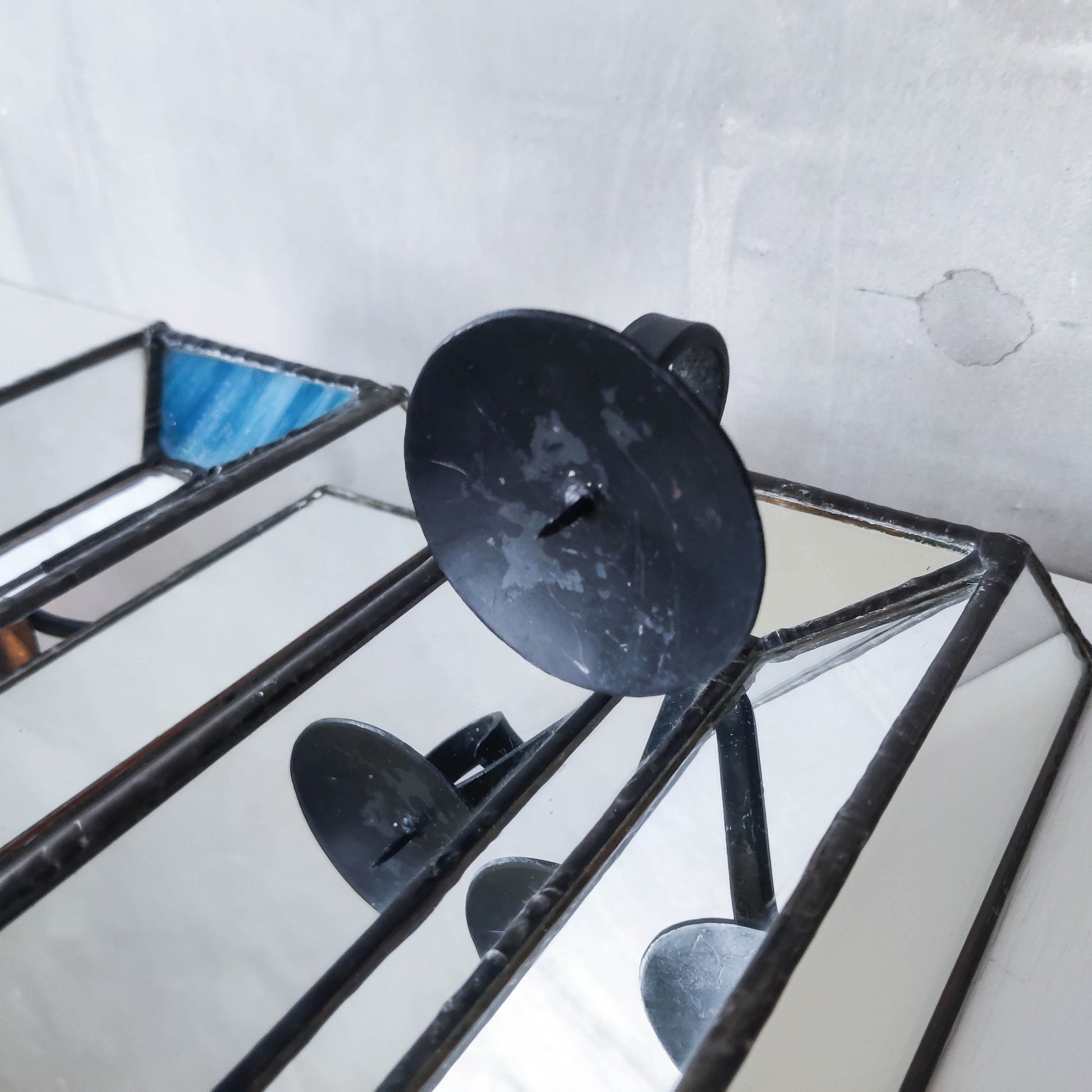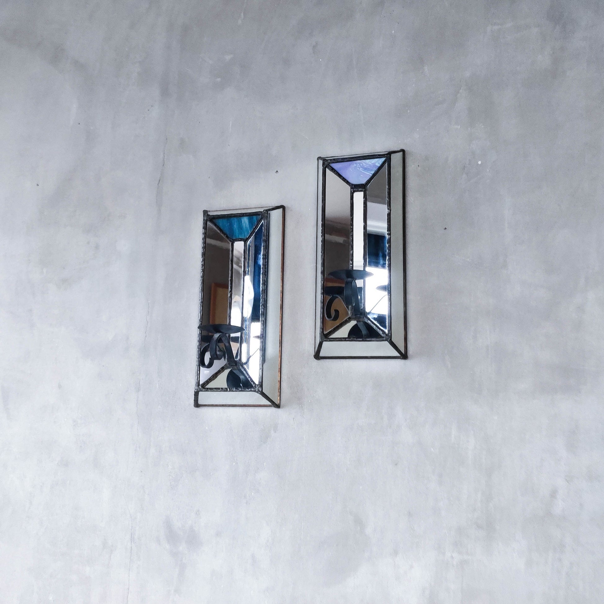 Pair of charming vintage wall candle sconces made from leaded faceted mirror pieces (as well as a piece of handmade coloured glass: one with a variegated cool blue and one a pale warm blue/violet). Beautifully and carefully hand made. Plywood back. Black metal pricket top candle holders (sorry candles not included). Please see photos and condition description.