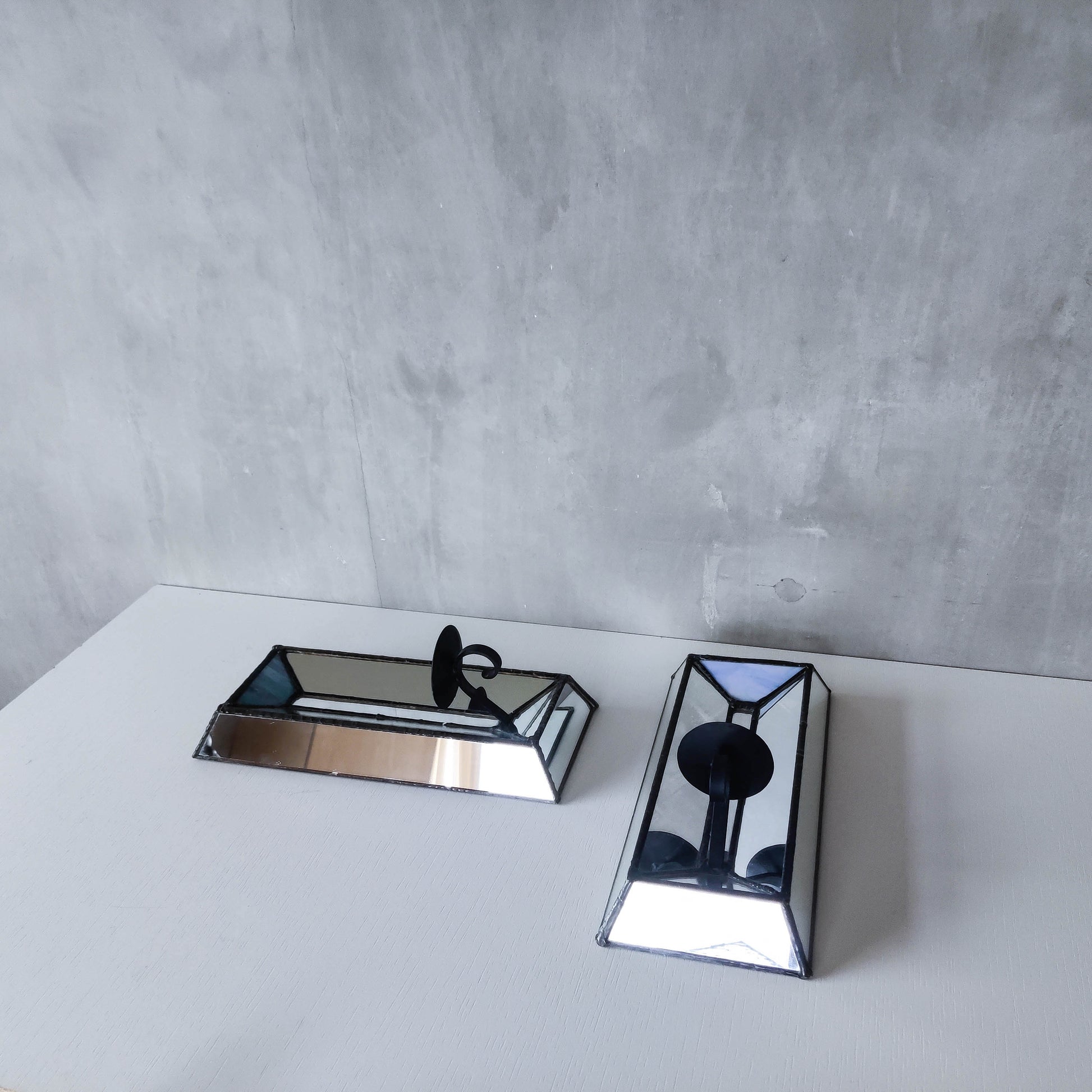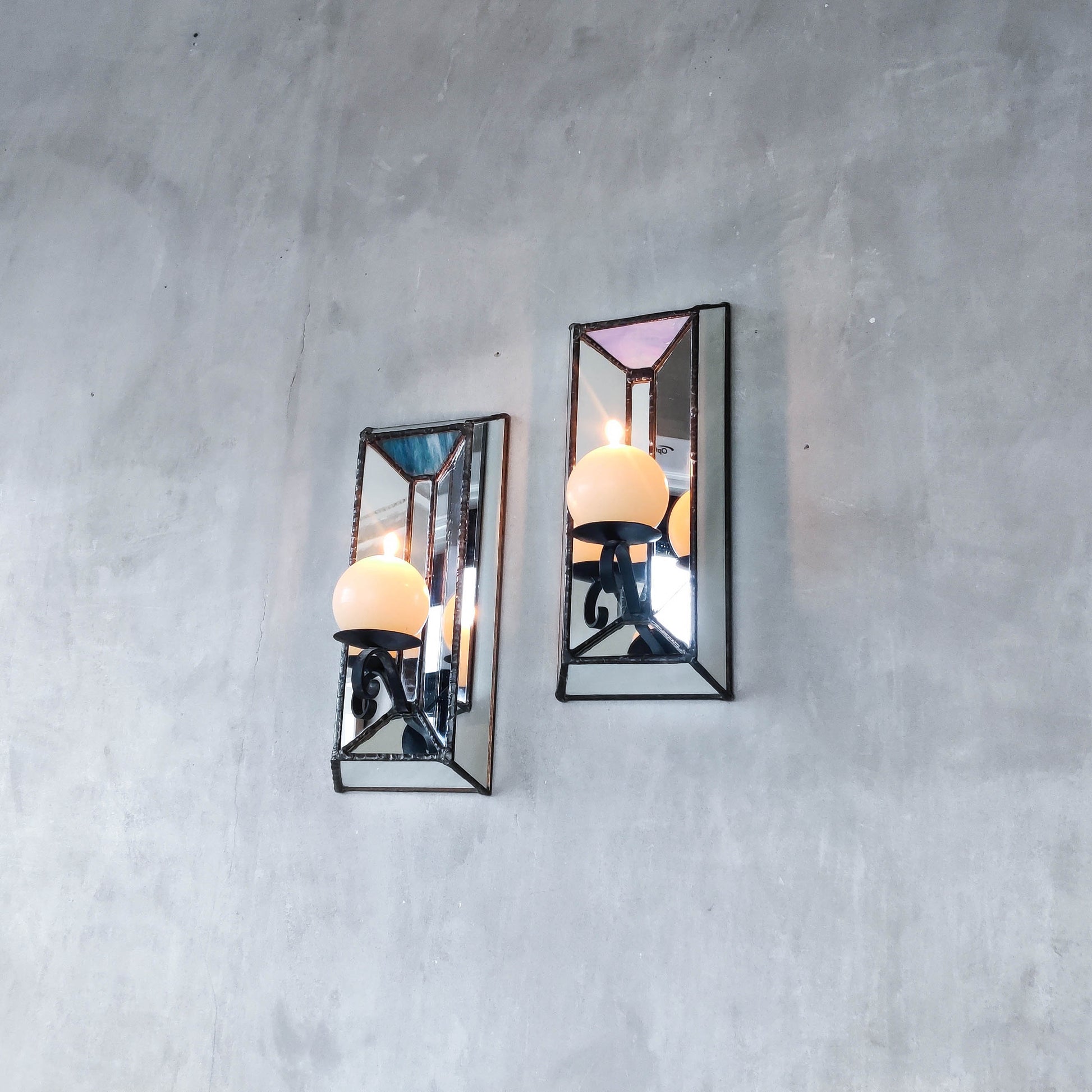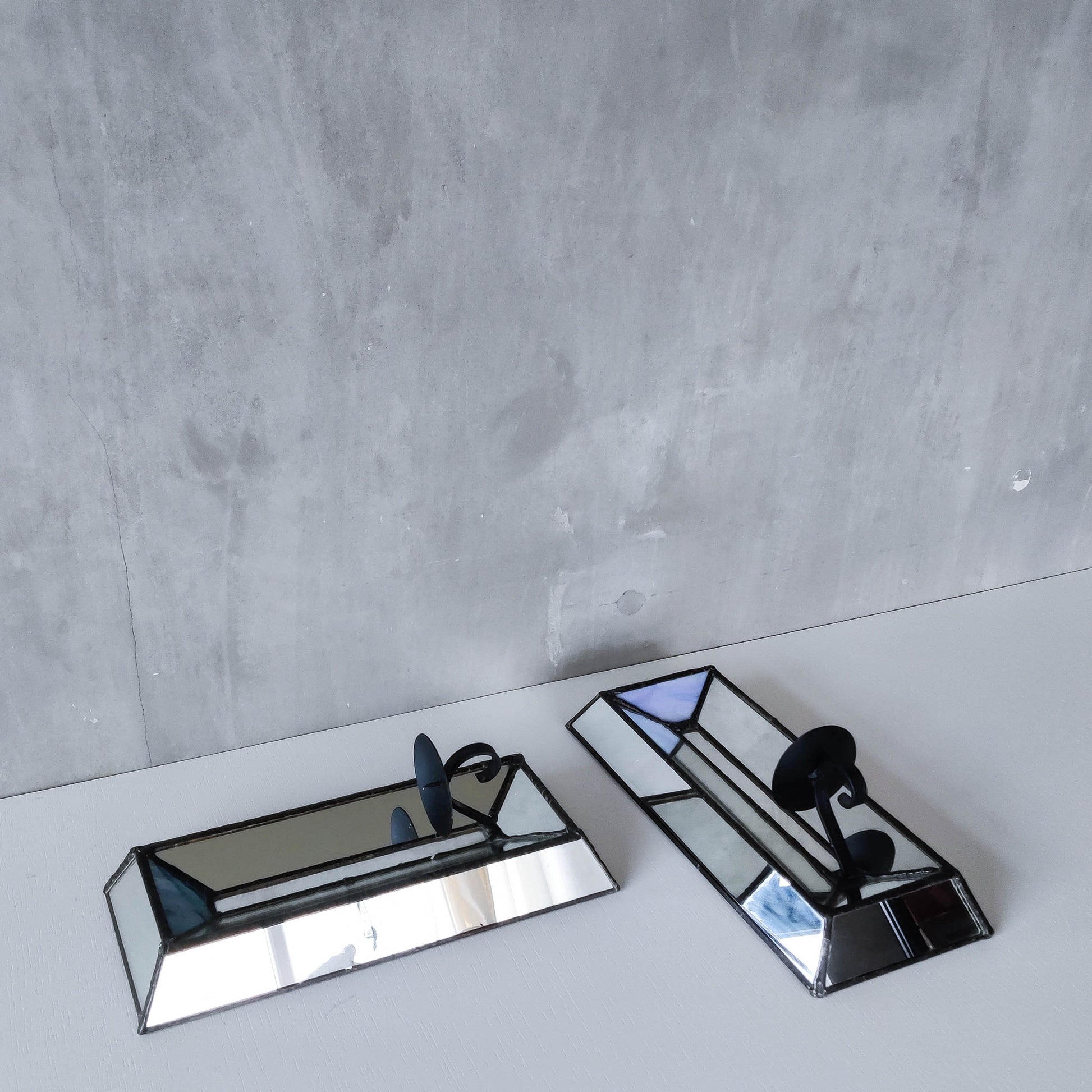 Pair of charming vintage wall candle sconces made from leaded faceted mirror pieces (as well as a piece of handmade coloured glass: one with a variegated cool blue and one a pale warm blue/violet). Beautifully and carefully hand made. Plywood back. Black metal pricket top candle holders (sorry candles not included). Please see photos and condition description.