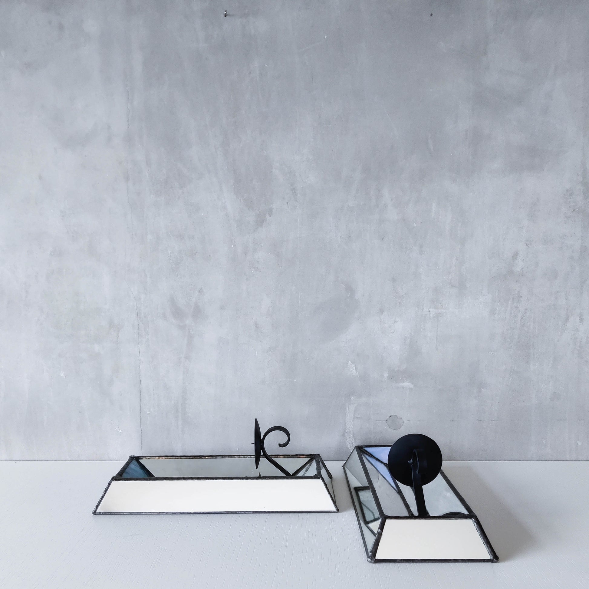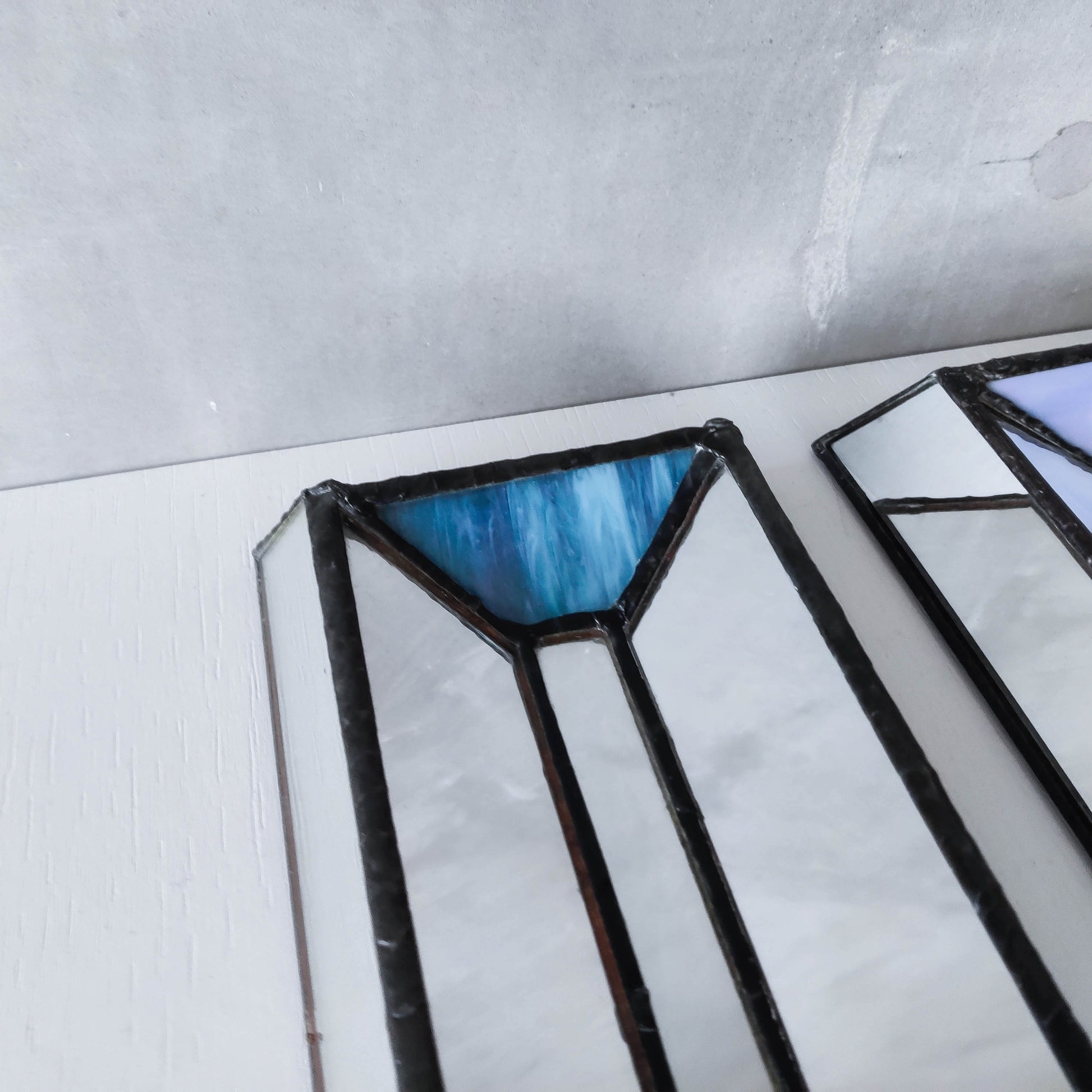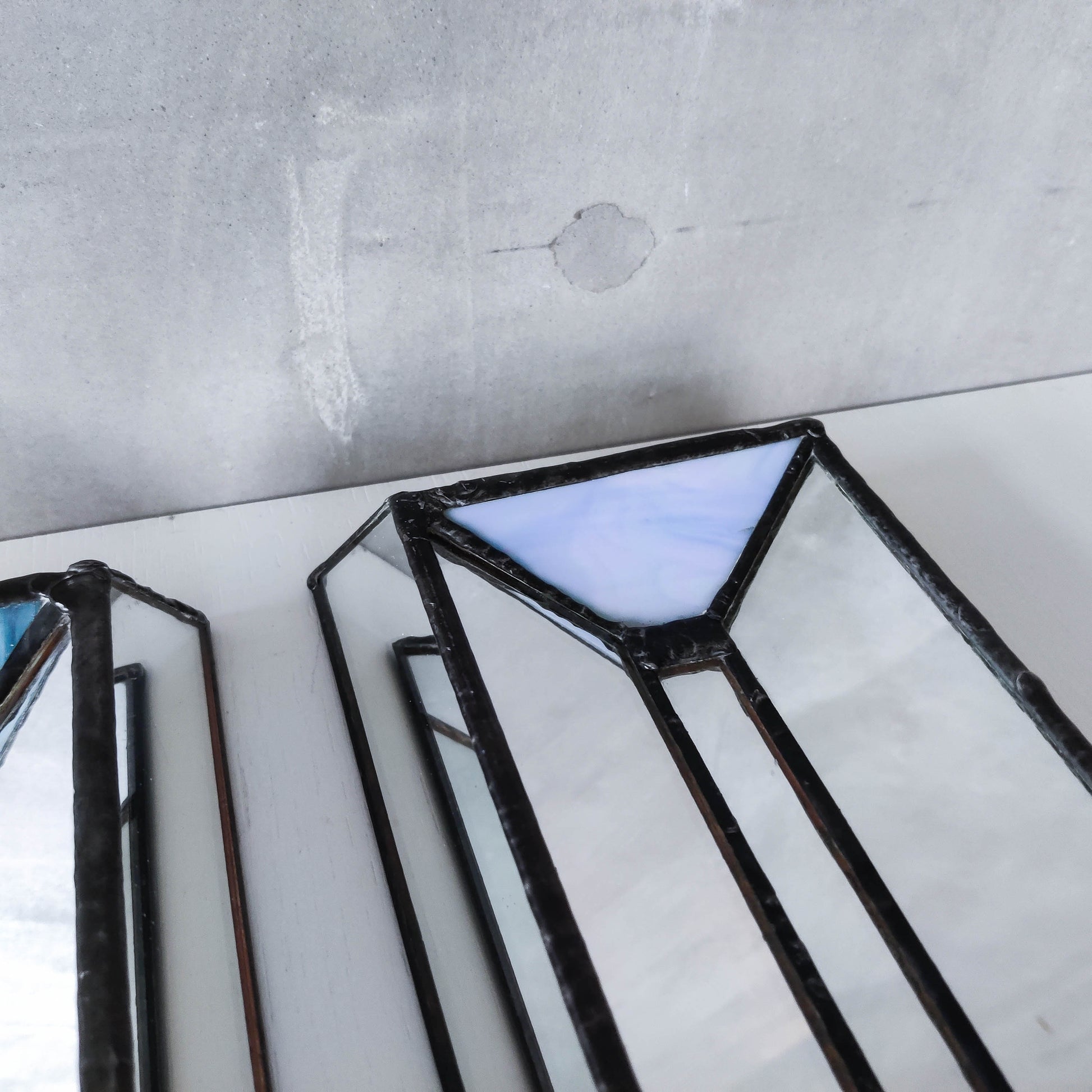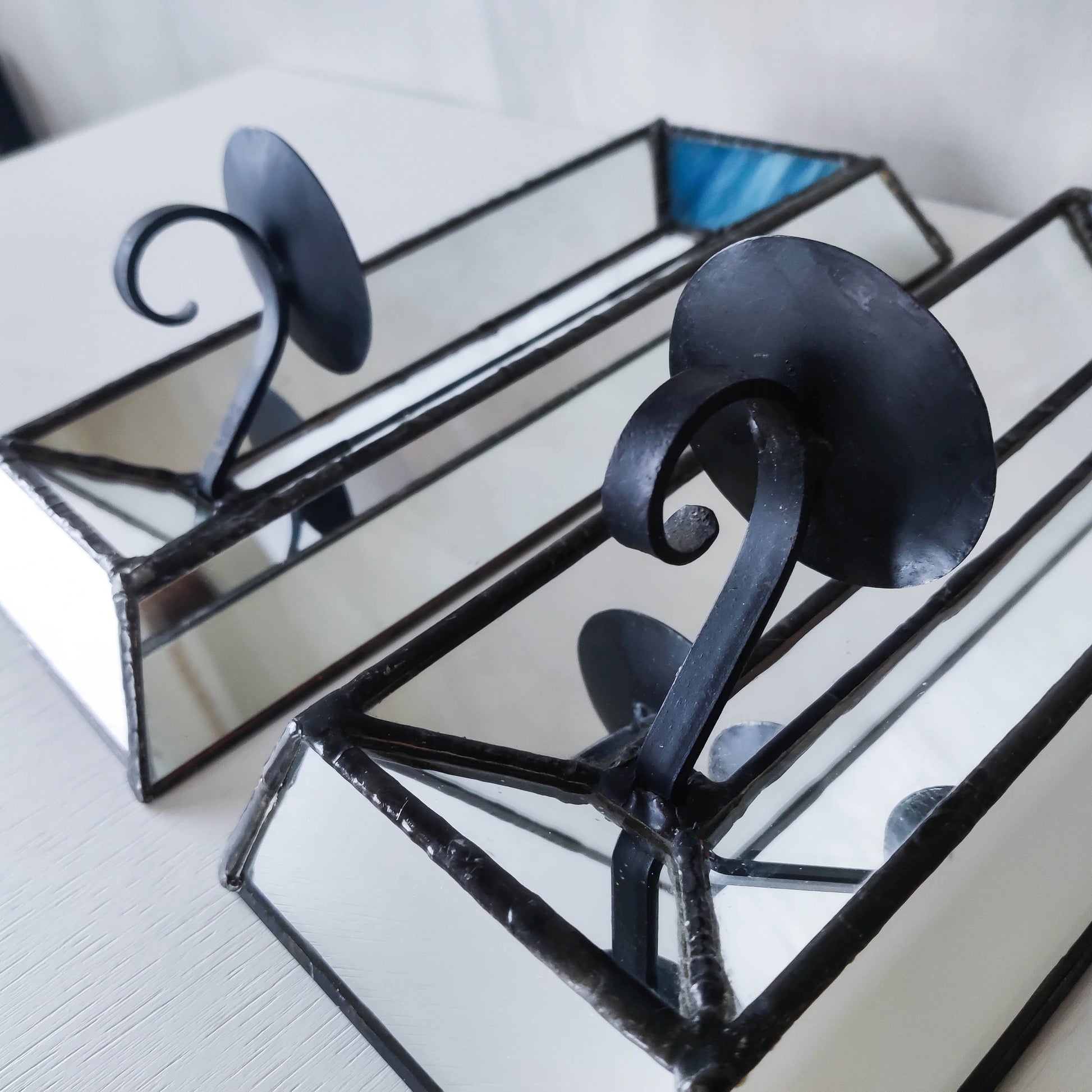 Pair of charming vintage wall candle sconces made from leaded faceted mirror pieces (as well as a piece of handmade coloured glass: one with a variegated cool blue and one a pale warm blue/violet). Beautifully and carefully hand made. Plywood back. Black metal pricket top candle holders (sorry candles not included). Please see photos and condition description.