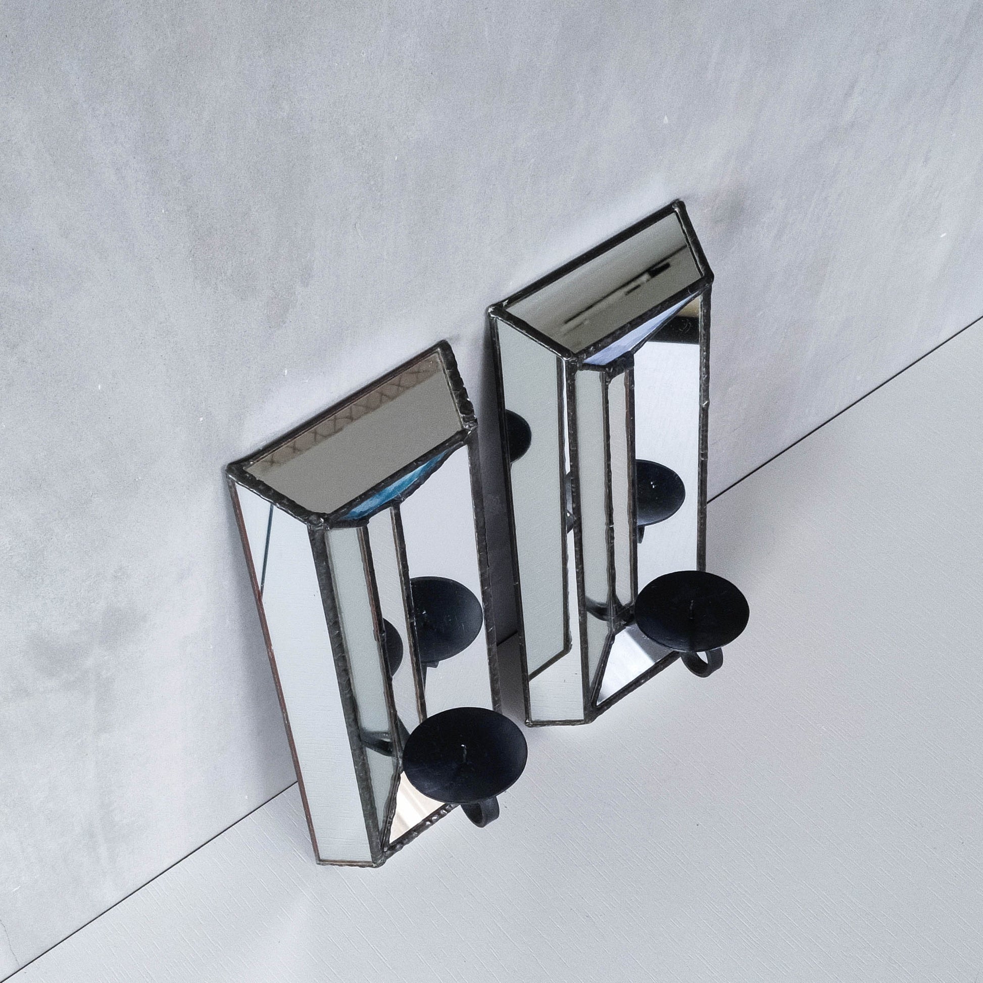 Pair of vintage handmade leaded mirror glass faceted candle holder wall sconces