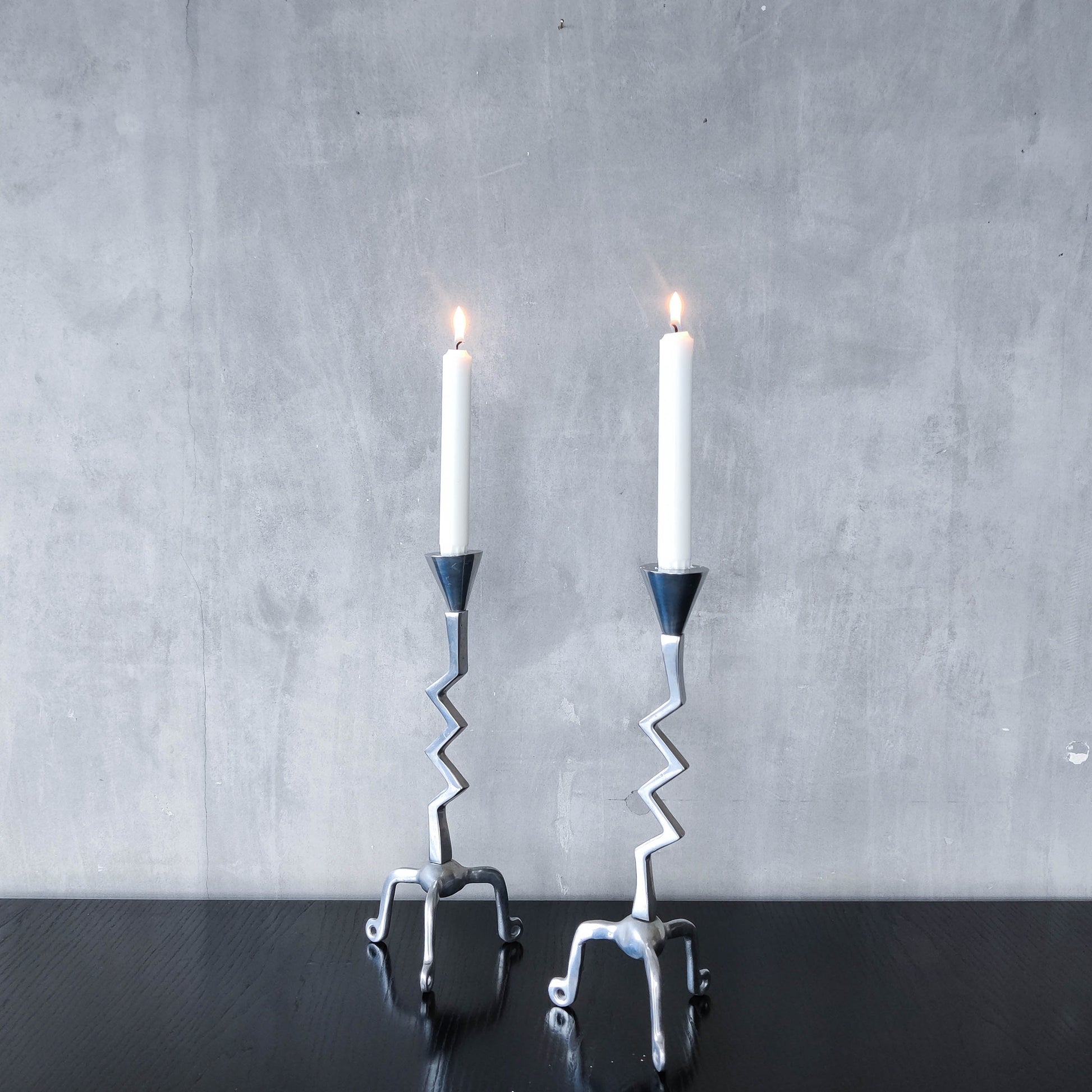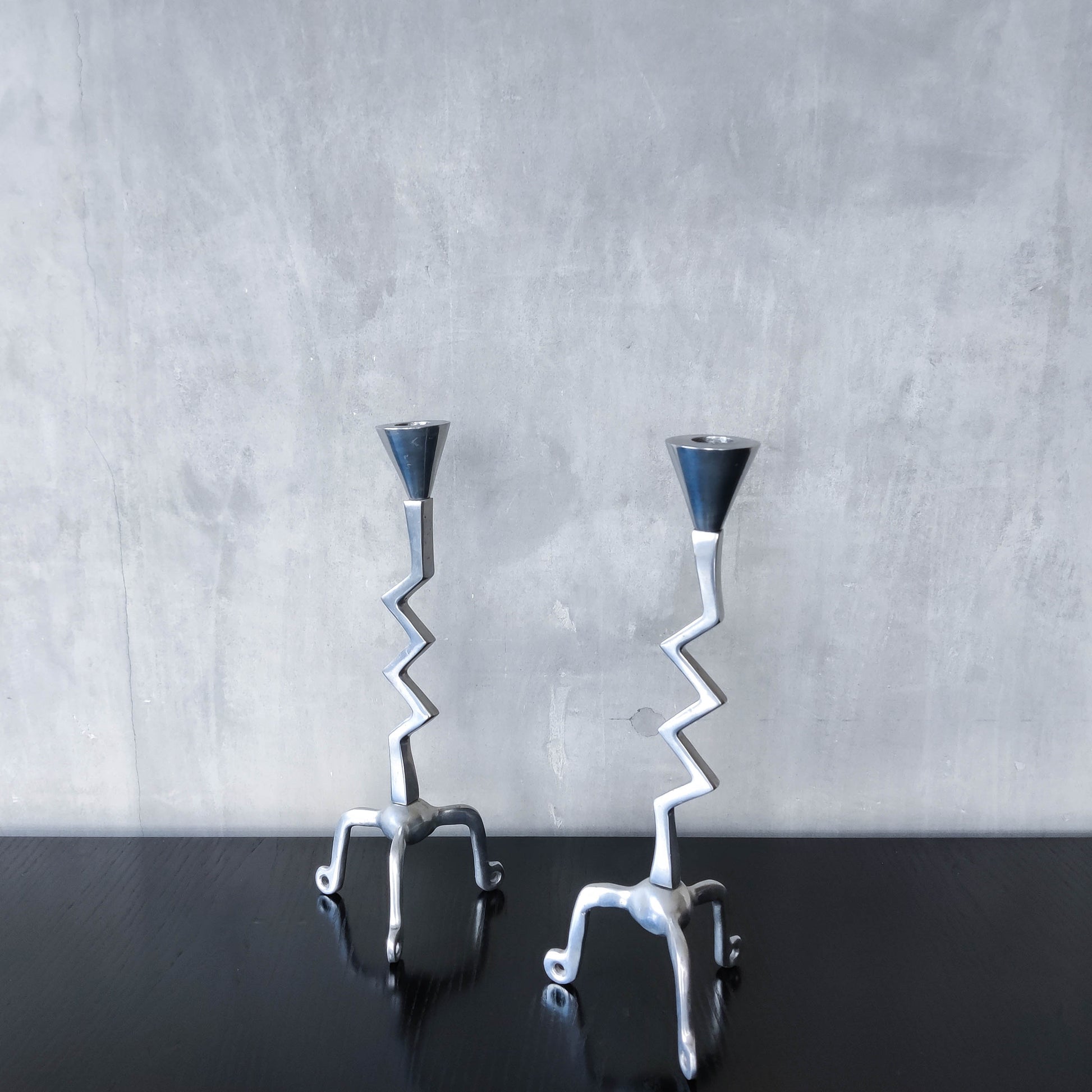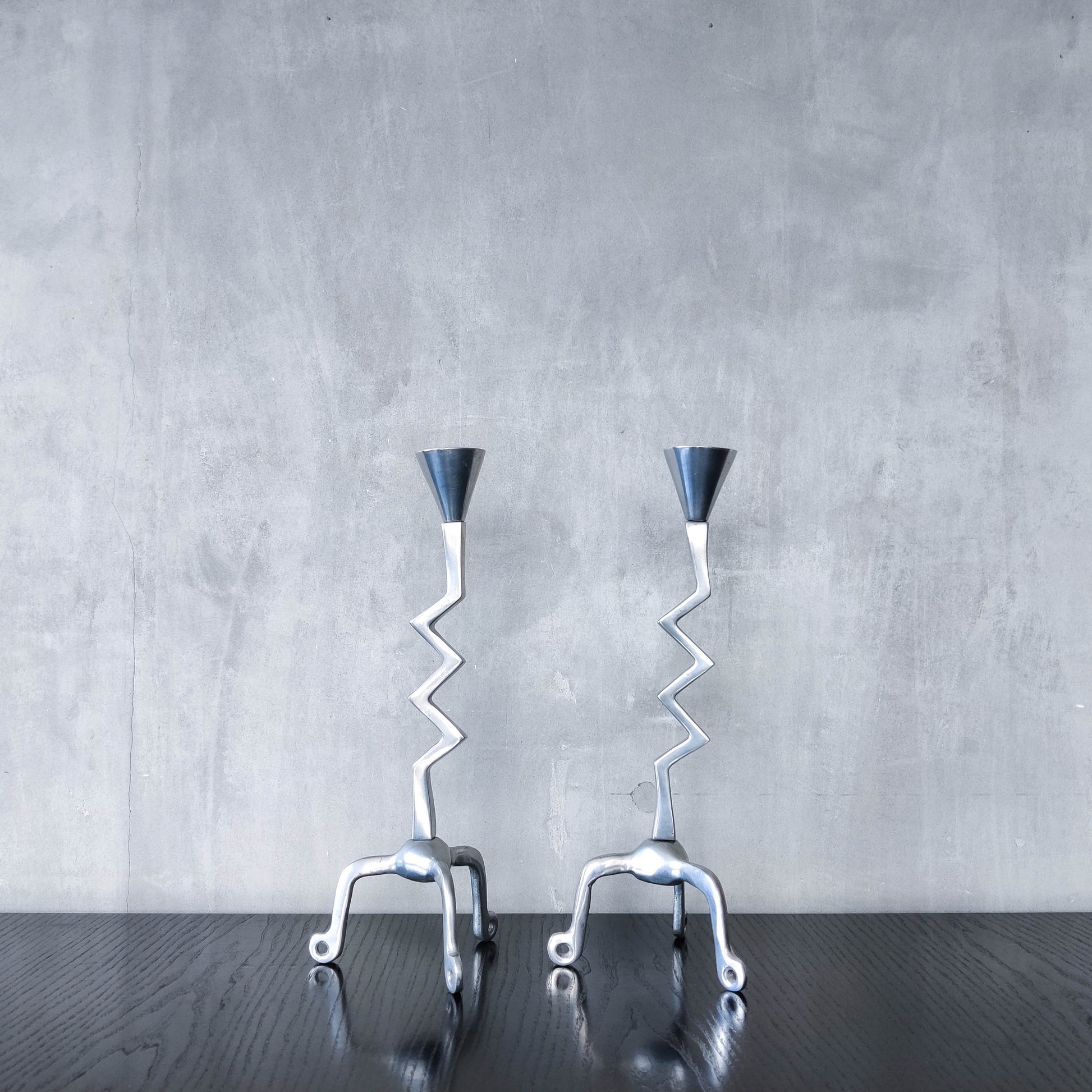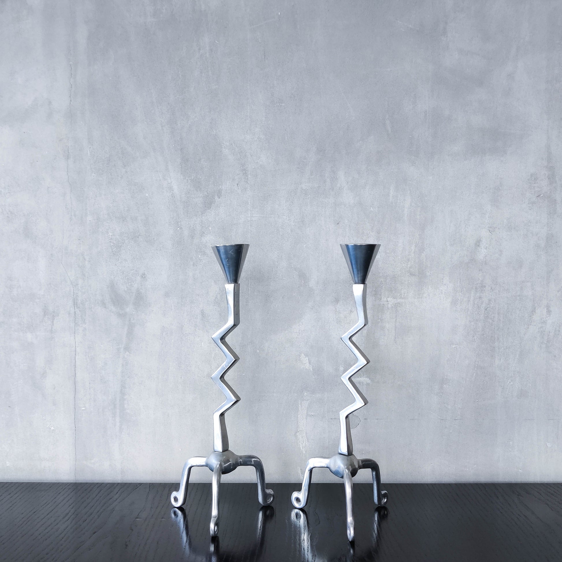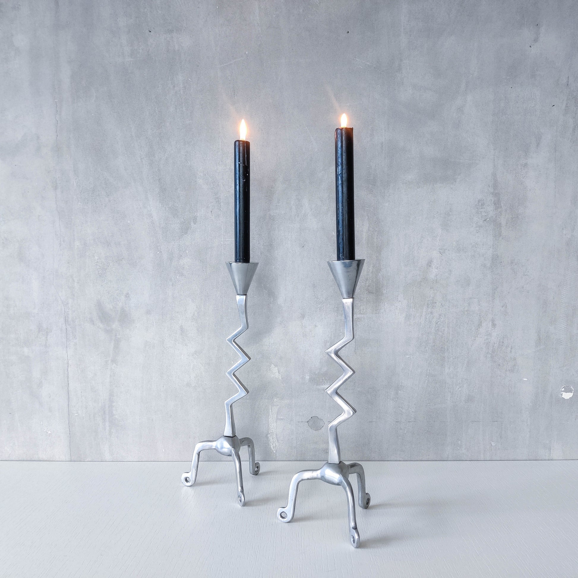 Fantastic pair of 1990s cast aluminium postmodern candle holders. Chunky zigzag verticals on playful tripod feet. Suitable for dinner candles (sorry not included). Please see photos and condition description.