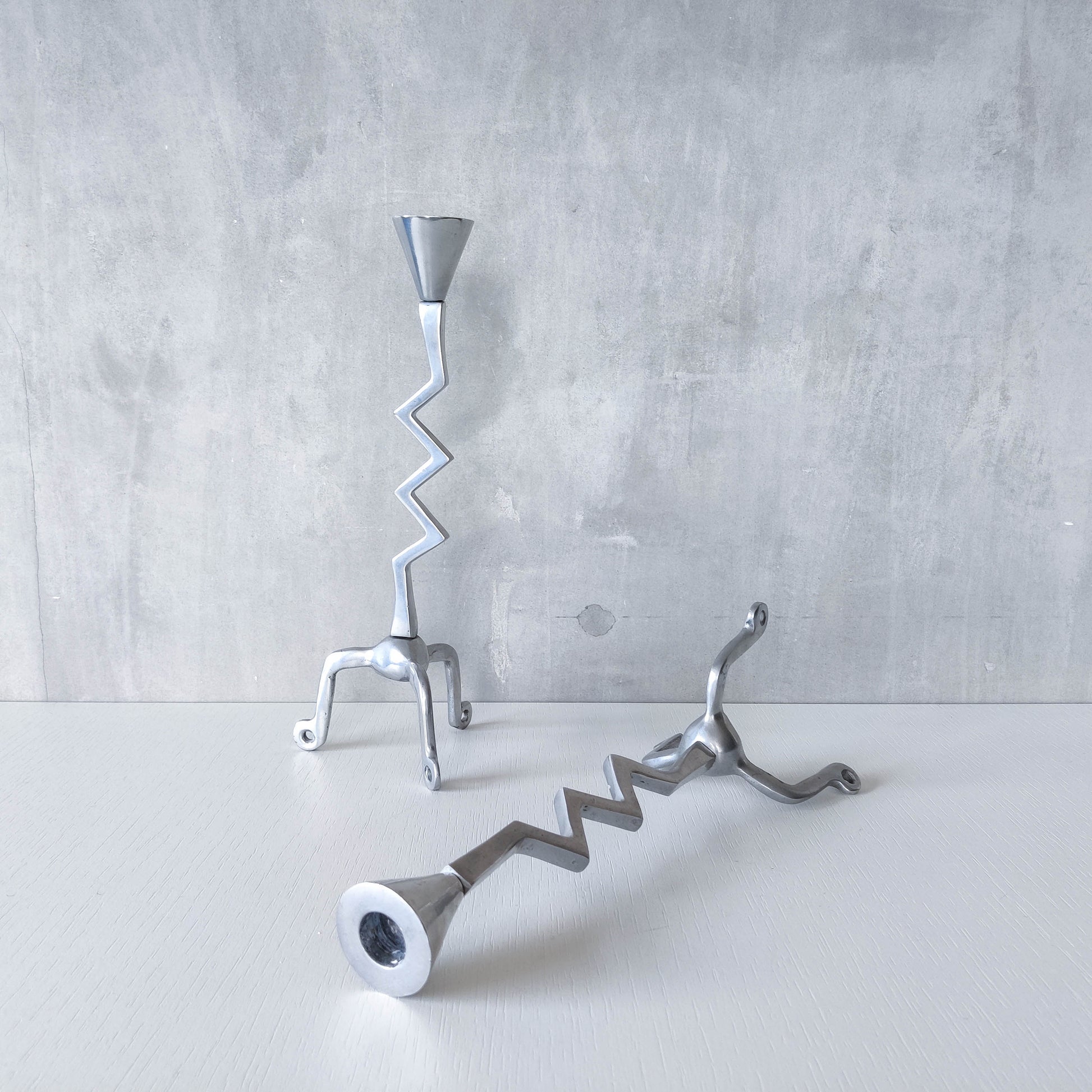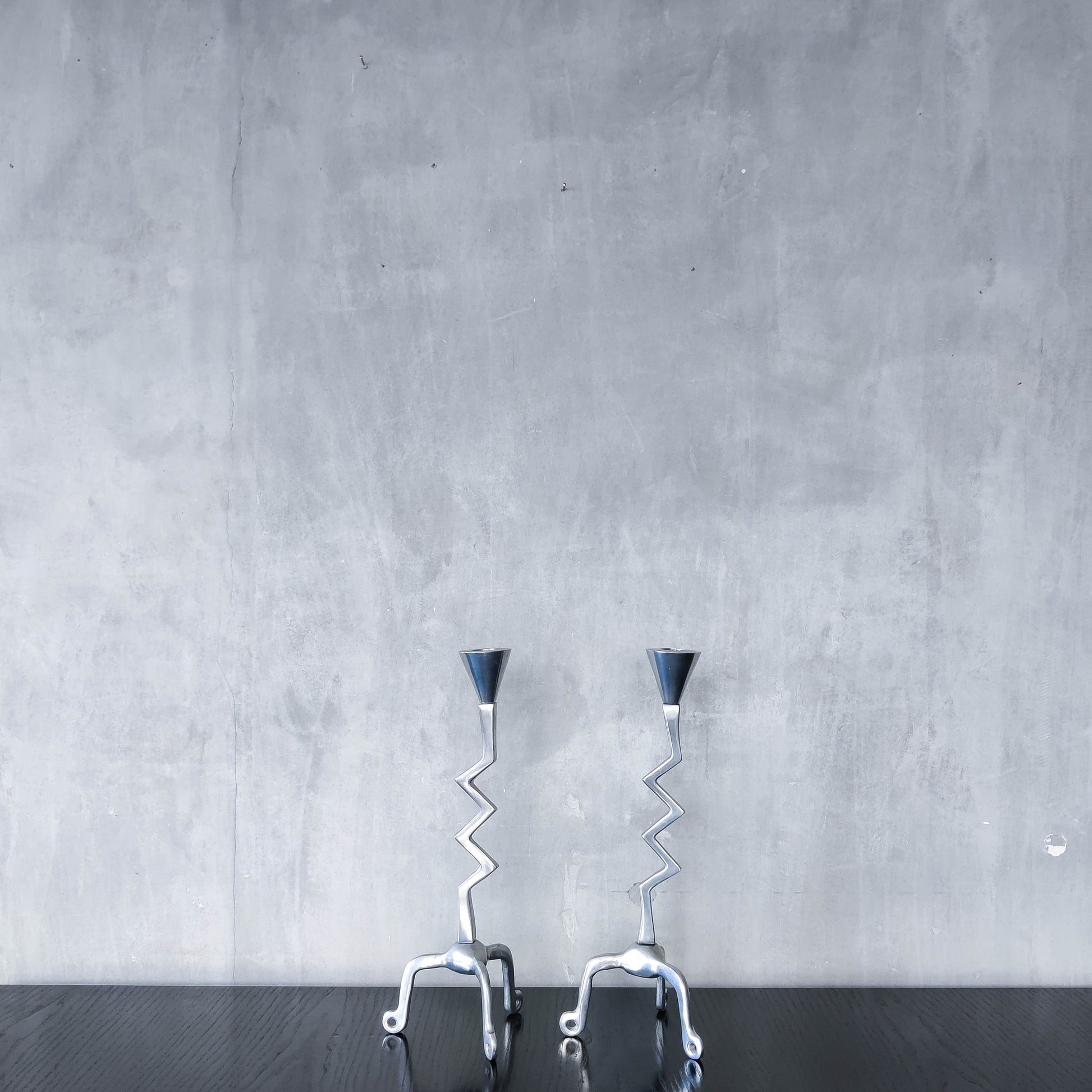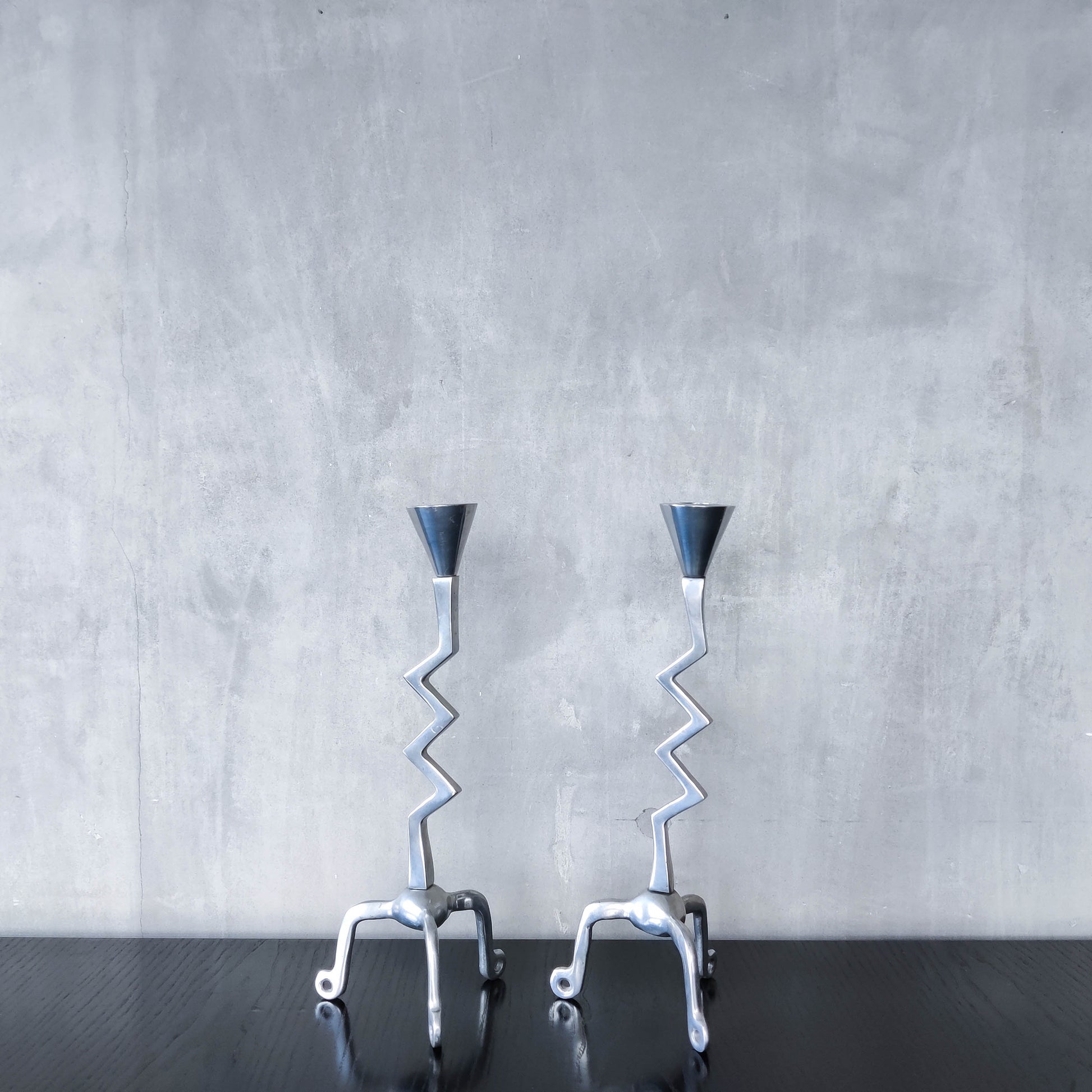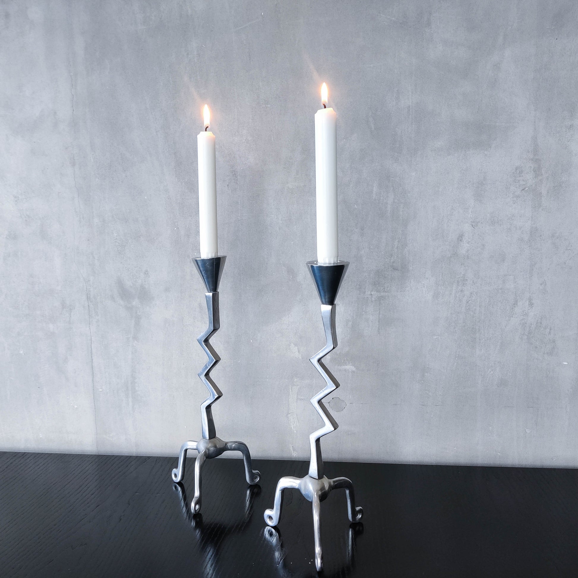 Fantastic pair of 1990s cast aluminium postmodern candle holders. Chunky zigzag verticals on playful tripod feet. Suitable for dinner candles (sorry not included). Please see photos and condition description.