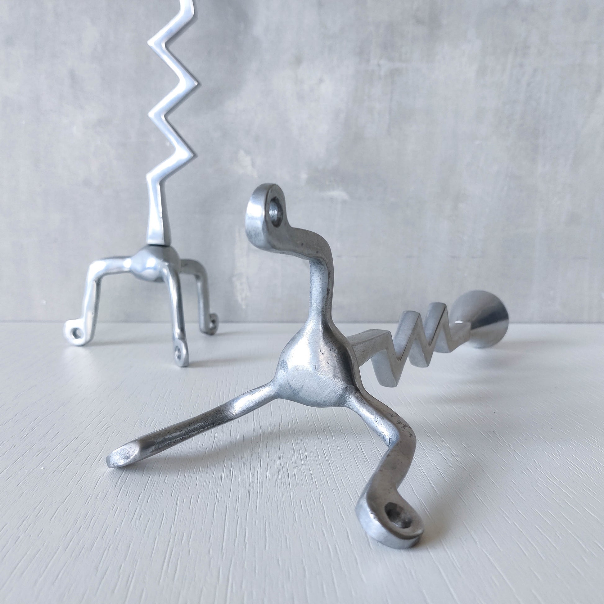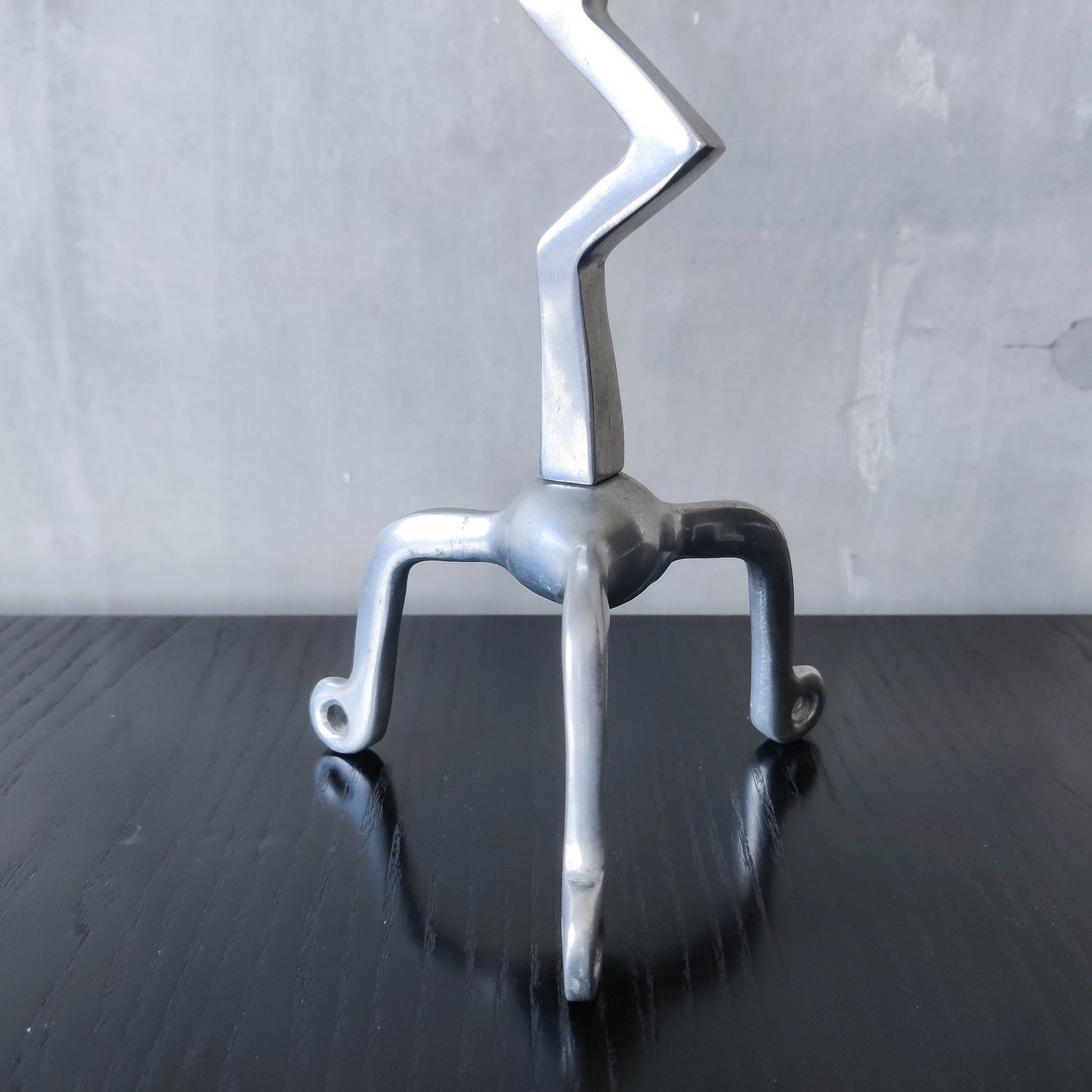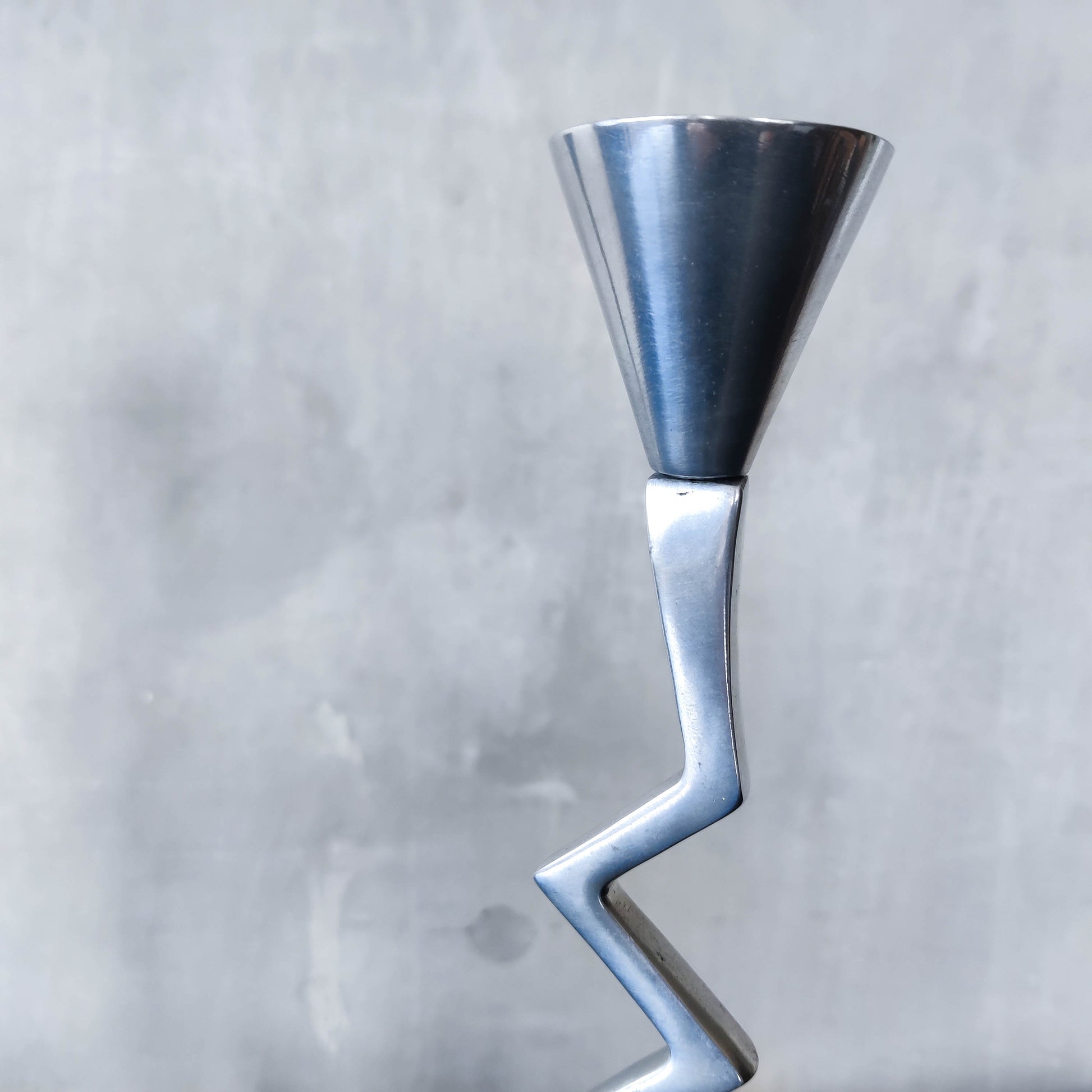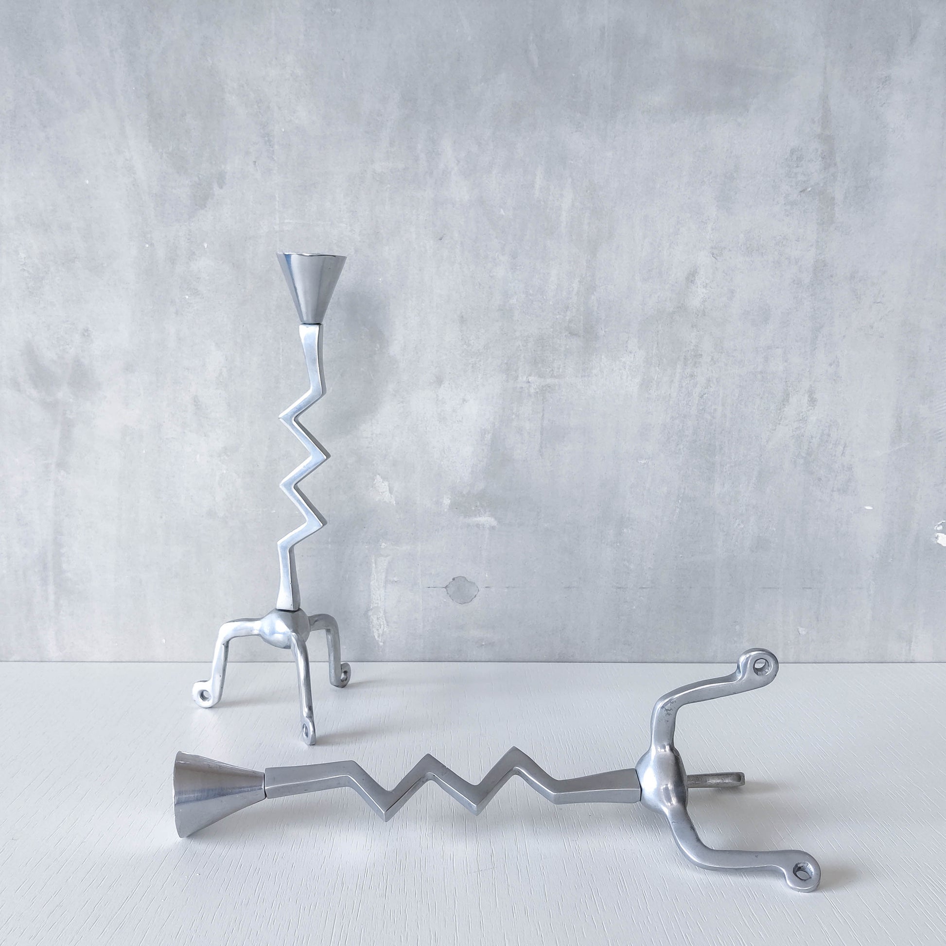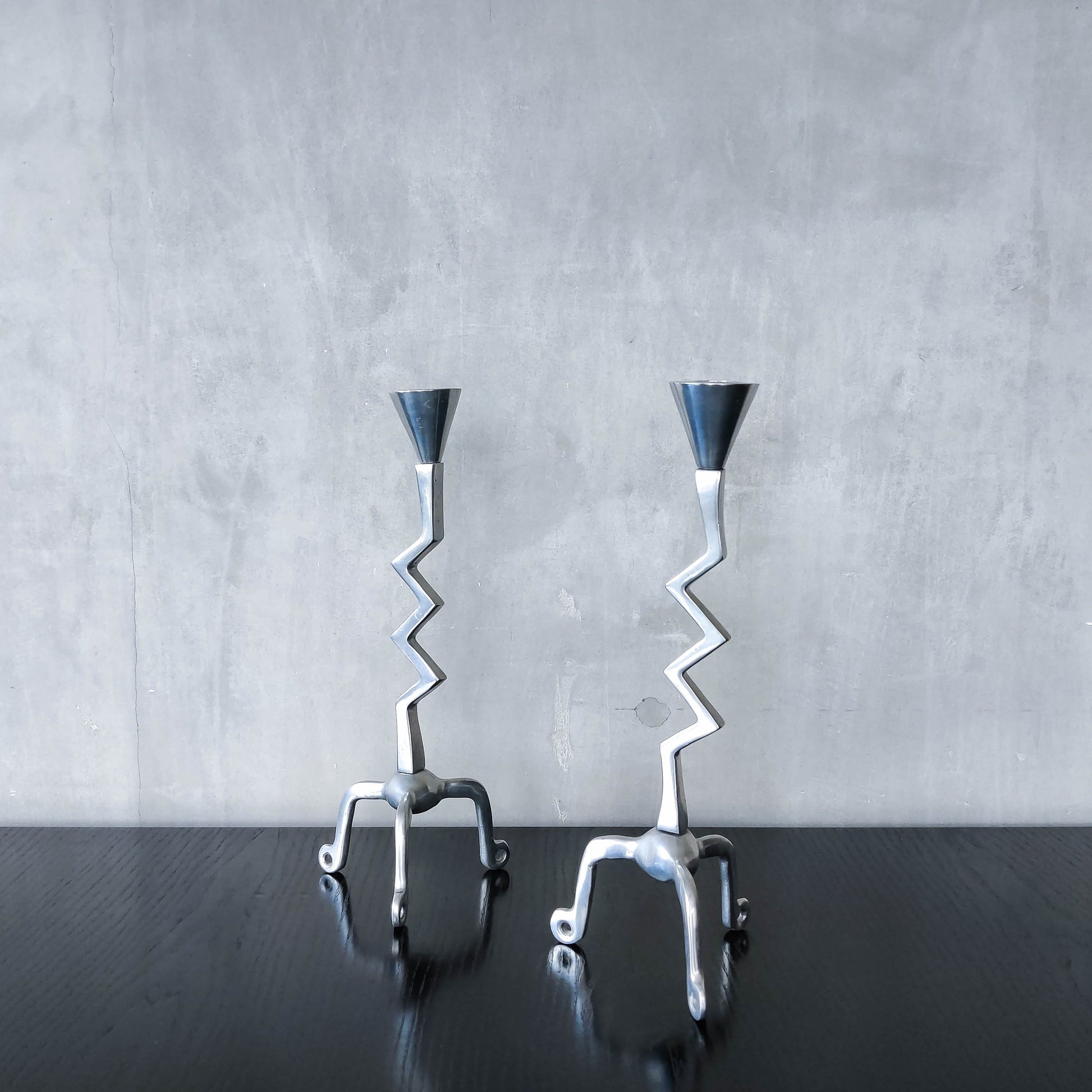 Fantastic pair of 1990s cast aluminium postmodern candle holders. Chunky zigzag verticals on playful tripod feet. Suitable for dinner candles (sorry not included). Please see photos and condition description.