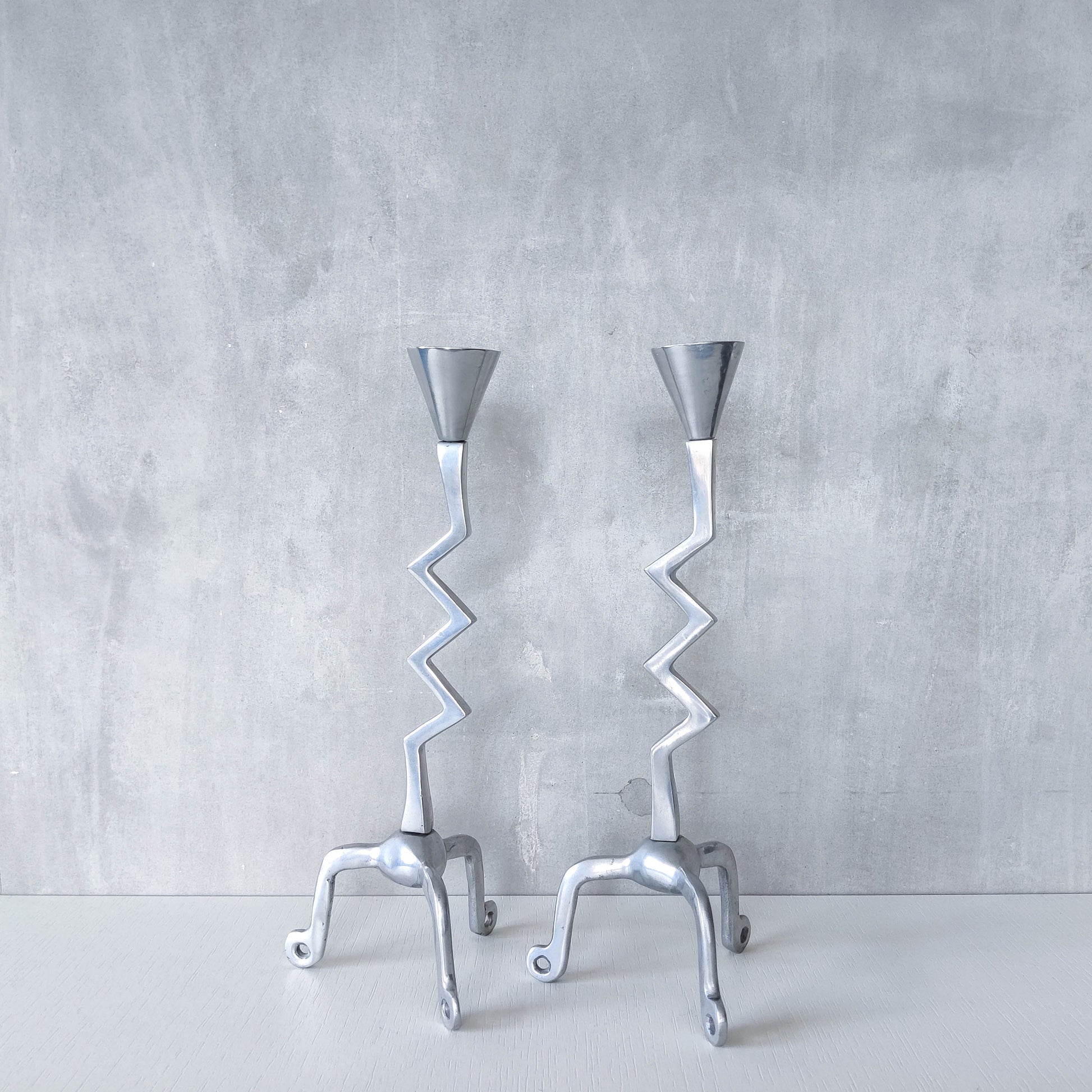 Pair of vintage postmodern chunky sculptural zigzag cast aluminium footed candle holders