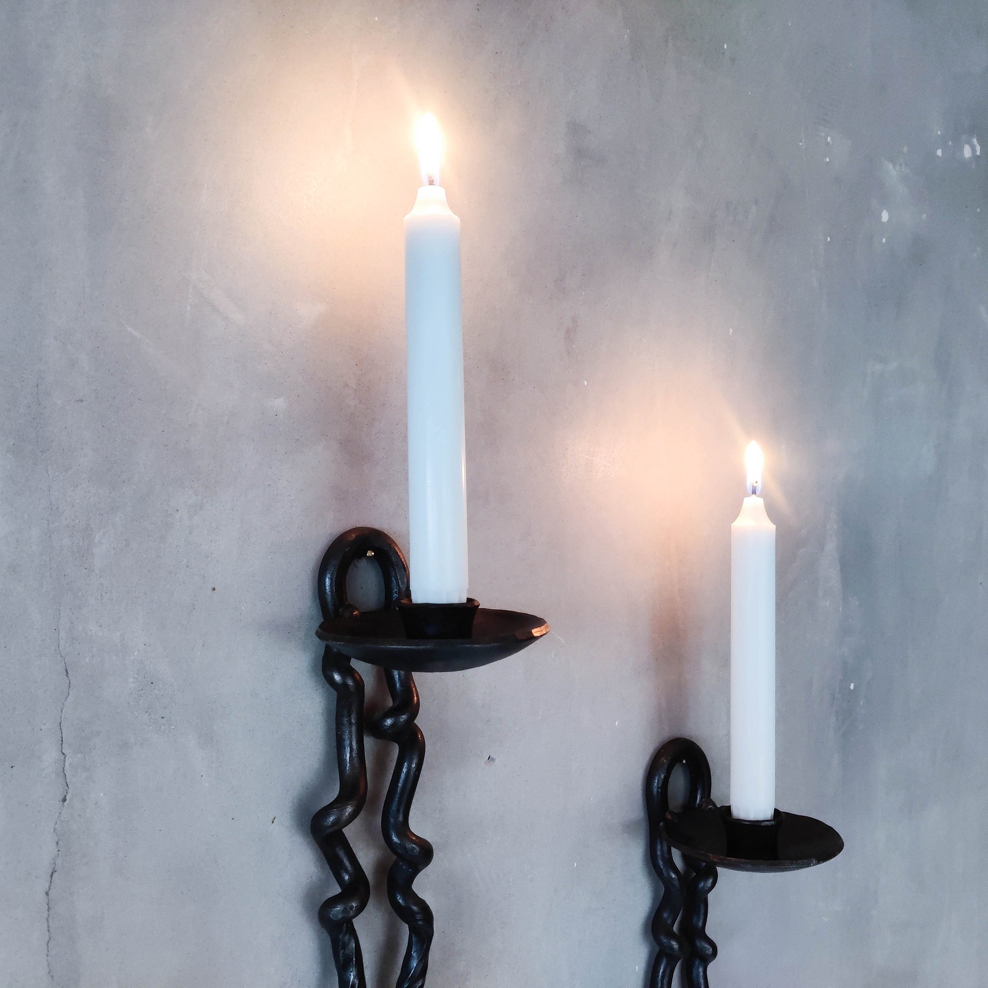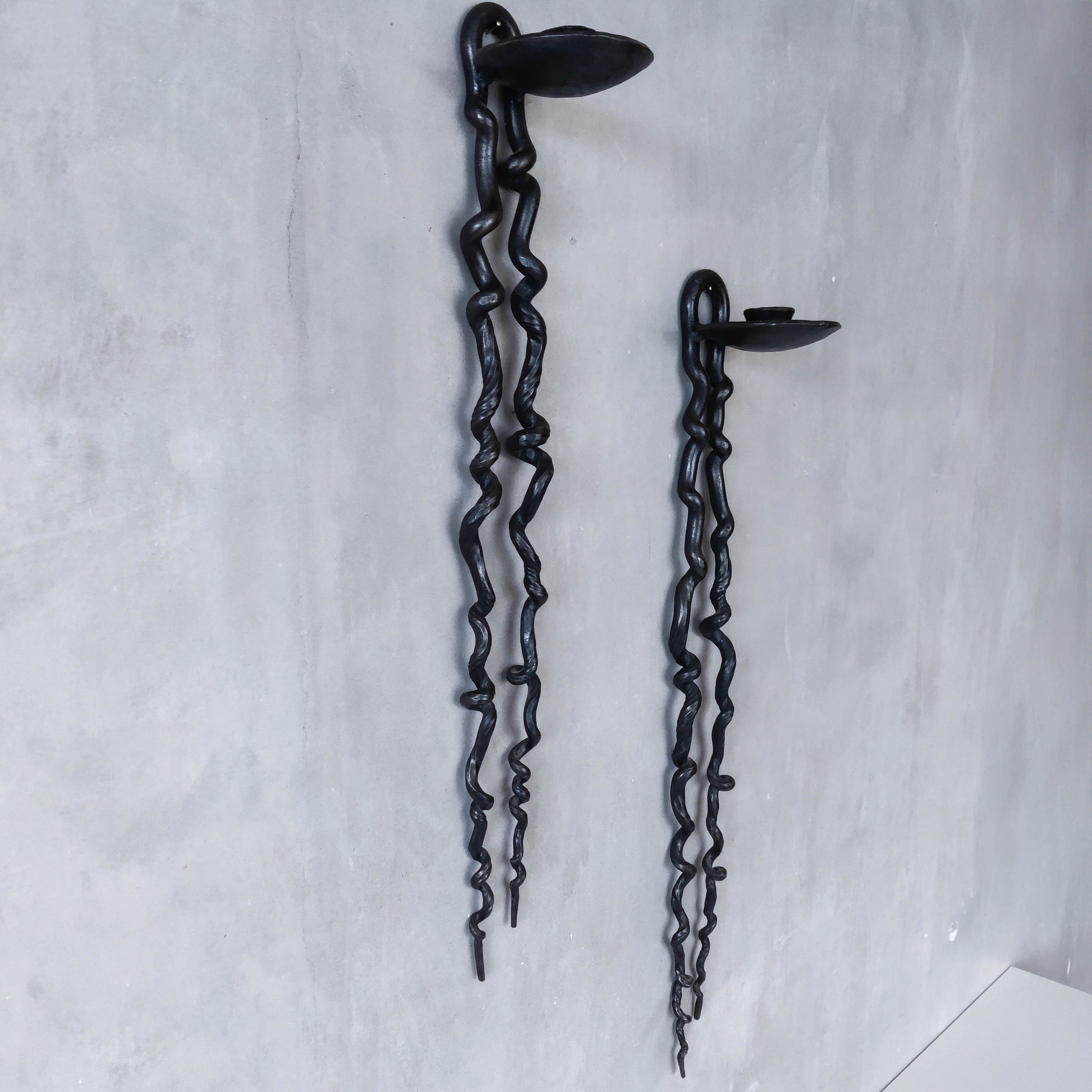 Pair of wrought iron blacksmith made twisted sculptural candle wall sconces