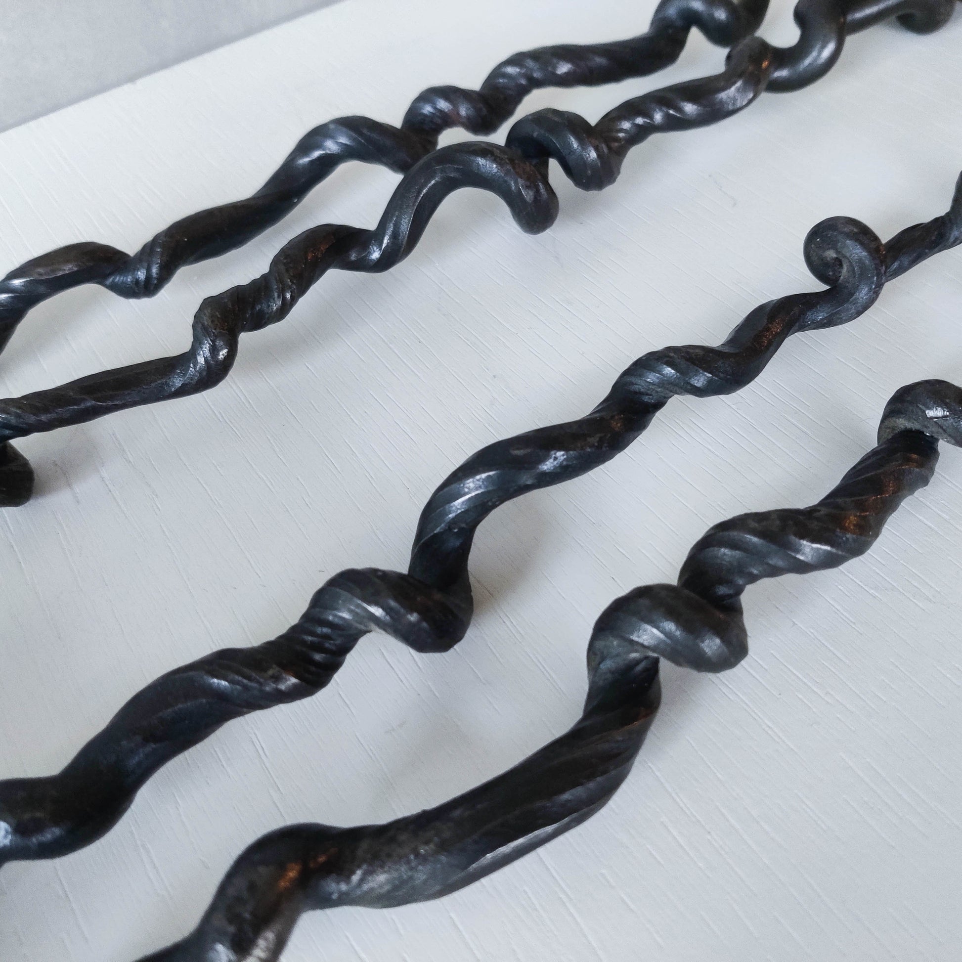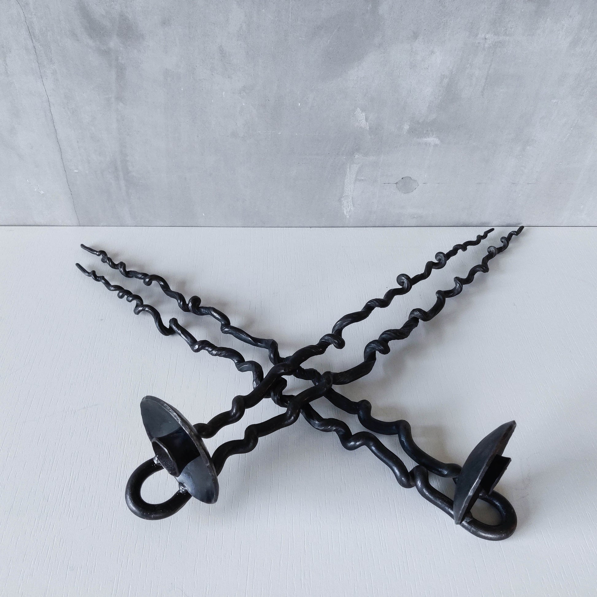 Pair of blacksmith made long sculptural twisted wrought iron looped and welded candle sconces for dinner candles (sorry not included). Please see photos and condition description.